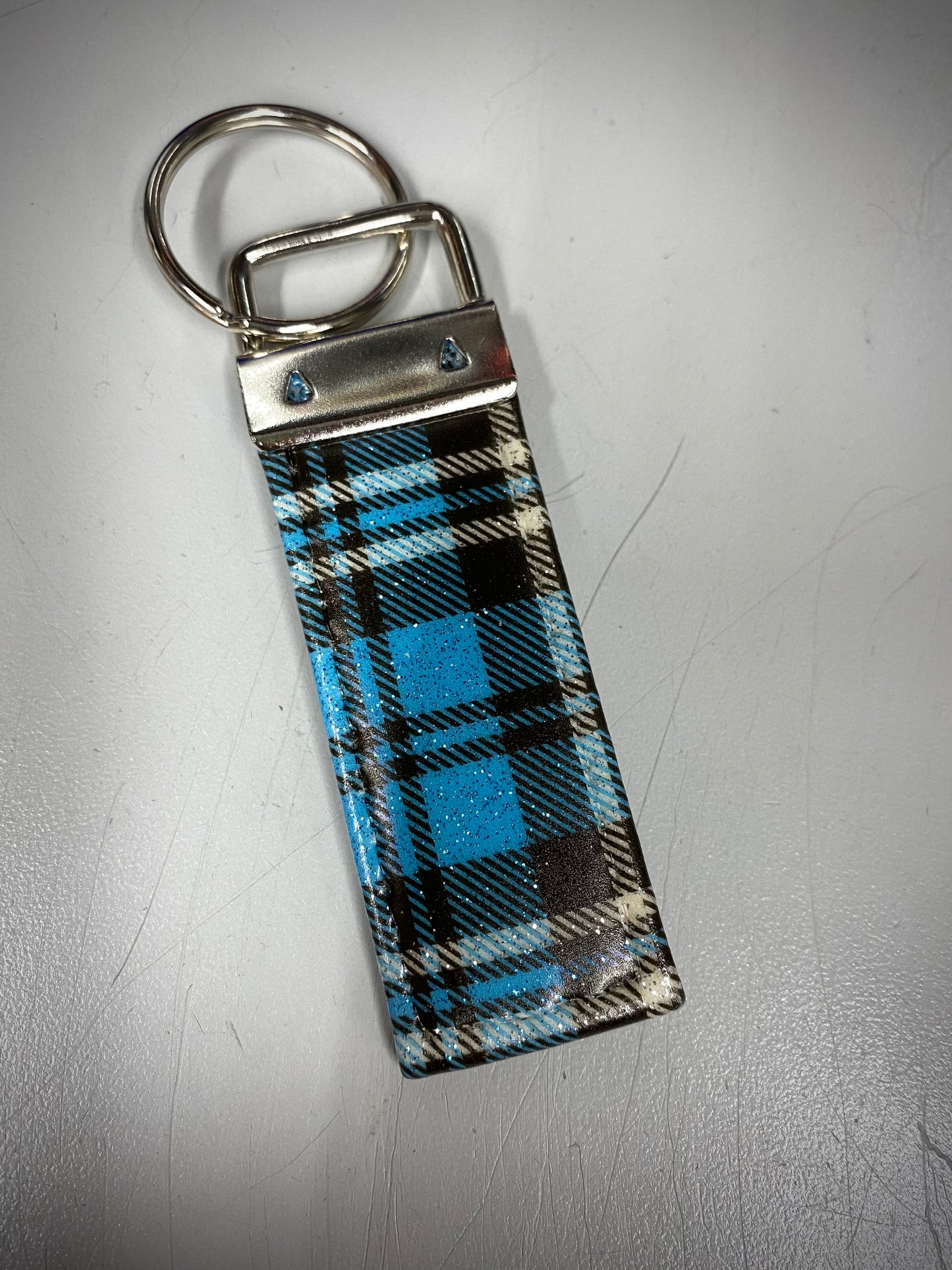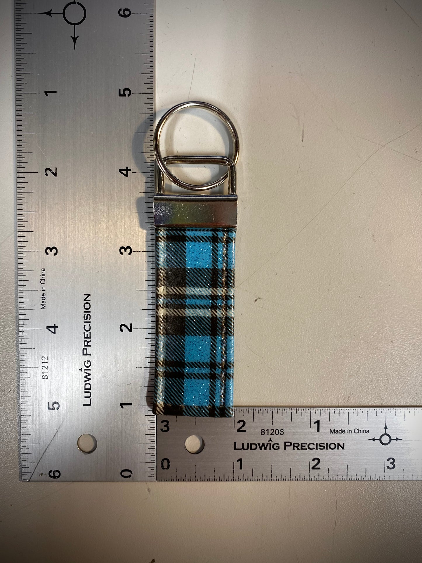 Materials: White glitter vinyl with UV printed sky plaid, nickel hardware