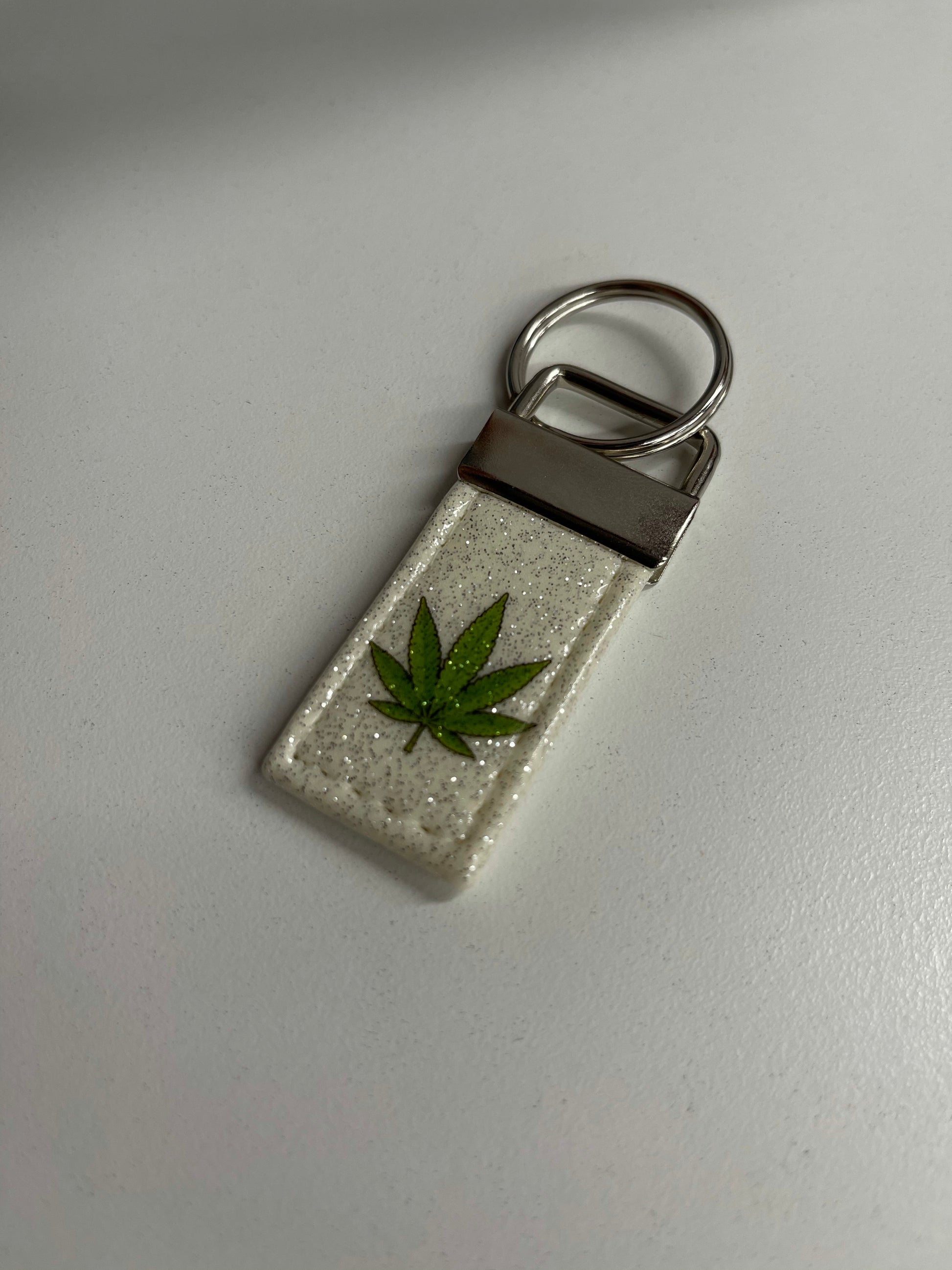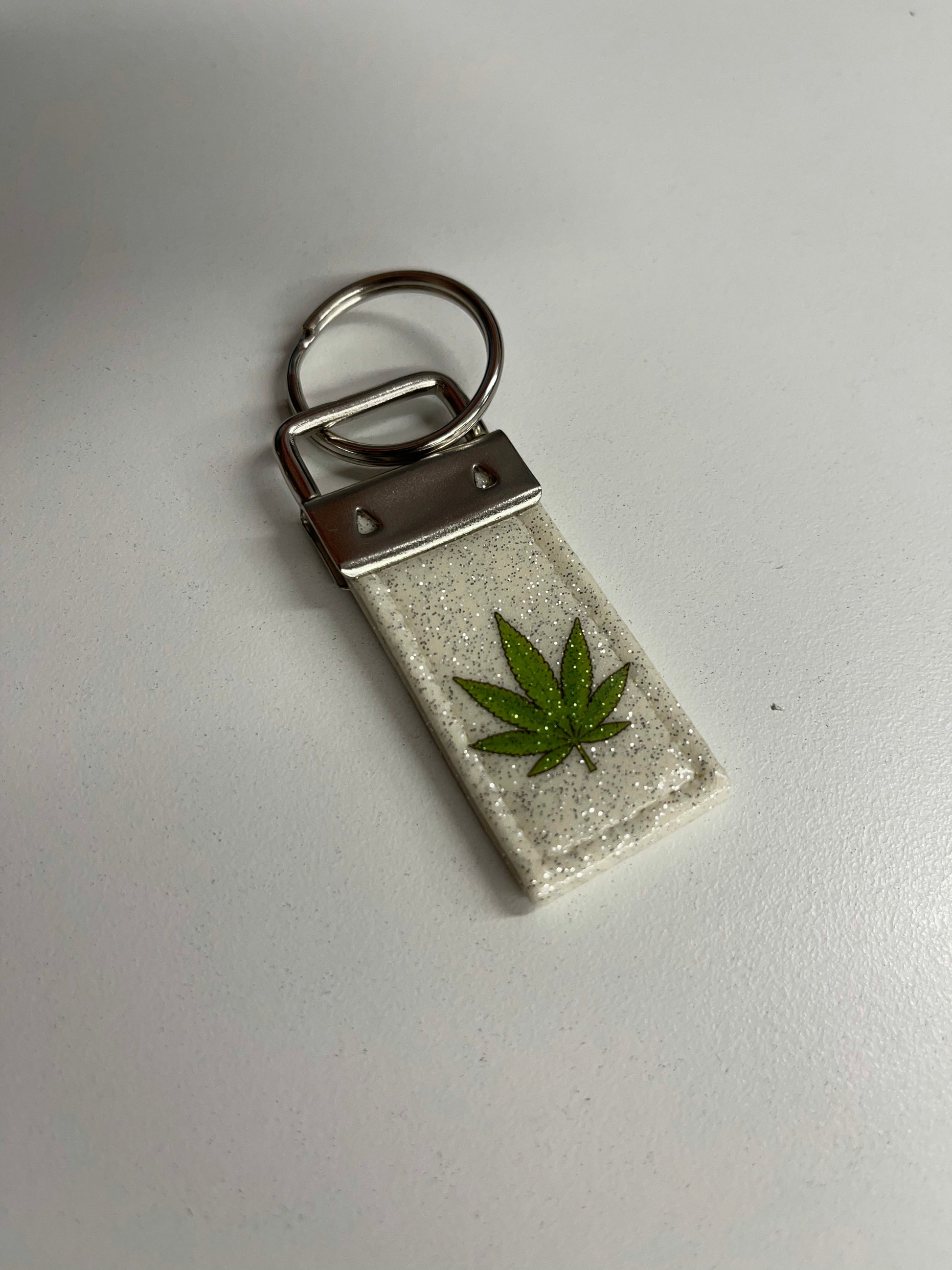 Materials: White glitter vinyl with UV printed canna leaf, nickel hardware