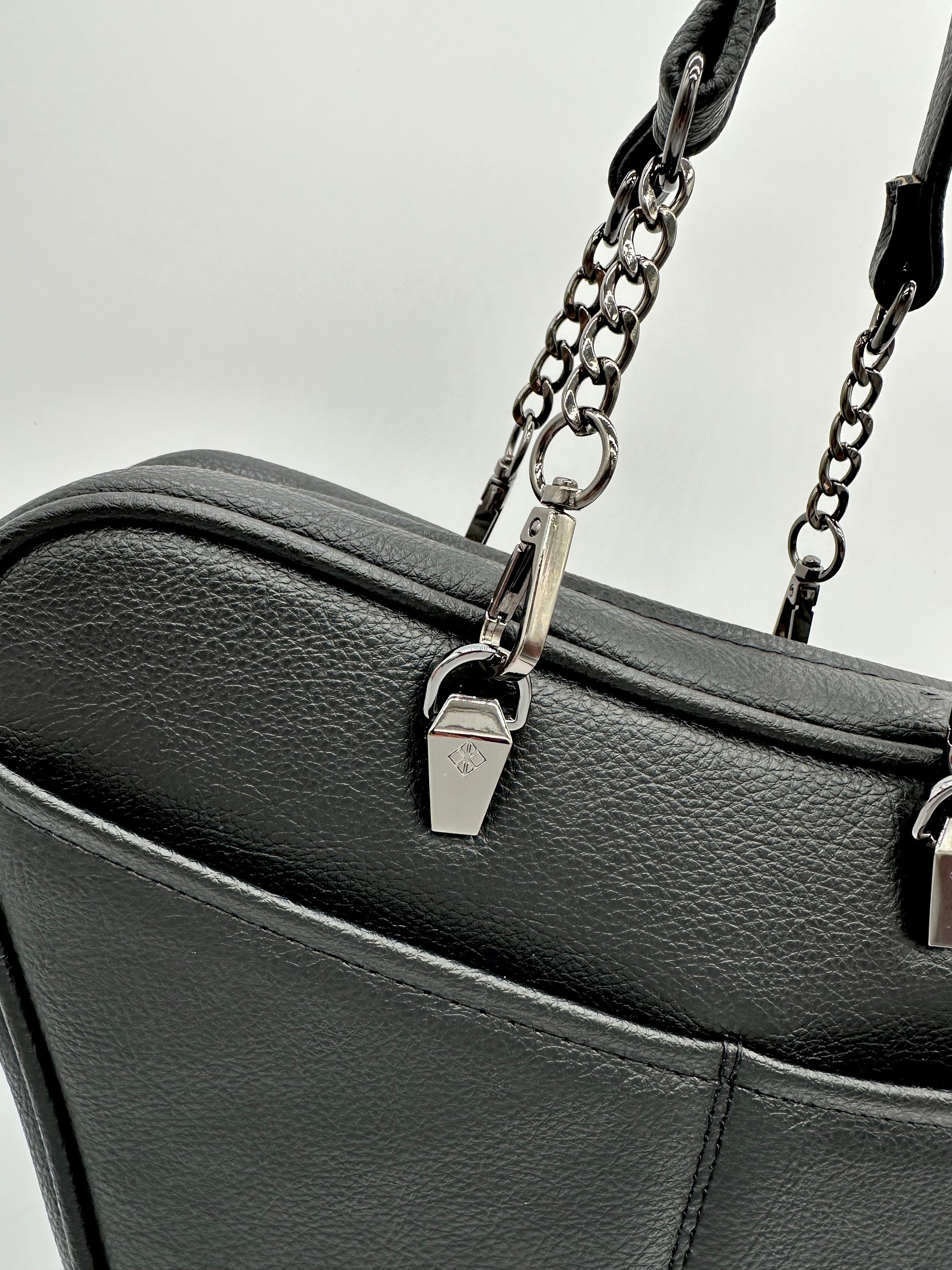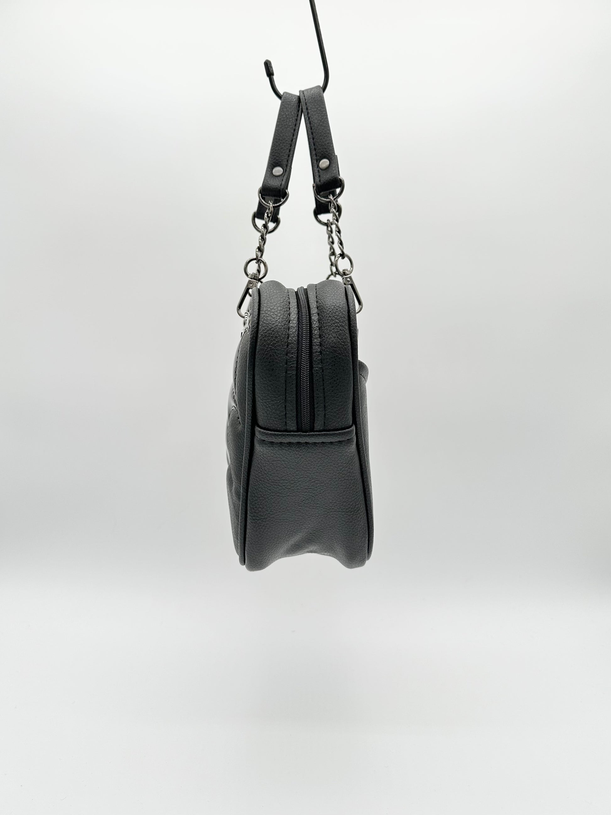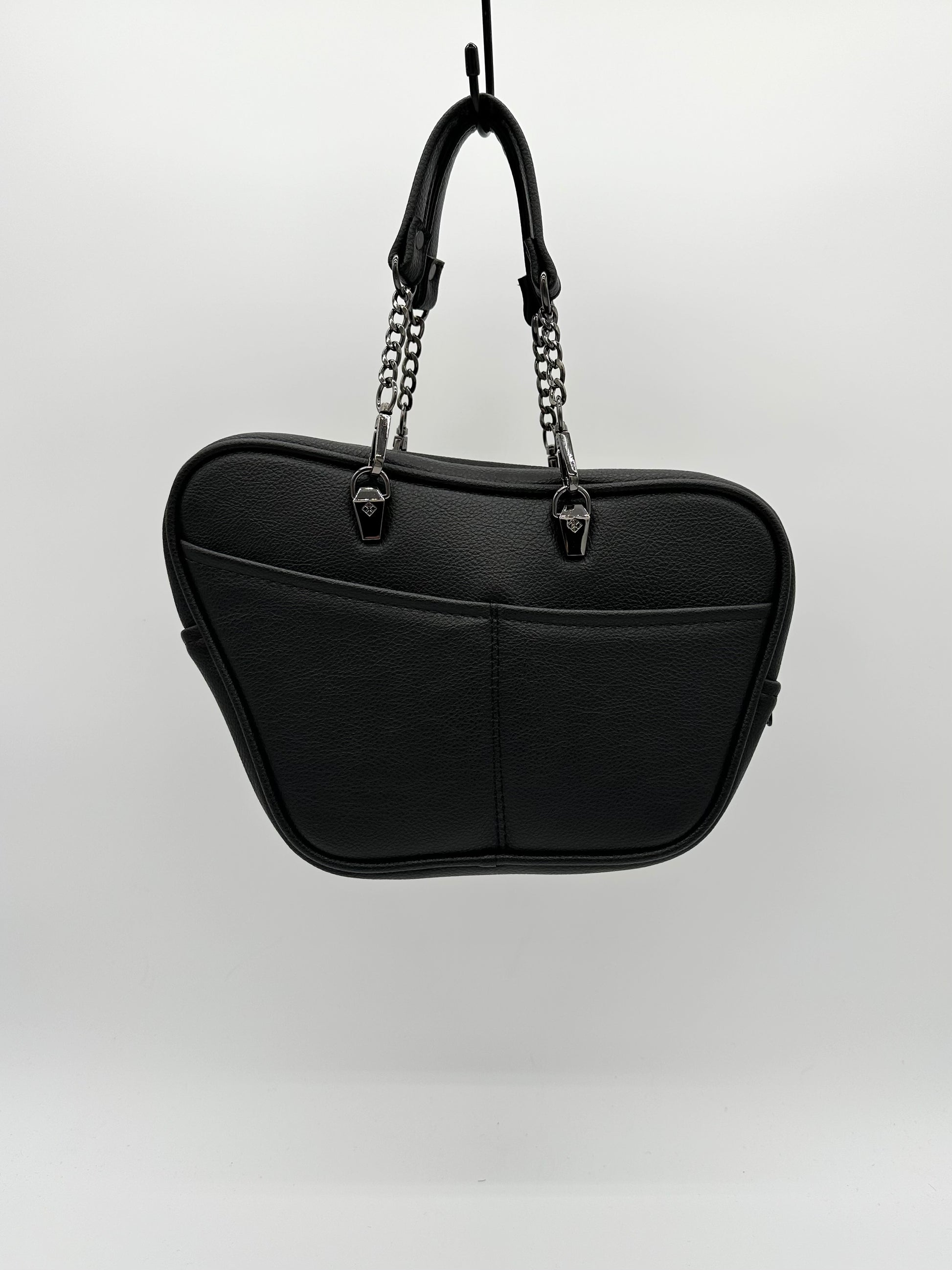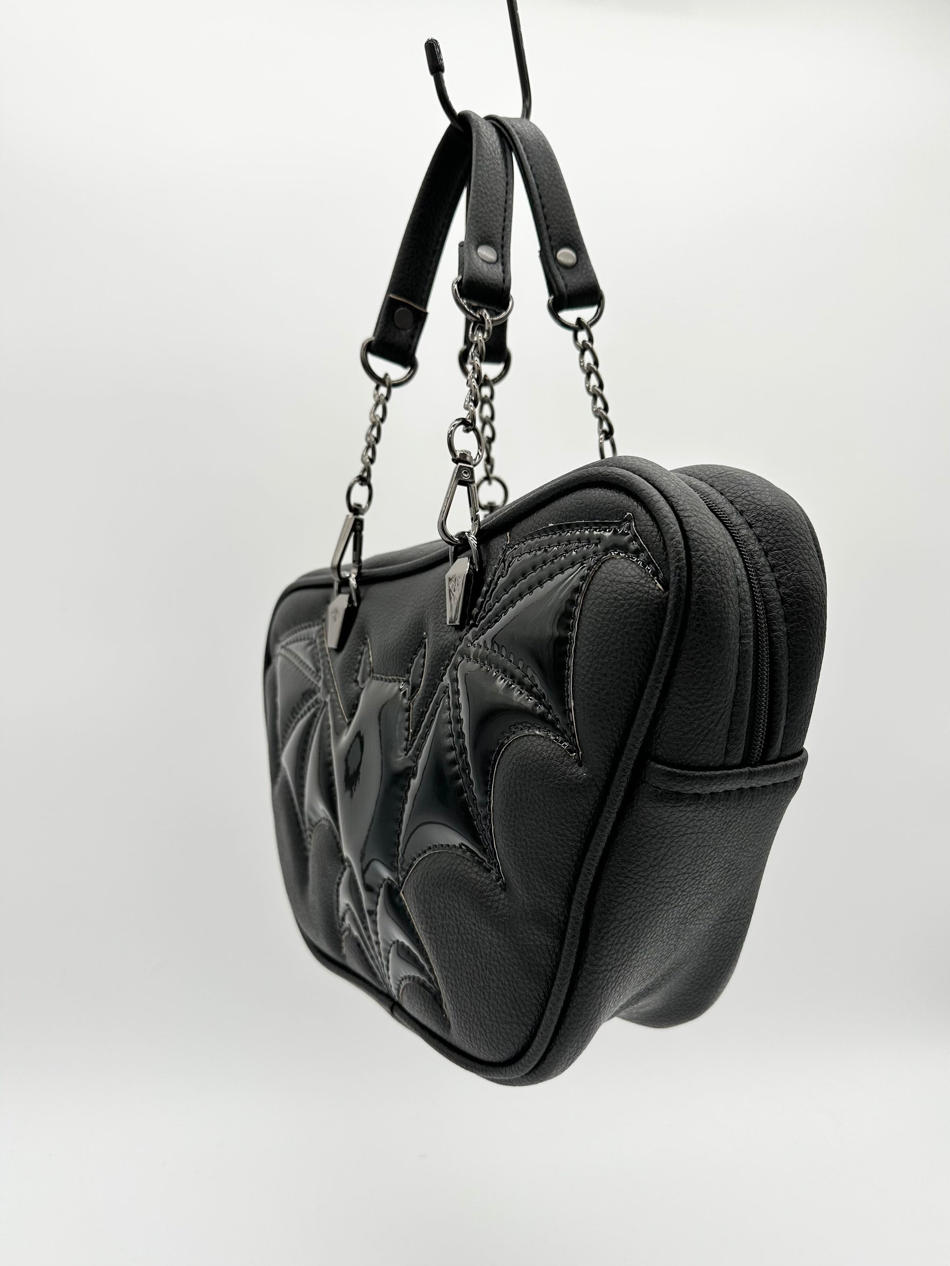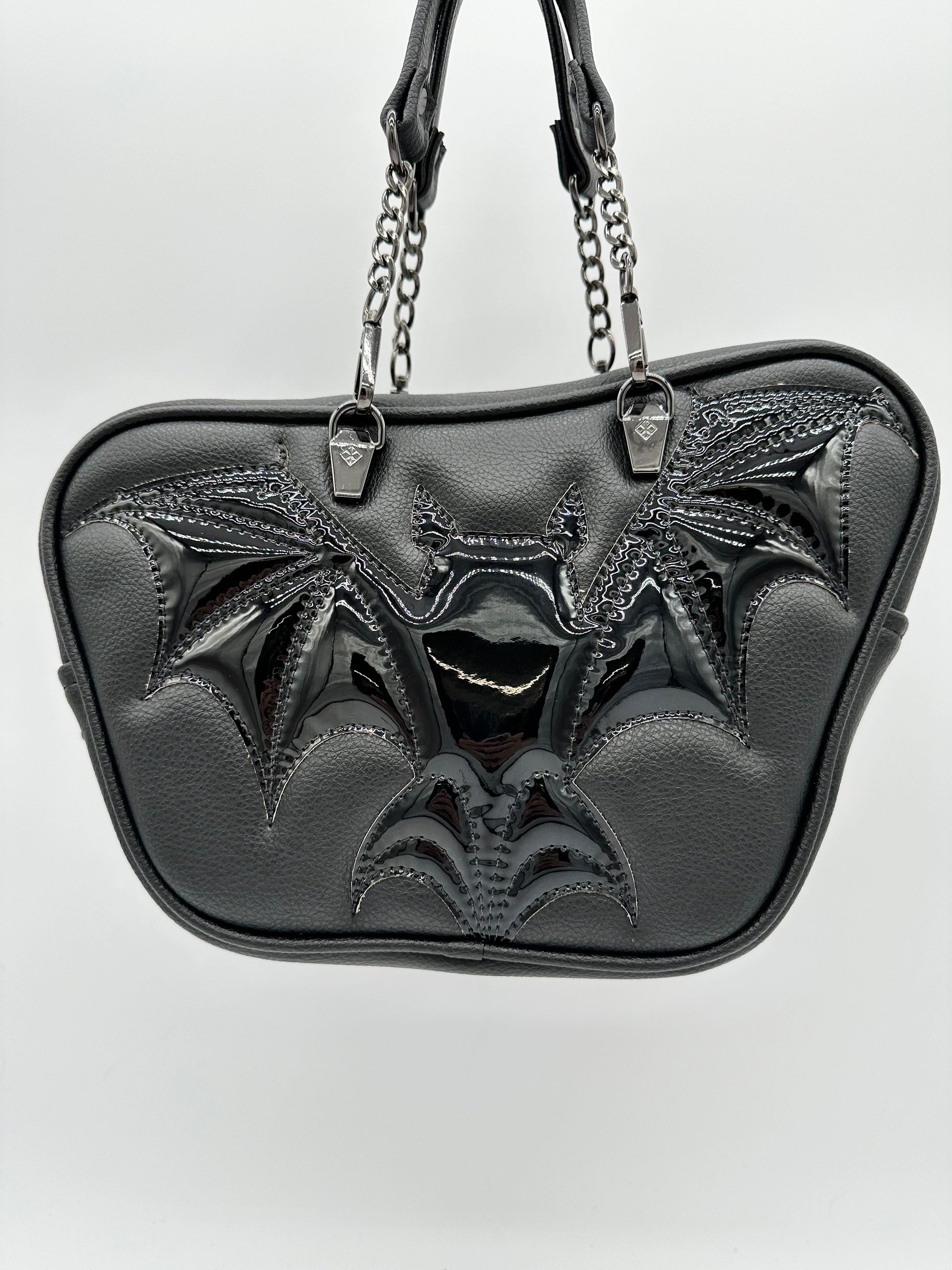 This is one of our Atomic handbags, finished in vinyl with an appliqued bat. Our Atomic bags feature our own custom hardware to mount the straps to the sides, and this one features our coffin hardware! Comes with two matching black symphony vinyl chain hand carry "straps" that give the bag about a 7” drop.