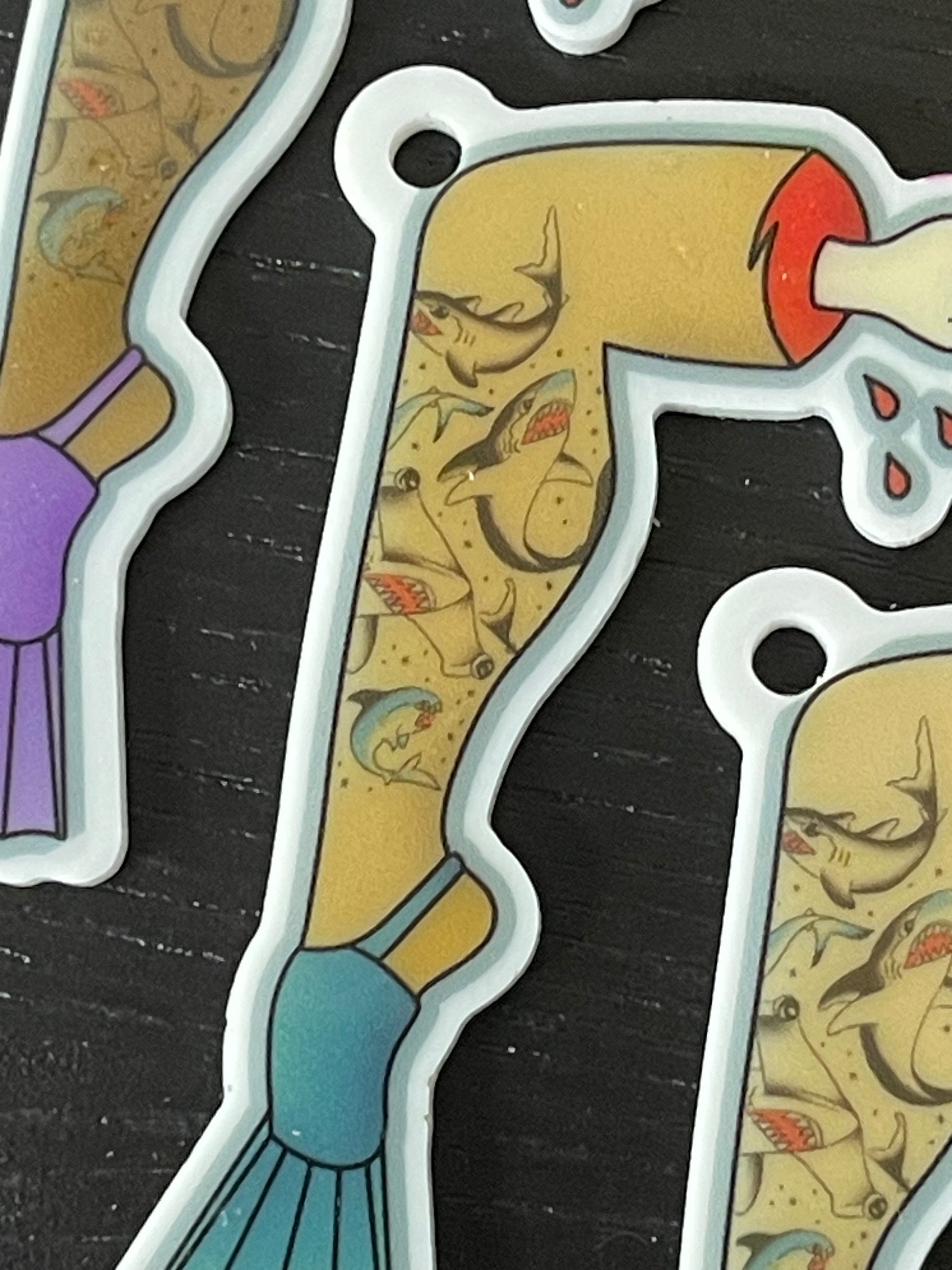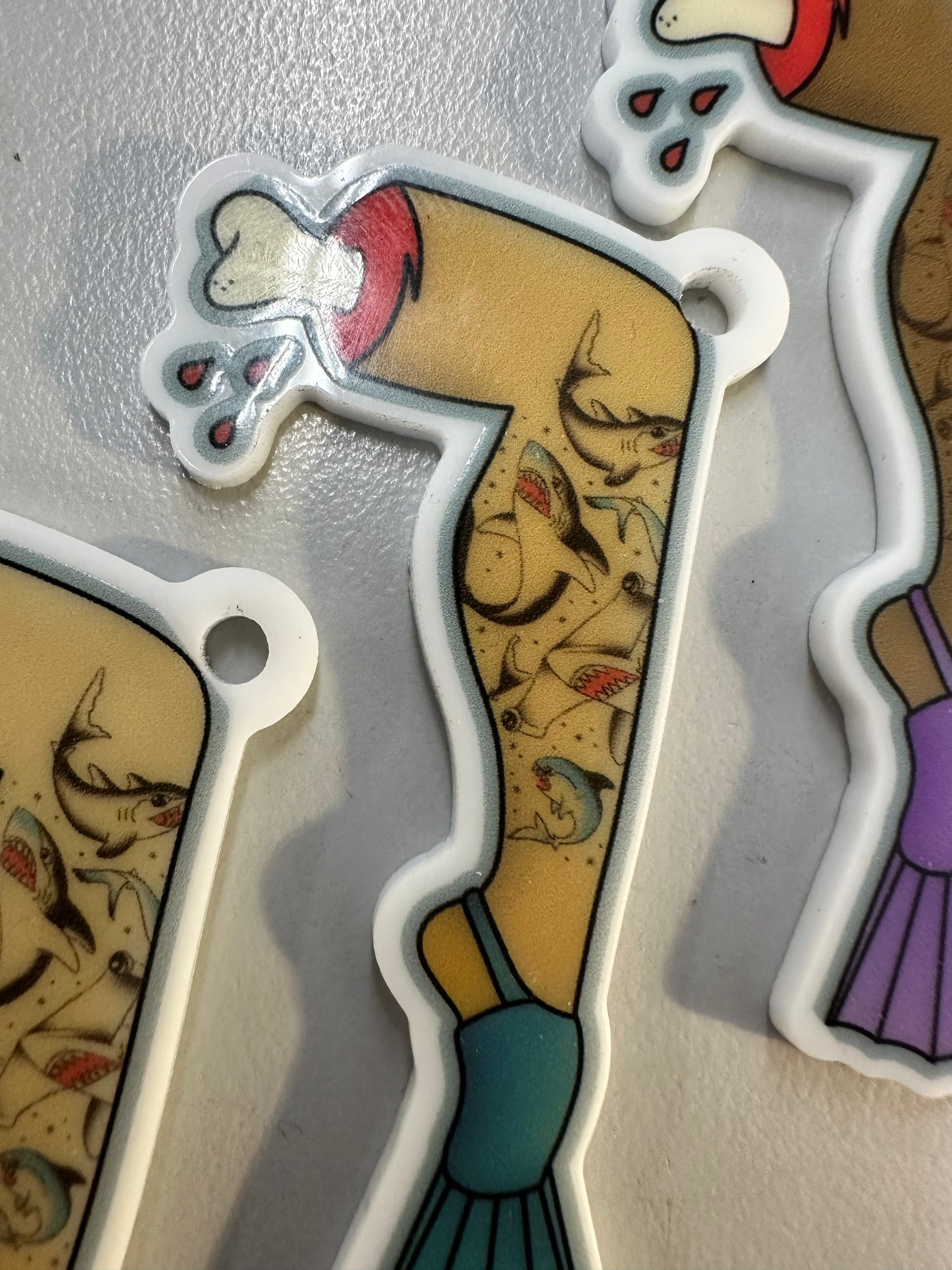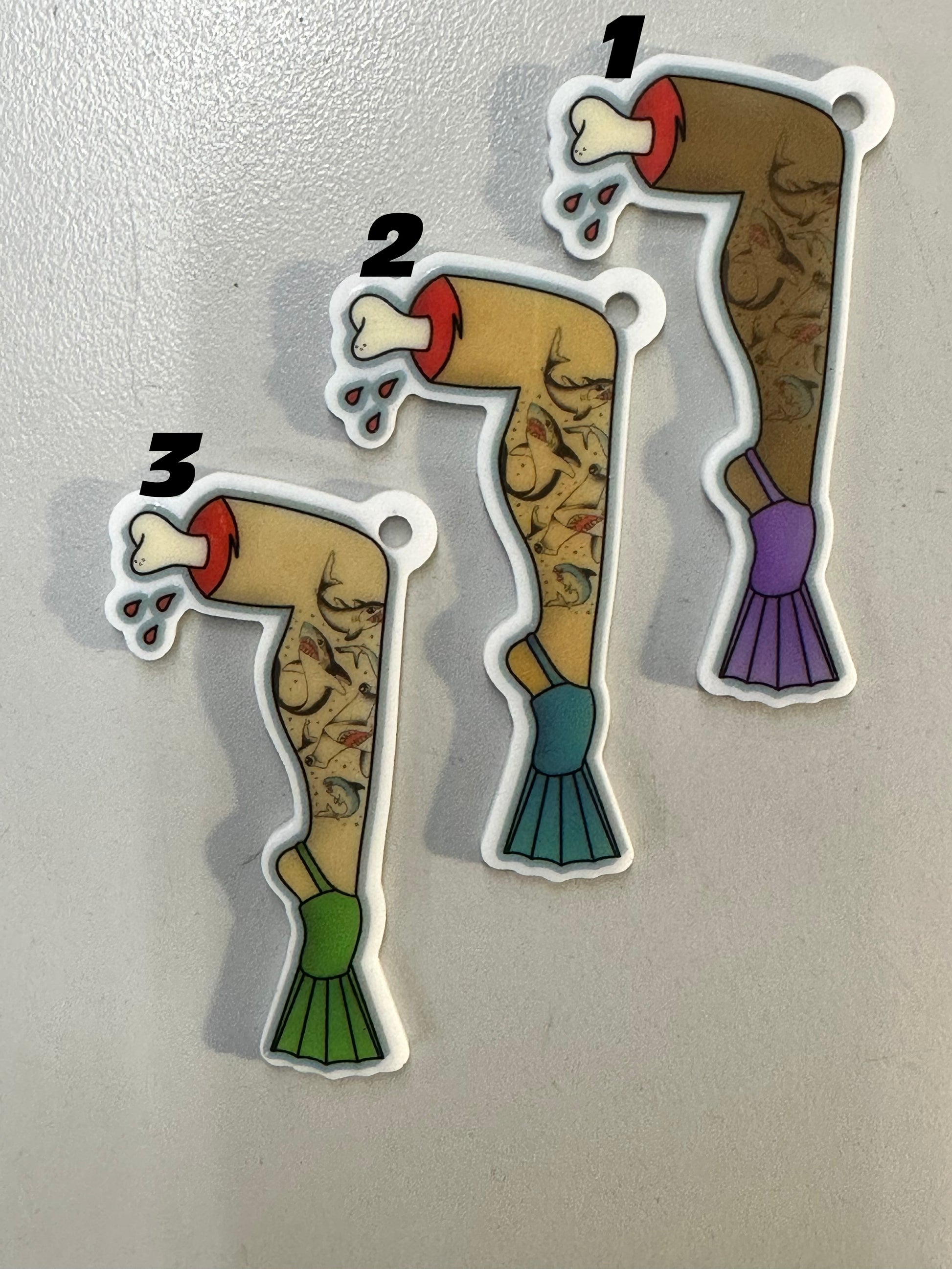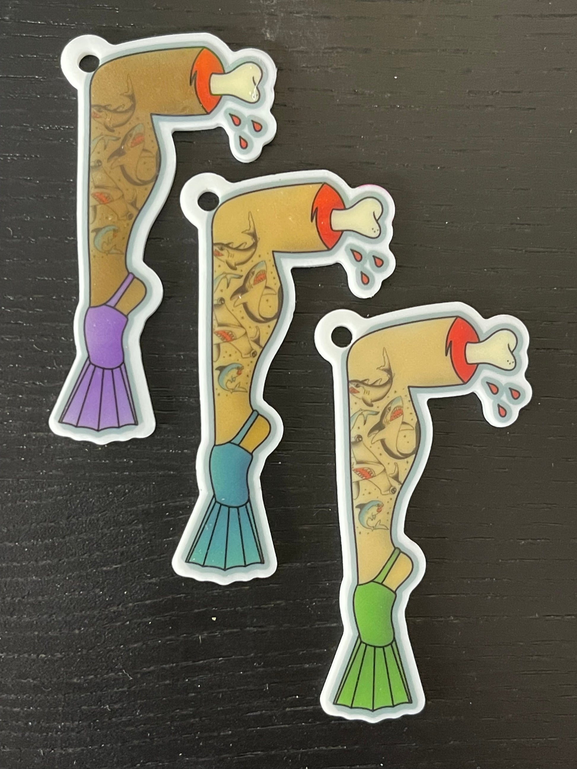 These fun little severed-leg charms are a great match for our shark mouth bags!