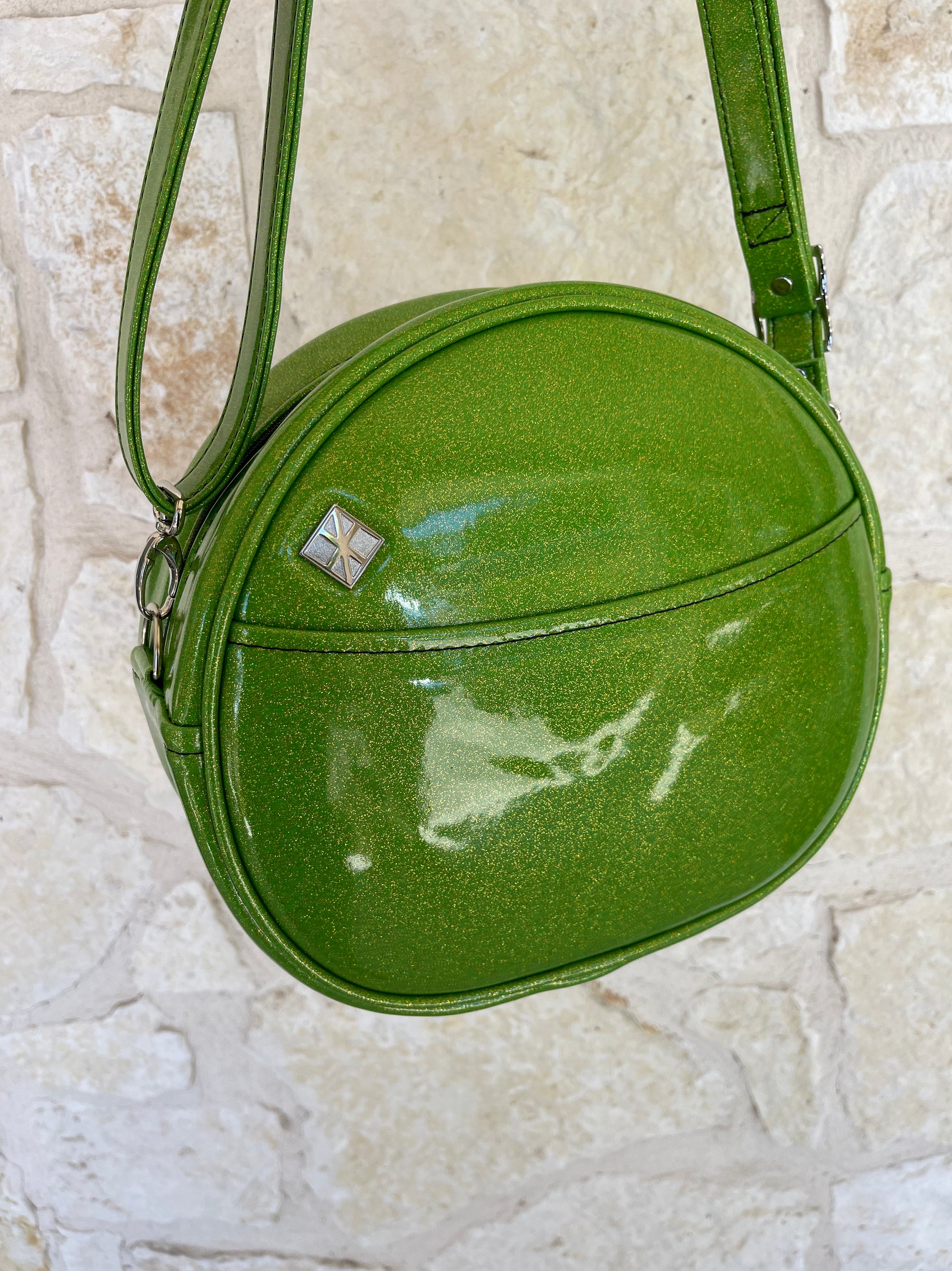 This Happy Side Eye Face cruiser bag is finished in lime glitter vinyl with accents in black chunky glitter holo vinyl. We paired this with black thread for the stitching. This comes with our adjustable shoulder/crossbody strap. It has one outside slip pocket and two inside slip pockets. The bag is lined in a black, padded nylon fabric.