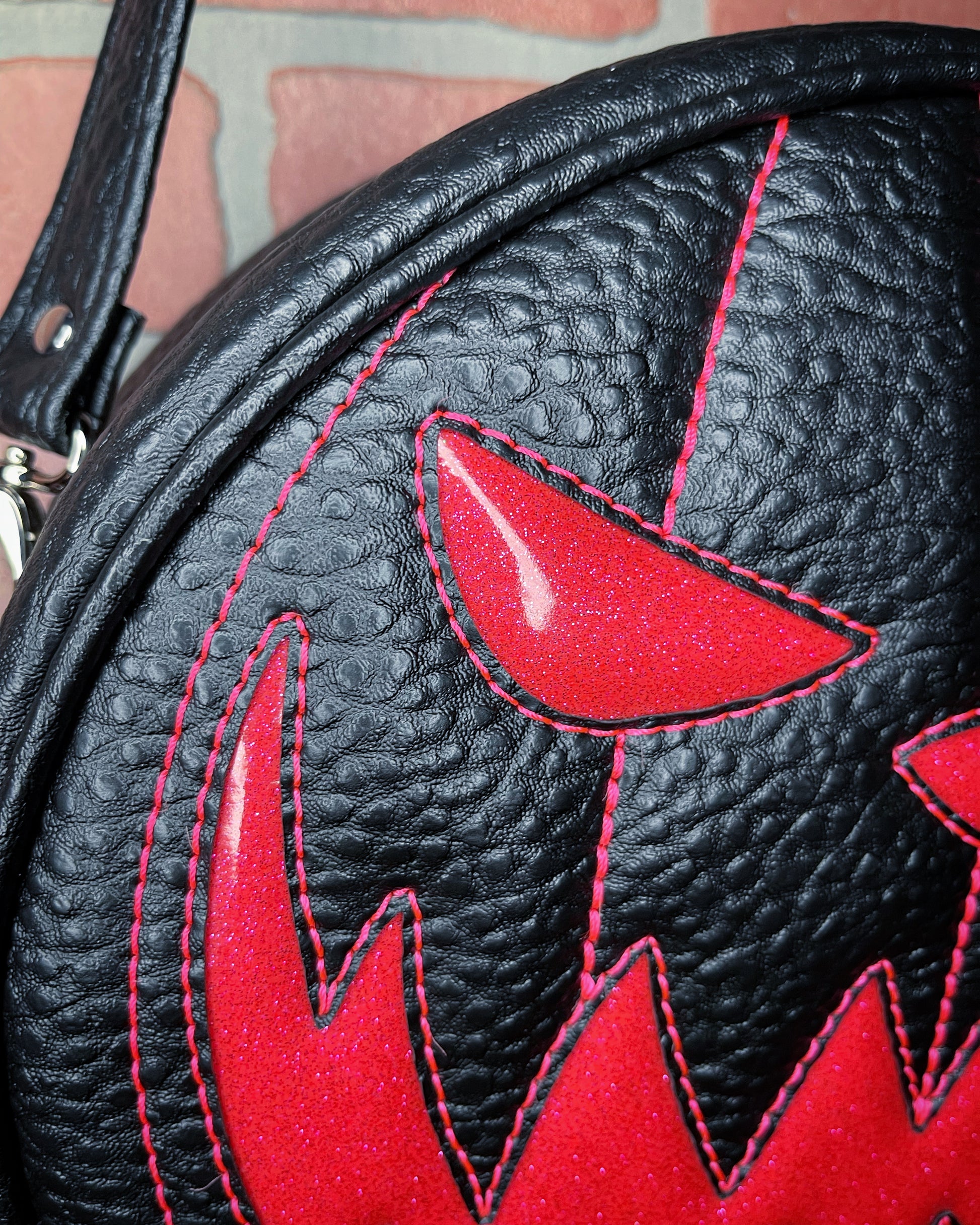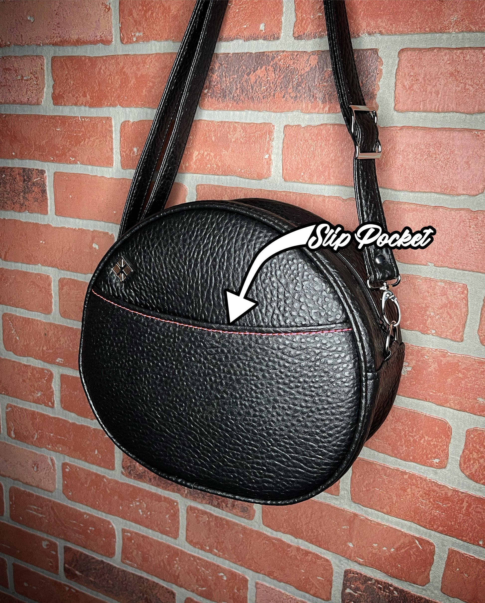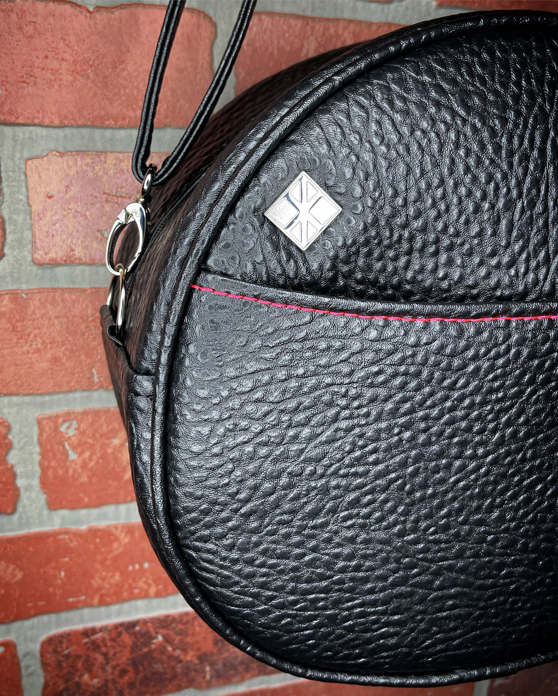 This Cruiser handbag is finished in black Boca vinyl and hot pink glitter vinyl. It features a matching, hot pink thread. This comes with our adjustable shoulder/crossbody strap. It has one outside slip pocket and two inside slip pockets. The bag is lined in a black, padded nylon fabric.