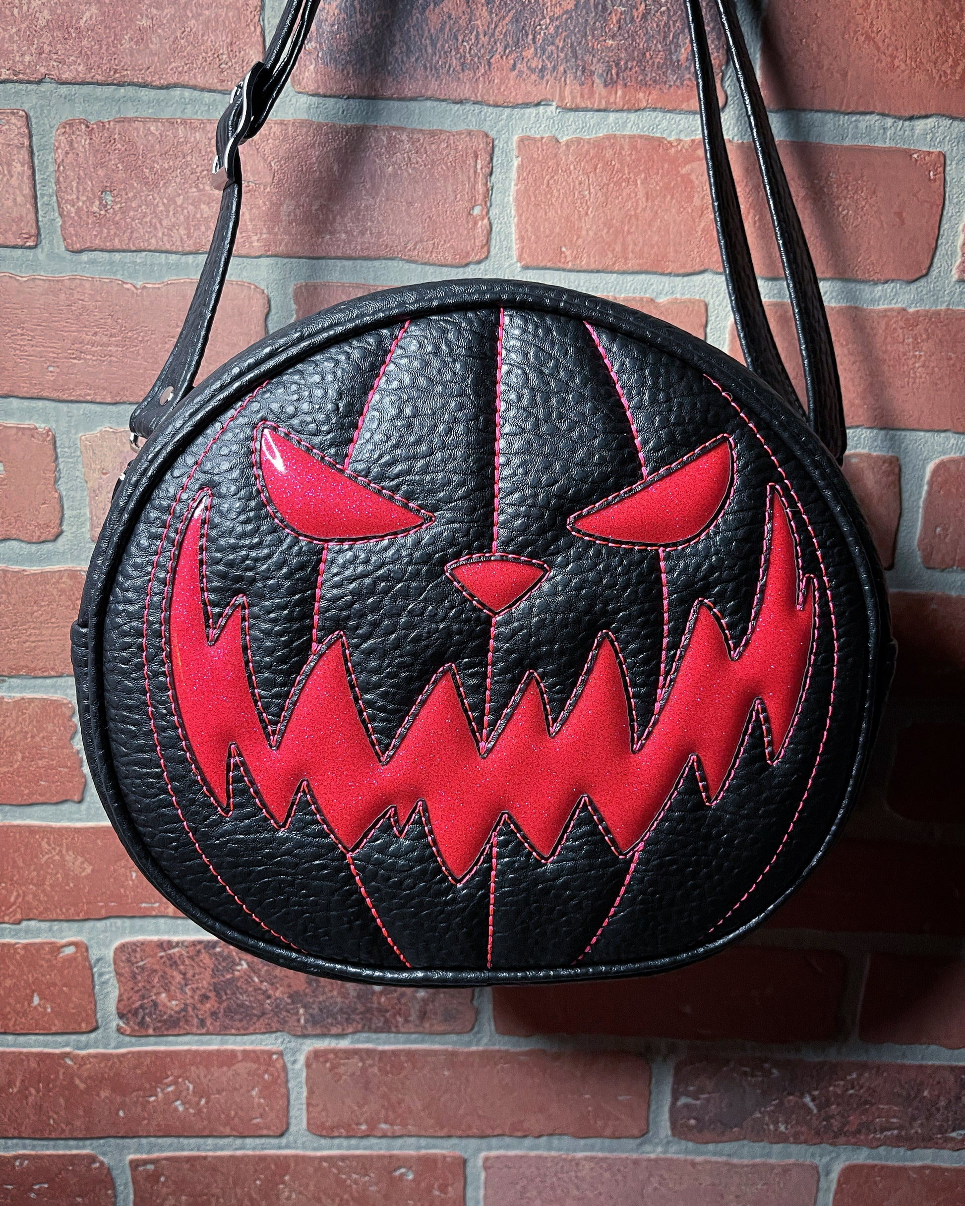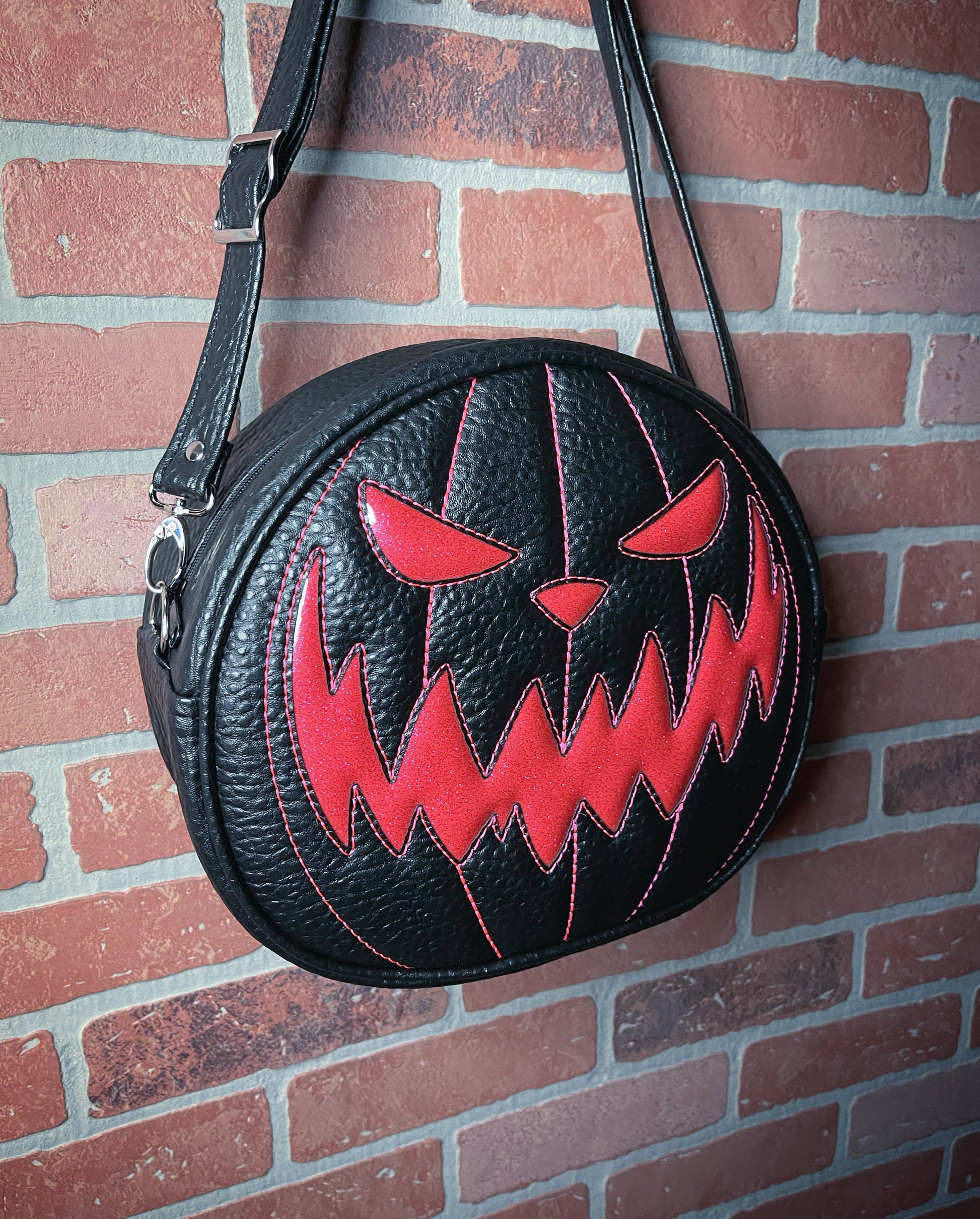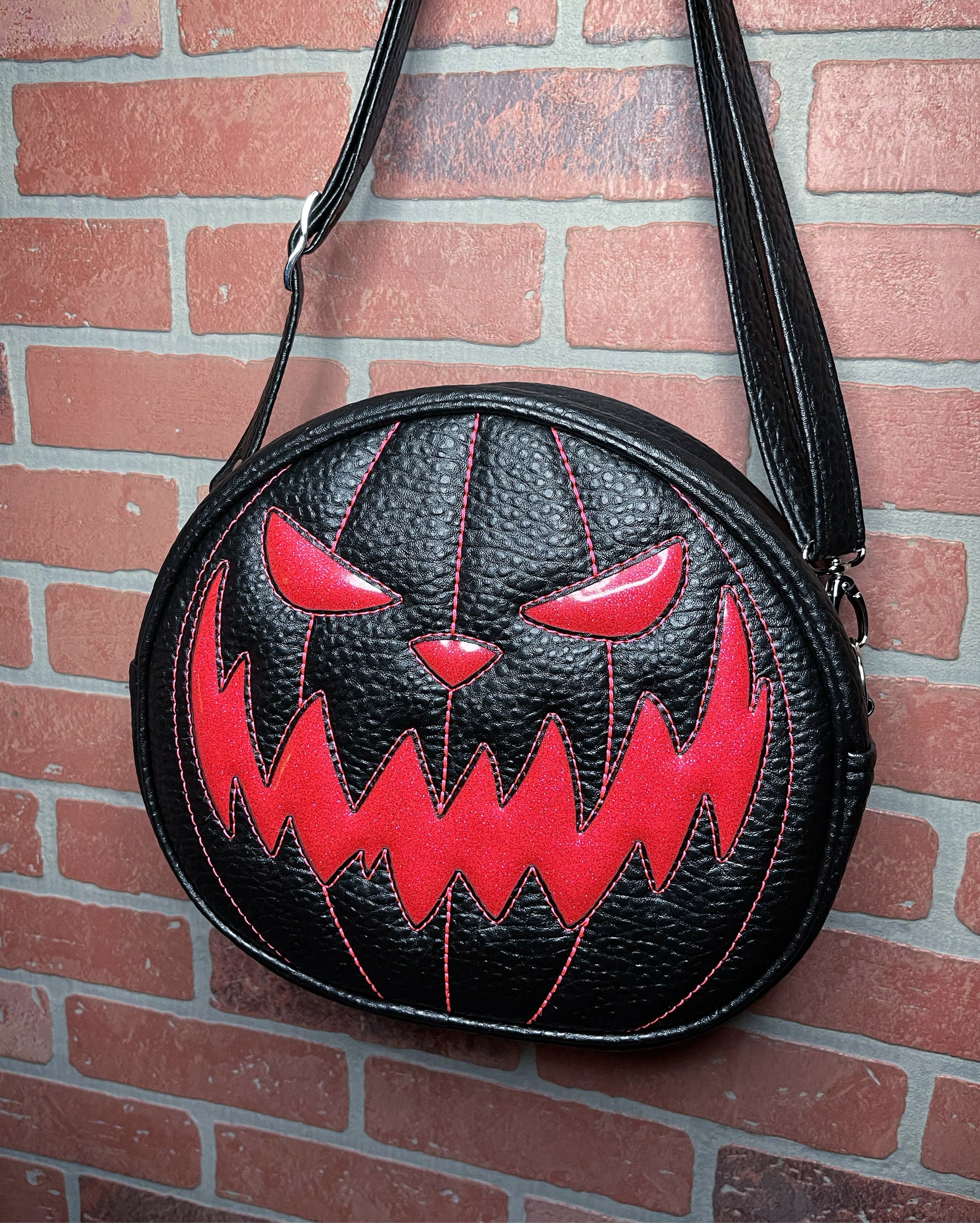 This Cruiser handbag is finished in black Boca vinyl and hot pink glitter vinyl. It features a matching, hot pink thread. This comes with our adjustable shoulder/crossbody strap. It has one outside slip pocket and two inside slip pockets. The bag is lined in a black, padded nylon fabric.