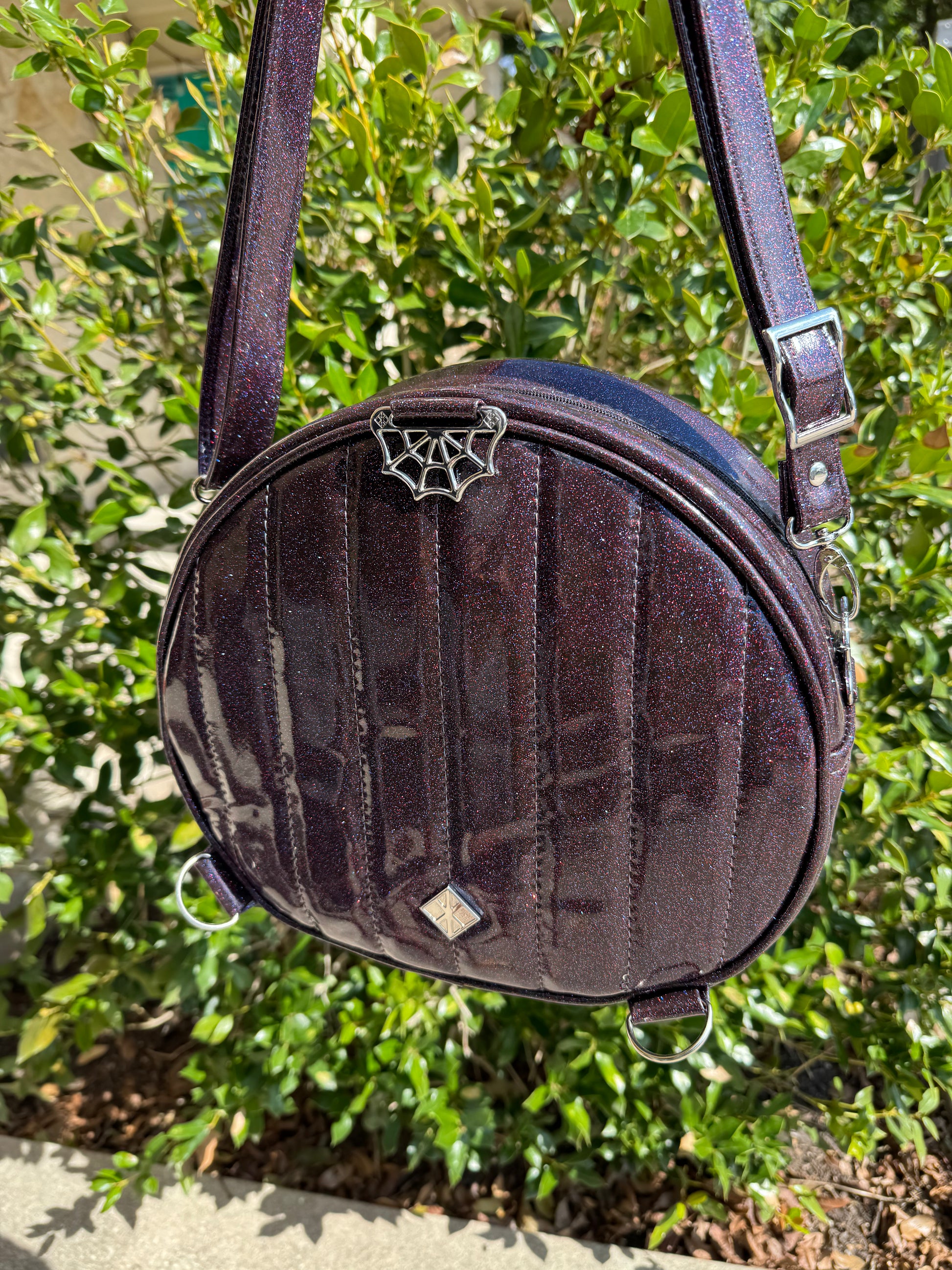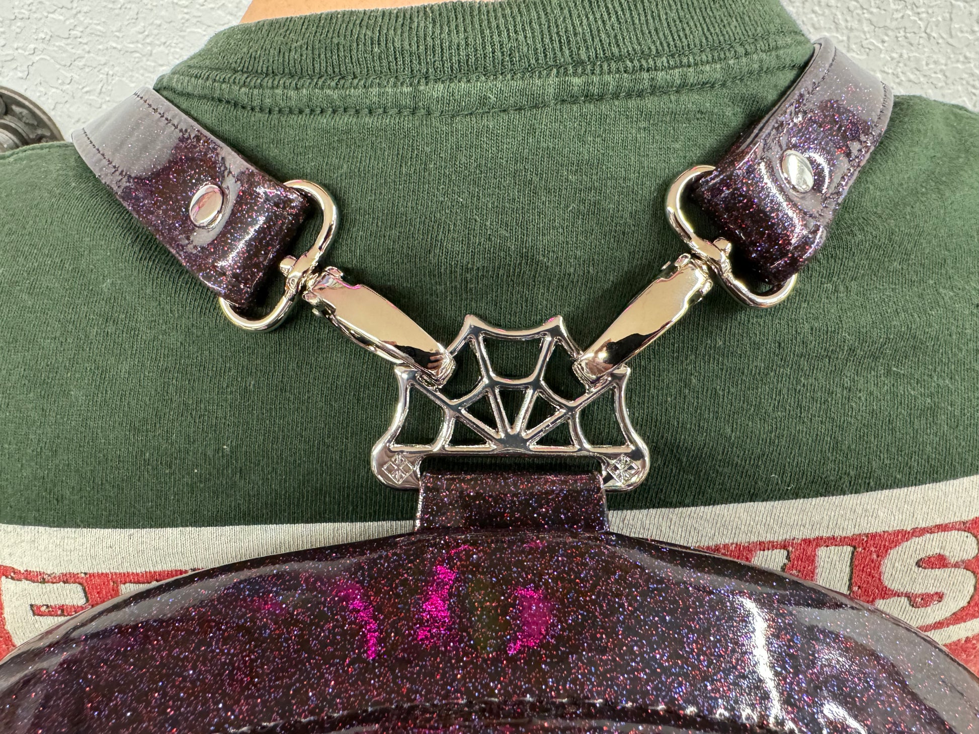 This Cruiser handbag/backpack is finished in purple ion glitter vinyl and shattered silver holo vinyl. This comes with our adjustable shoulder/crossbody strap, and two more adjustable straps for using it as a backpack. It has two inside slip pockets. The bag is lined in a black, padded nylon fabric. This bag has our shiny silver spider web hardware. For the backpack straps, we only use the spider web hardware on the top, and we use standard d-ring hardware on the bottom mounting points for the backpack straps. The bottom ones tend to poke you in the back if they are the spider web hardware!