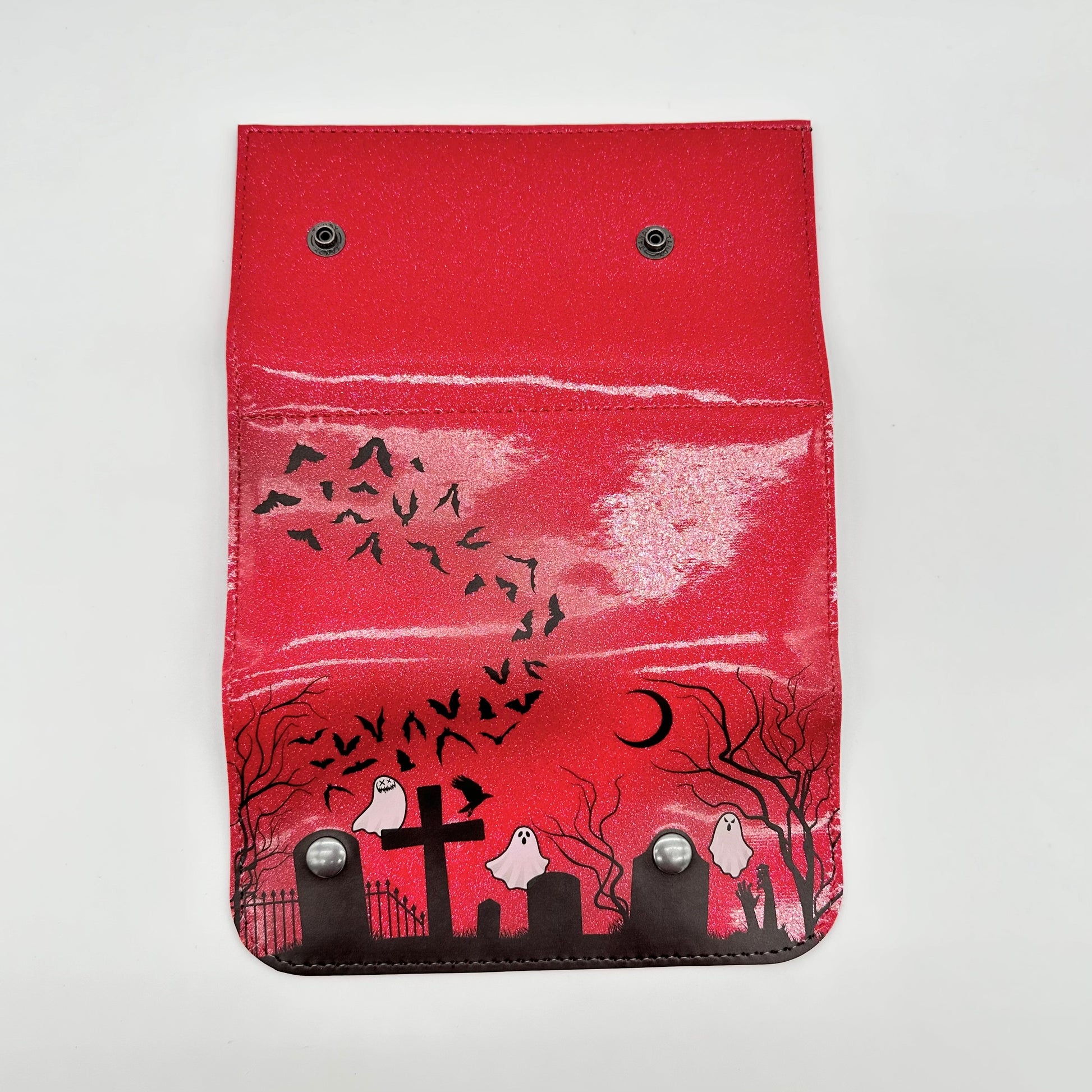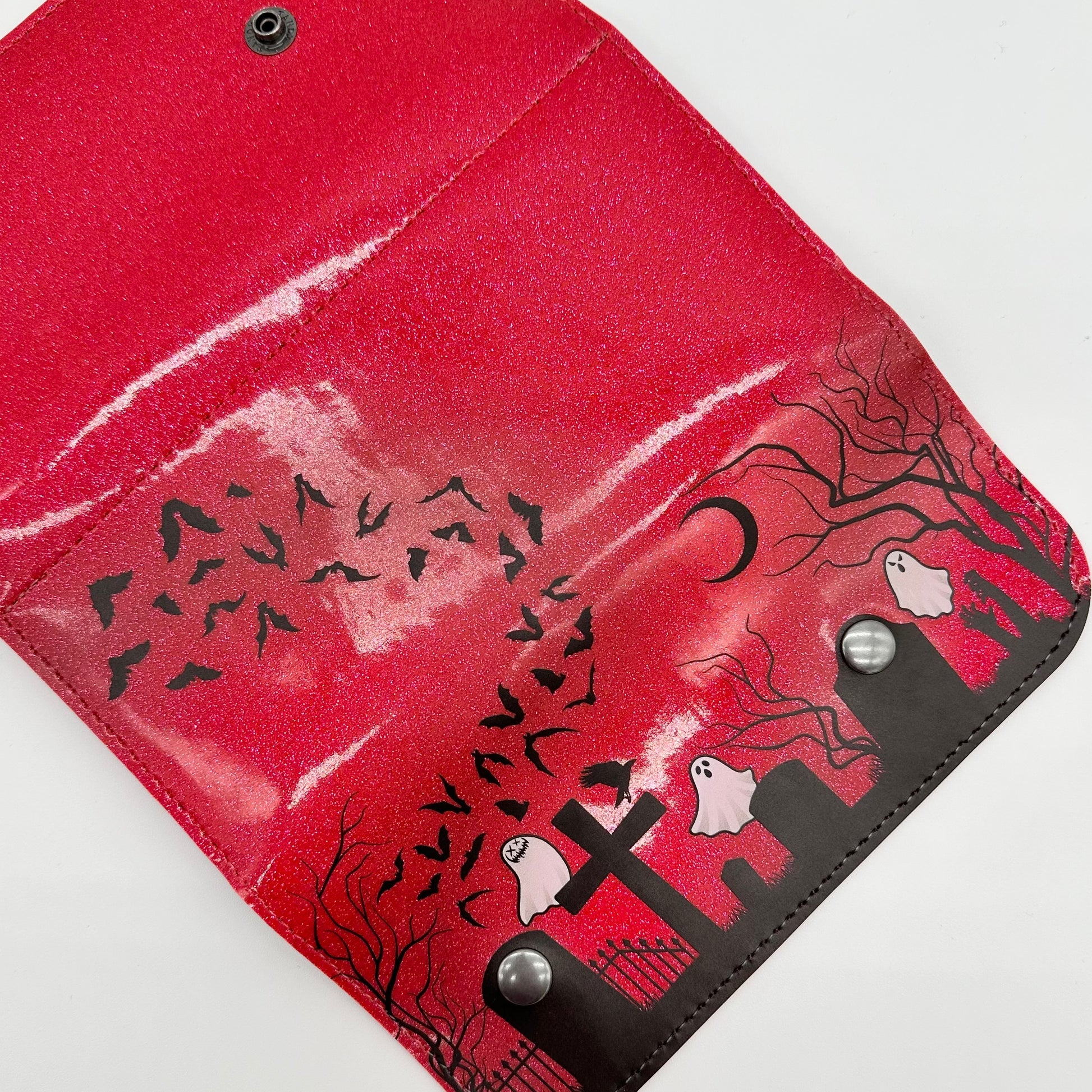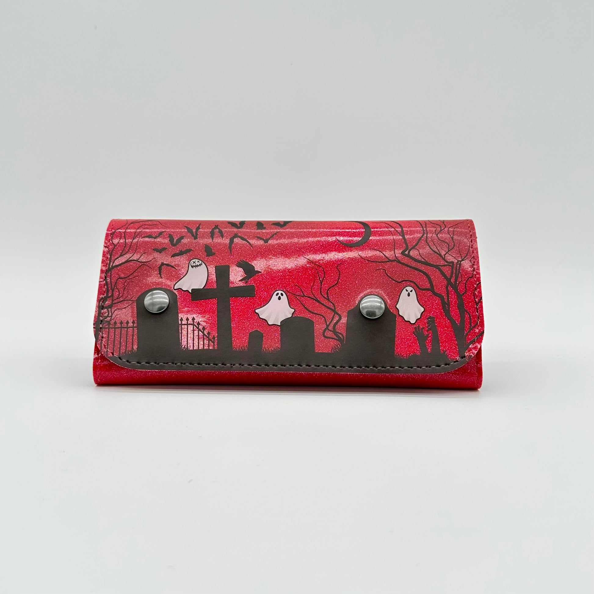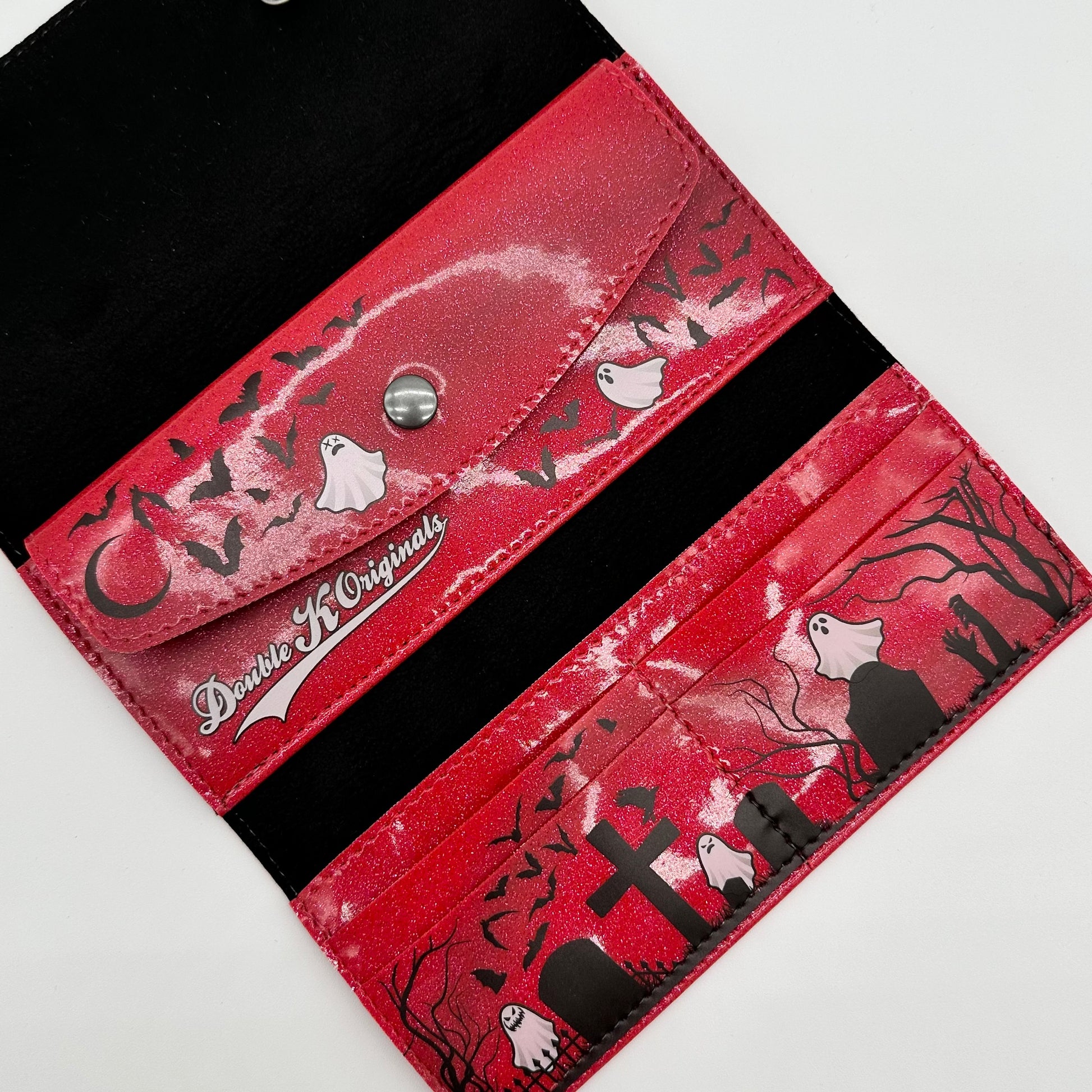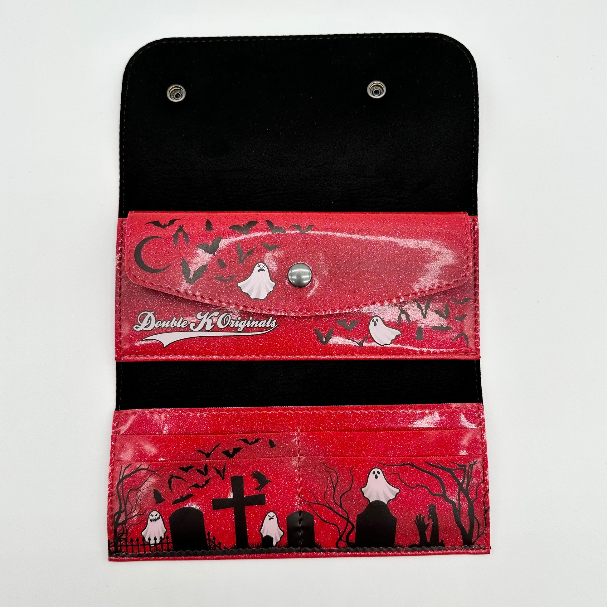 Our Doublewide Wallets feature a snap closure, interior coin pouch, and 4 card slots. There are slip pockets, perfect for cash, behind the coin pouch and card slots. Designed, printed, and sewn in Texas! Measures 7.5" x 3.5". Lined in a soft black fabric.These feature our own graveyard design printed in-house, using our UV printer.