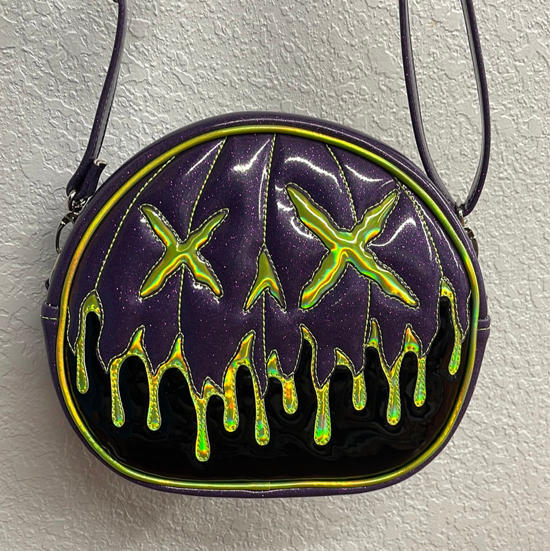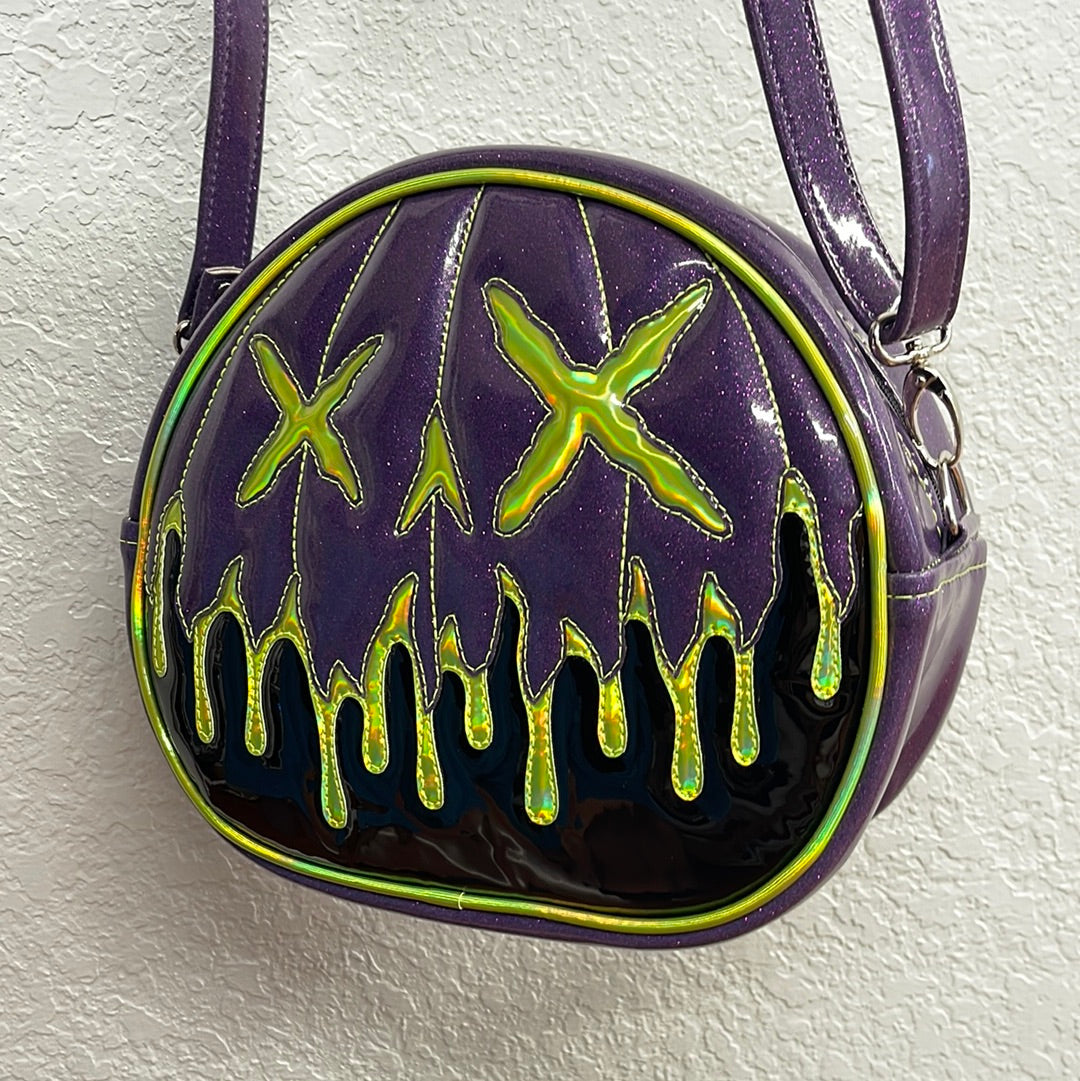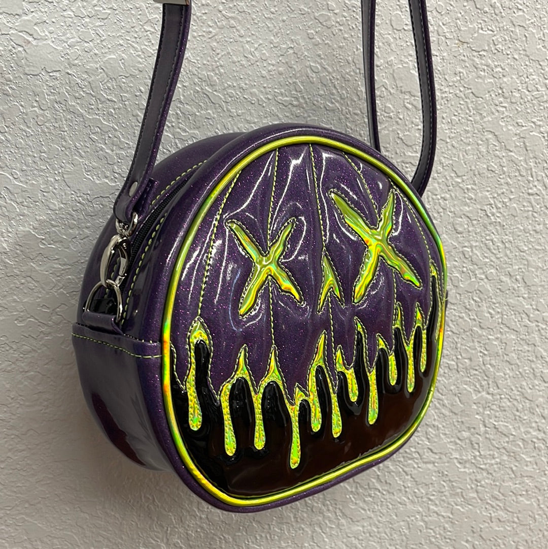 This handbag features our Drippy Drop design that looks like the face is bleeding or oozing. We created this design by taking a base shade of vinyl and layering a 2nd color or texture. A 3rd vinyl layer is stitched on creating the xX Eye design you know and love. The precise layering of the 3 materials gives the look of depth and dimension to the spooky pumpkin face. This comes with a matching adjustable vinyl crossbody strap. It has one outside slip pocket and two inside slip pockets. The bag is lined in a black, padded nylon fabric.