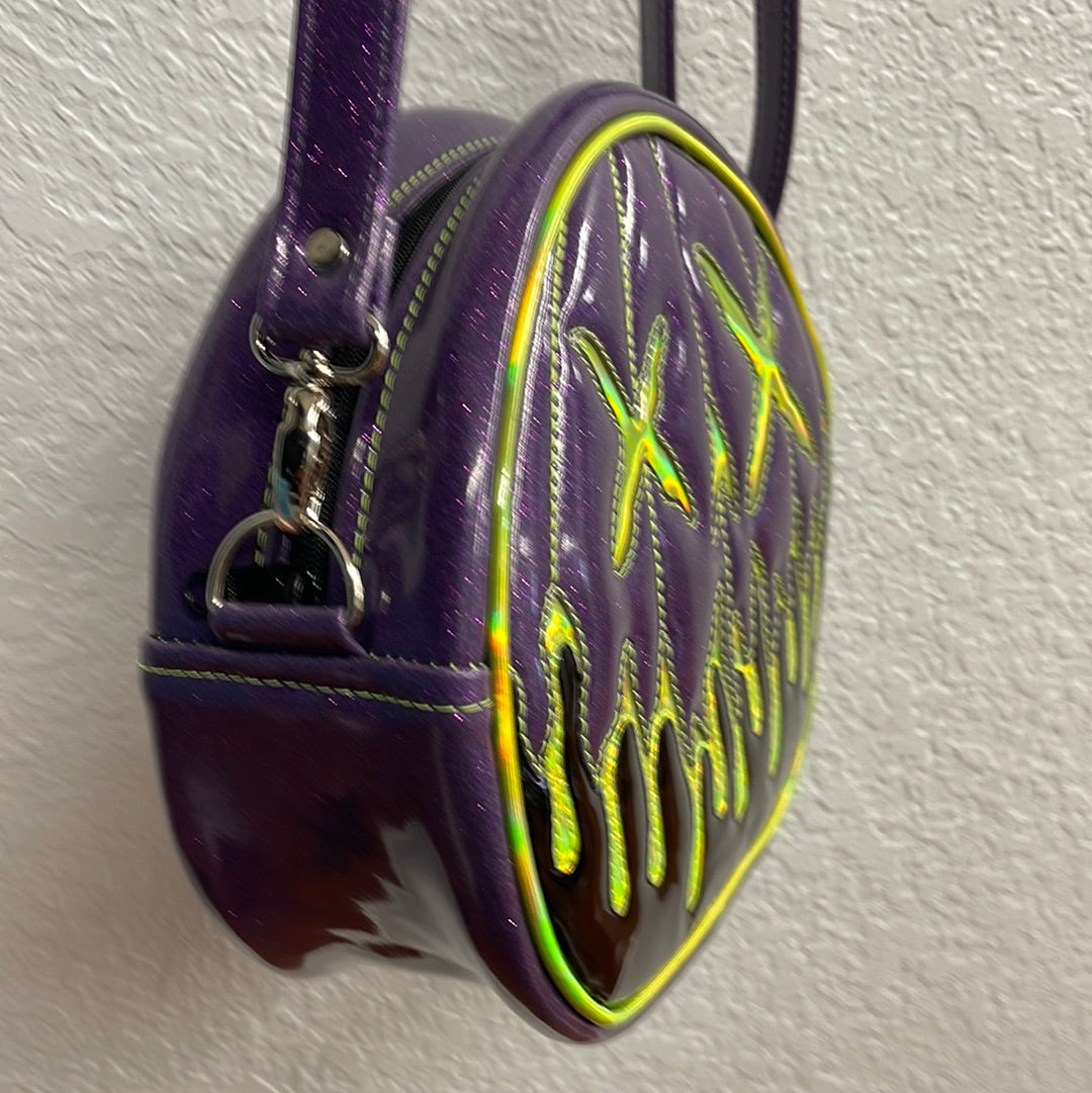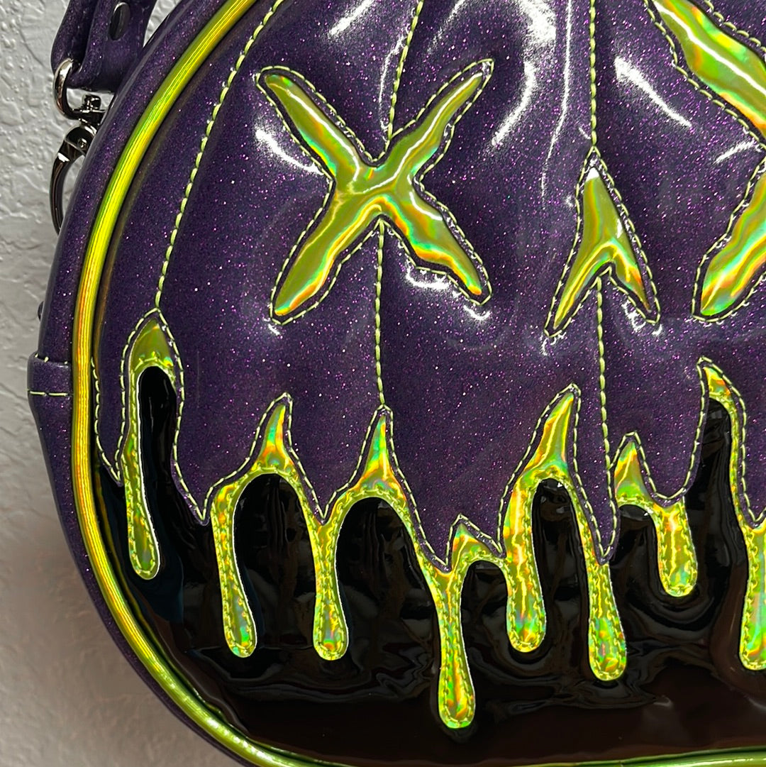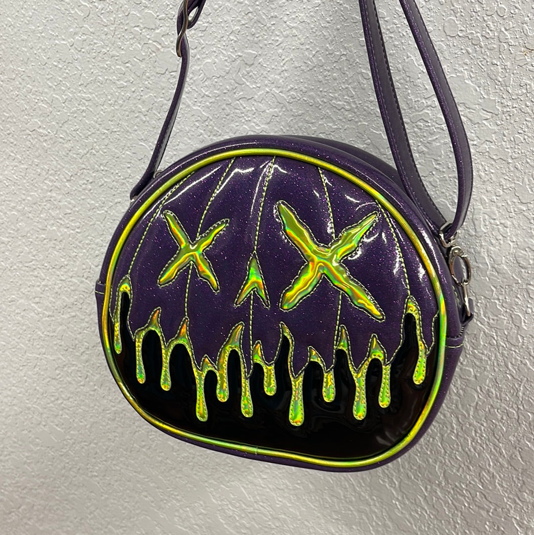 This handbag features our Drippy Drop design that looks like the face is bleeding or oozing. We created this design by taking a base shade of vinyl and layering a 2nd color or texture. A 3rd vinyl layer is stitched on creating the xX Eye design you know and love. The precise layering of the 3 materials gives the look of depth and dimension to the spooky pumpkin face. This comes with a matching adjustable vinyl crossbody strap. It has one outside slip pocket and two inside slip pockets. The bag is lined in a black, padded nylon fabric.