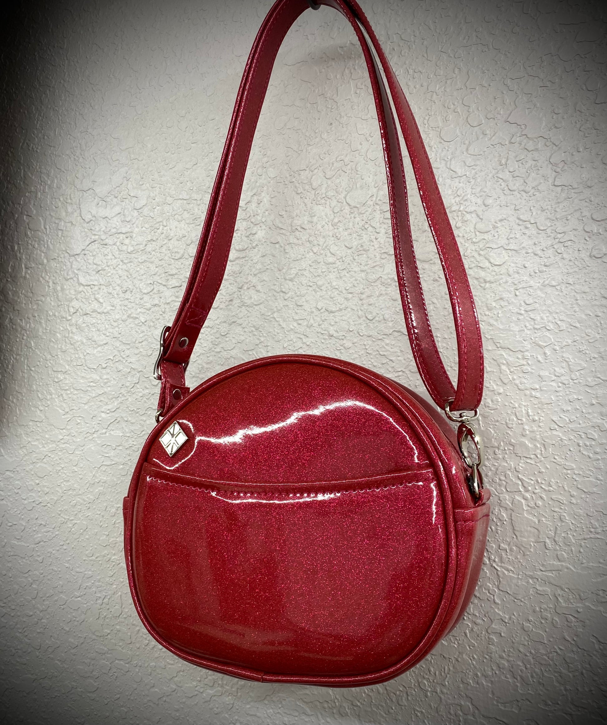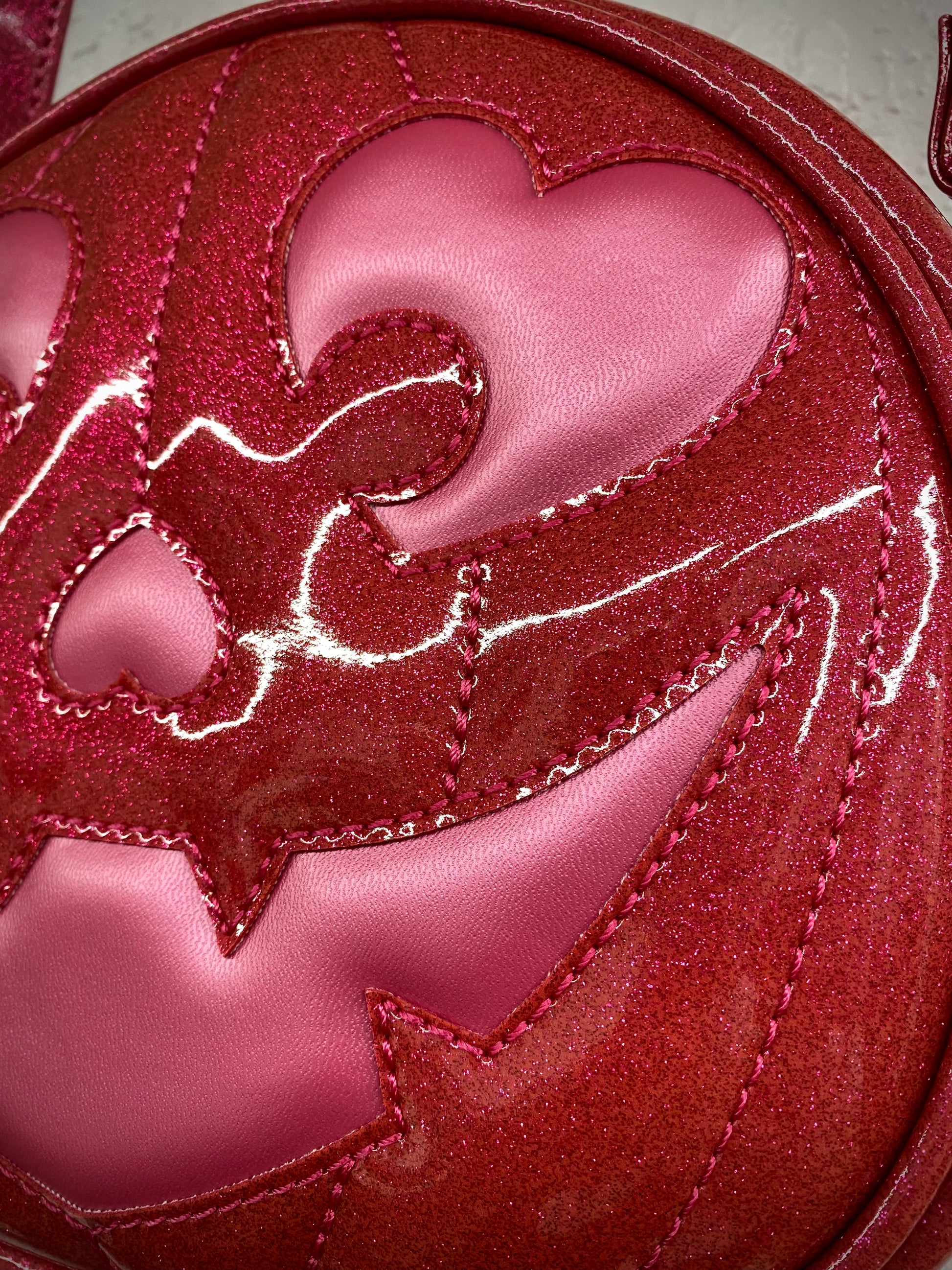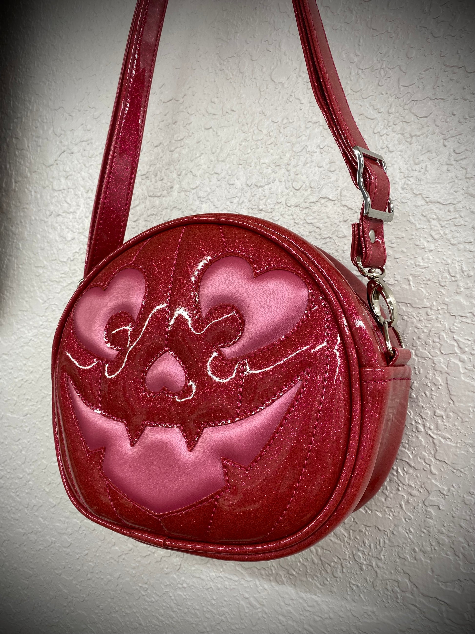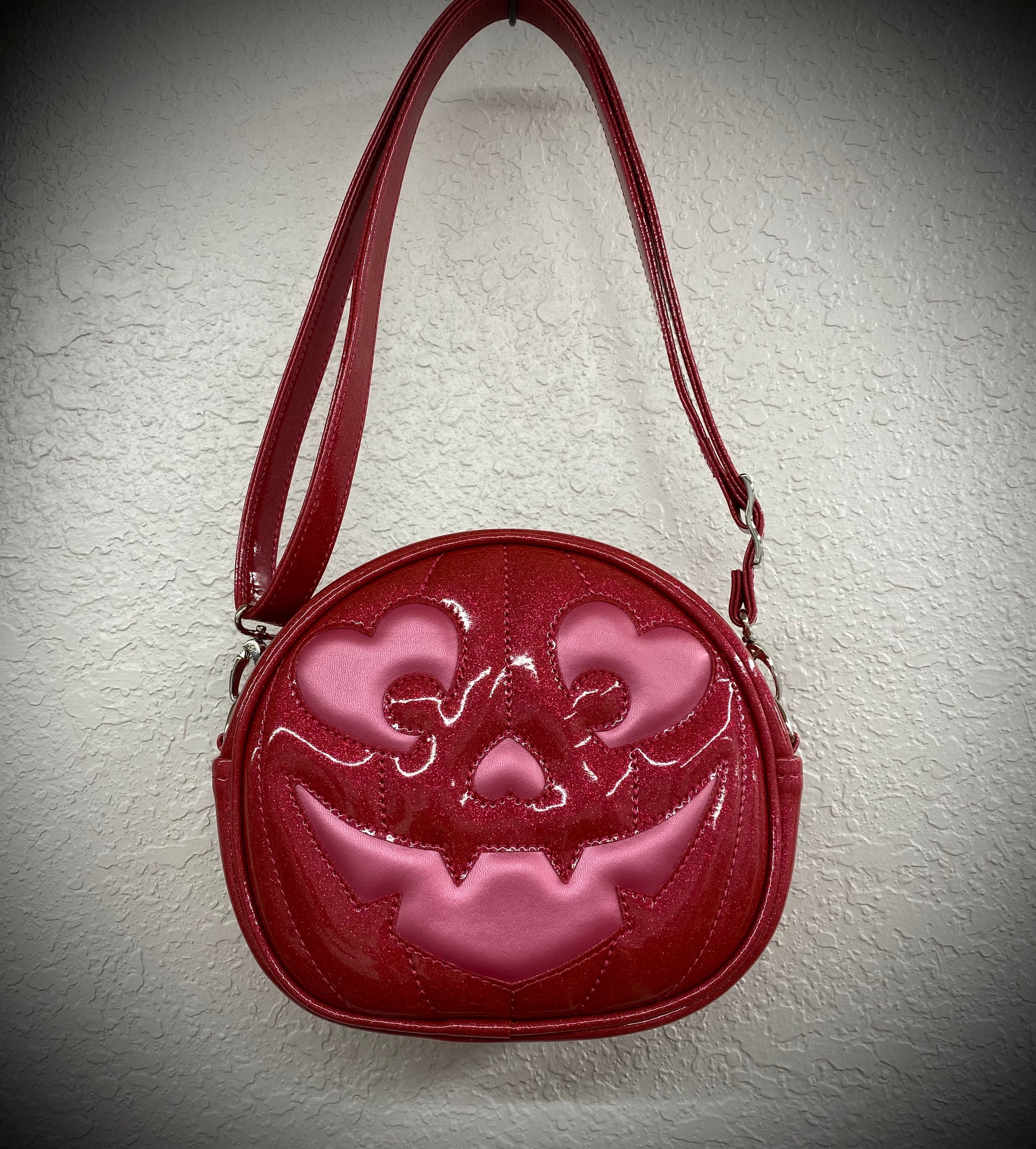 This little pumpkin cutie is one of our Mini Cruisers bags. We paired fuchsia glitter vinyl with pink pearl vinyl for our Heart Pumps for Pumpkins face and used a matching fuchsia thread to stitch all the details. This comes with a matching adjustable vinyl crossbody strap. It has one outside slip pocket and two inside slip pockets. The bag is lined in a black, padded nylon fabric.