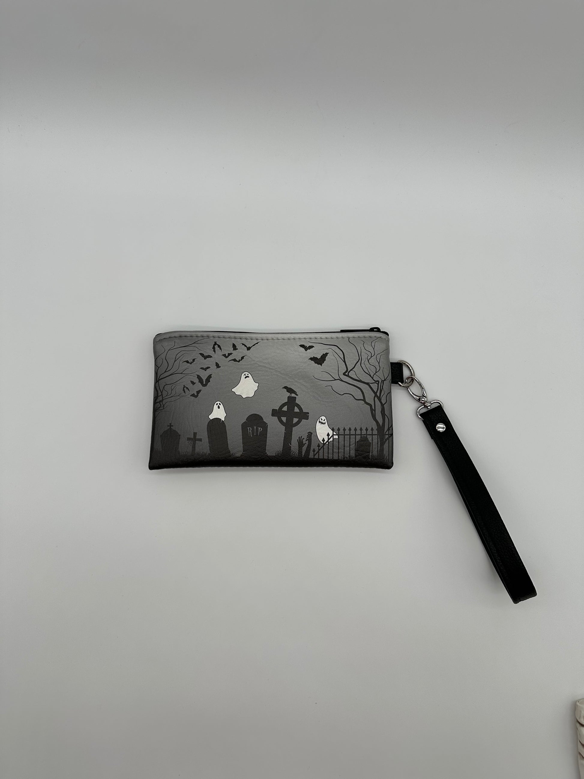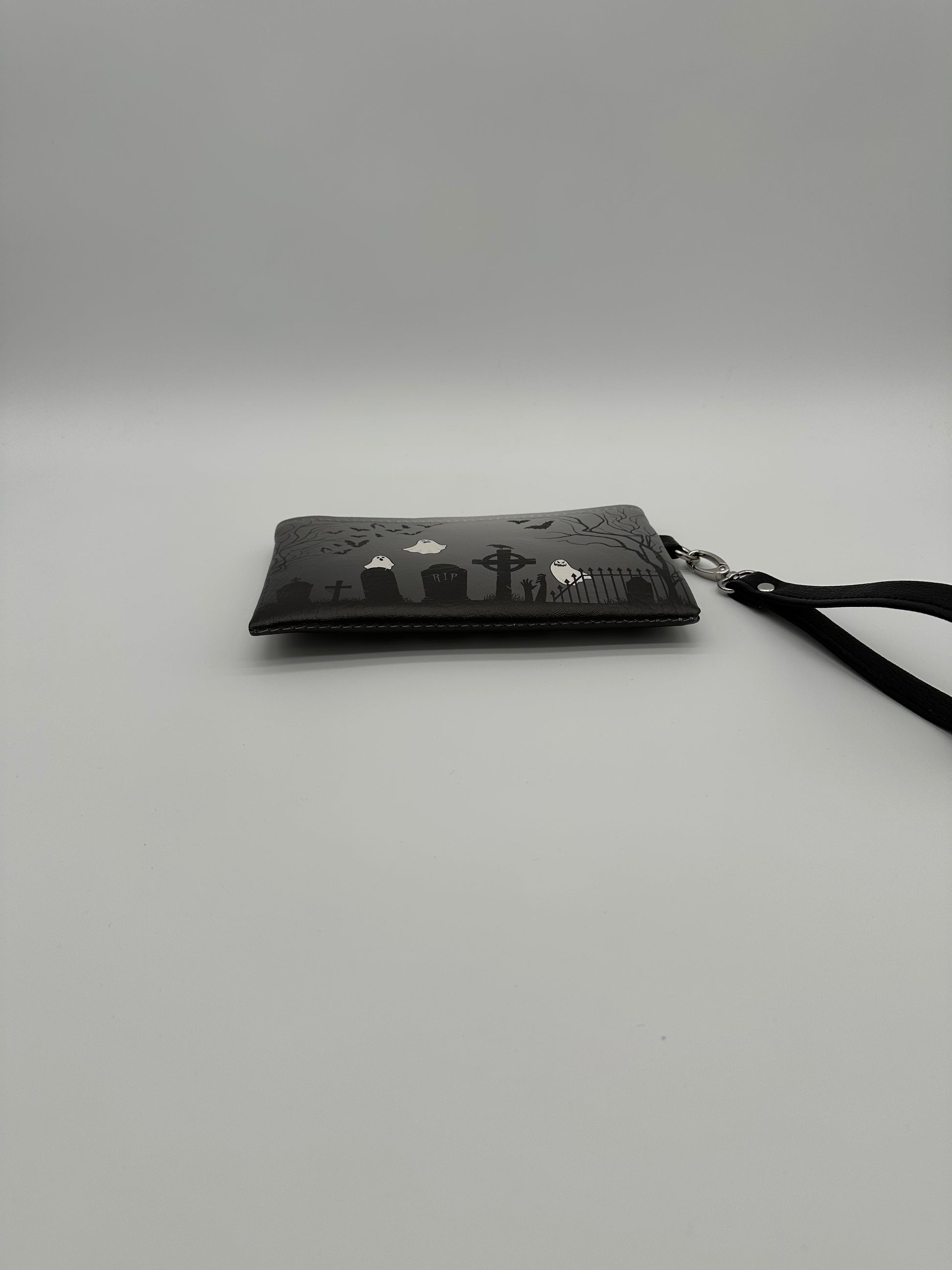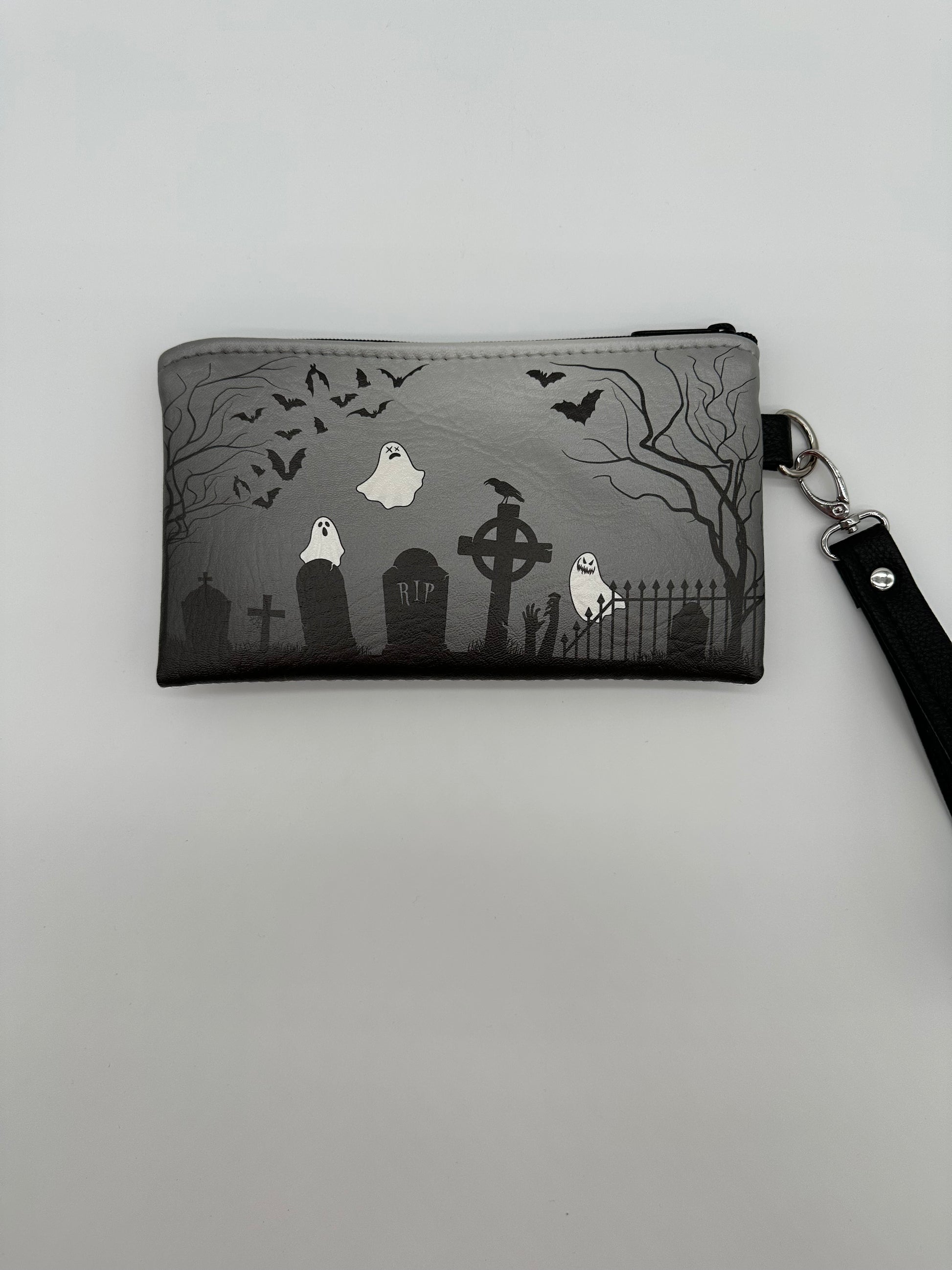 We created wristlet using the same elements as our graveyard handbags. The design was created in Illustrator by Shawn, and we used our professional UV printer to apply the design to the vinyl. Includes a black symphony vinyl wrist strap. Measures about 9" x 5". Lined in a padded black cloth. No pockets. The graveyard design is printed on both sides of the wristlet.