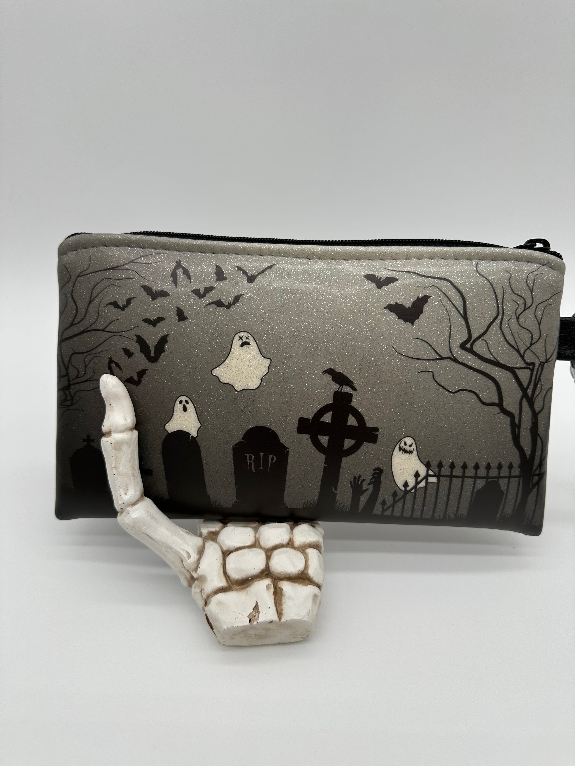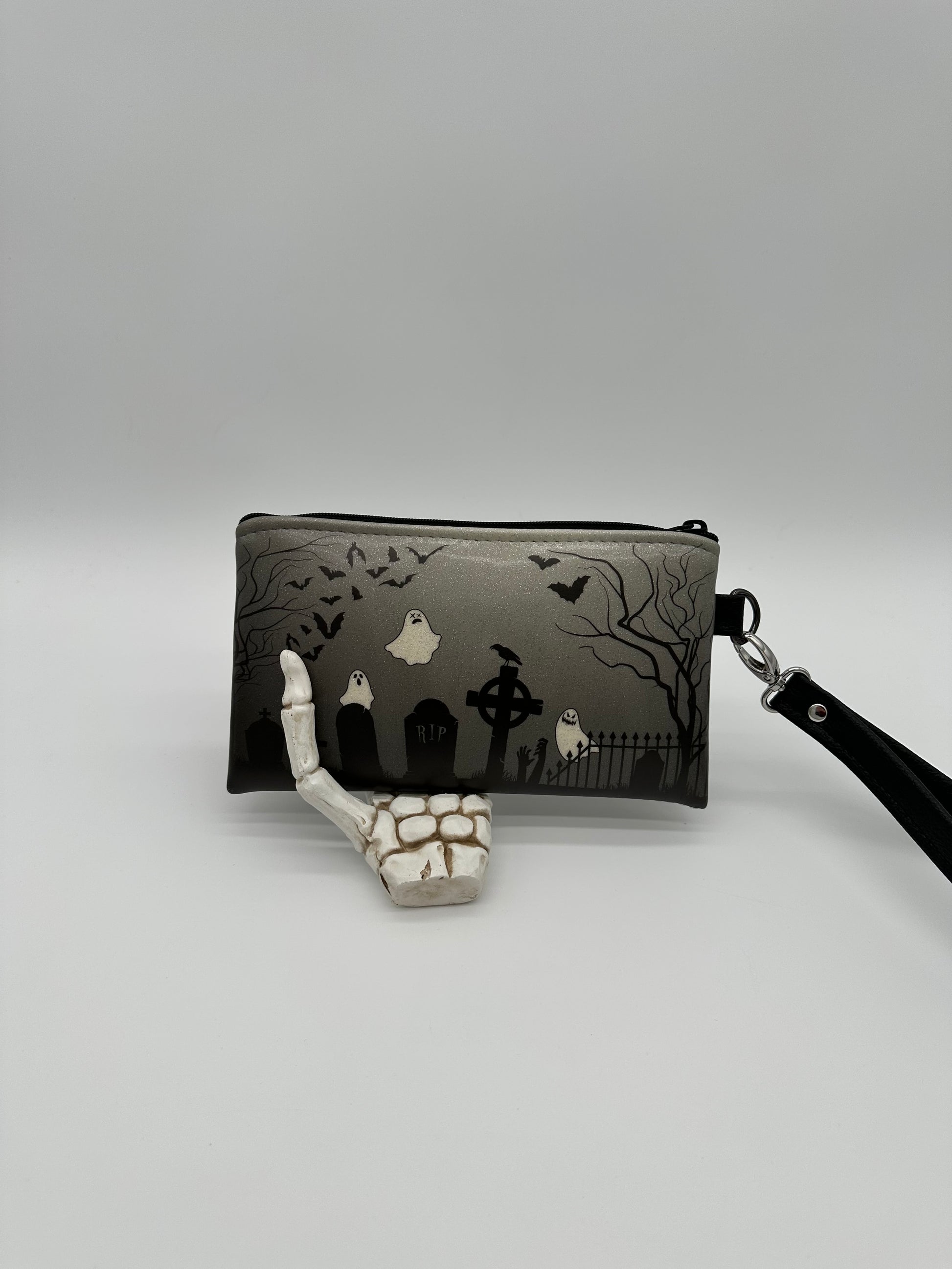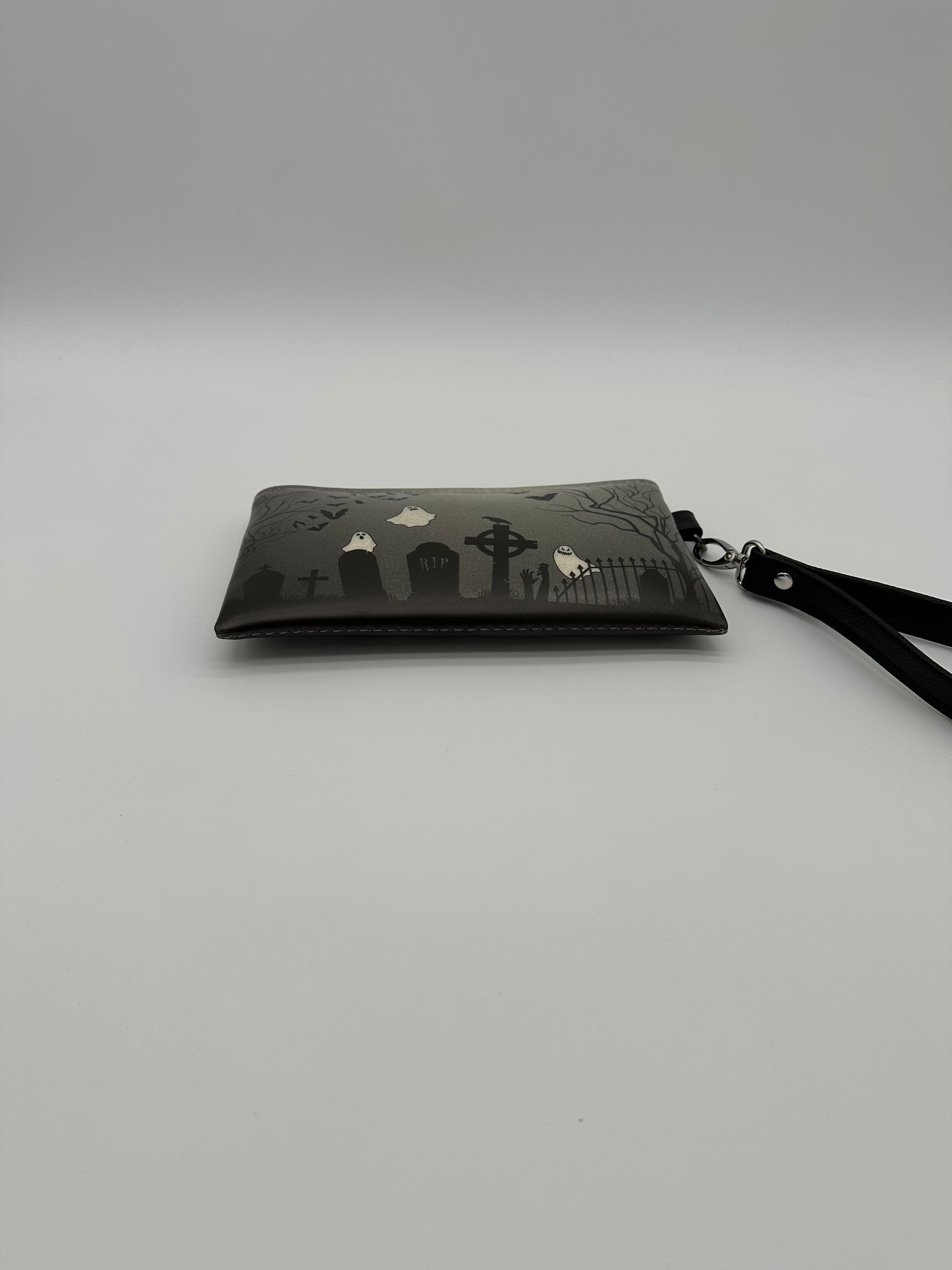 We created wristlet using the same elements as our graveyard handbags. The design was created in Illustrator by Shawn, and we used our professional UV printer to apply the design to the vinyl. Includes a black symphony vinyl wrist strap. Measures about 9" x 5". Lined in a padded black cloth. No pockets. The graveyard design is printed on both sides of the wristlet.