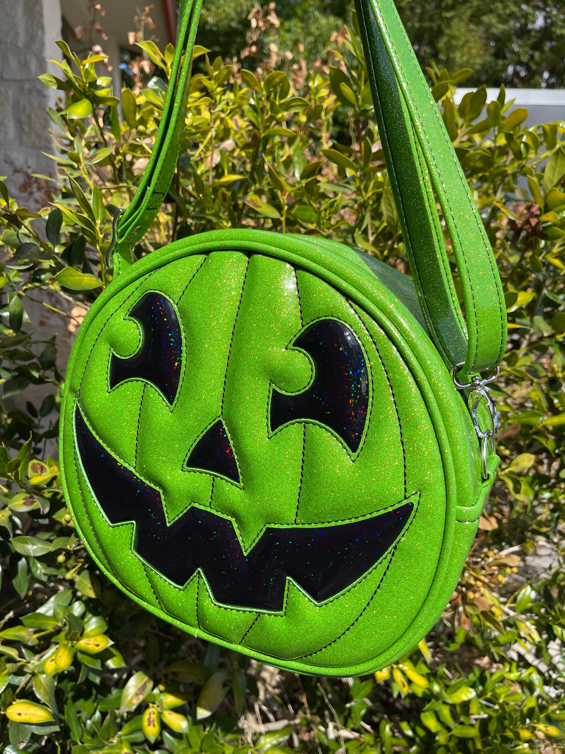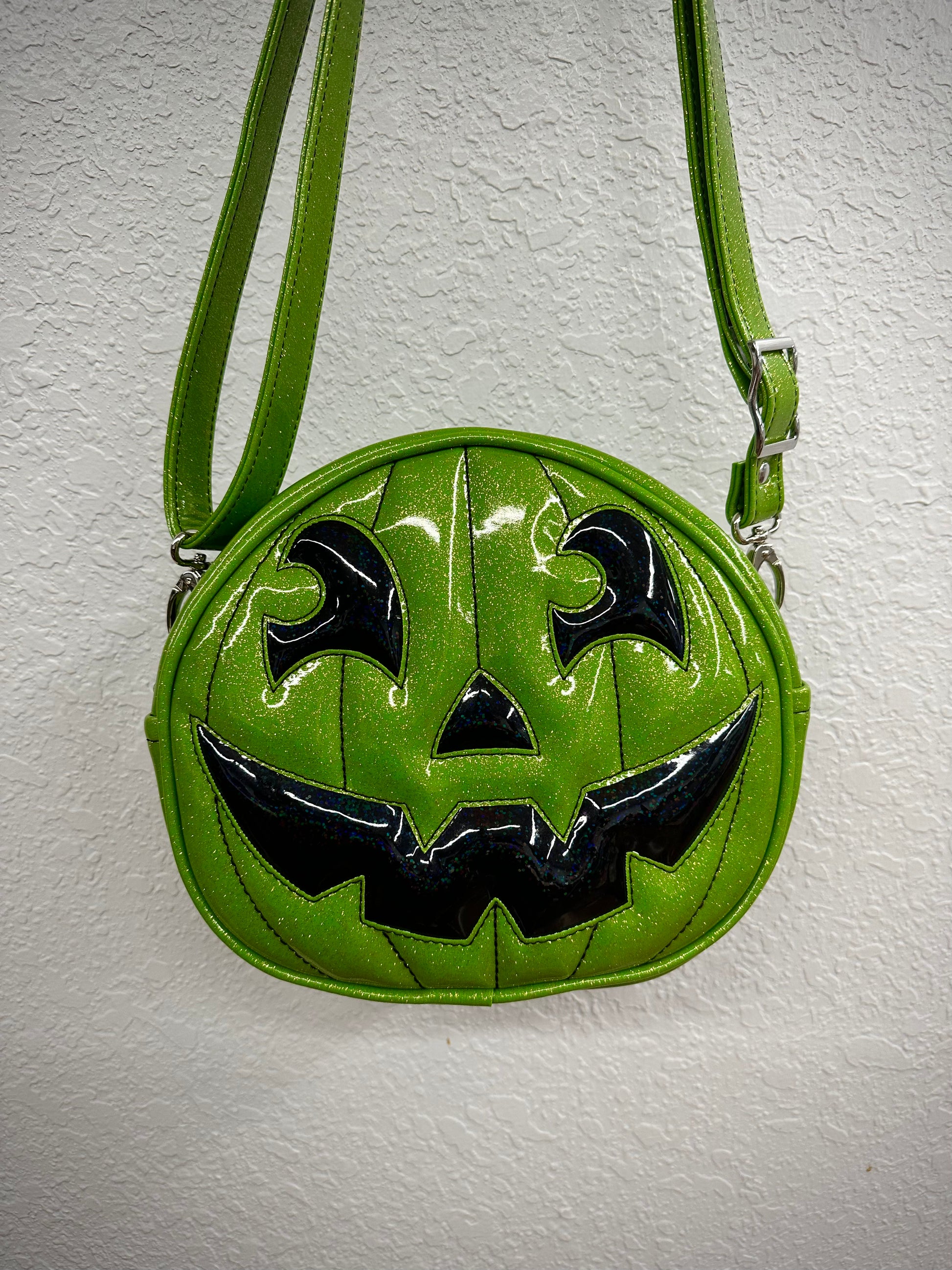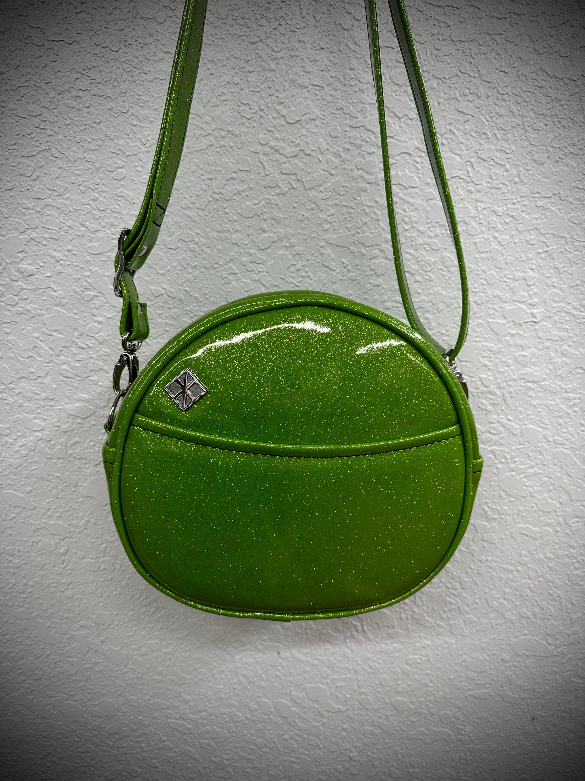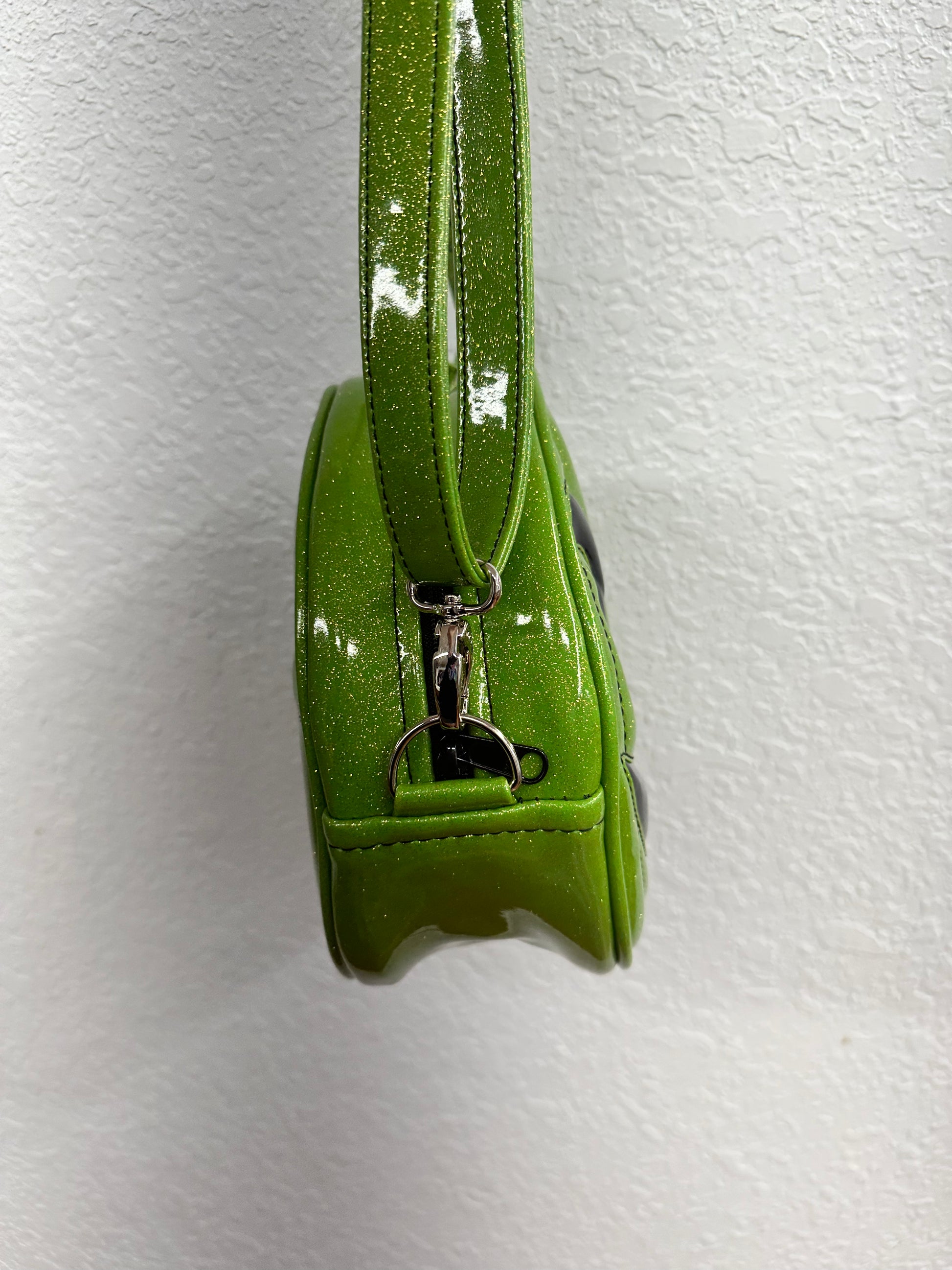 This Happy Side Eye Face cruiser bag is finished in lime glitter vinyl with accents in black chunky glitter holo vinyl. We paired this with black thread for the stitching. This comes with our adjustable shoulder/crossbody strap. It has one outside slip pocket and two inside slip pockets. The bag is lined in a black, padded nylon fabric.