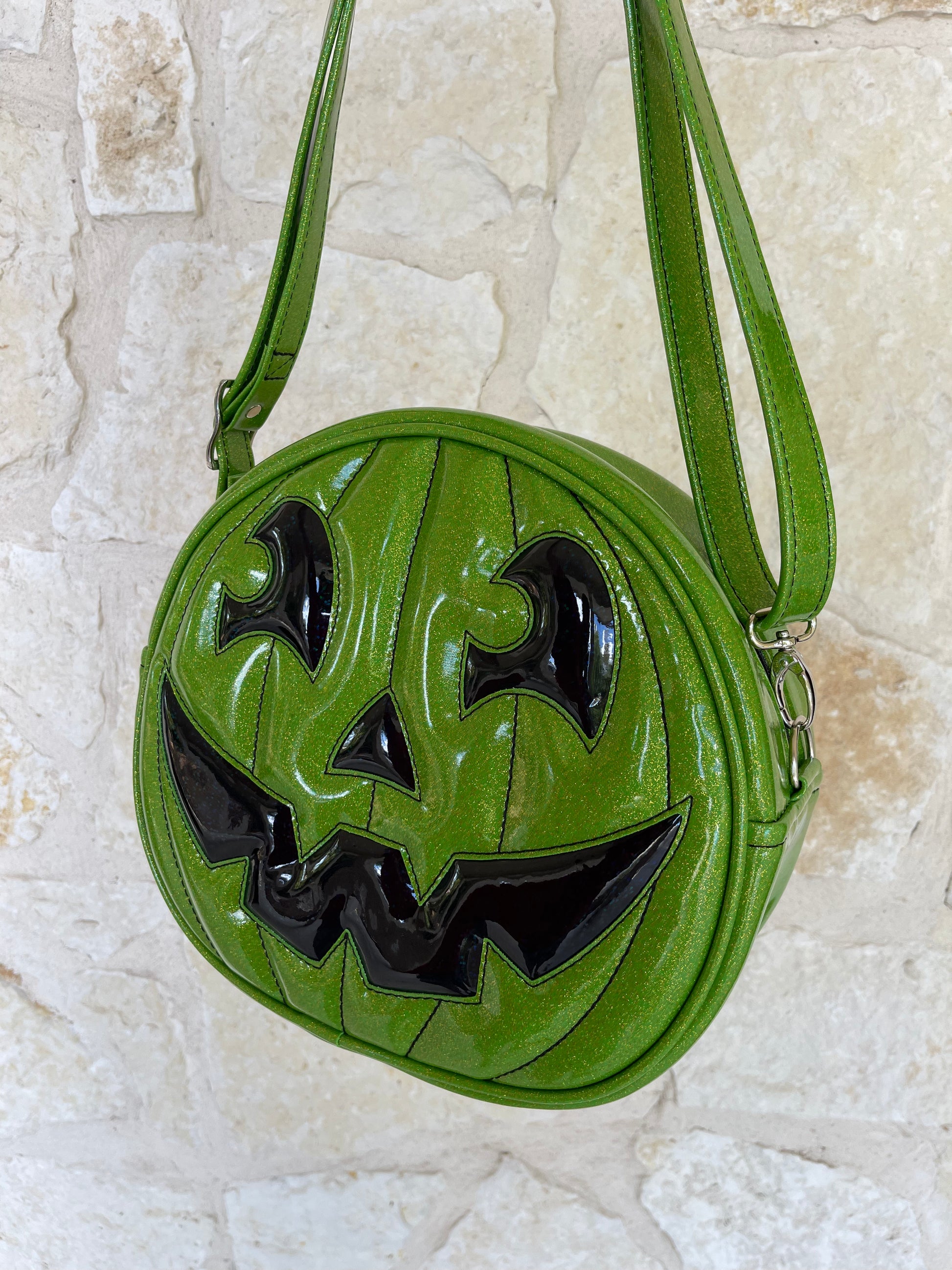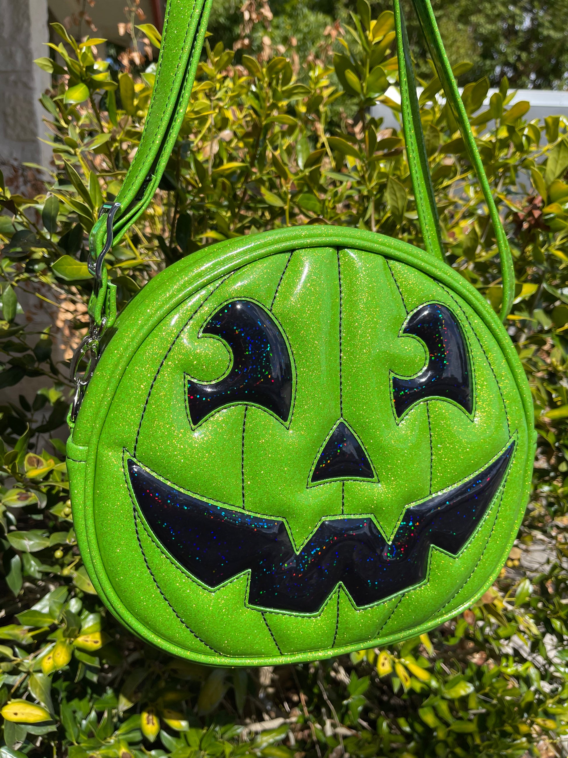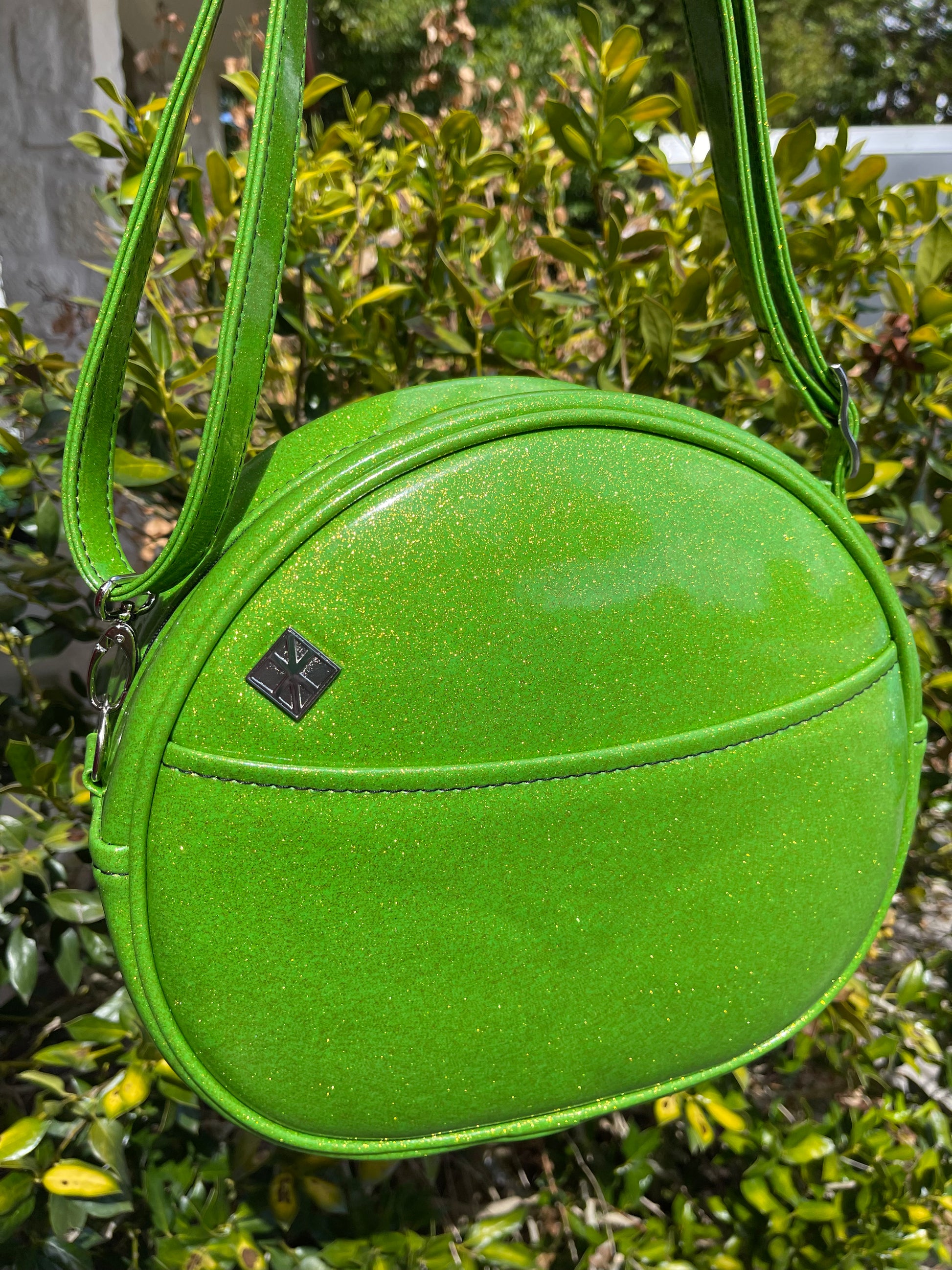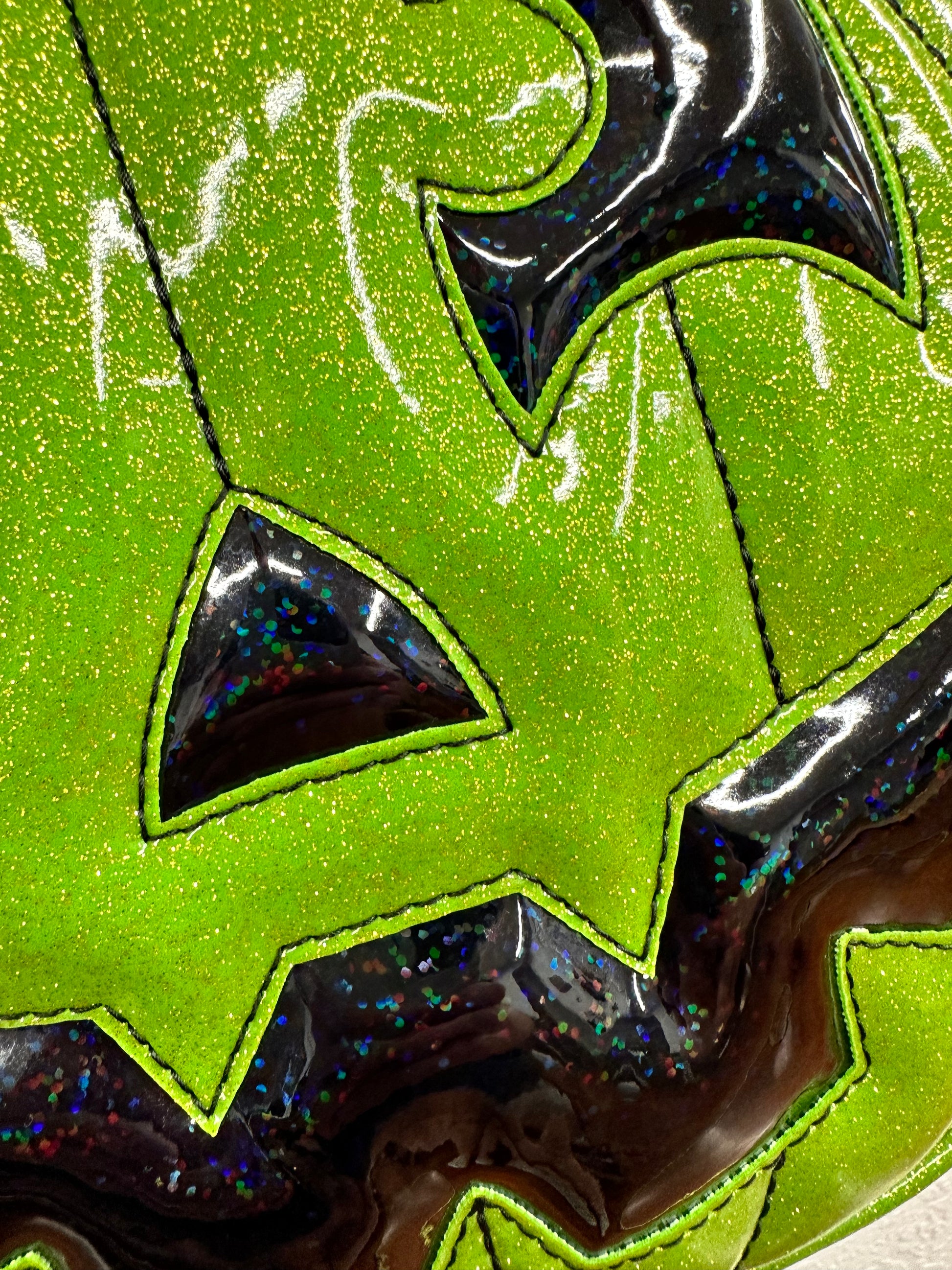 This Happy Side Eye Face cruiser bag is finished in lime glitter vinyl with accents in black chunky glitter holo vinyl. We paired this with black thread for the stitching. This comes with our adjustable shoulder/crossbody strap. It has one outside slip pocket and two inside slip pockets. The bag is lined in a black, padded nylon fabric.