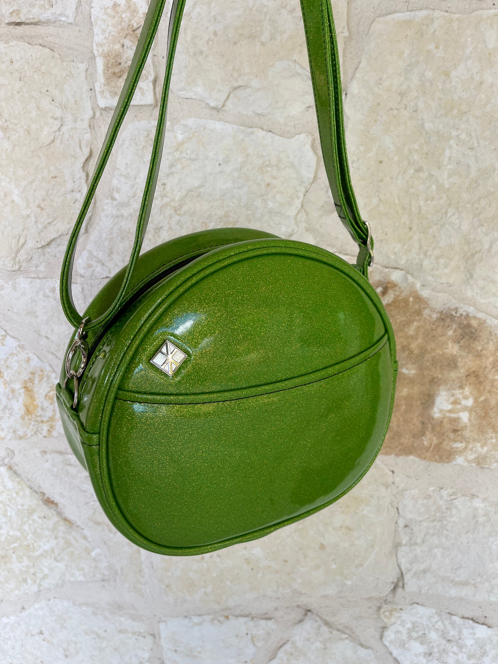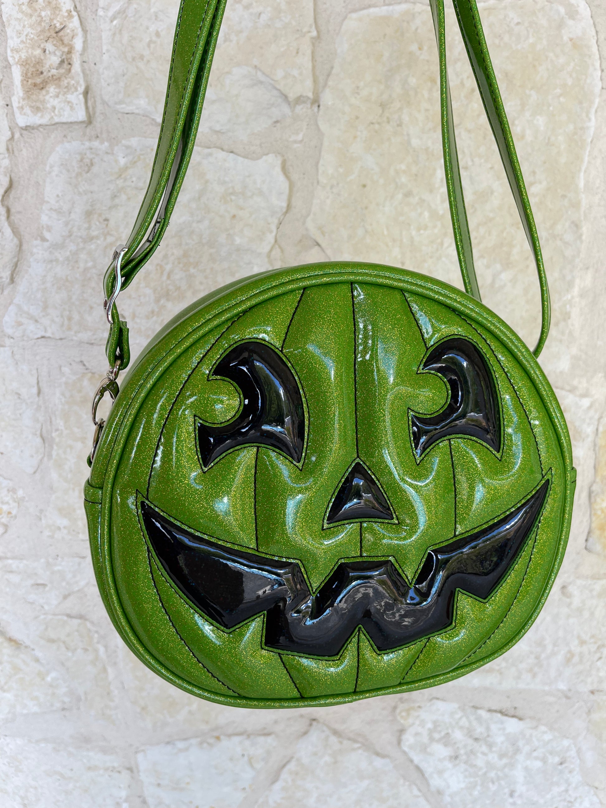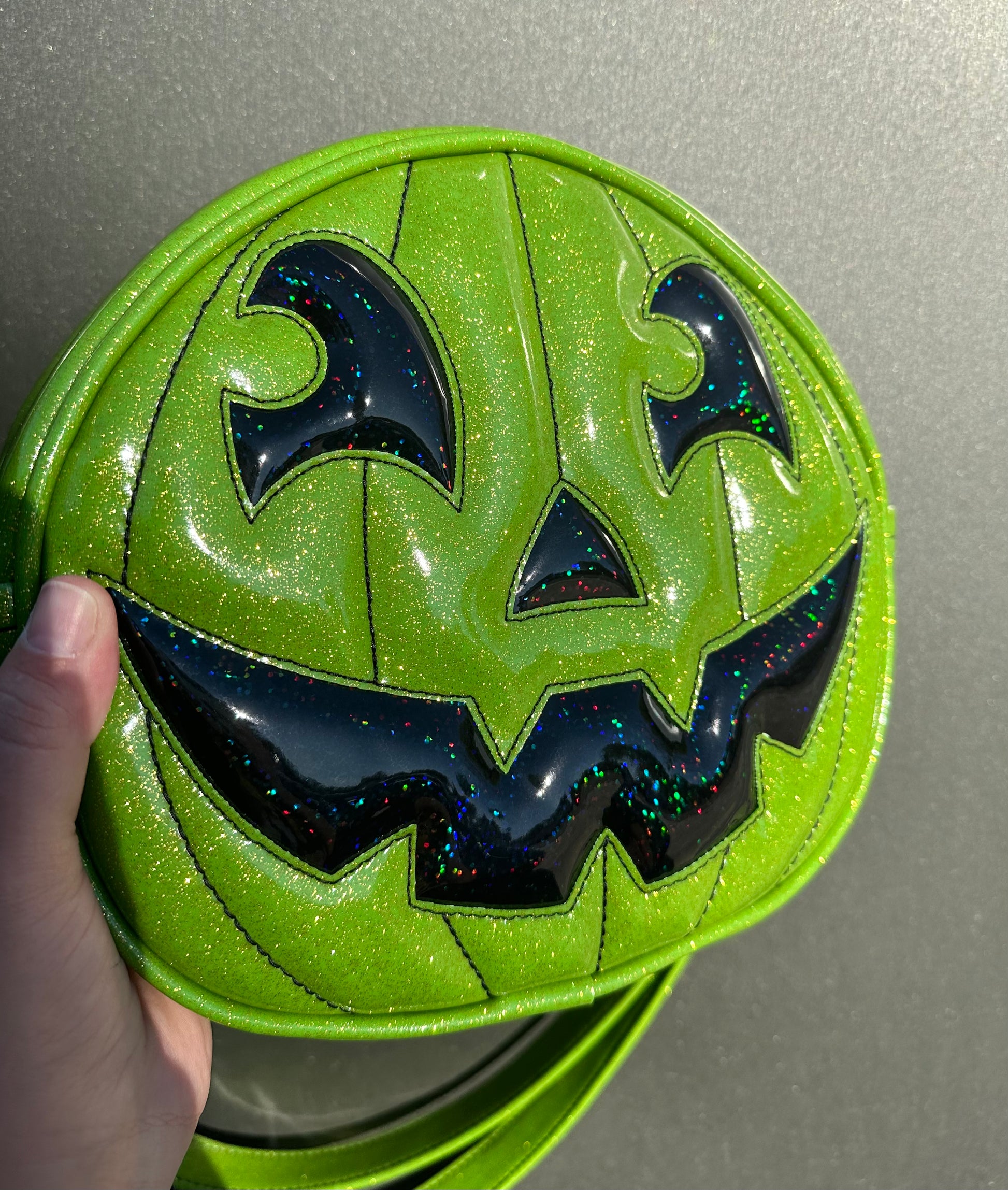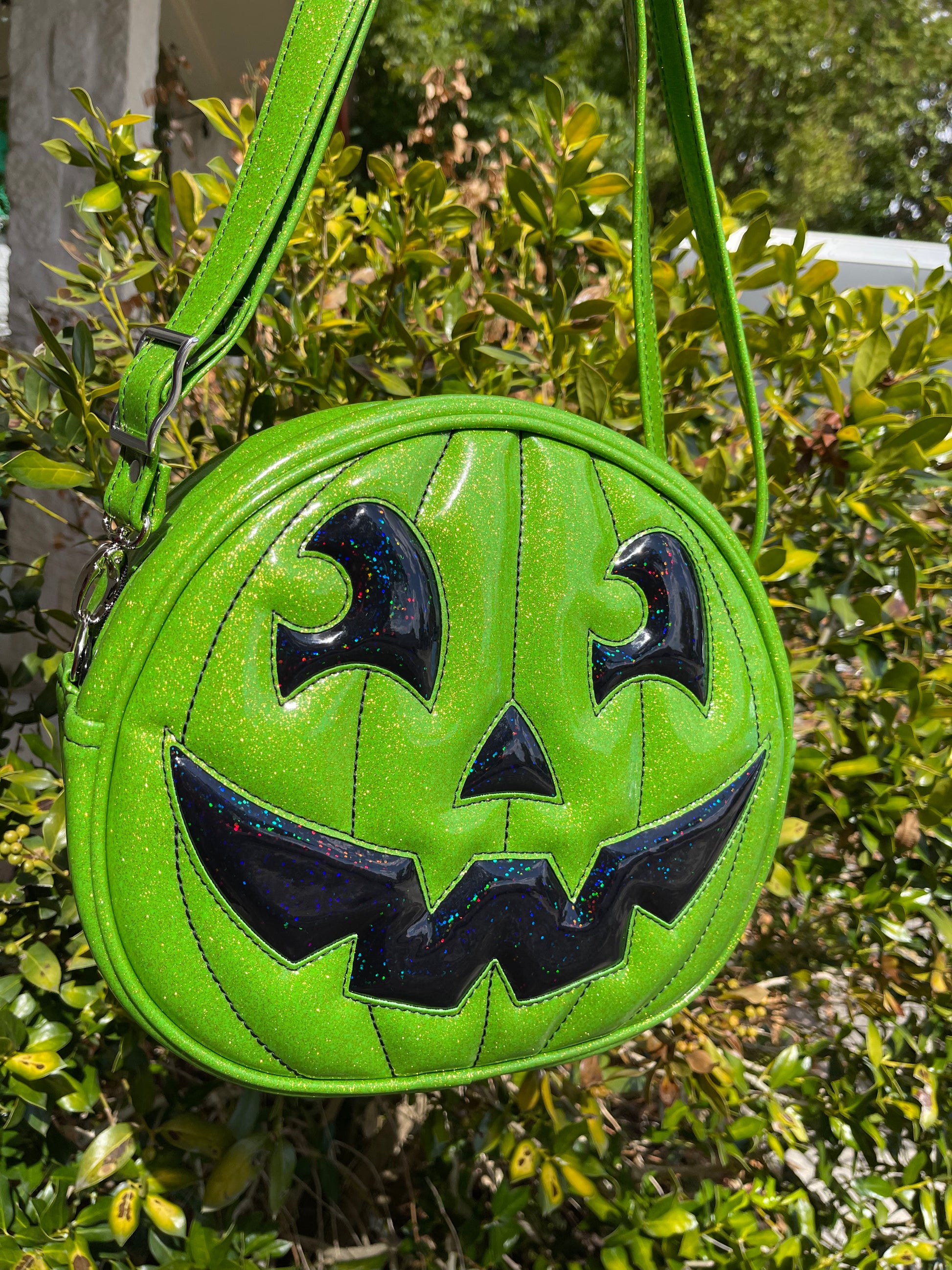 This Happy Side Eye Face cruiser bag is finished in lime glitter vinyl with accents in black chunky glitter holo vinyl. We paired this with black thread for the stitching. This comes with our adjustable shoulder/crossbody strap. It has one outside slip pocket and two inside slip pockets. The bag is lined in a black, padded nylon fabric.
