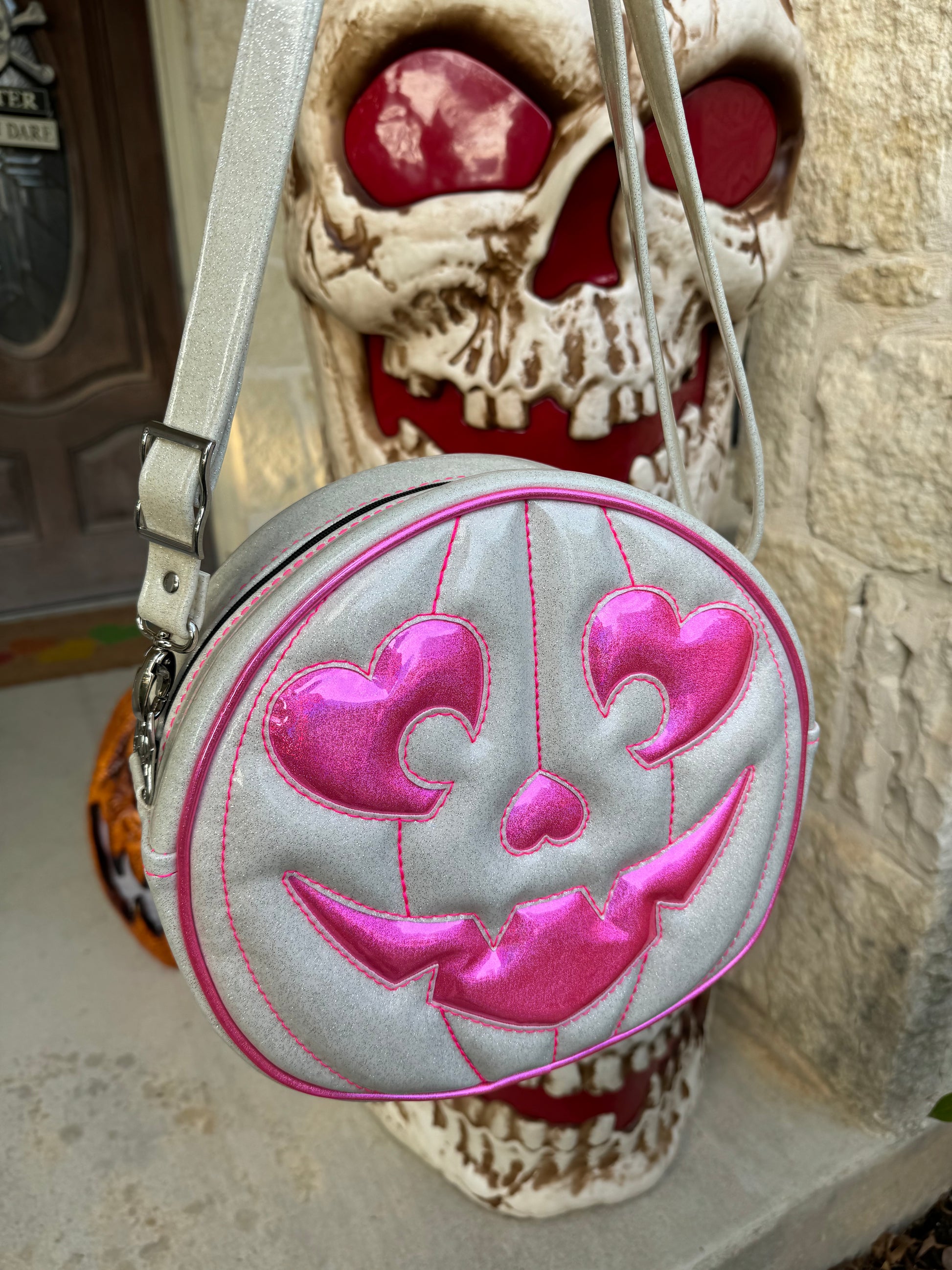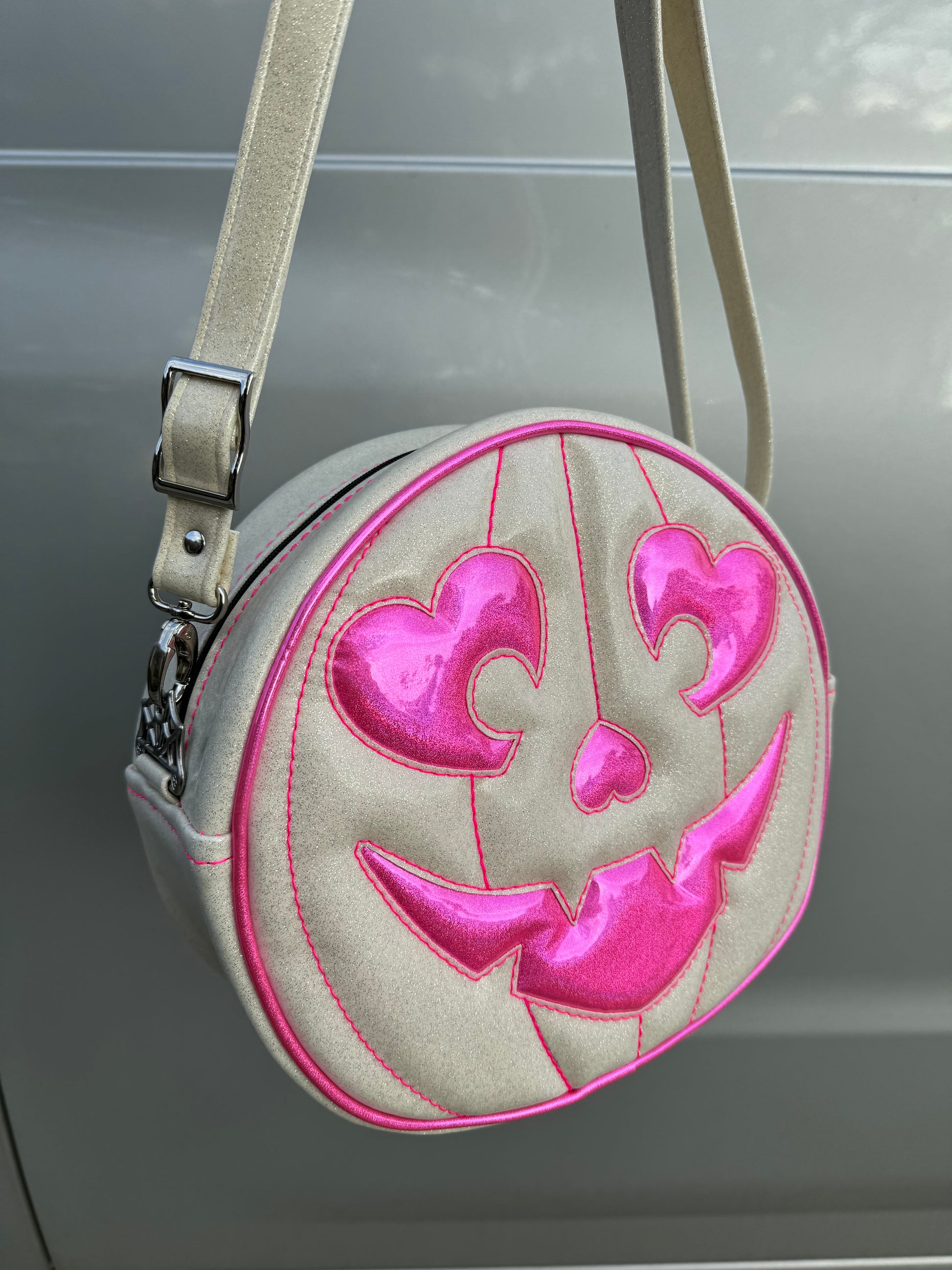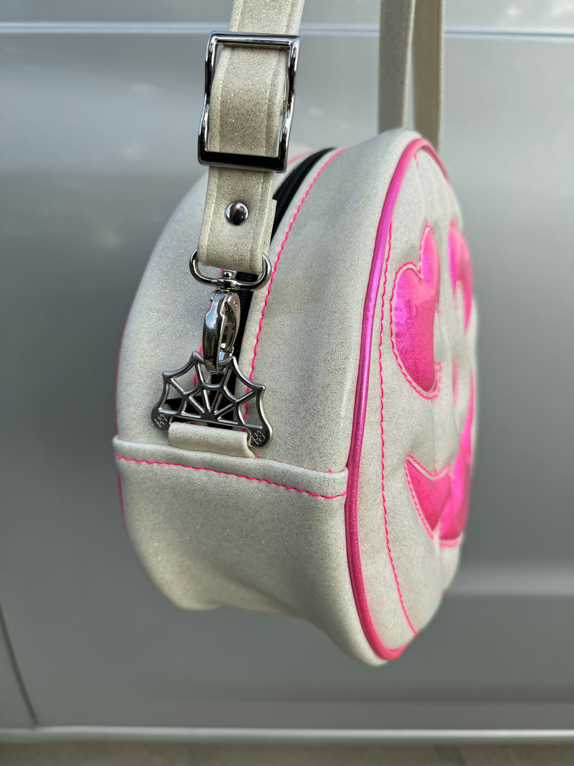 For the face features and piping we used a neon pink holo glitter vinyl. The remainder of the bag was finished in white glitter vinyl, with a thread color that compliments the neon pink holo glitter vinyl. This comes with a matching adjustable vinyl crossbody strap. It has one outside slip pocket and two inside slip pockets. The bag is lined in a black, padded nylon fabric. We use our shiny silver web hardware on this bag.