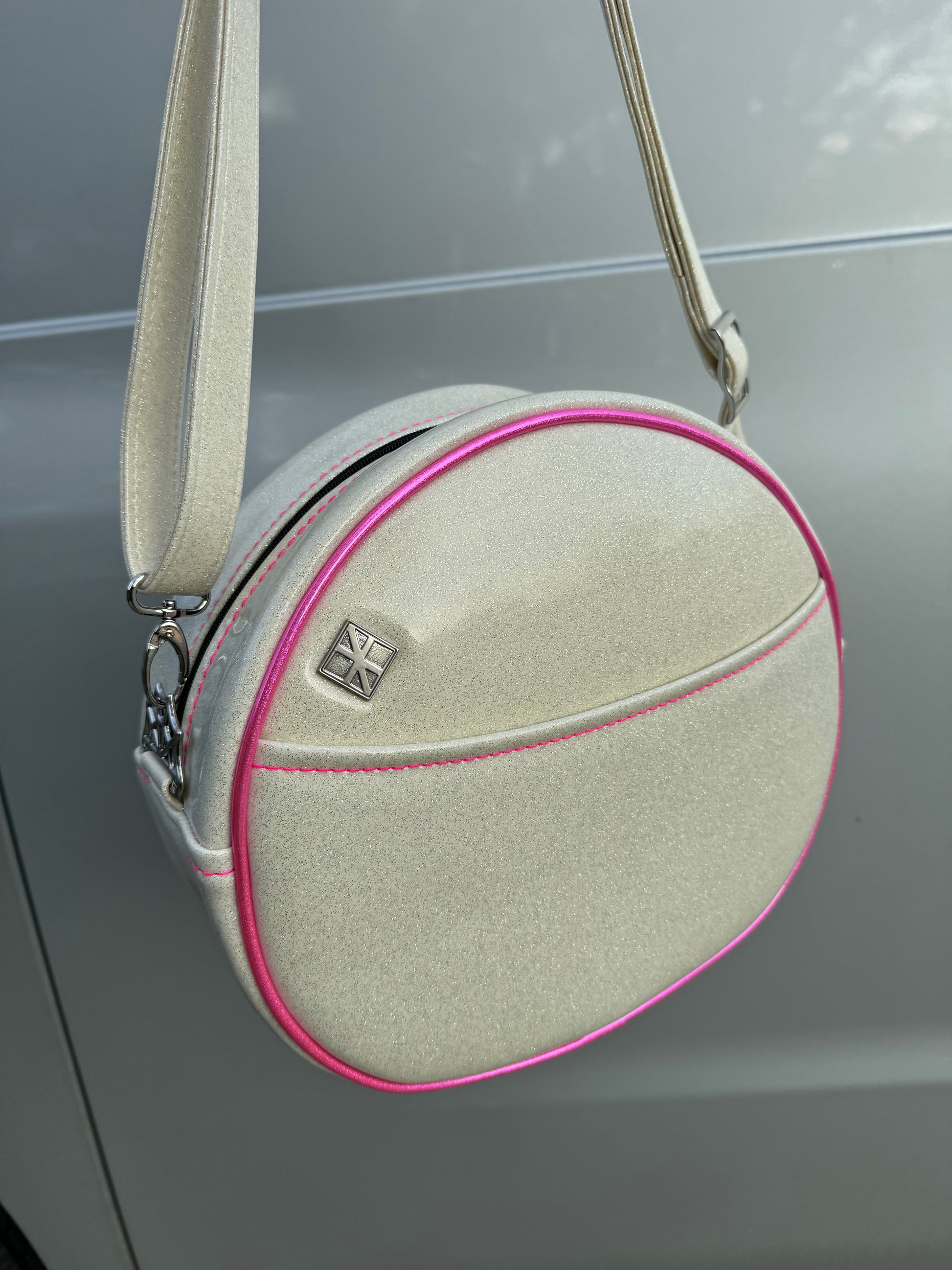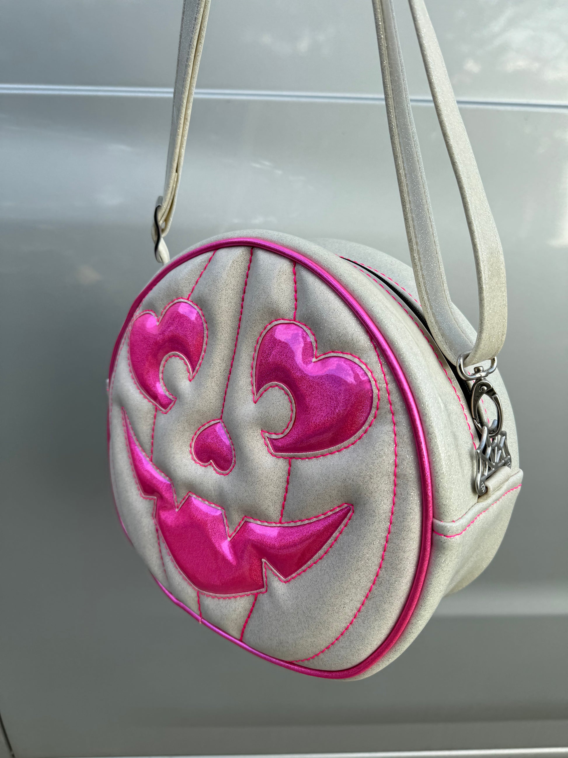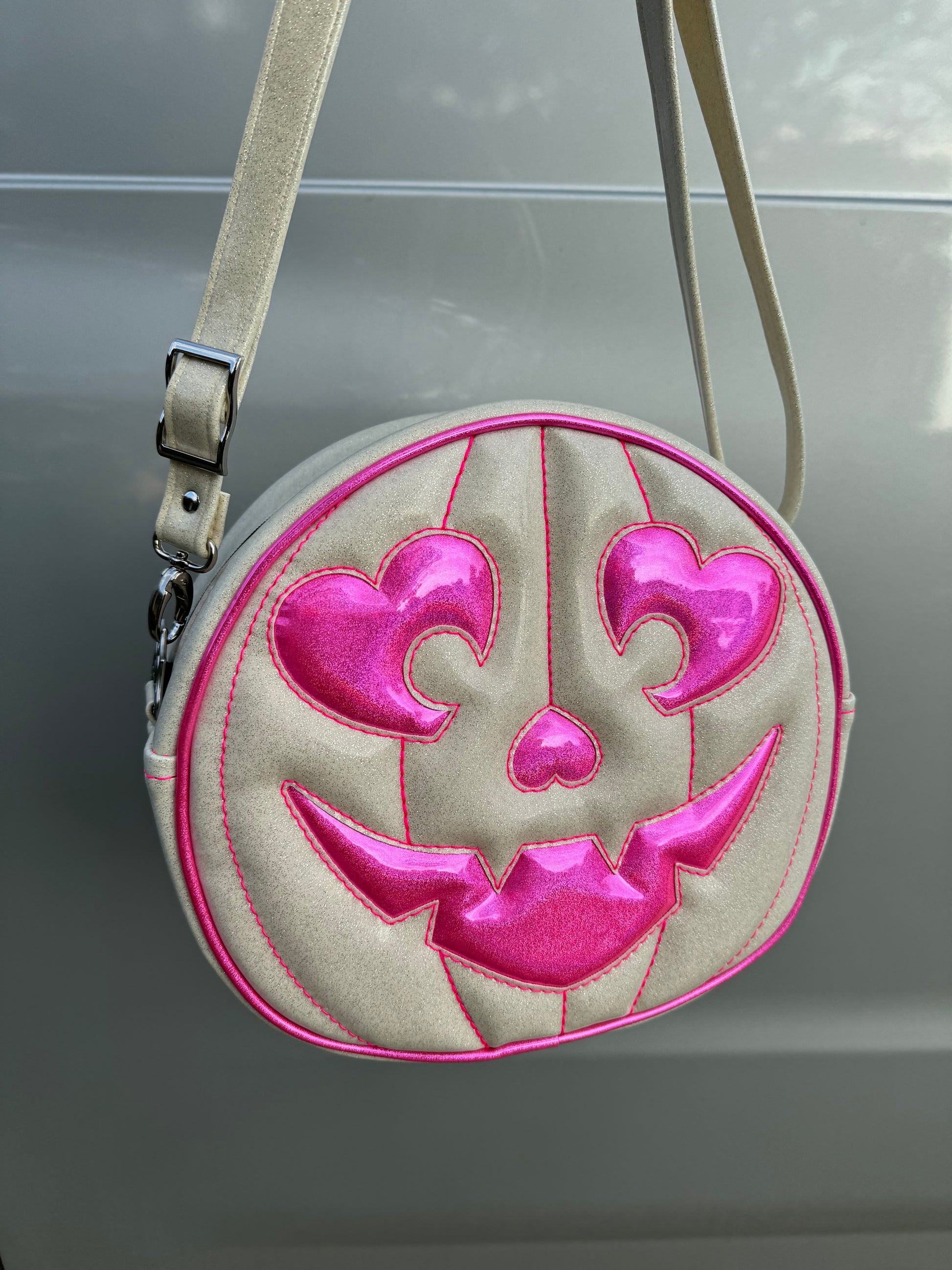 For the face features and piping we used a neon pink holo glitter vinyl. The remainder of the bag was finished in white glitter vinyl, with a thread color that compliments the neon pink holo glitter vinyl. This comes with a matching adjustable vinyl crossbody strap. It has one outside slip pocket and two inside slip pockets. The bag is lined in a black, padded nylon fabric. We use our shiny silver web hardware on this bag.