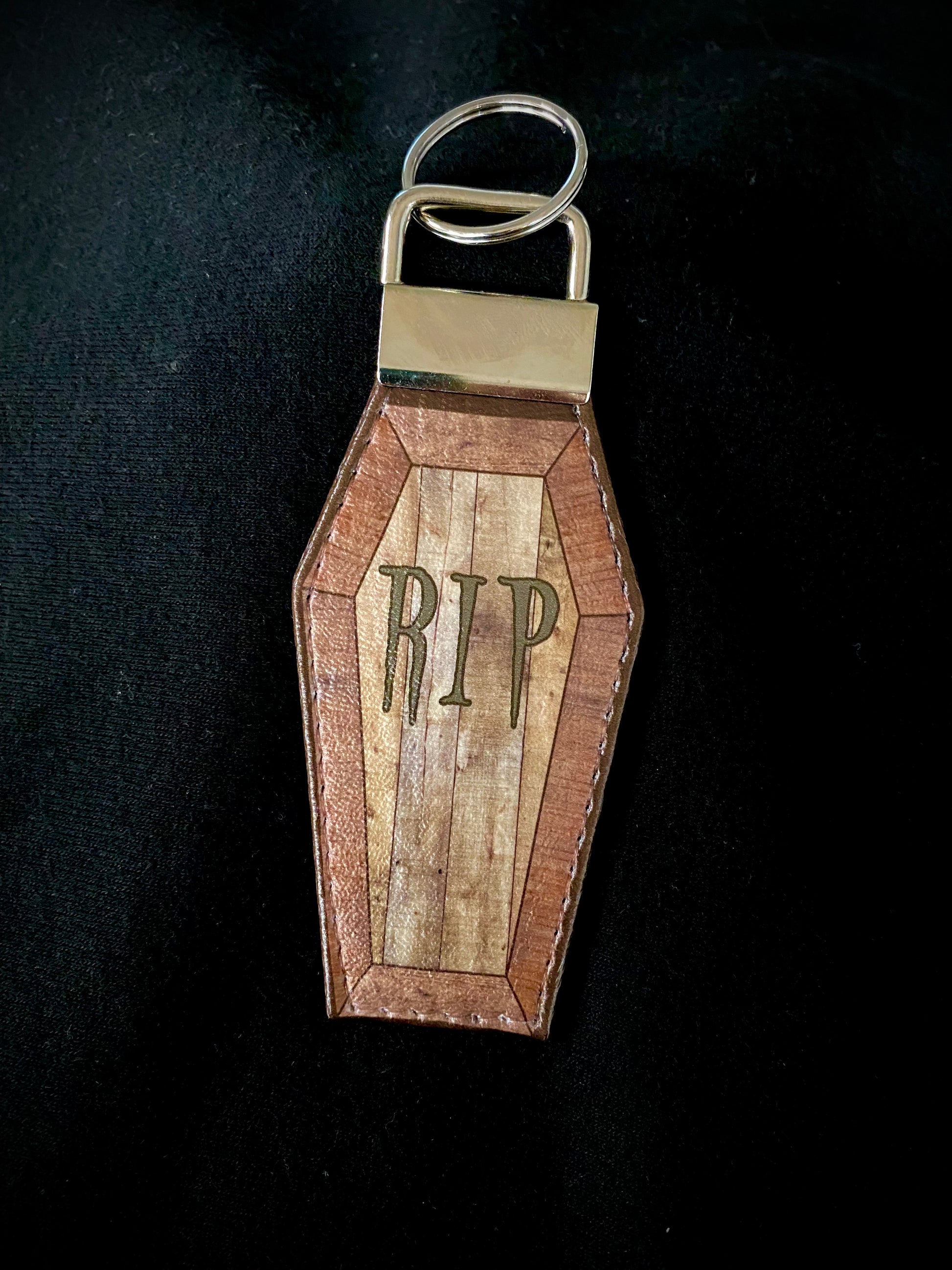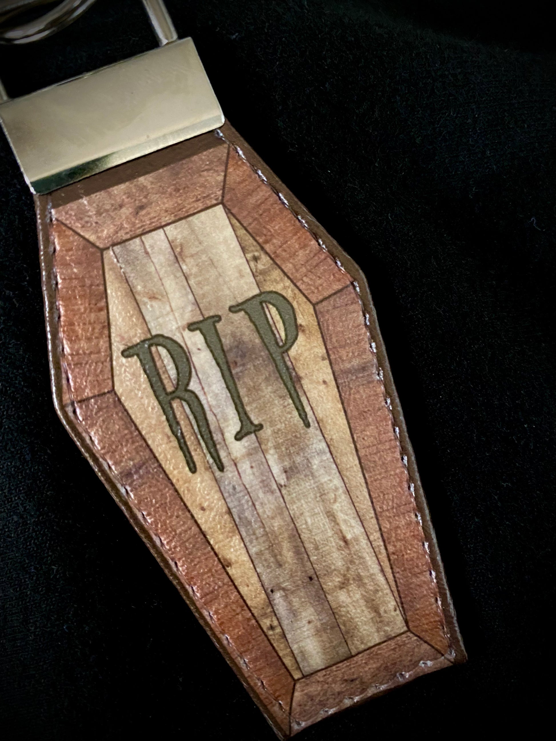 These decorative charms are created using small pieces of vinyl or fabric, printed or otherwise. We used our UV printer to create a perfect wooden coffin print on our white pearl vinyl and added "RIP" to these creepy cuties. All printing is done in house using our professional Roland UV printer. These measure roughly 4" x 1.75"