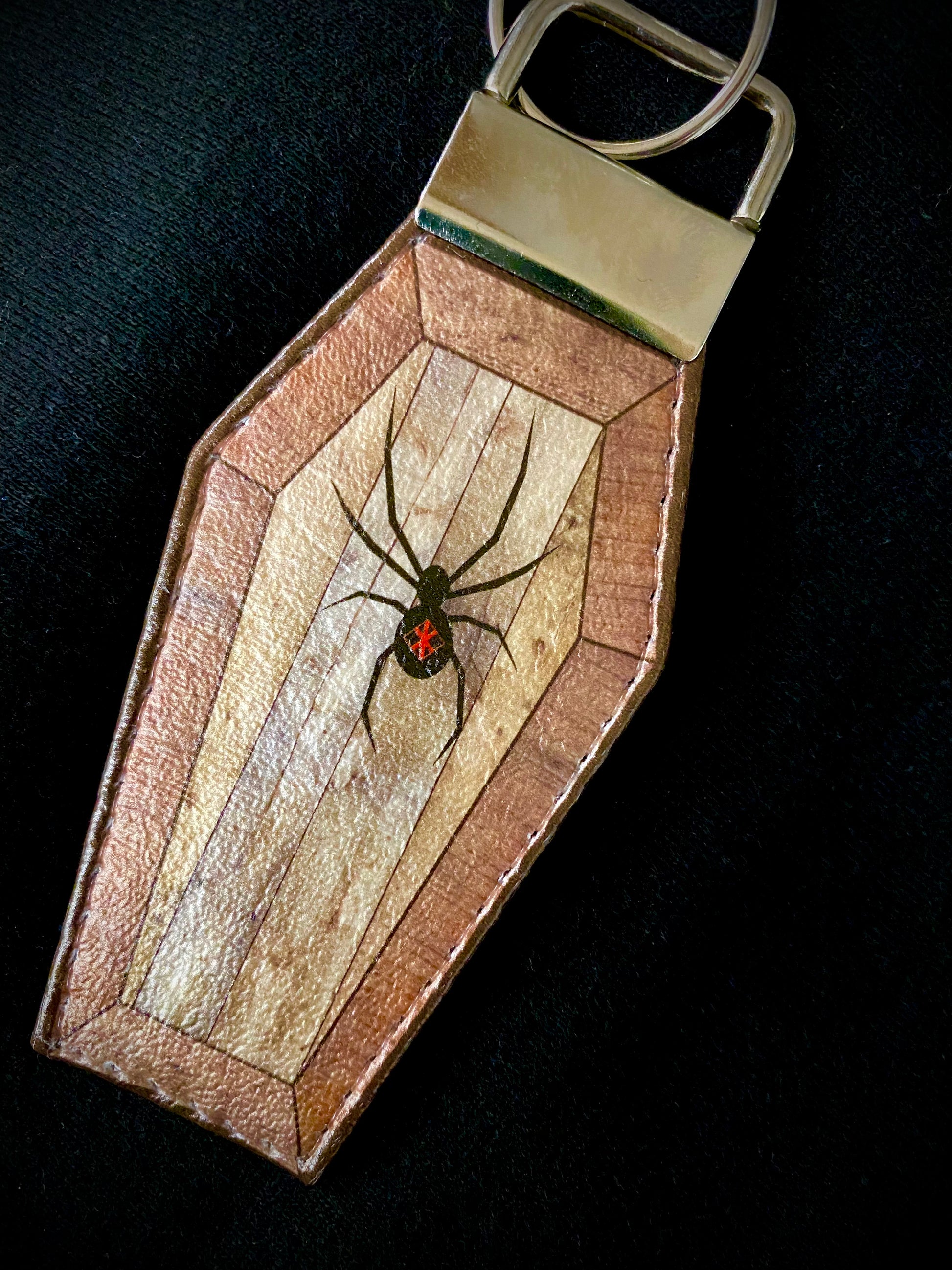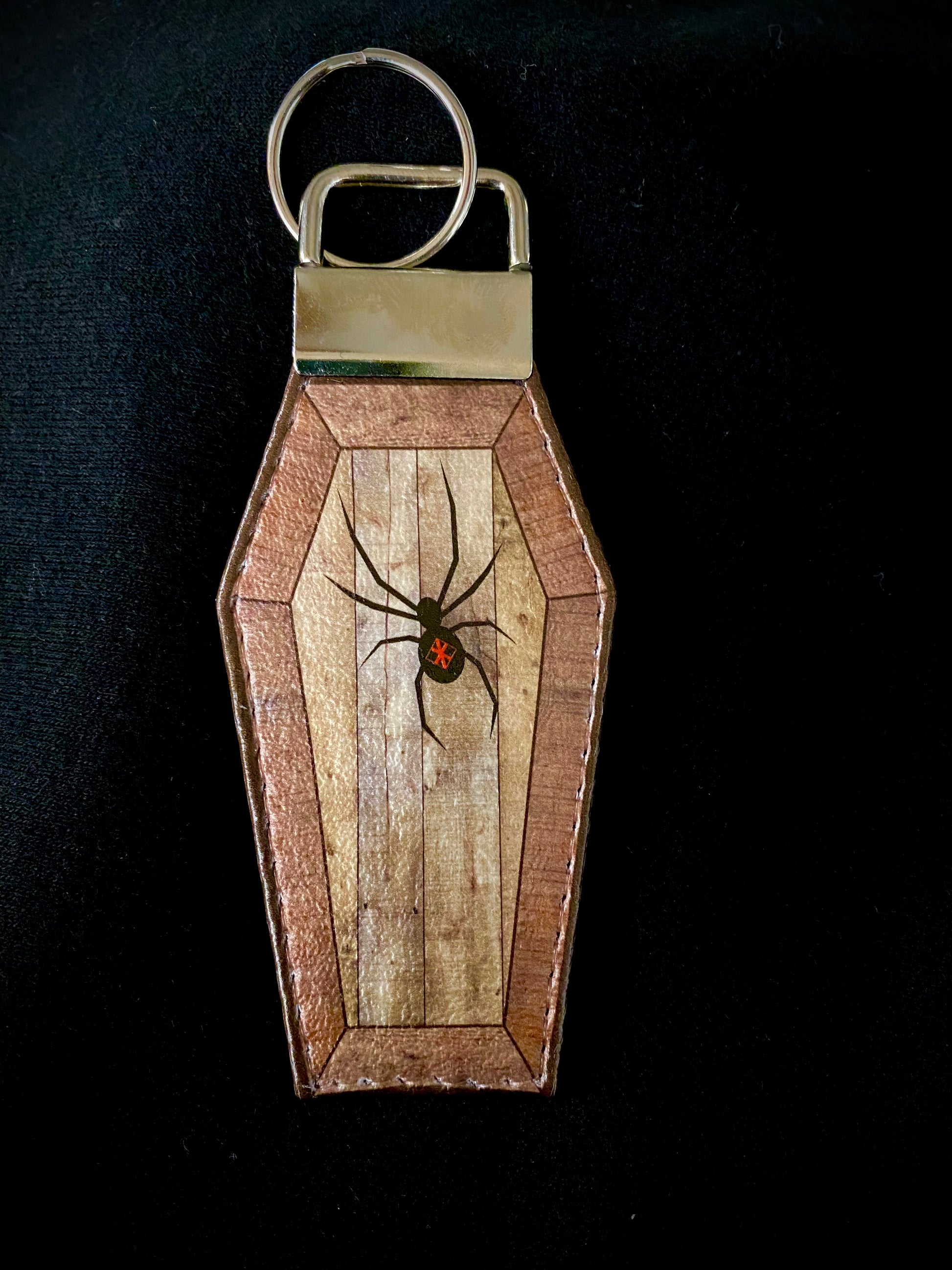 These decorative charms are created using small pieces of vinyl or fabric, printed or otherwise. We used our UV printer to create a perfect wooden coffin print on our white pearl vinyl and added a black widow to these creepy cuties. All printing is done in house using our professional Roland UV printer. These measure roughly 4" x 1.75"