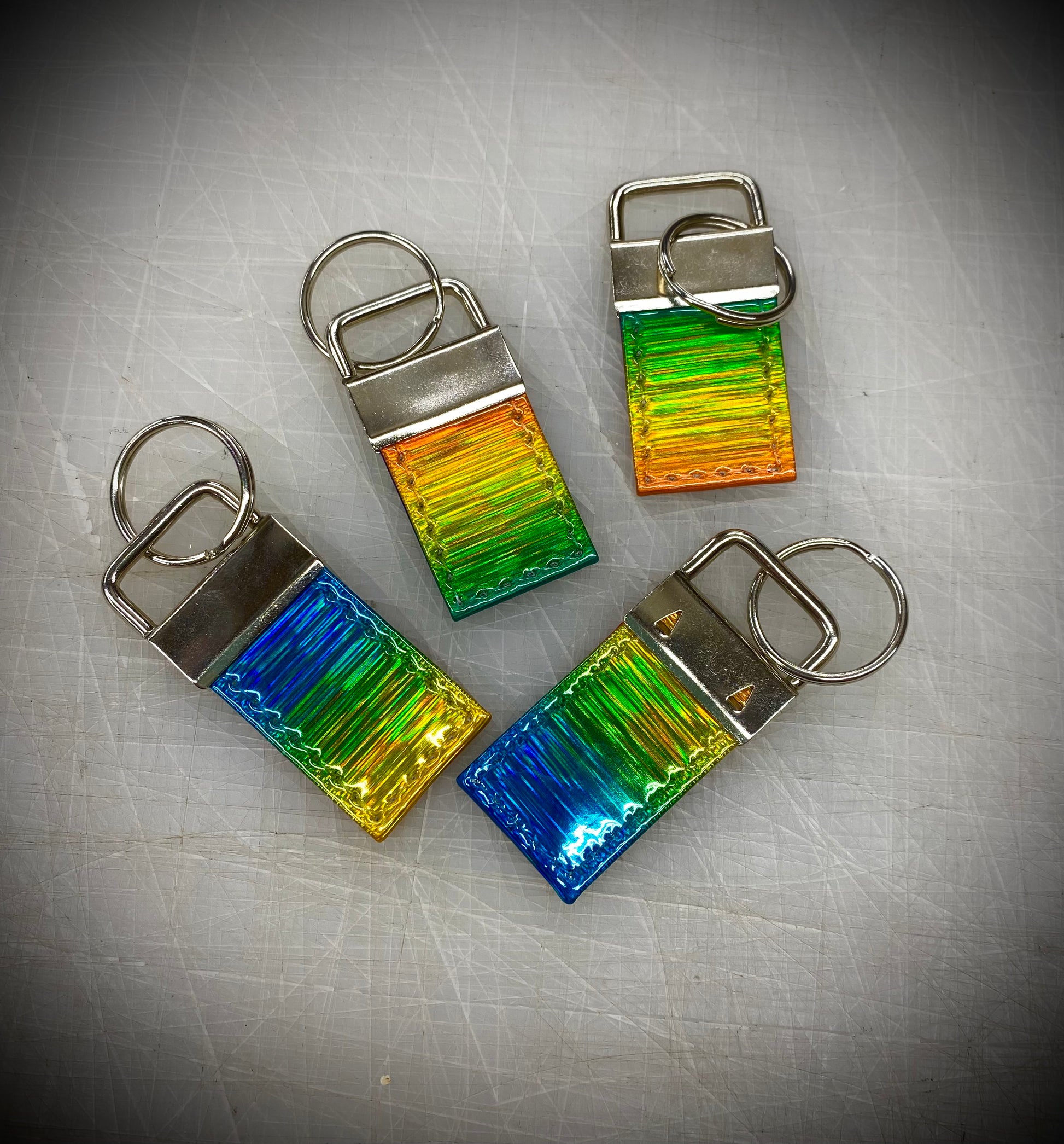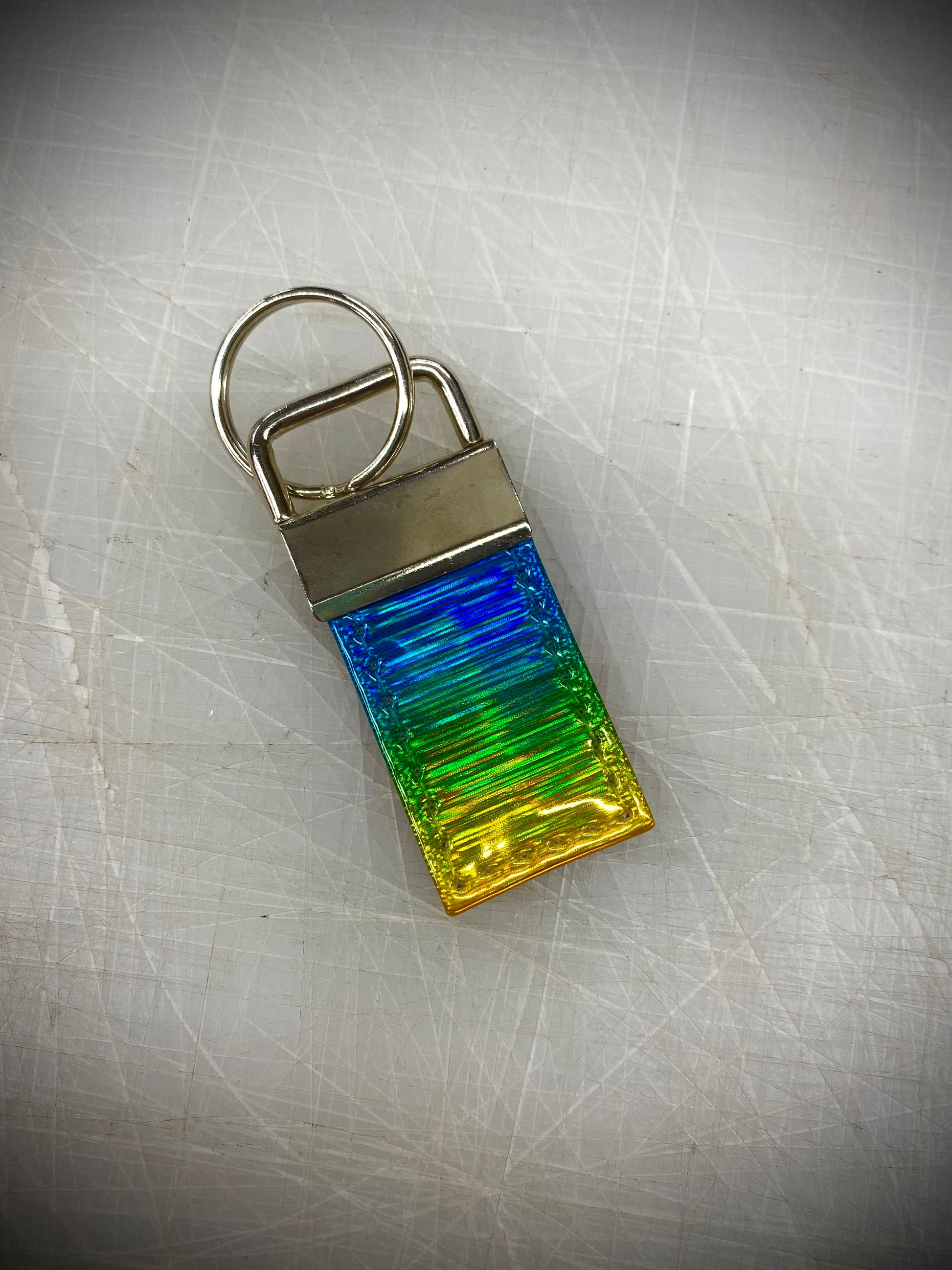 Materials: Rainbow shattered holo, nickel hardware (These will look different every time)