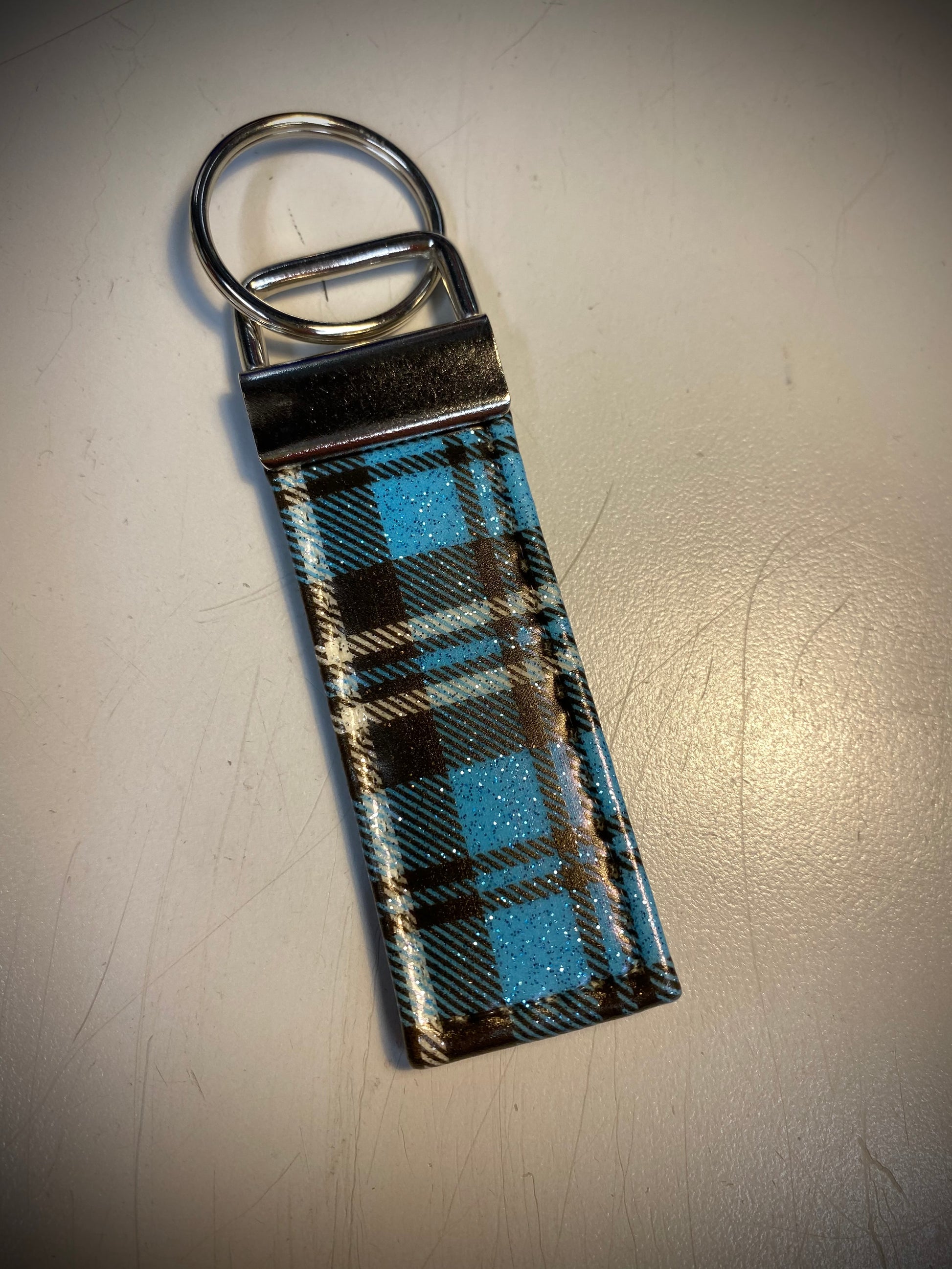 Materials: White glitter vinyl with UV printed sky plaid, nickel hardware