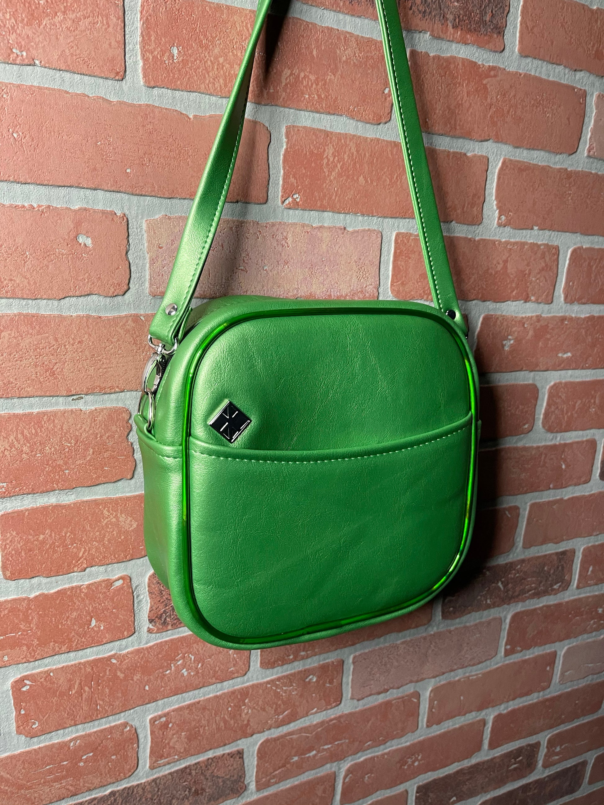 This Mini Square bag is finished in lime pearl vinyl, green holographic vinyl, with lime green stitching on the face and shamrock eyes! Measures about 10" x 10" x 4". Includes a lime pearl shoulder strap that gives this bag about a 12" drop. One exterior slip pocket, and one interior slip pockets. Lined in a padded black cloth.