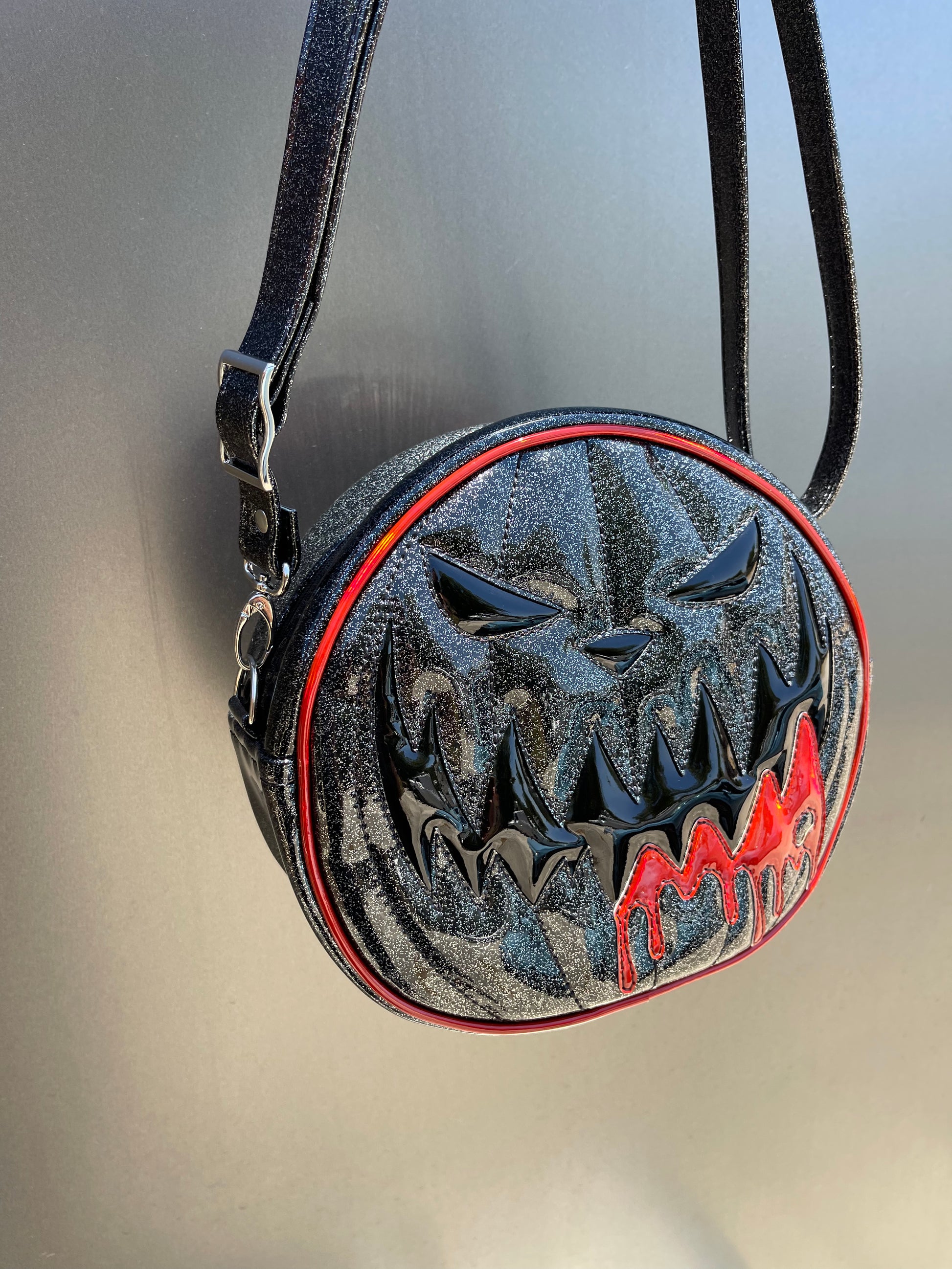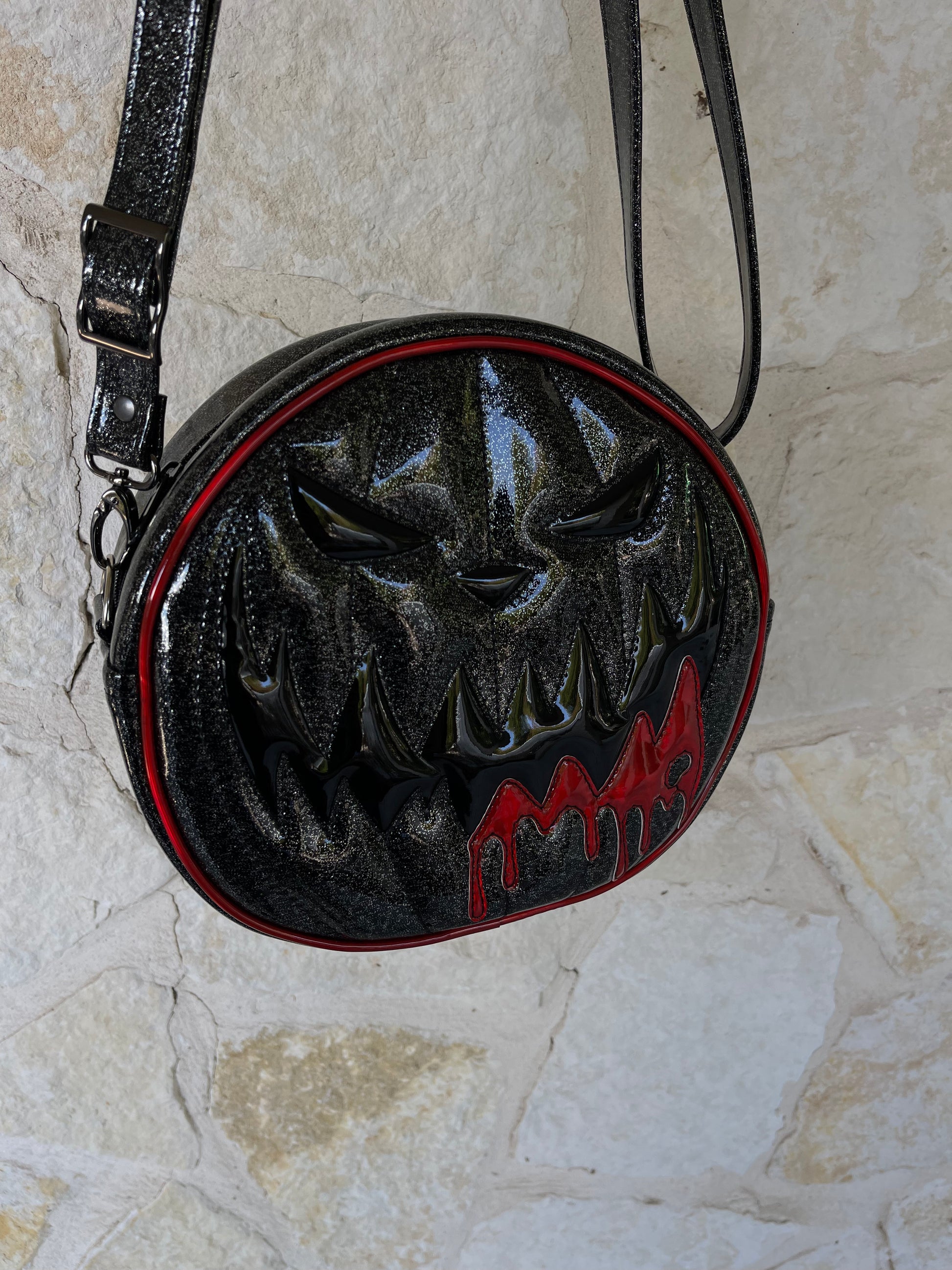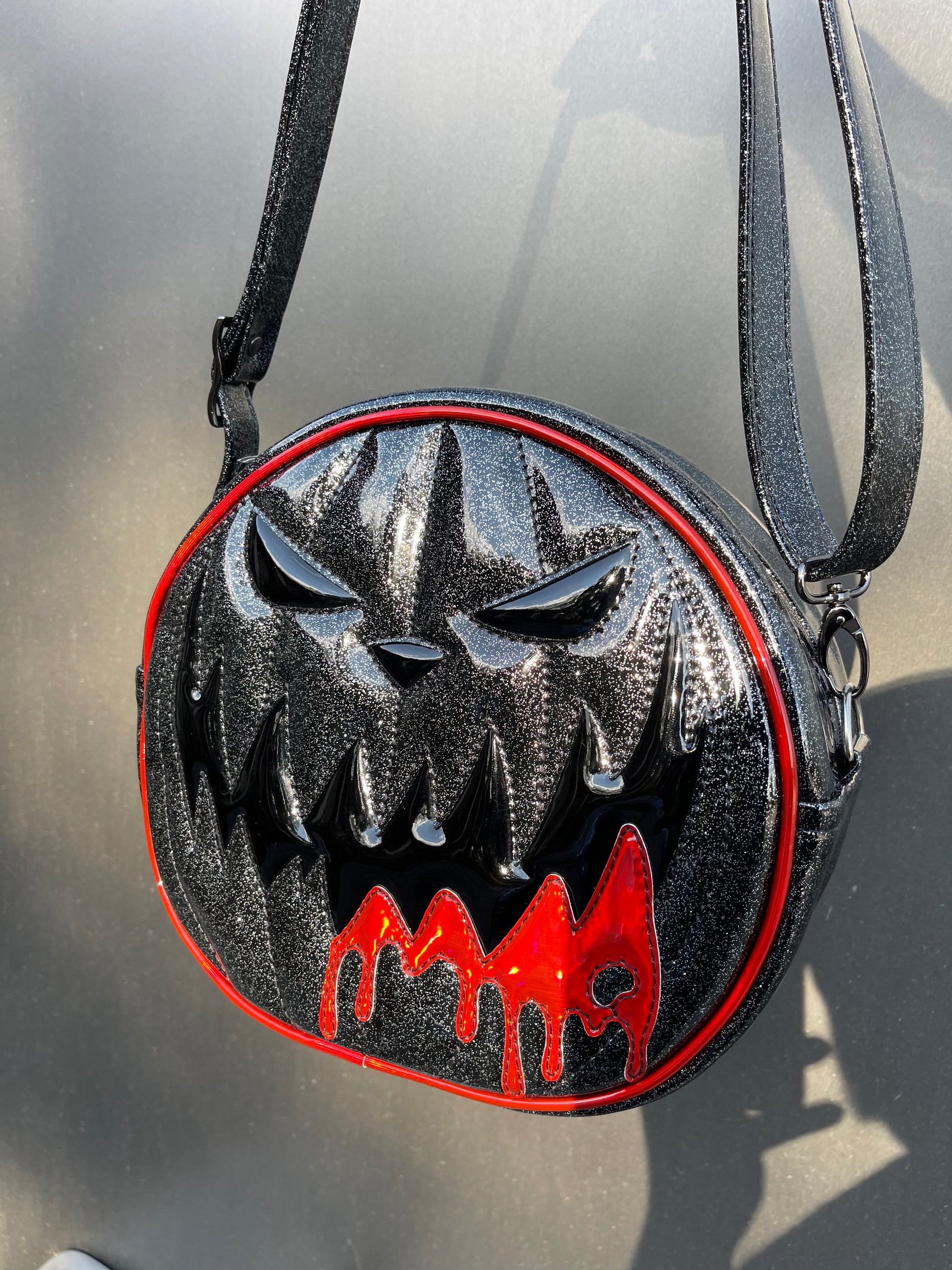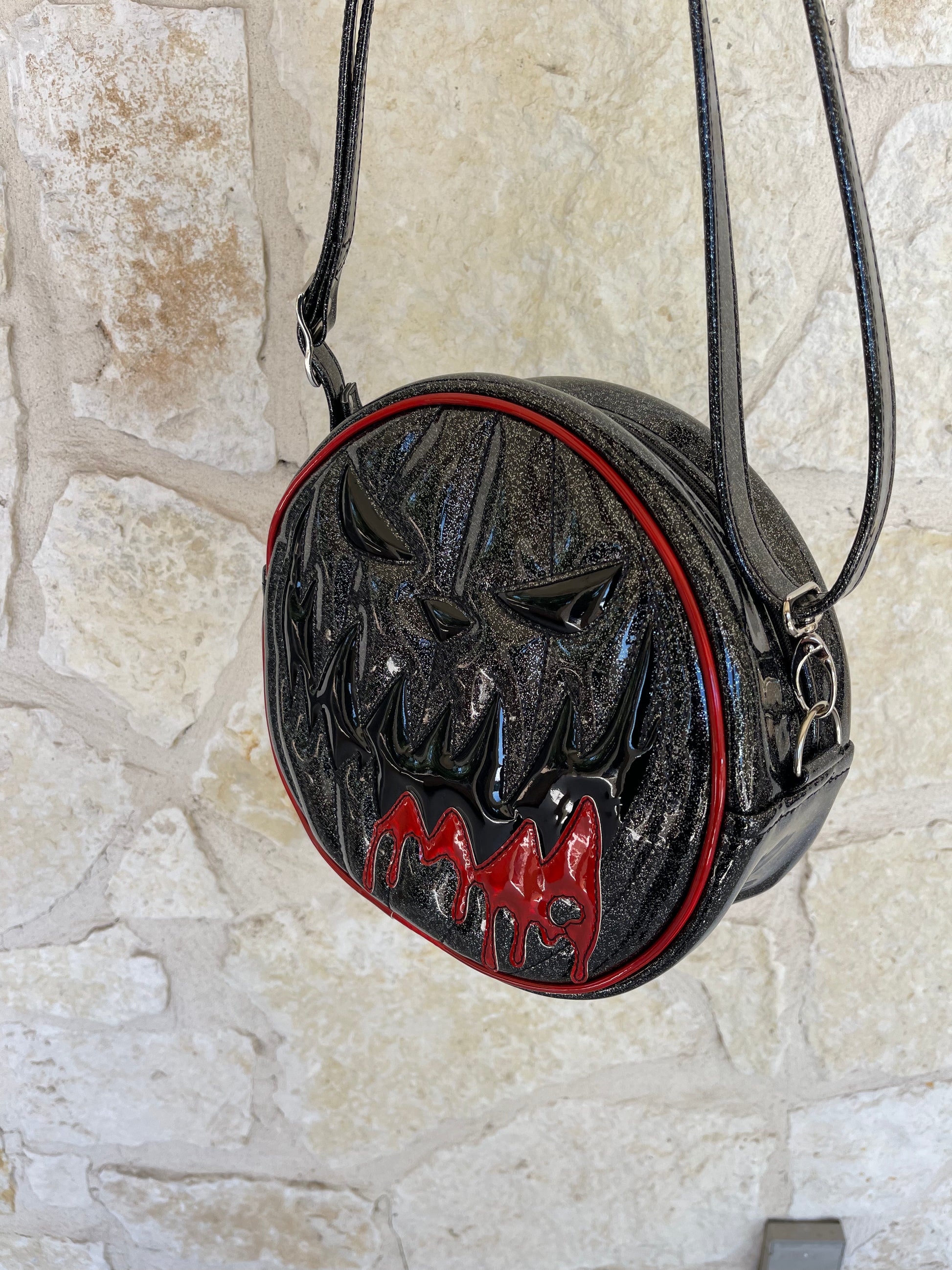 This bloody mean face cruiser bag is finished in black glitter vinyl with a black chrome face and blood red holo ooze dripping from its creepy mouth. This comes with our adjustable shoulder/crossbody strap. It has one outside slip pocket and two inside slip pockets. The bag is lined in a black, padded nylon fabric.