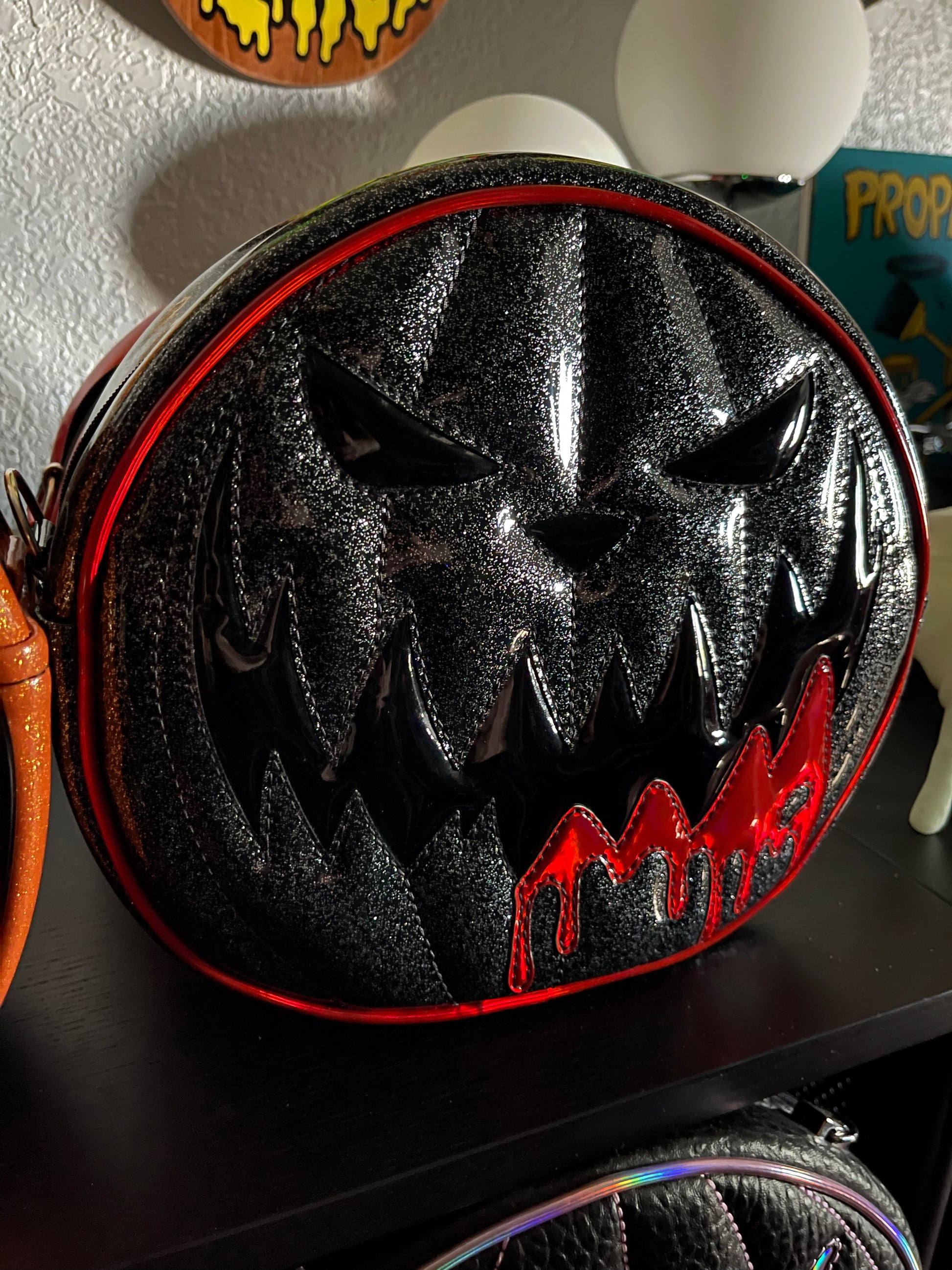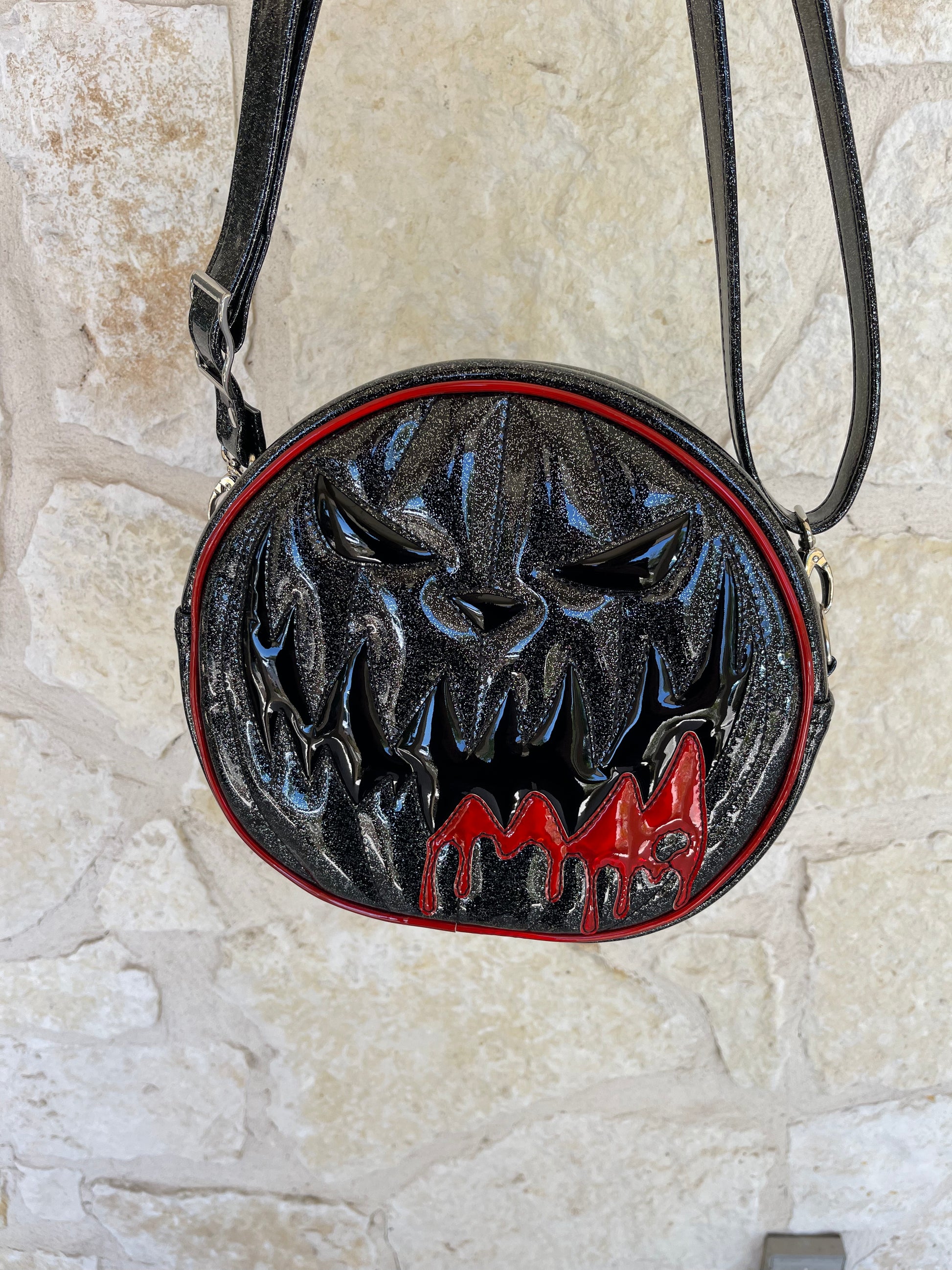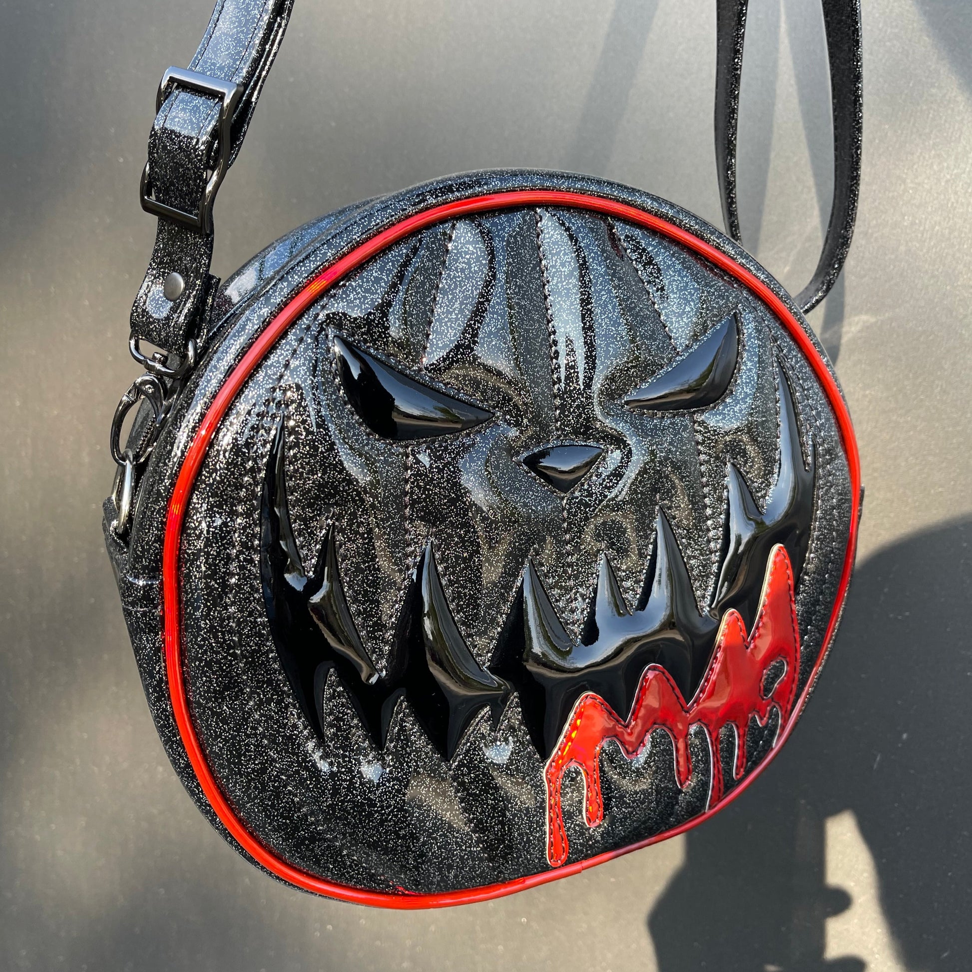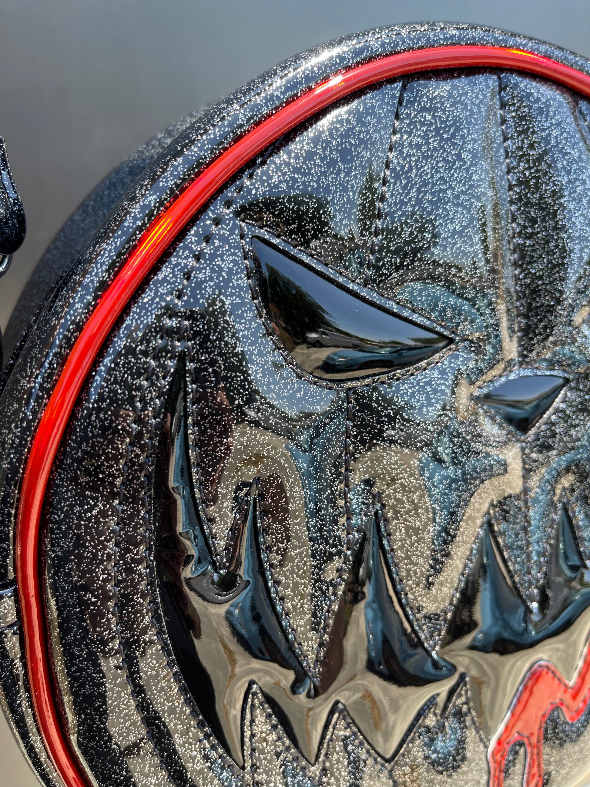 This bloody mean face cruiser bag is finished in black glitter vinyl with a black chrome face and blood red holo ooze dripping from its creepy mouth. This comes with our adjustable shoulder/crossbody strap. It has one outside slip pocket and two inside slip pockets. The bag is lined in a black, padded nylon fabric.