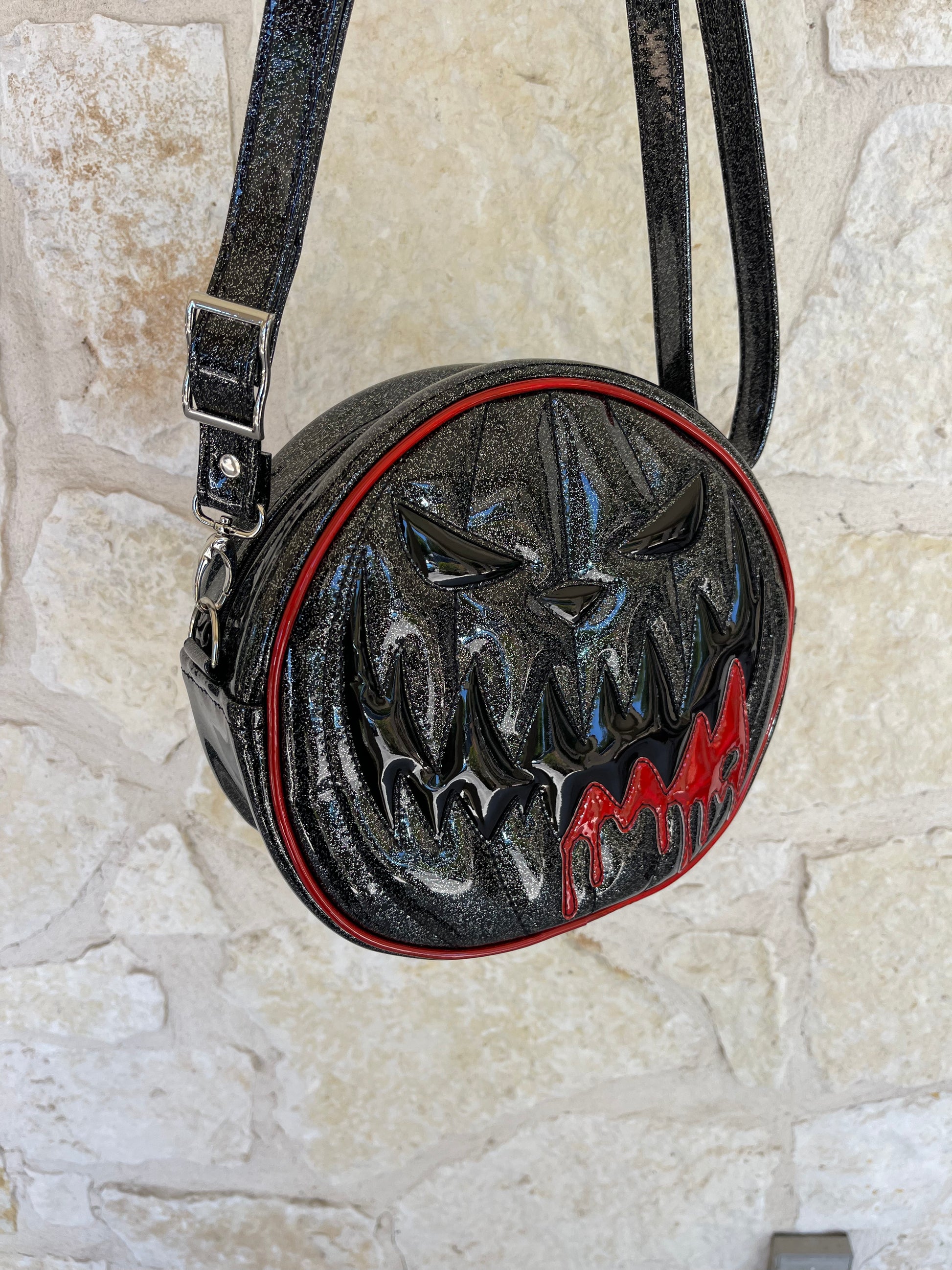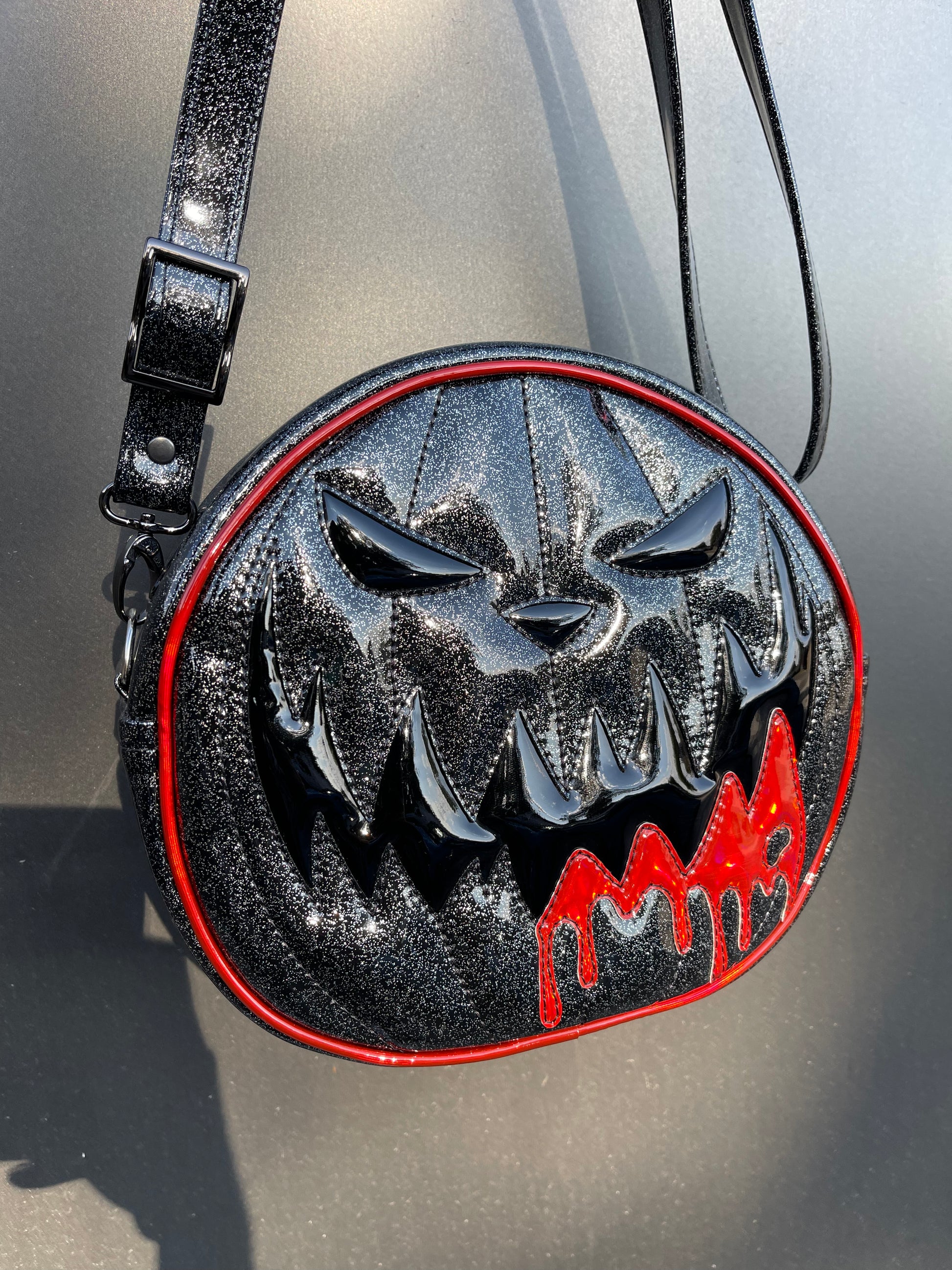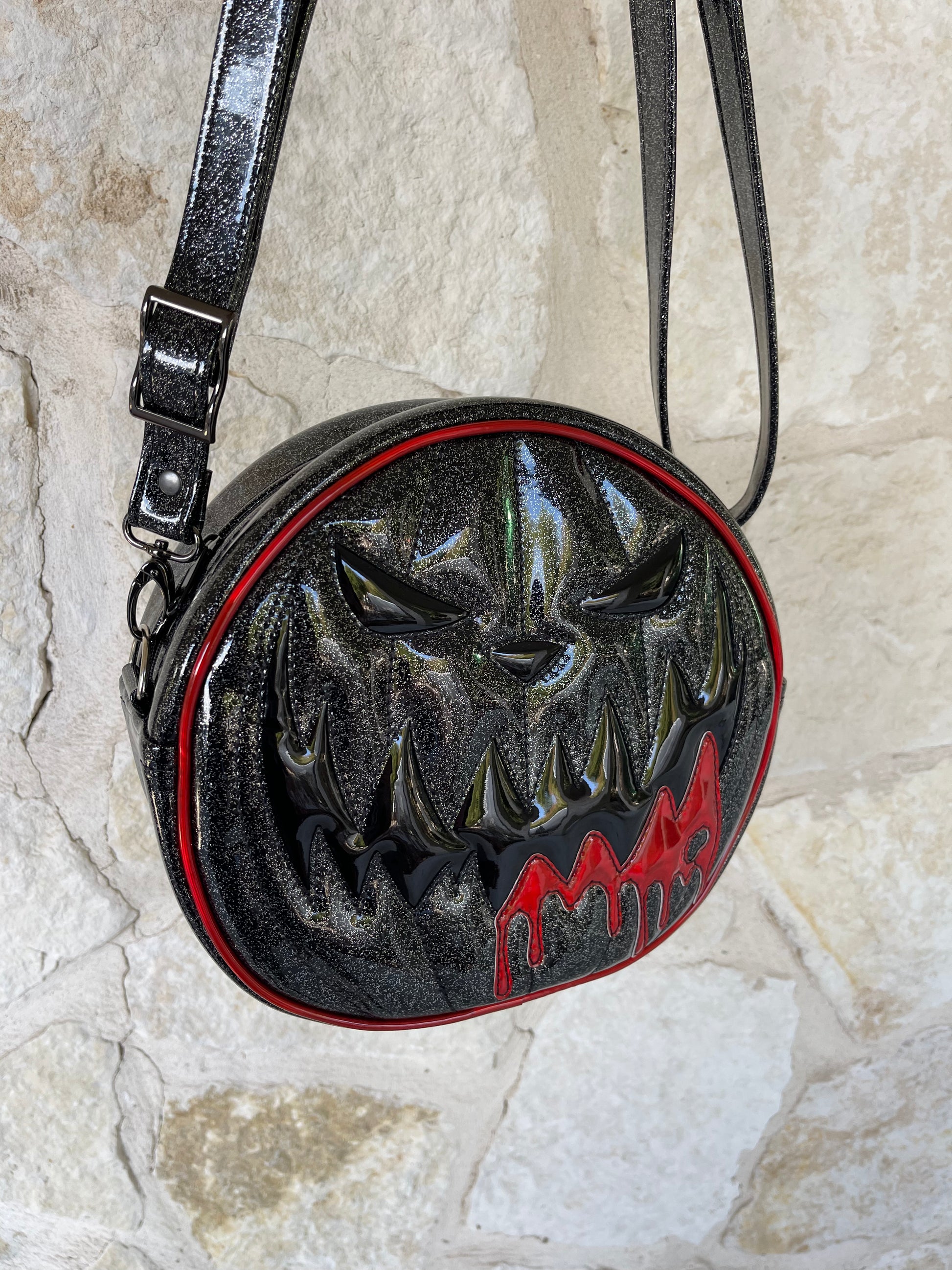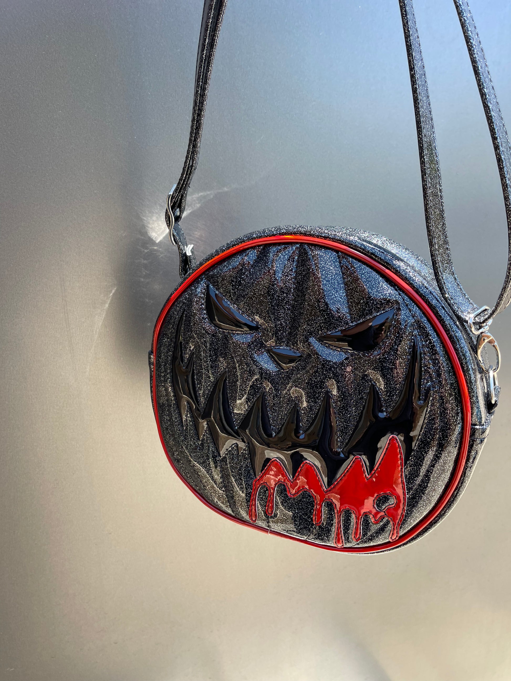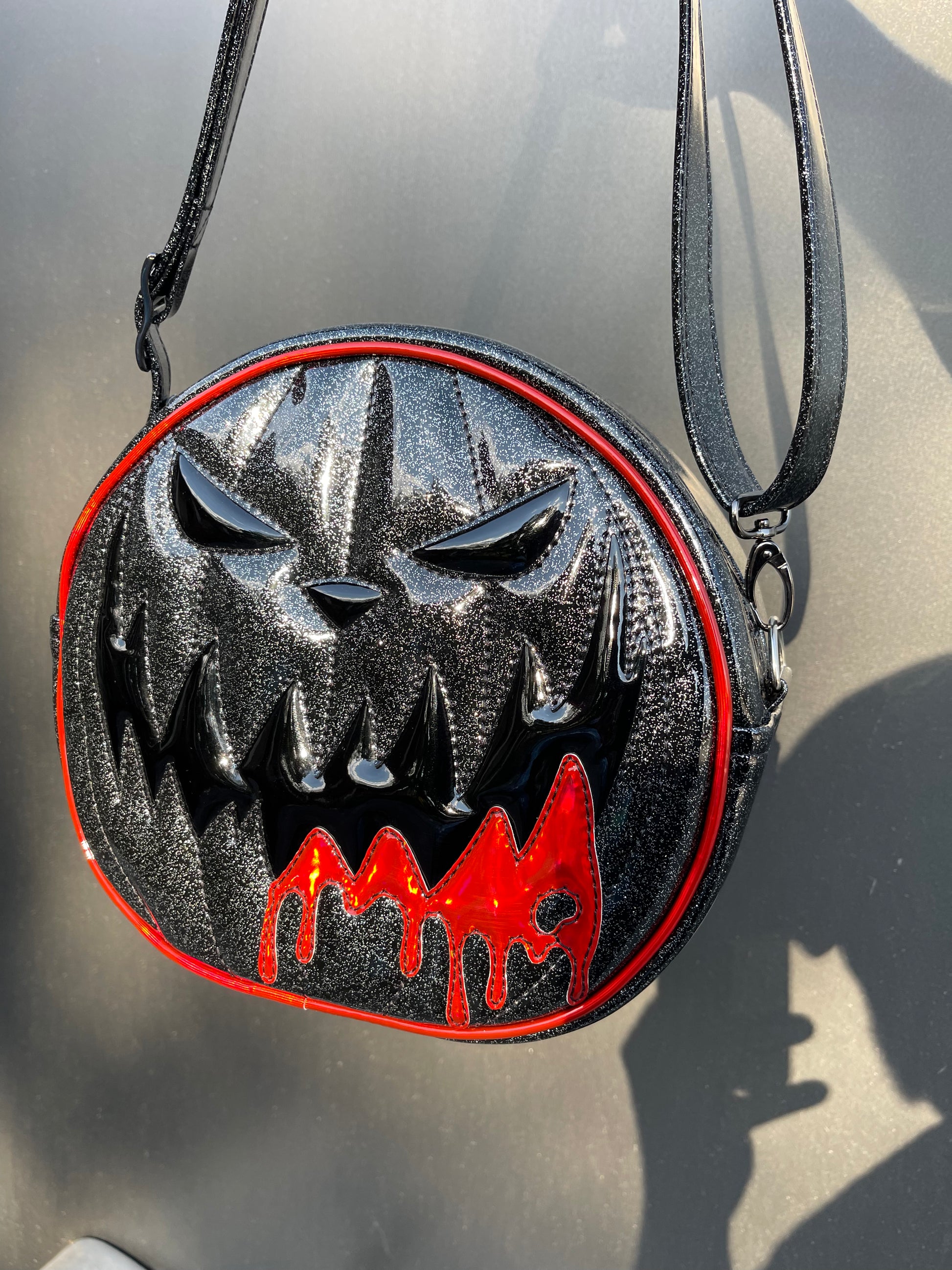 This bloody mean face cruiser bag is finished in black glitter vinyl with a black chrome face and blood red holo ooze dripping from its creepy mouth. This comes with our adjustable shoulder/crossbody strap. It has one outside slip pocket and two inside slip pockets. The bag is lined in a black, padded nylon fabric.