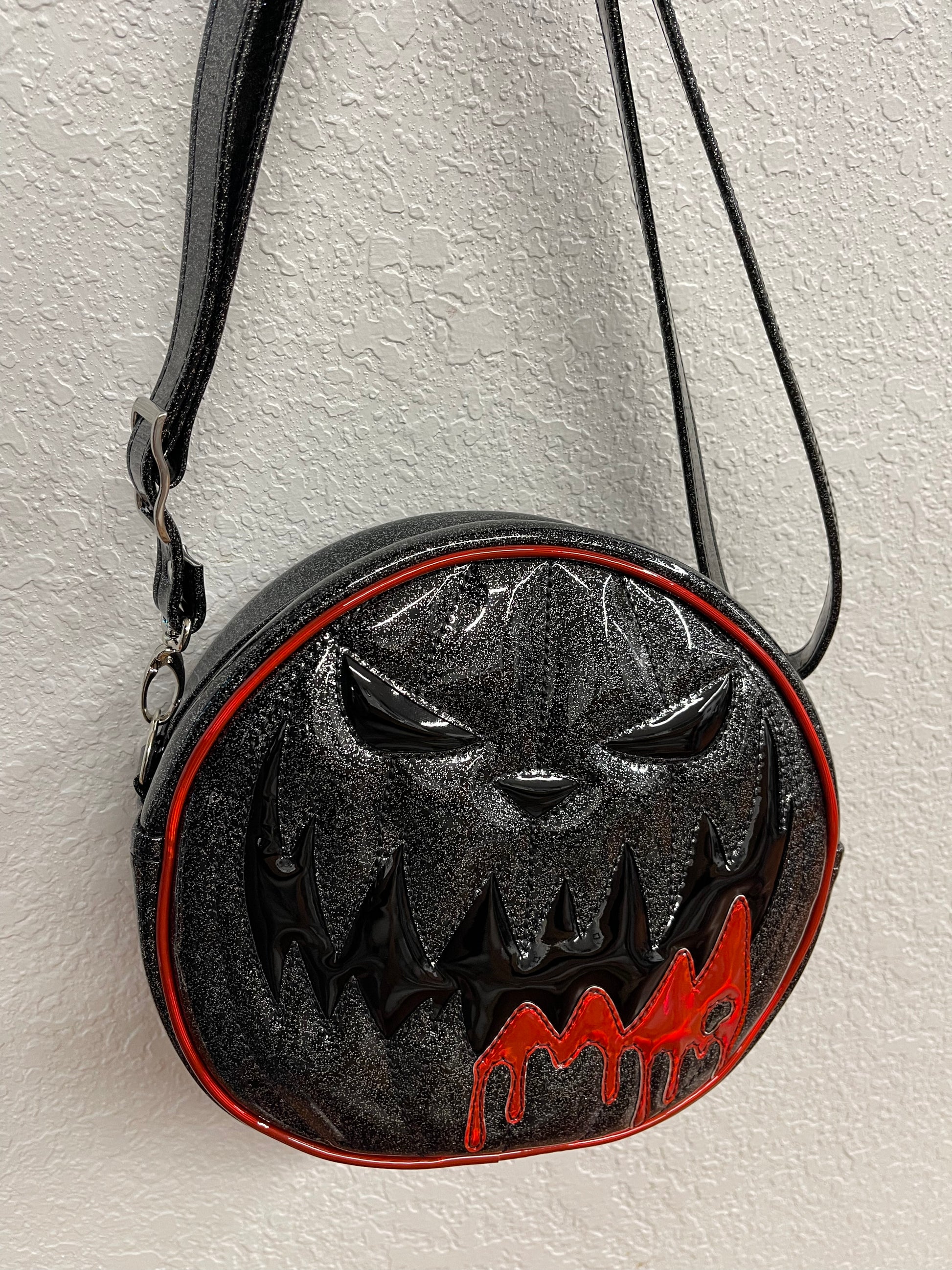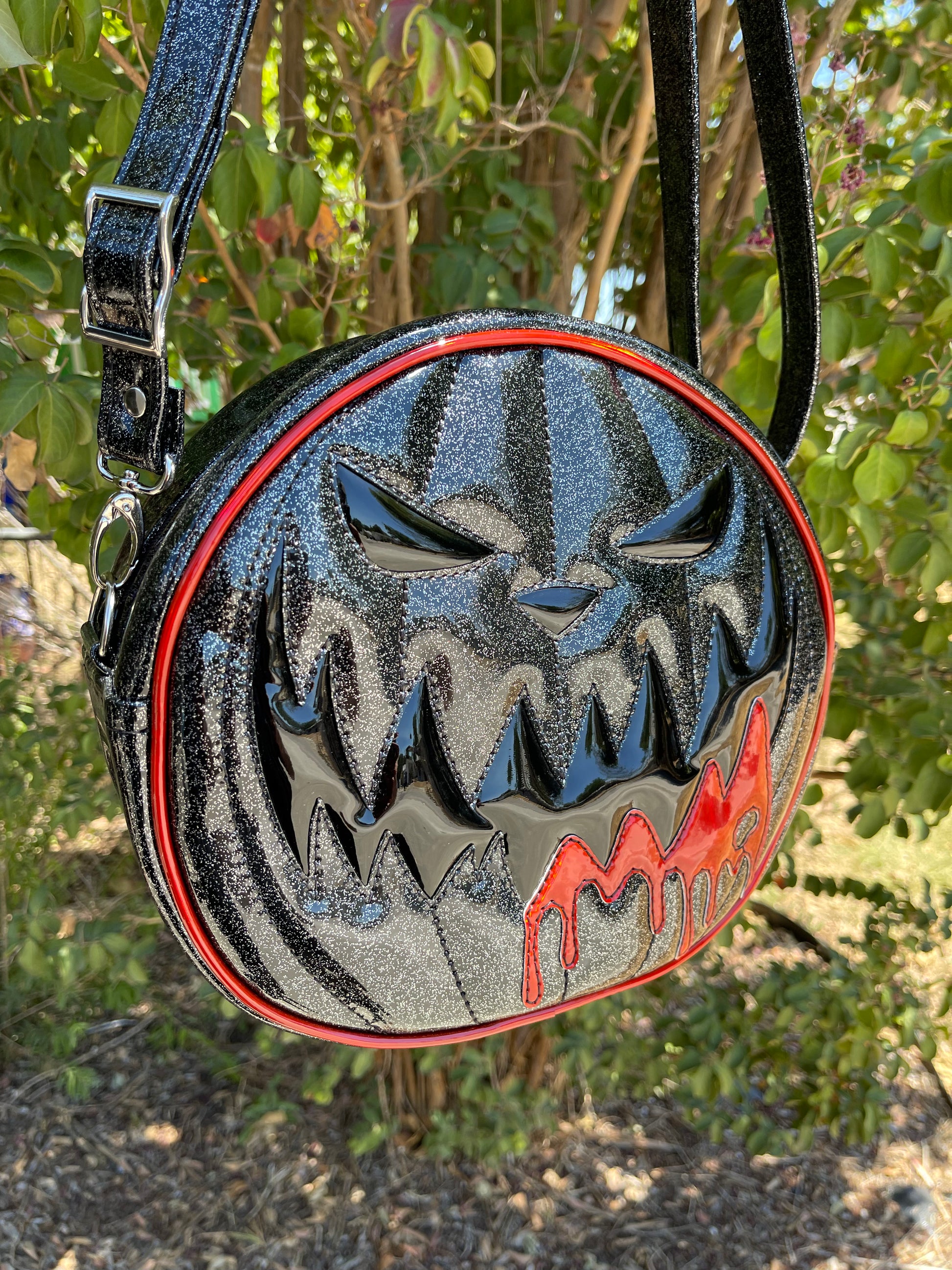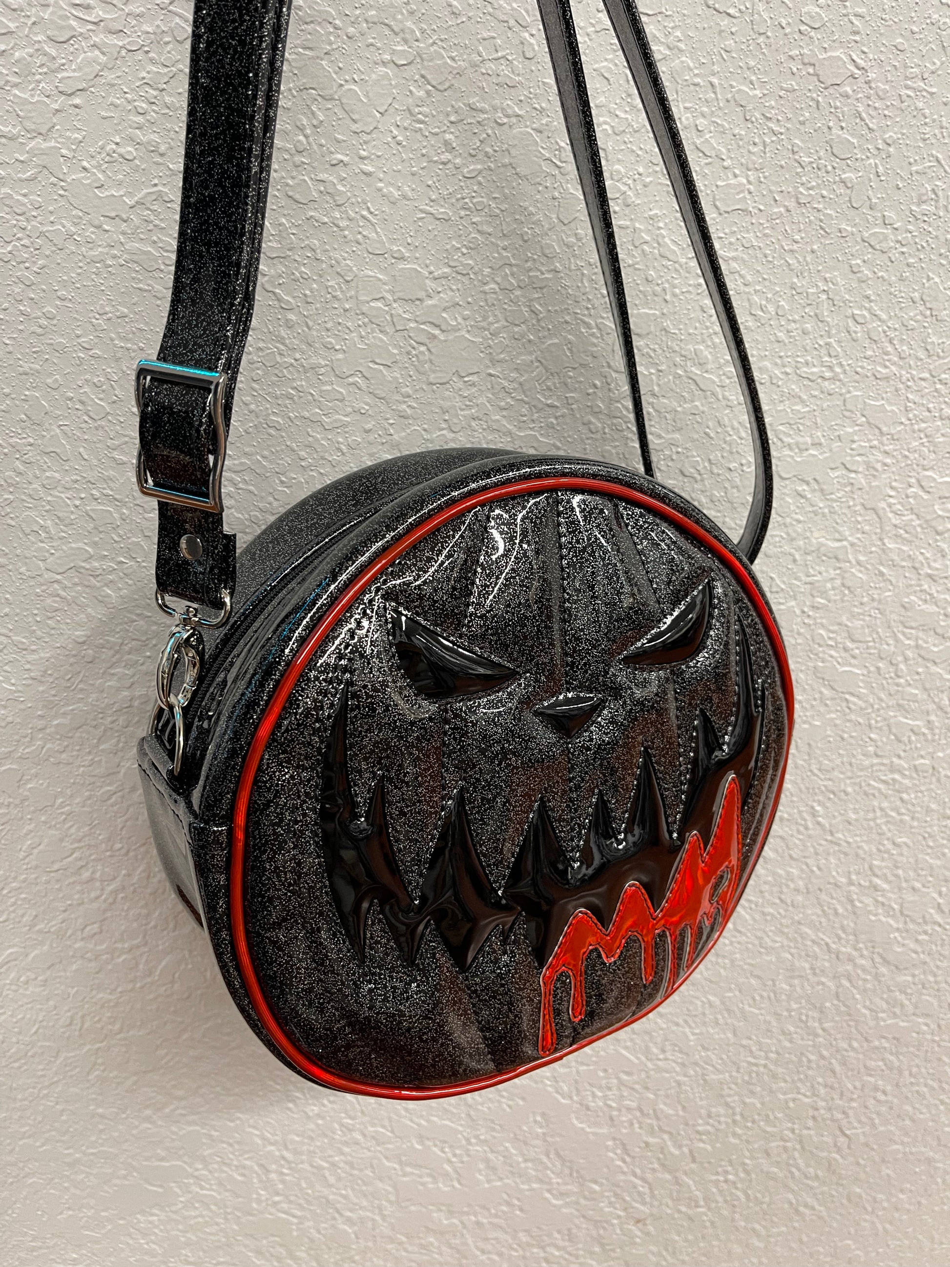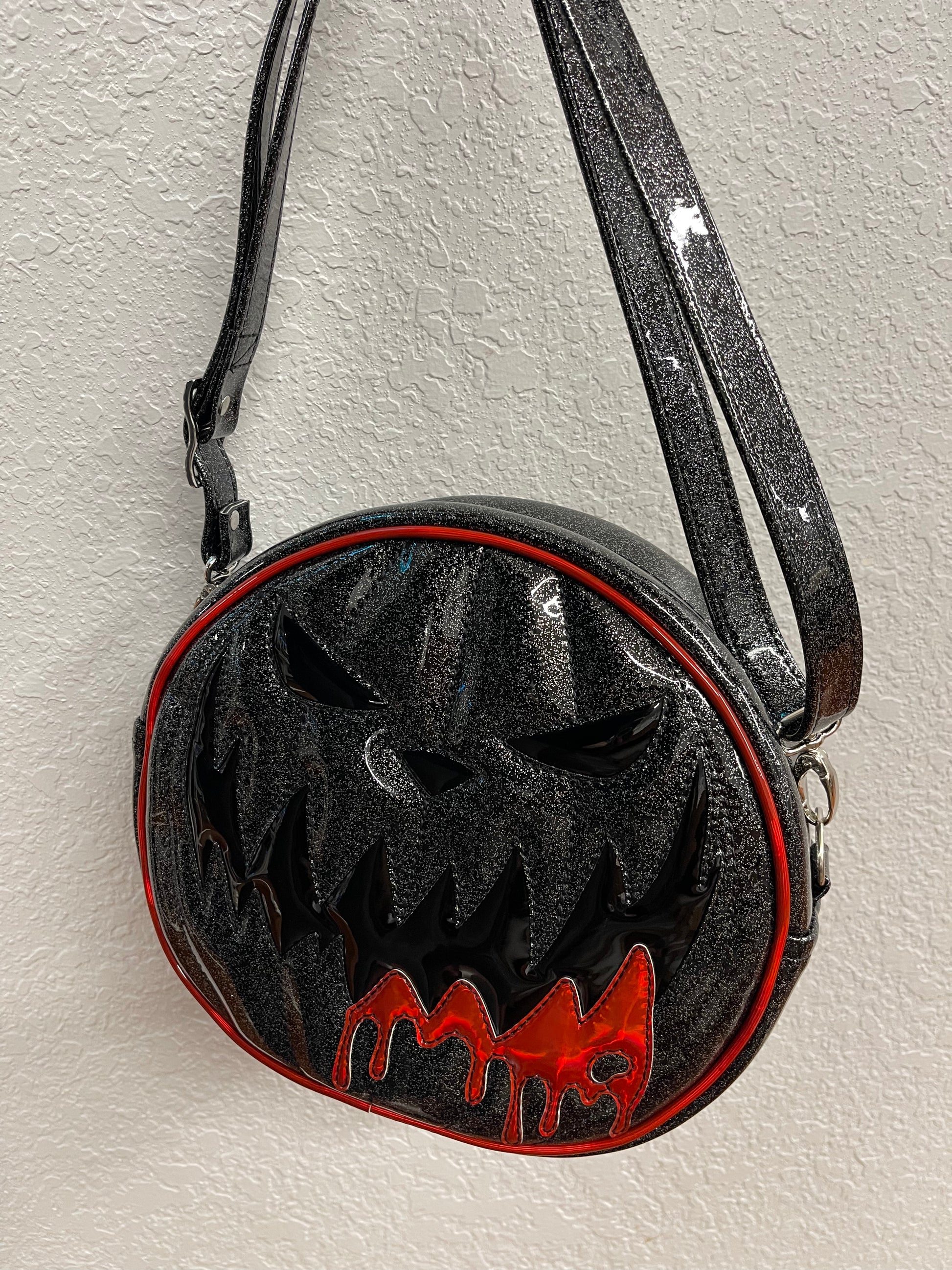 This bloody mean face cruiser bag is finished in black glitter vinyl with a black chrome face and blood red holo ooze dripping from its creepy mouth. This comes with our adjustable shoulder/crossbody strap. It has one outside slip pocket and two inside slip pockets. The bag is lined in a black, padded nylon fabric.