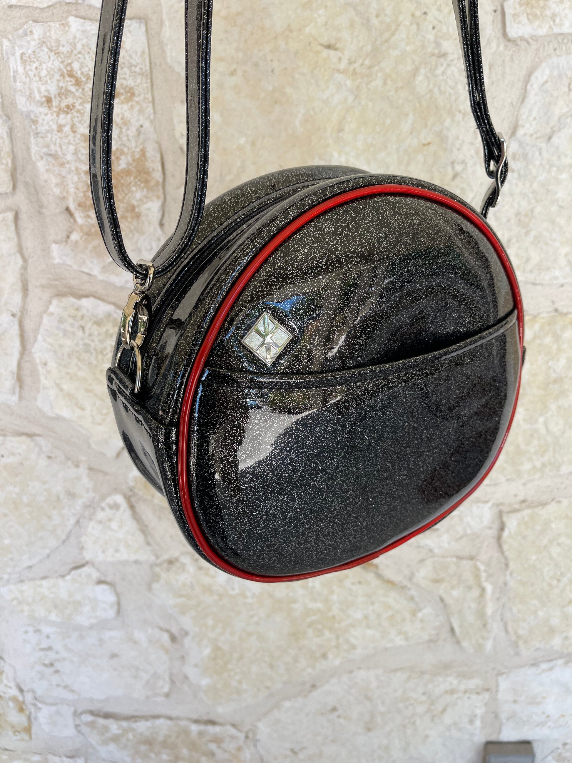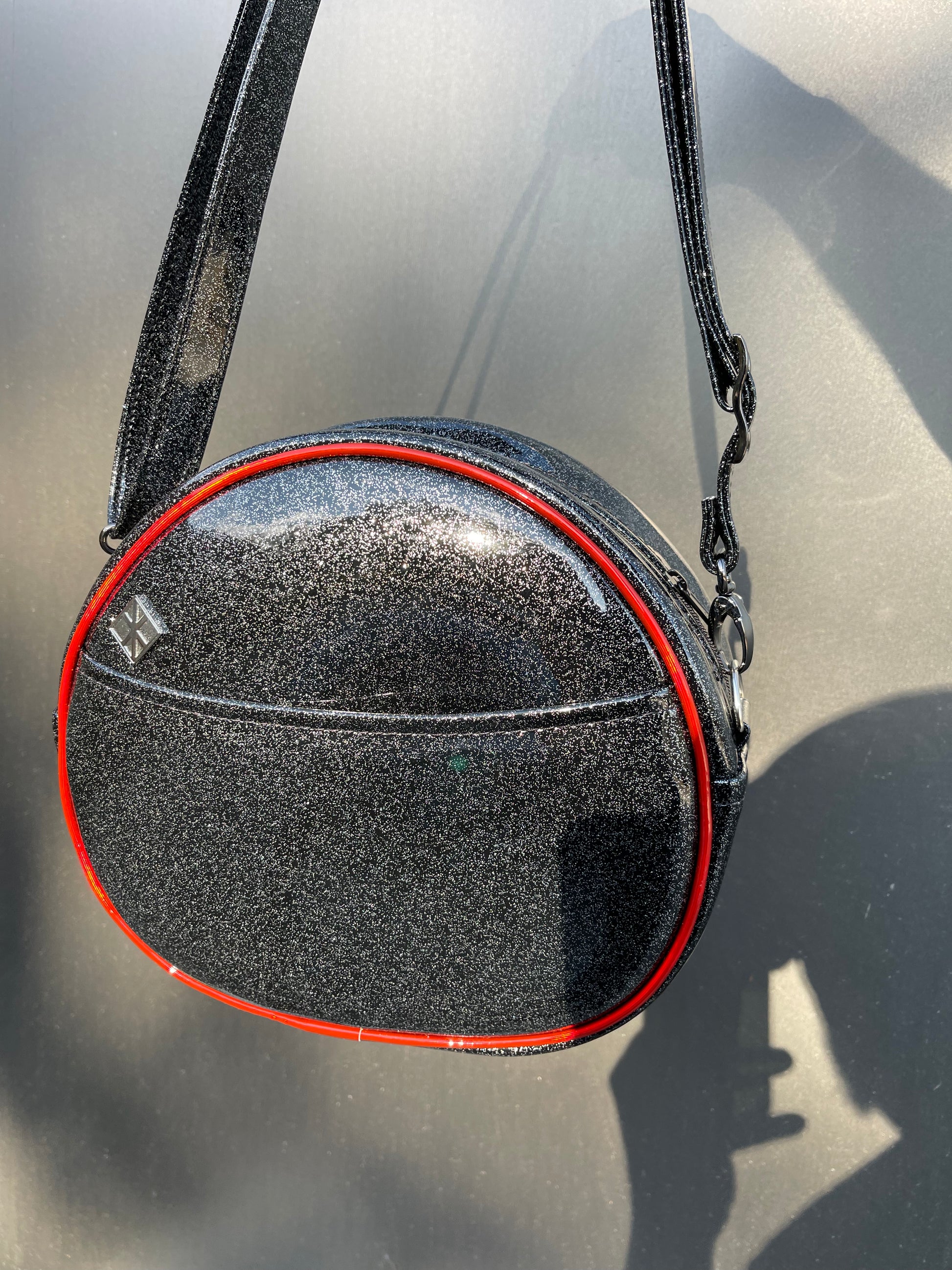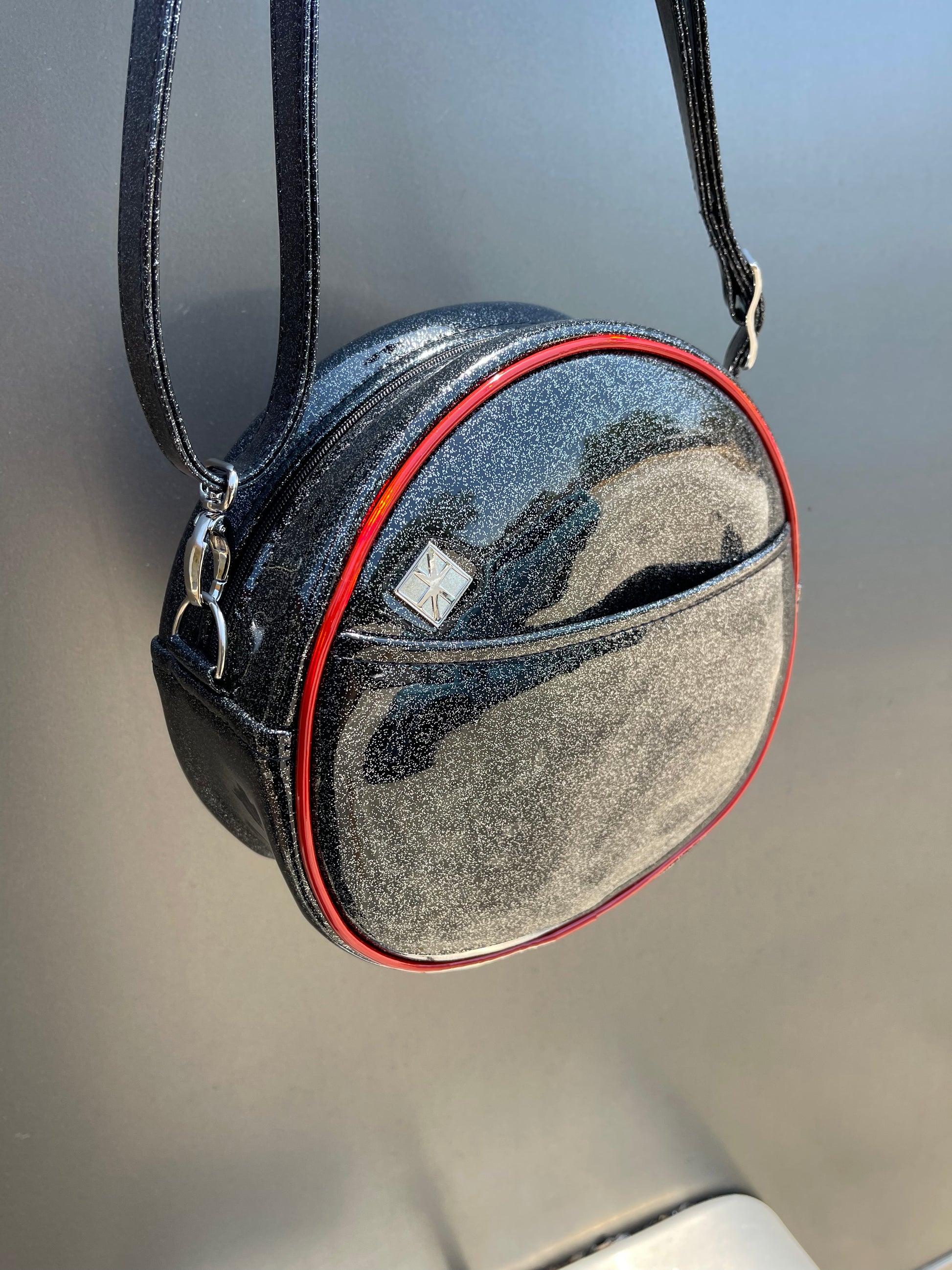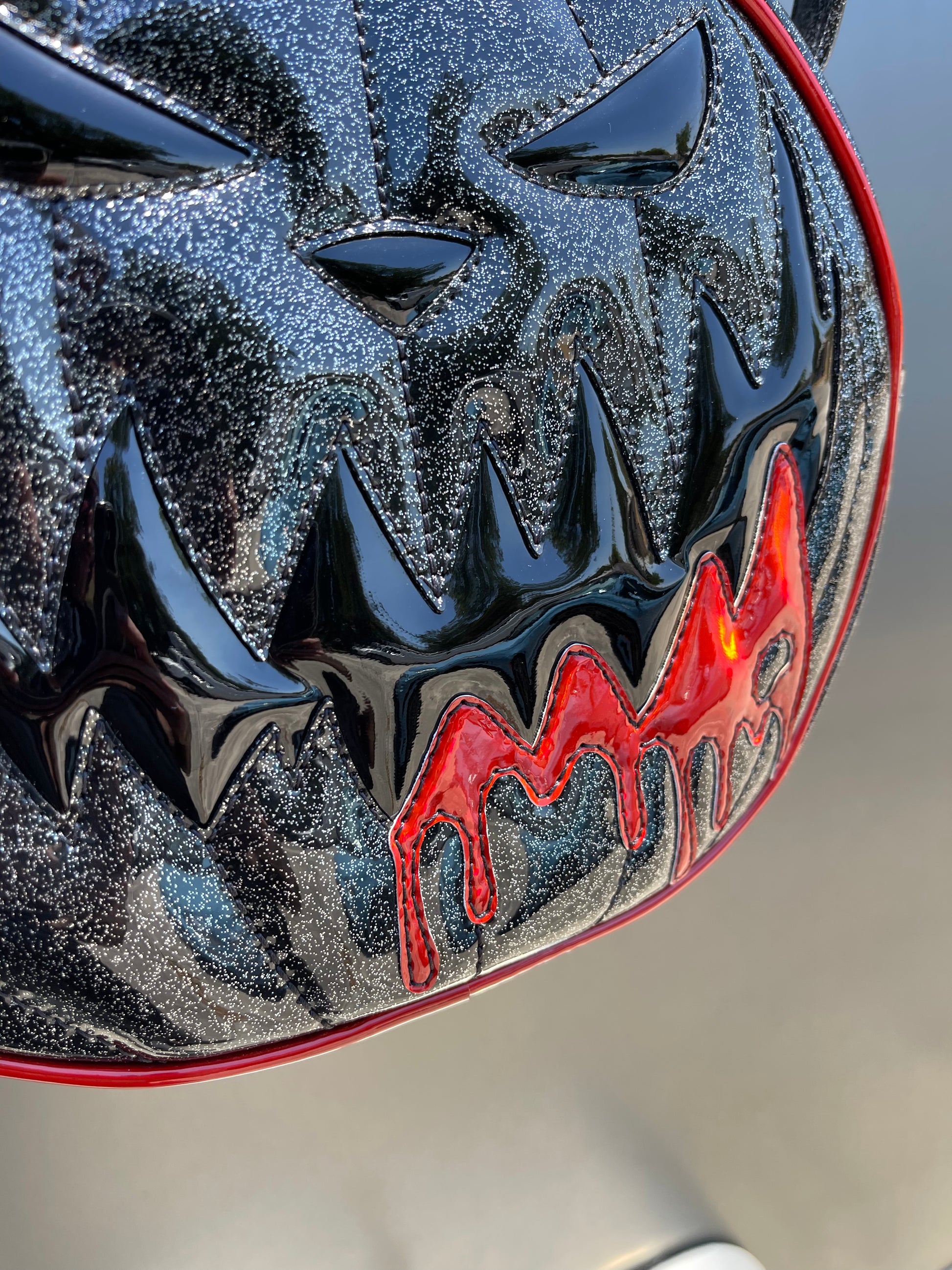 This bloody mean face cruiser bag is finished in black glitter vinyl with a black chrome face and blood red holo ooze dripping from its creepy mouth. This comes with our adjustable shoulder/crossbody strap. It has one outside slip pocket and two inside slip pockets. The bag is lined in a black, padded nylon fabric.