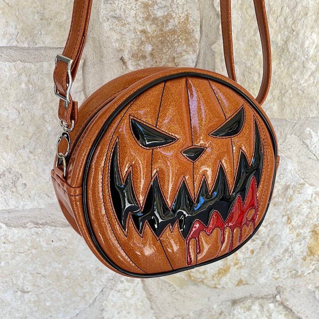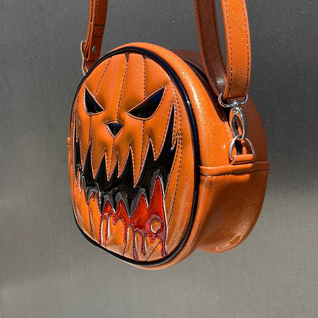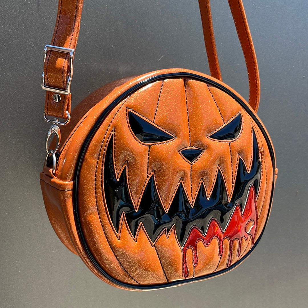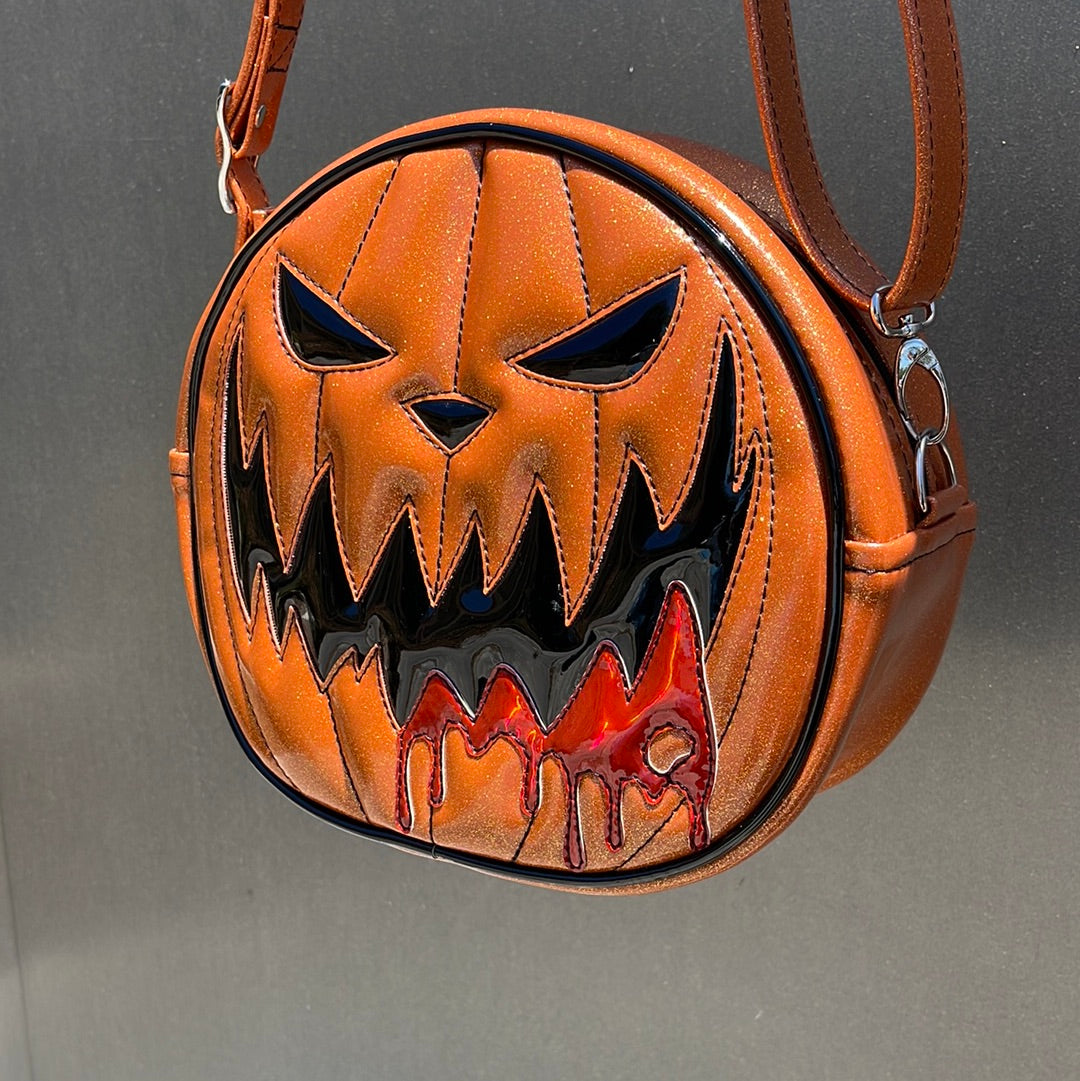 This bloody mean face cruiser bag is finished in orange glitter vinyl with accents in black chrome vinyl and red holo blood dripping from its creepy mouth. We paired this with black thread for all the stitching. This comes with our adjustable shoulder/crossbody strap. It has one outside slip pocket and two inside slip pockets. The bag is lined in a black, padded nylon fabric.
