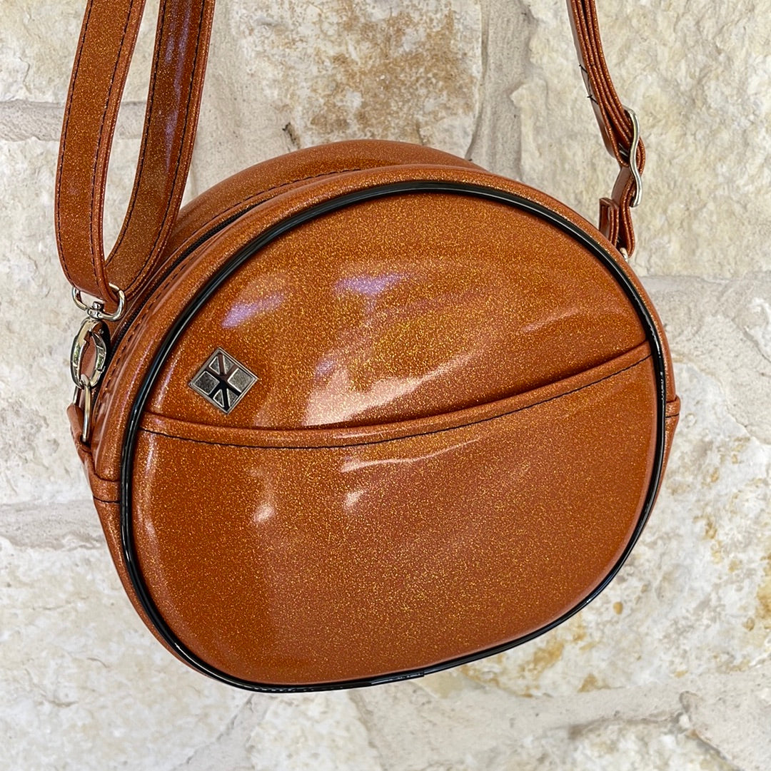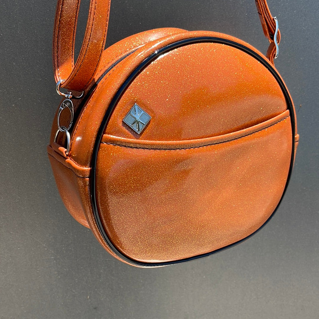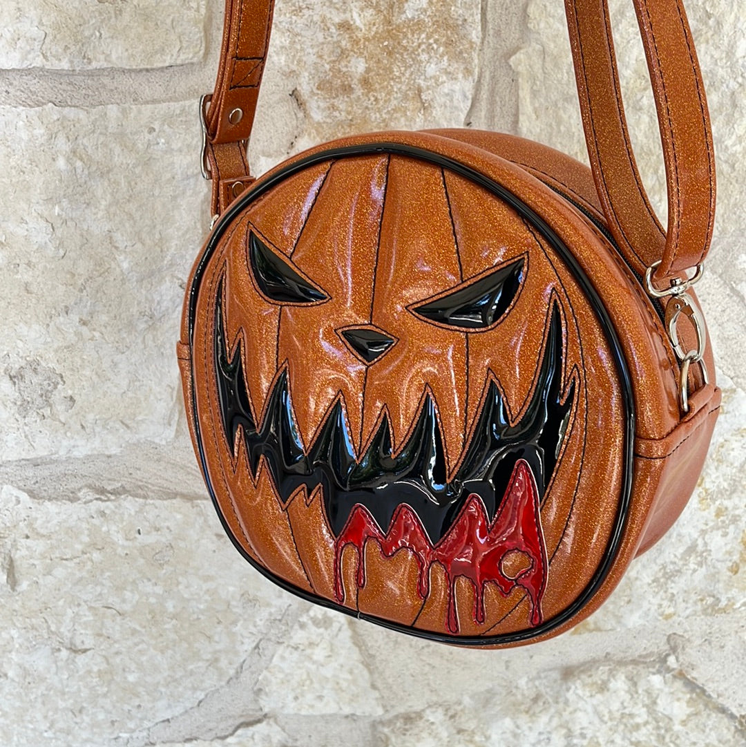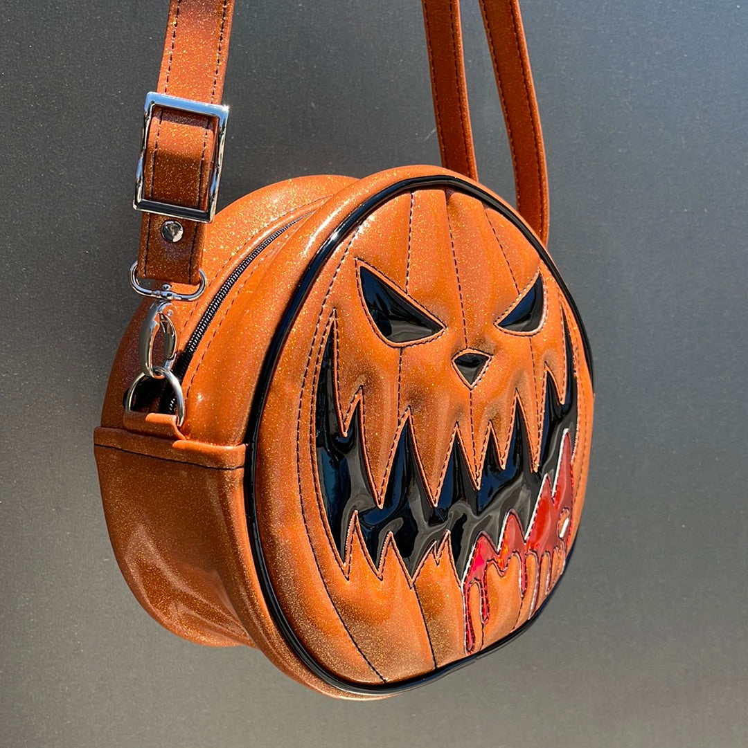 This bloody mean face cruiser bag is finished in orange glitter vinyl with accents in black chrome vinyl and red holo blood dripping from its creepy mouth. We paired this with black thread for all the stitching. This comes with our adjustable shoulder/crossbody strap. It has one outside slip pocket and two inside slip pockets. The bag is lined in a black, padded nylon fabric.