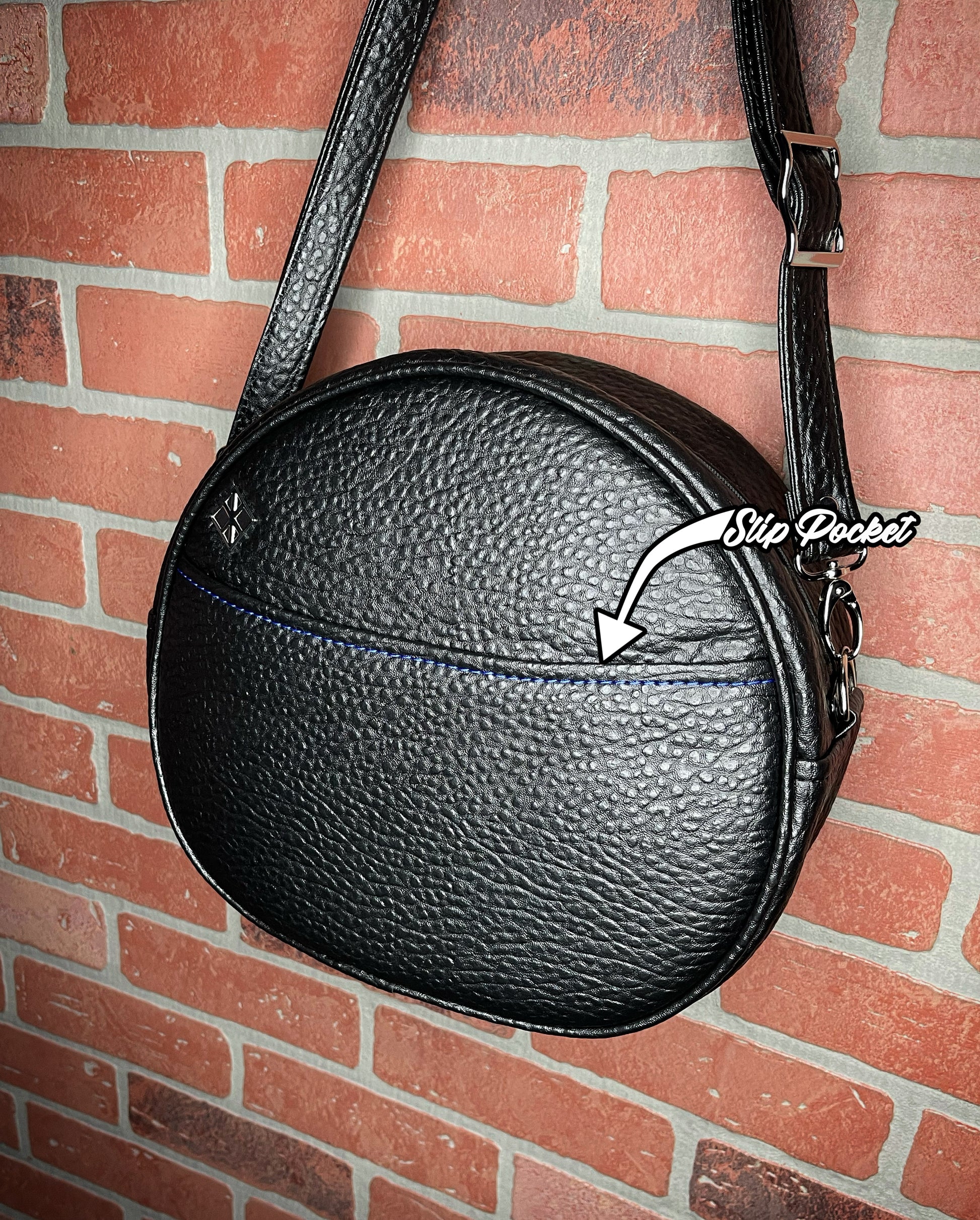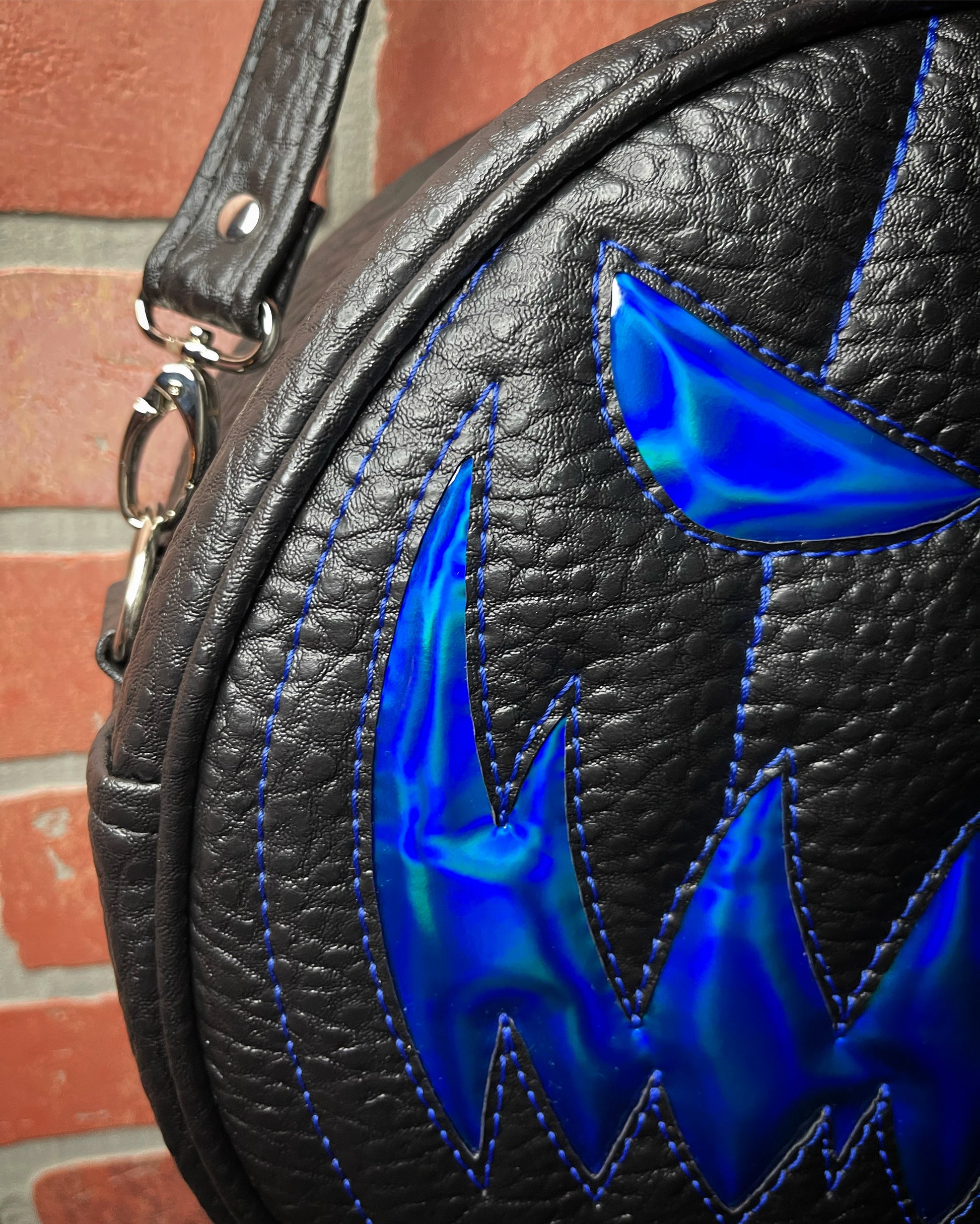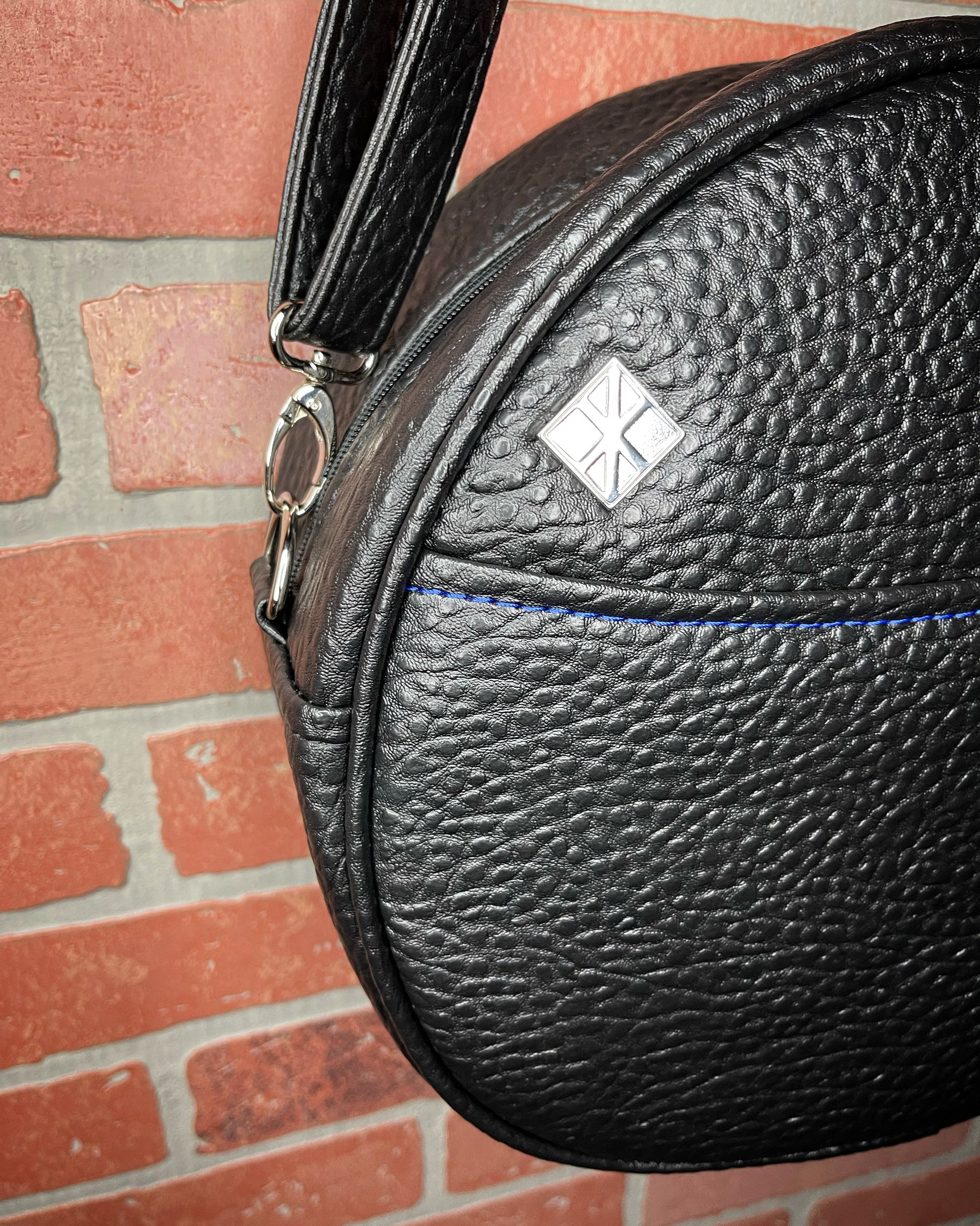 This Cruiser handbag is finished in black Boca vinyl and blue holo vinyl. It features a matching, blue thread. This comes with our adjustable shoulder/crossbody strap. It has one outside slip pocket and two inside slip pockets. The bag is lined in a black, padded nylon fabric.