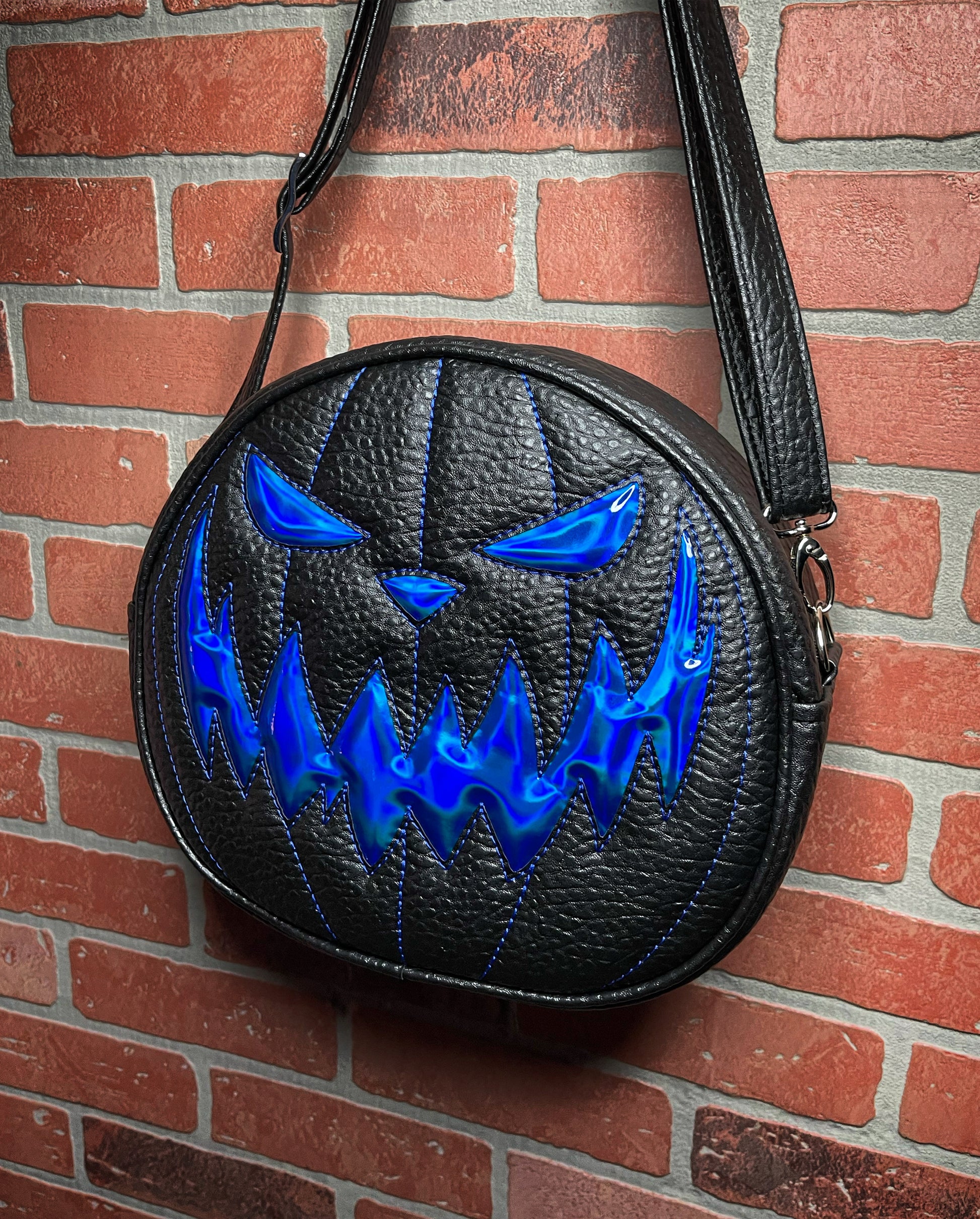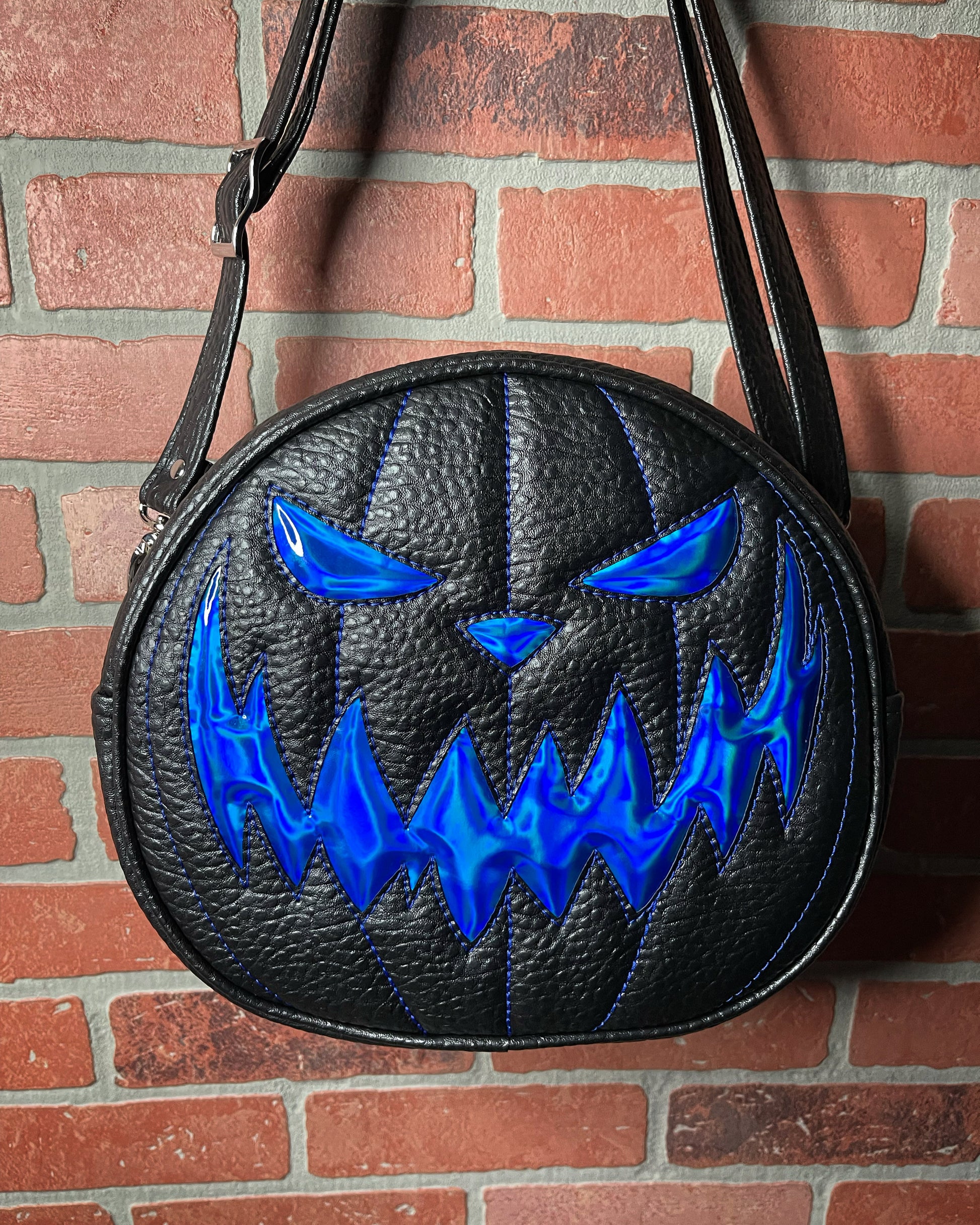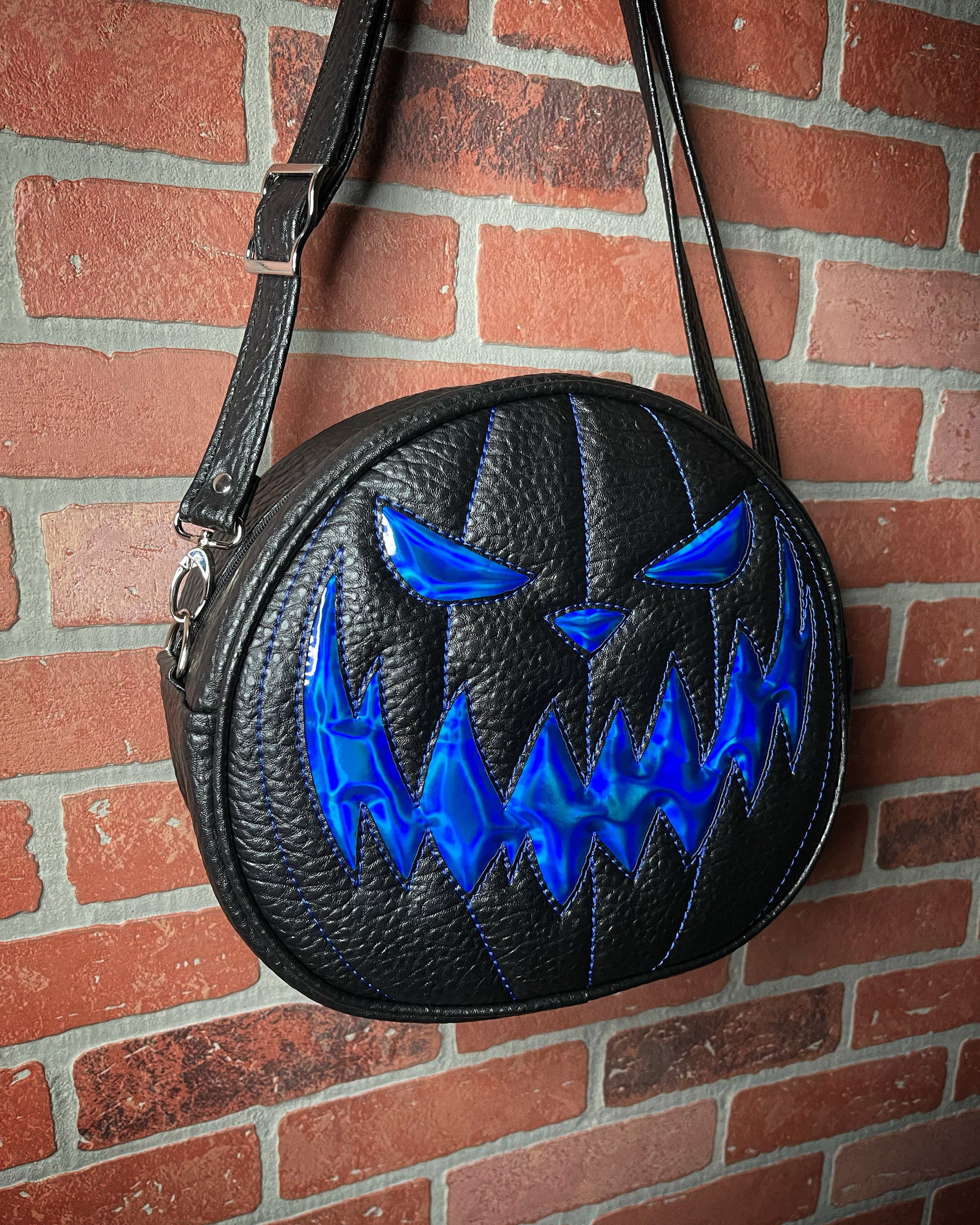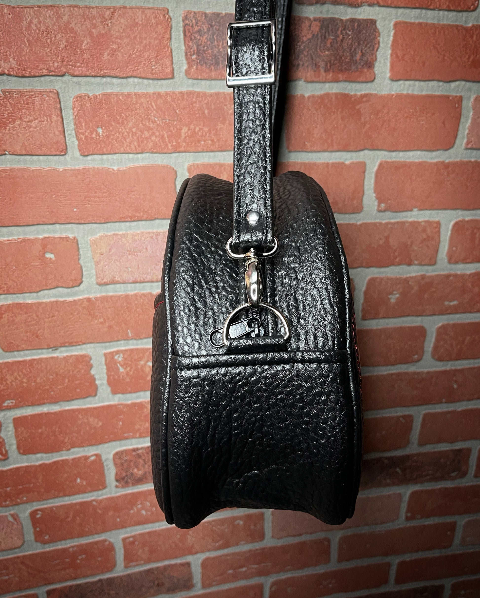 This Cruiser handbag is finished in black Boca vinyl and blue holo vinyl. It features a matching, blue thread. This comes with our adjustable shoulder/crossbody strap. It has one outside slip pocket and two inside slip pockets. The bag is lined in a black, padded nylon fabric.