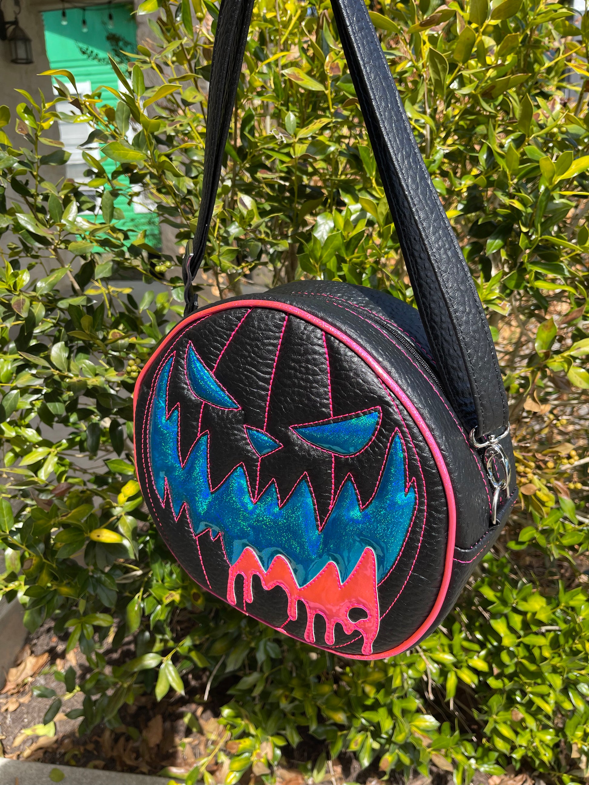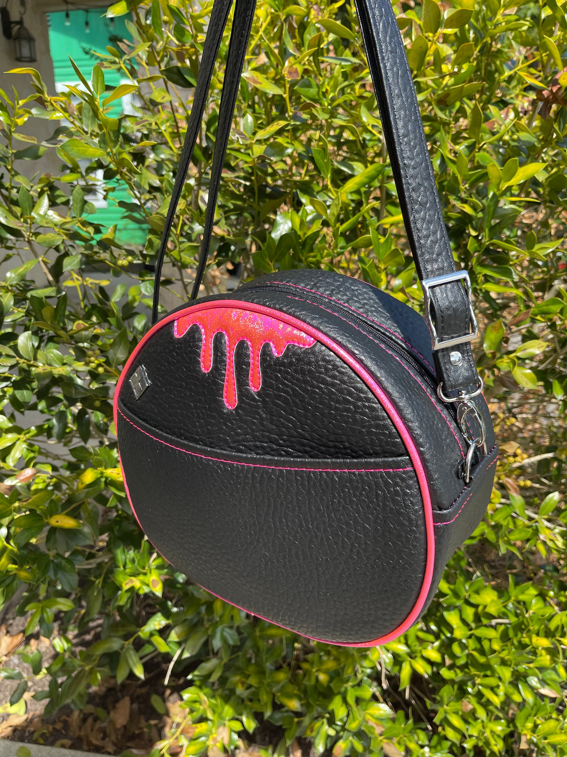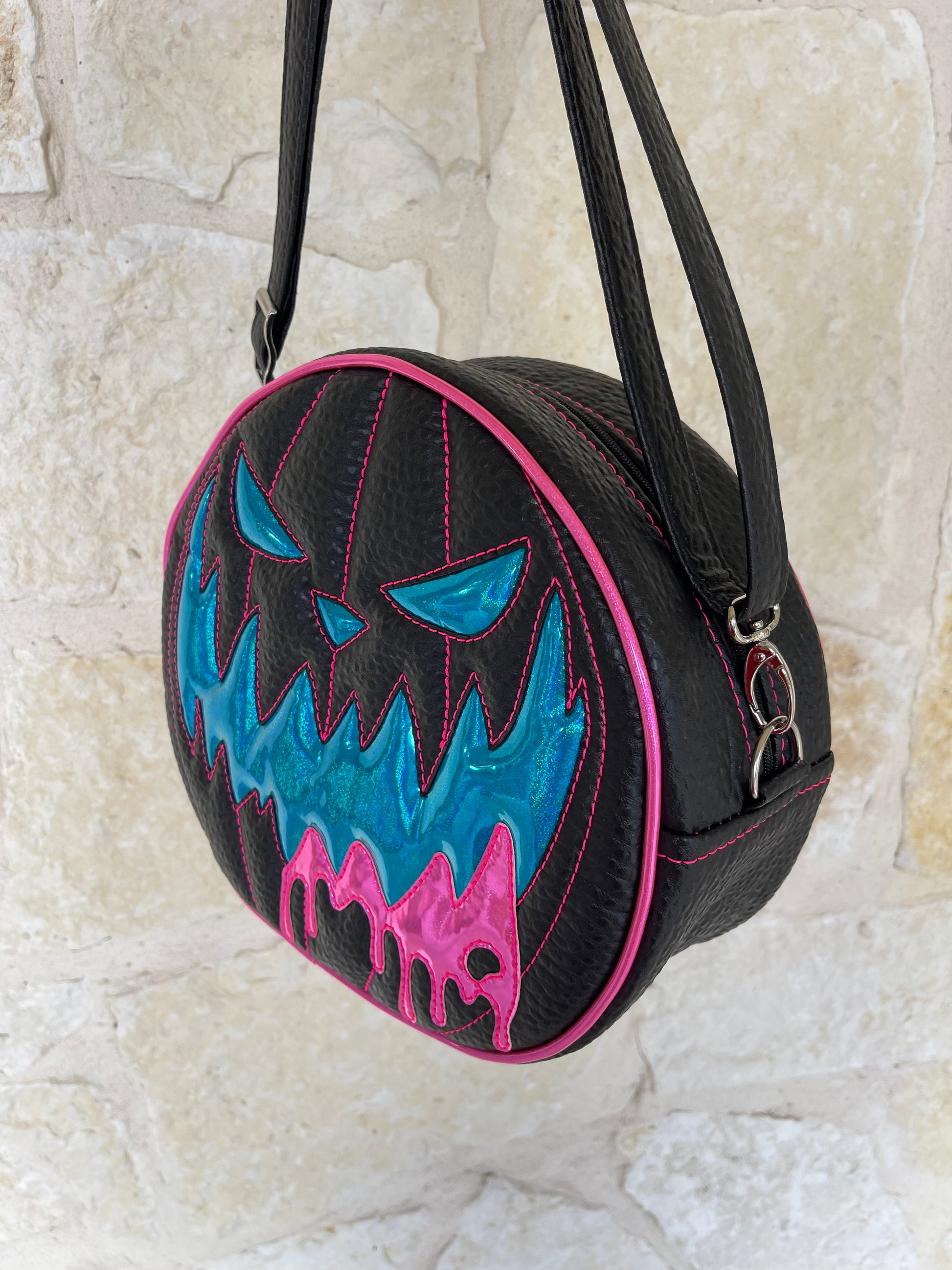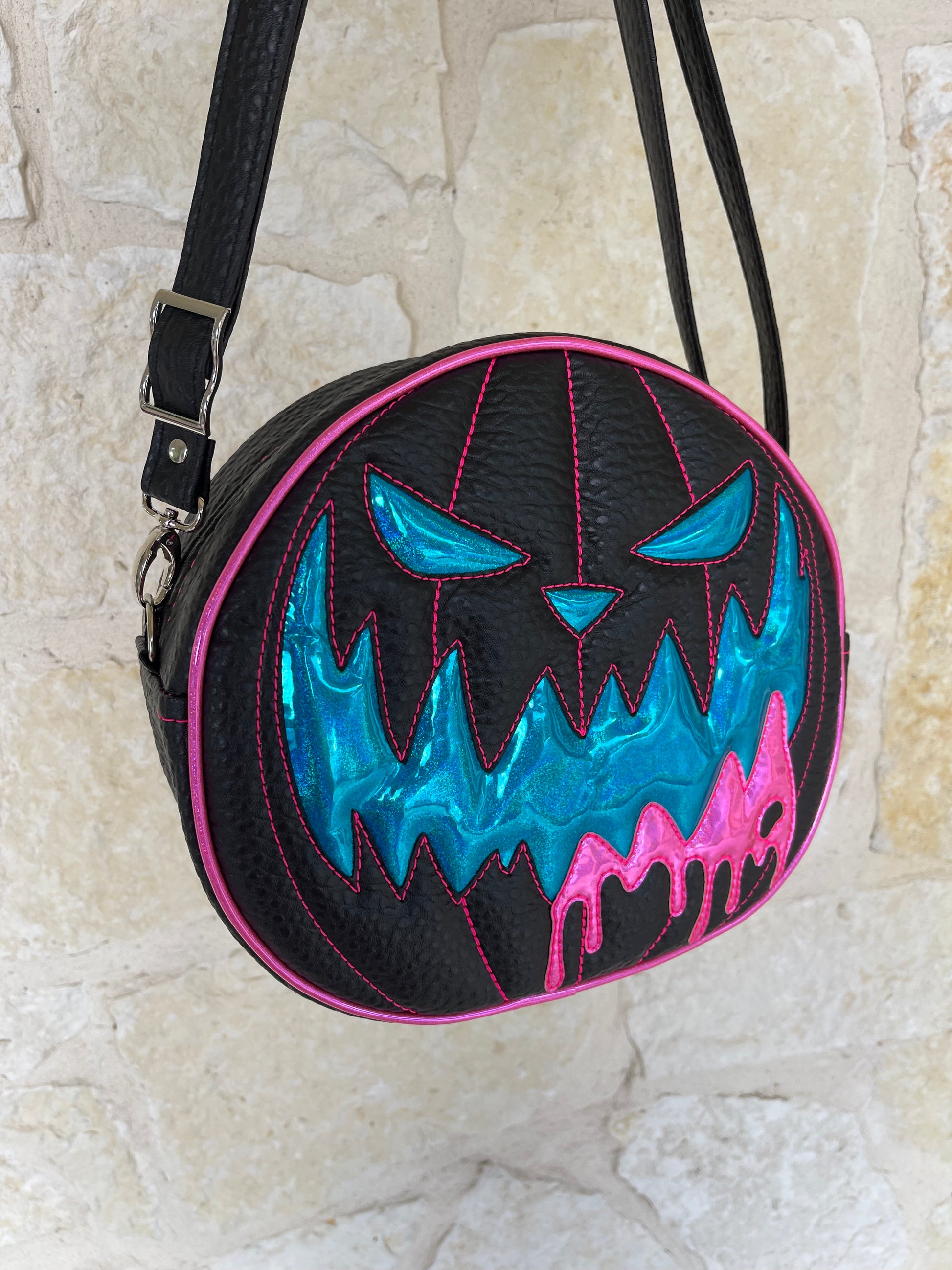 This oozy mean face cruiser bag is finished in black Boca vinyl with accents in neon pink holo glitter vinyl and turquoise glitter holo . We paired this with hot pink thread for all the stitching. This comes with our adjustable shoulder/crossbody strap. It has one outside slip pocket and two inside slip pockets. The bag is lined in a black, padded nylon fabric.
