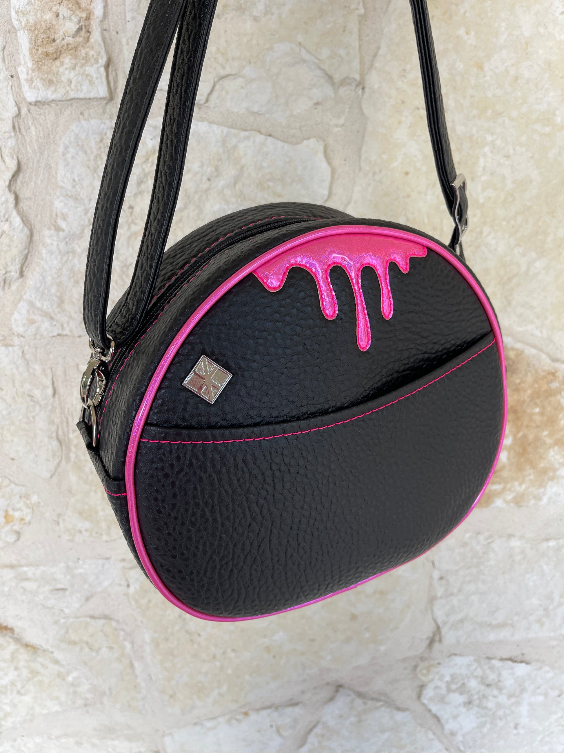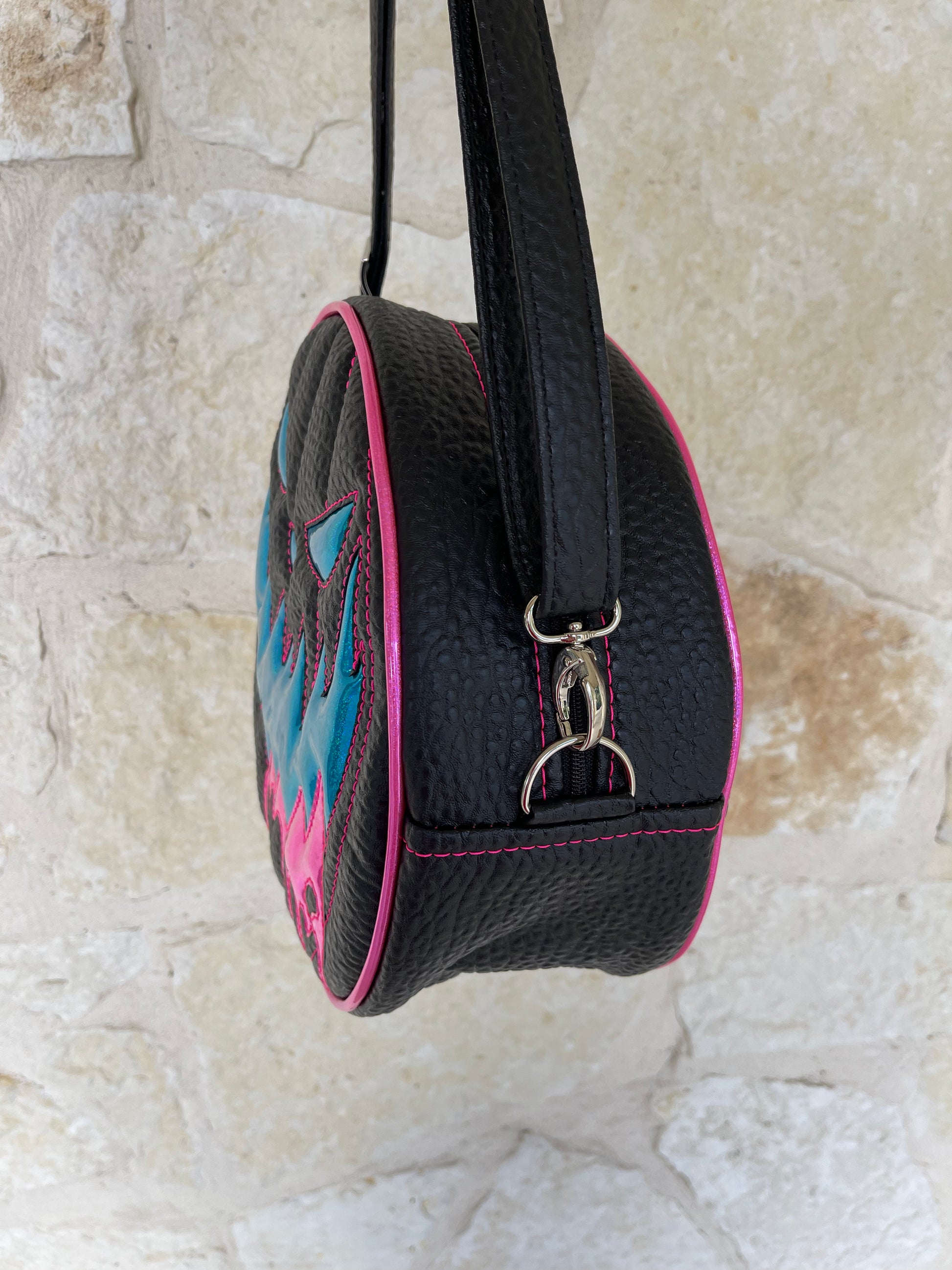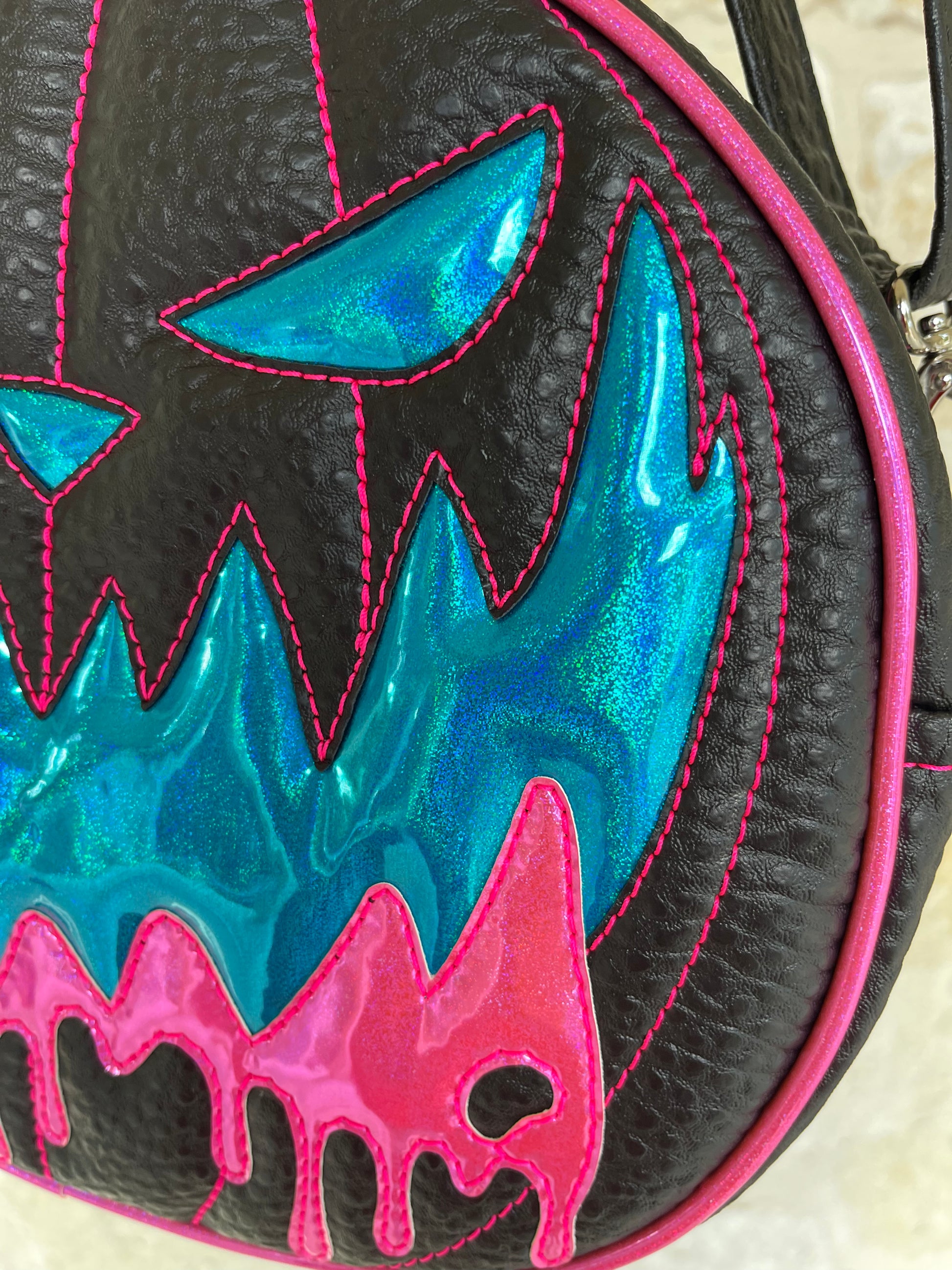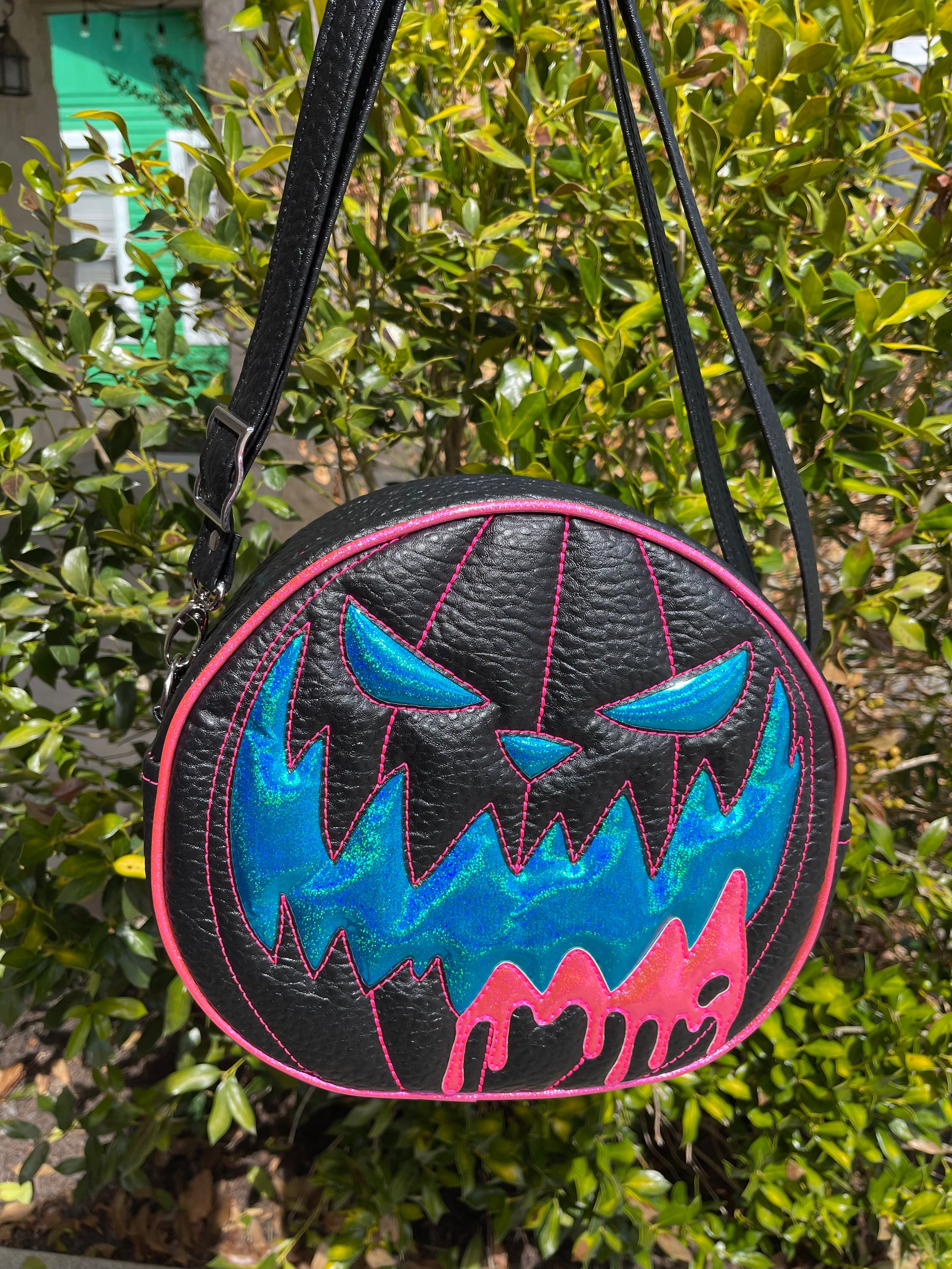 This oozy mean face cruiser bag is finished in black Boca vinyl with accents in neon pink holo glitter vinyl and turquoise glitter holo . We paired this with hot pink thread for all the stitching. This comes with our adjustable shoulder/crossbody strap. It has one outside slip pocket and two inside slip pockets. The bag is lined in a black, padded nylon fabric.