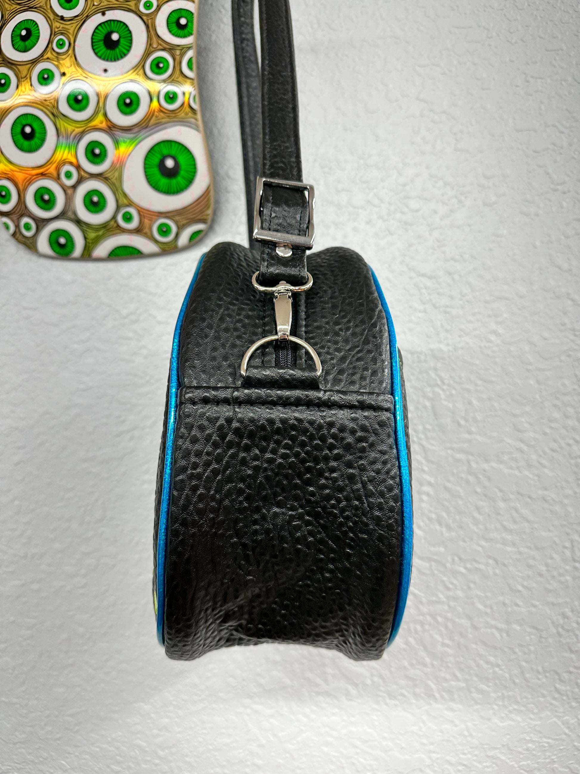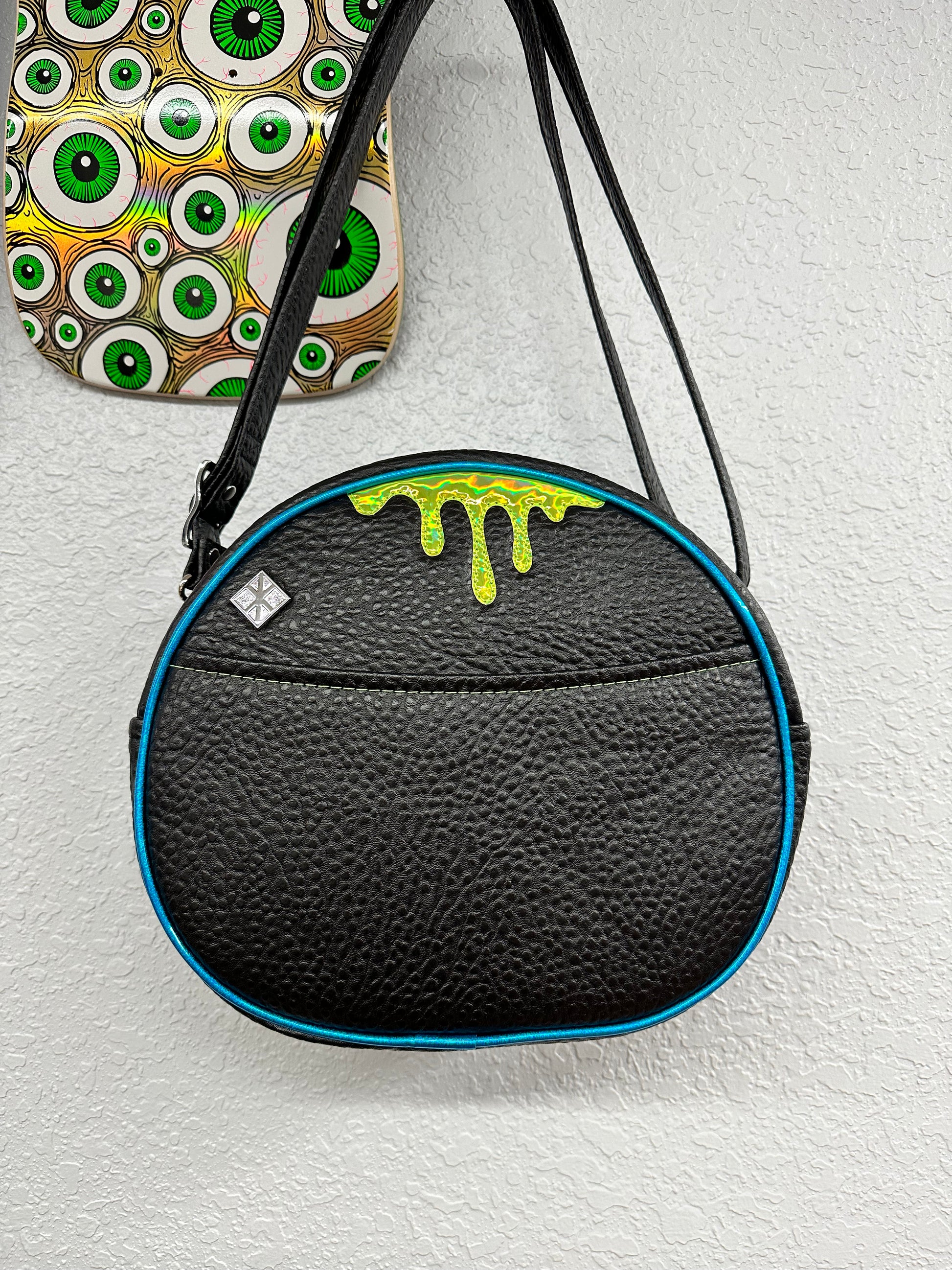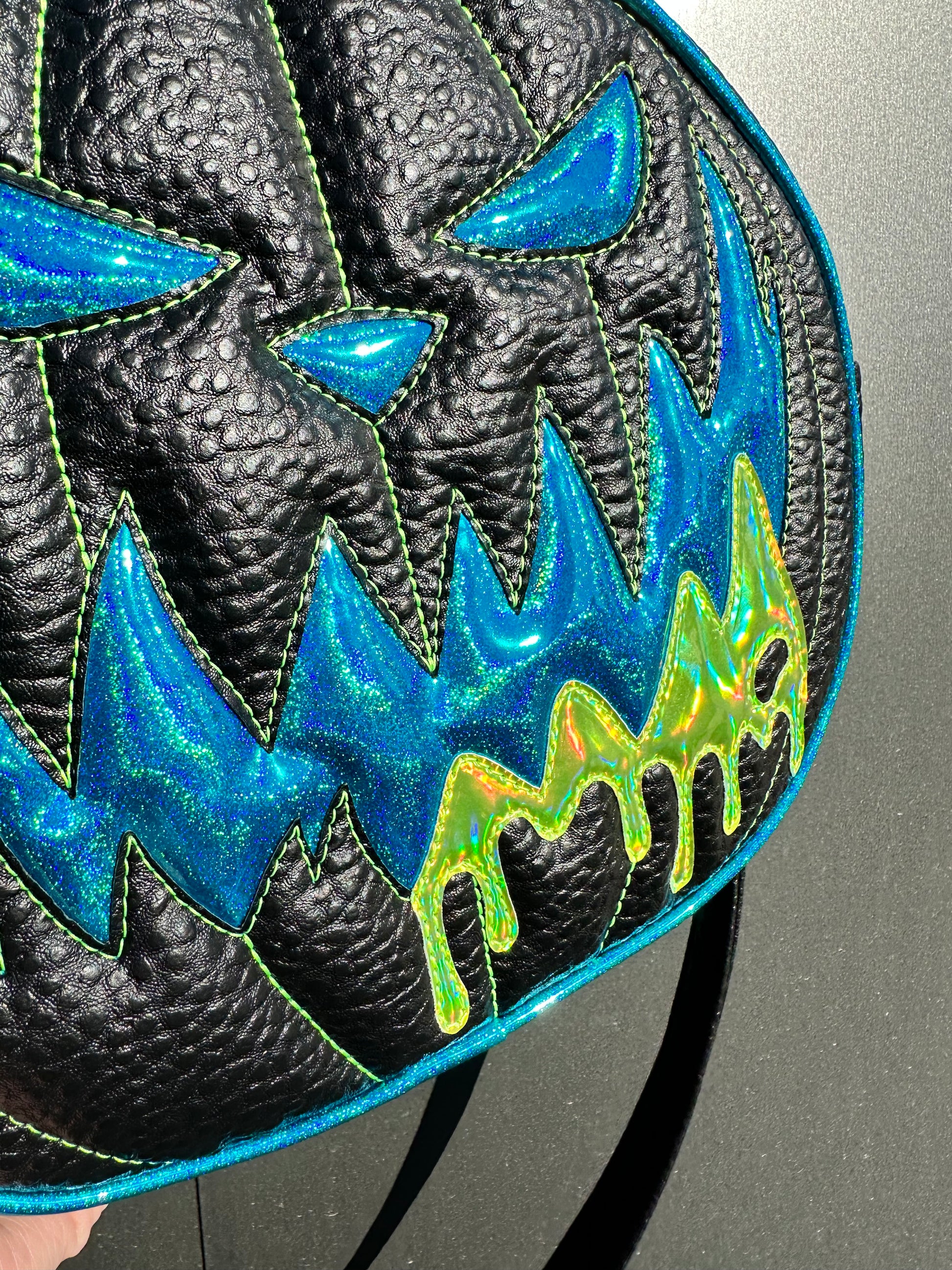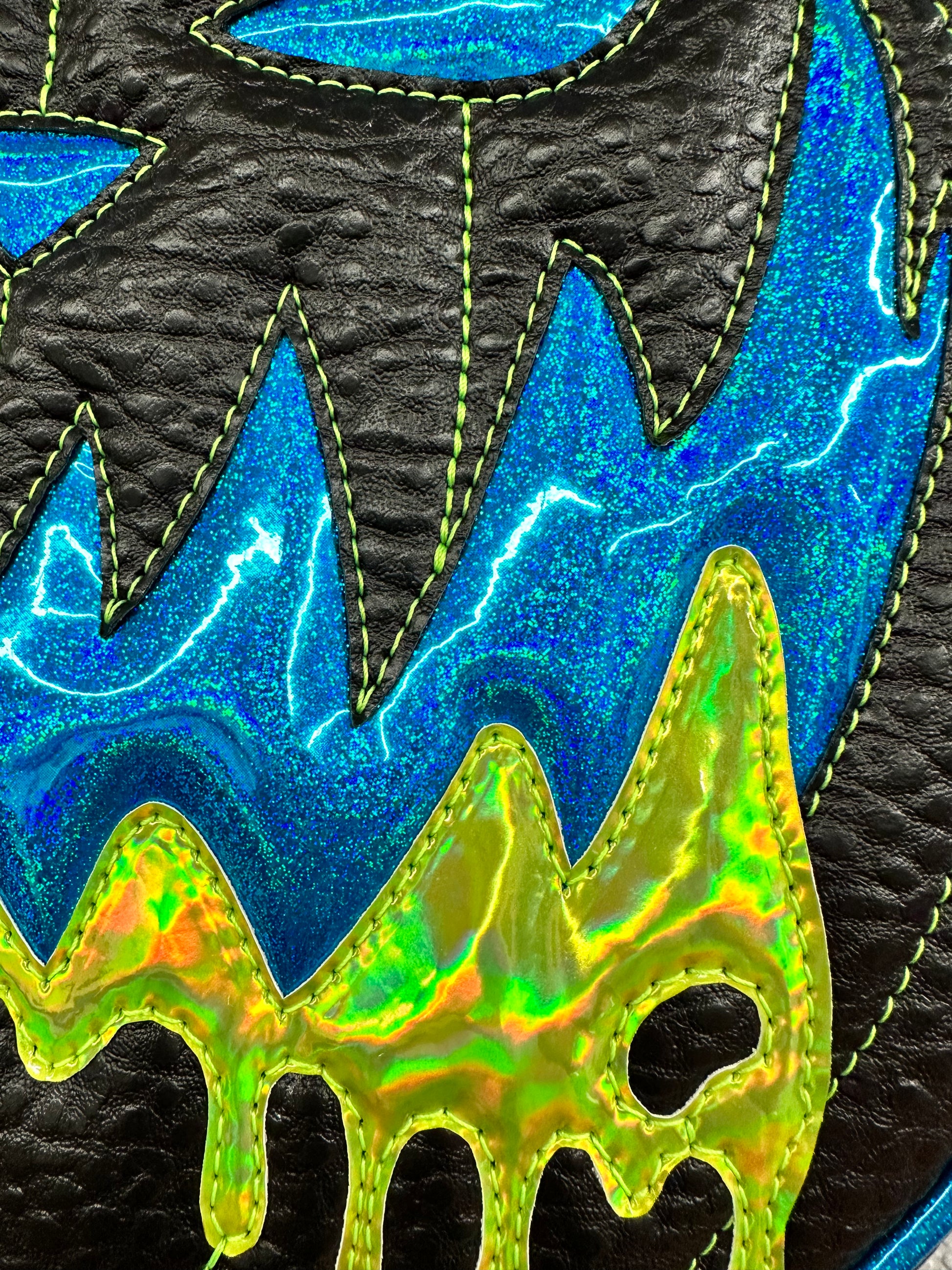 This bloody mean face cruiser bag is finished in black Boca vinyl with accents in turquoise glitter holo vinyl and lime holo ooze dripping from its creepy mouth. We paired this with lime thread for all the stitching. This comes with our adjustable shoulder/crossbody strap. It has one outside slip pocket and two inside slip pockets. The bag is lined in a black, padded nylon fabric.