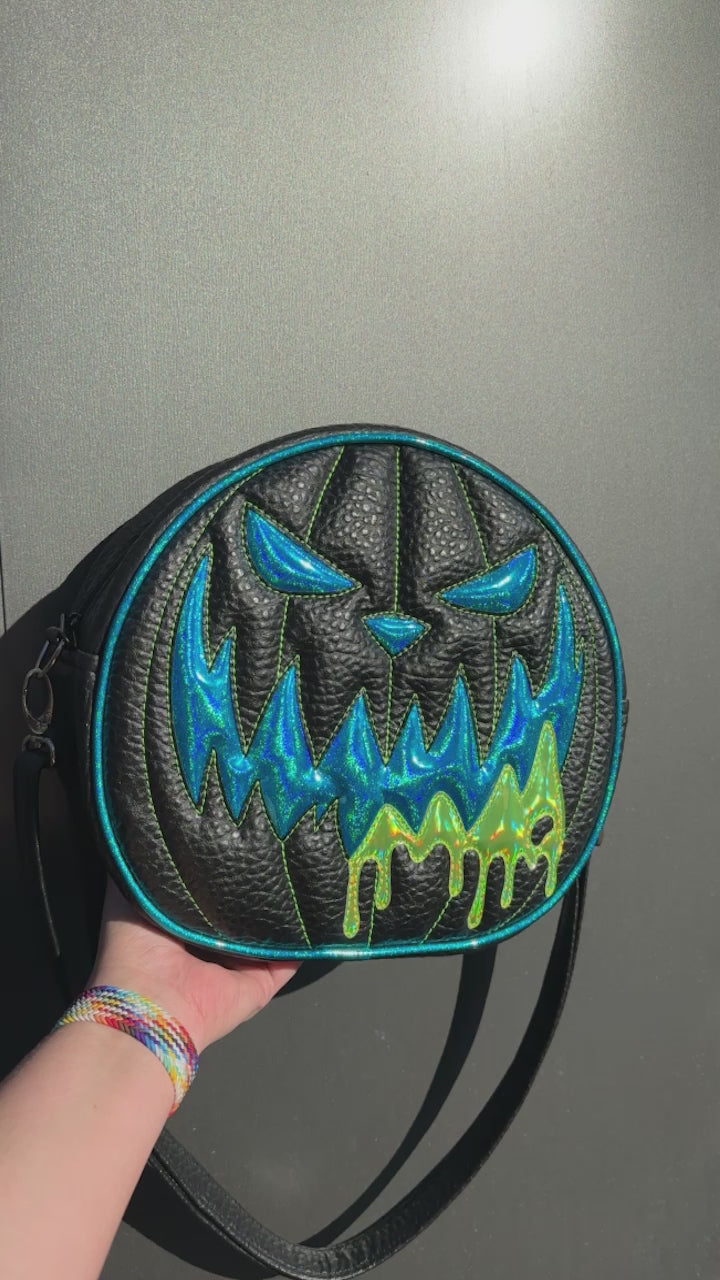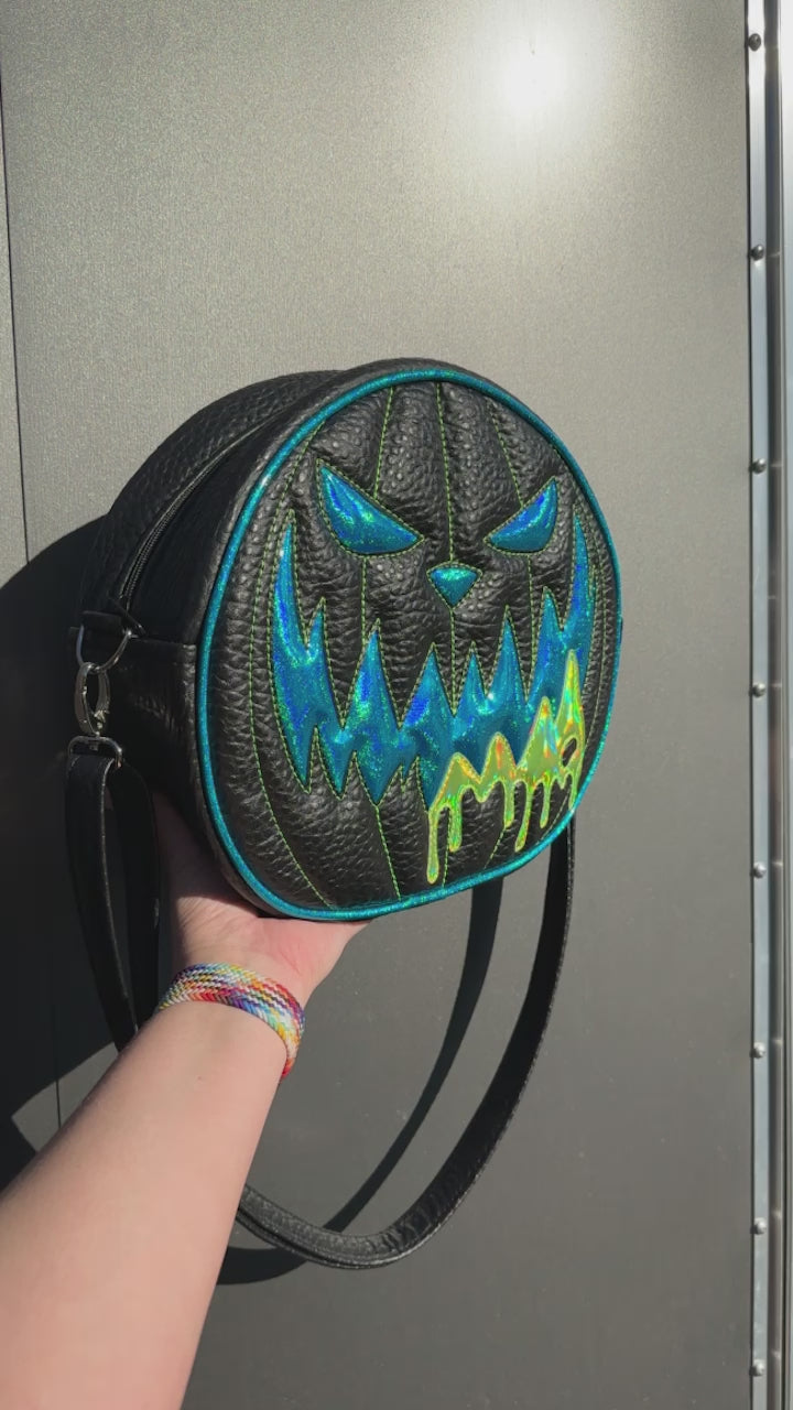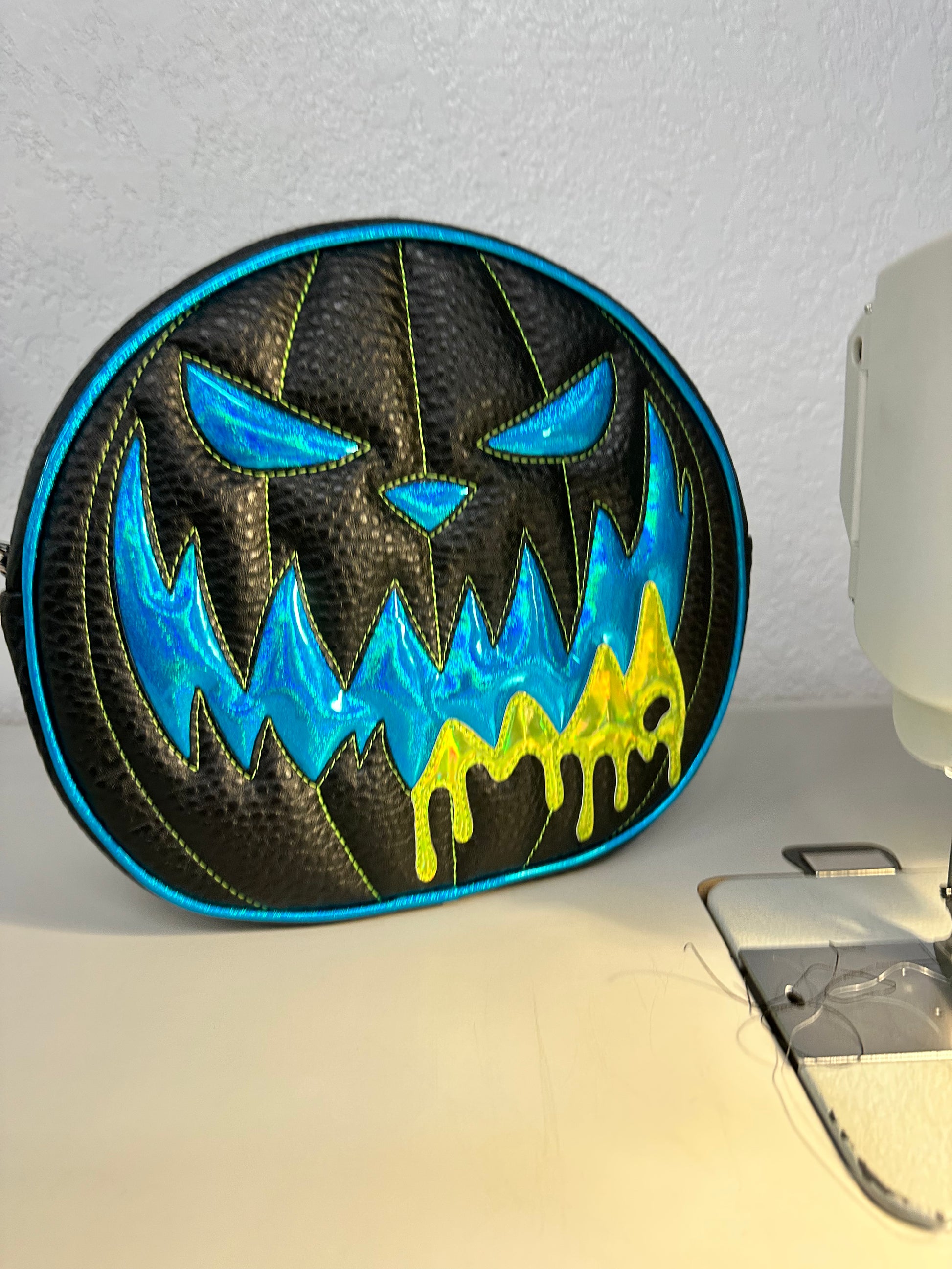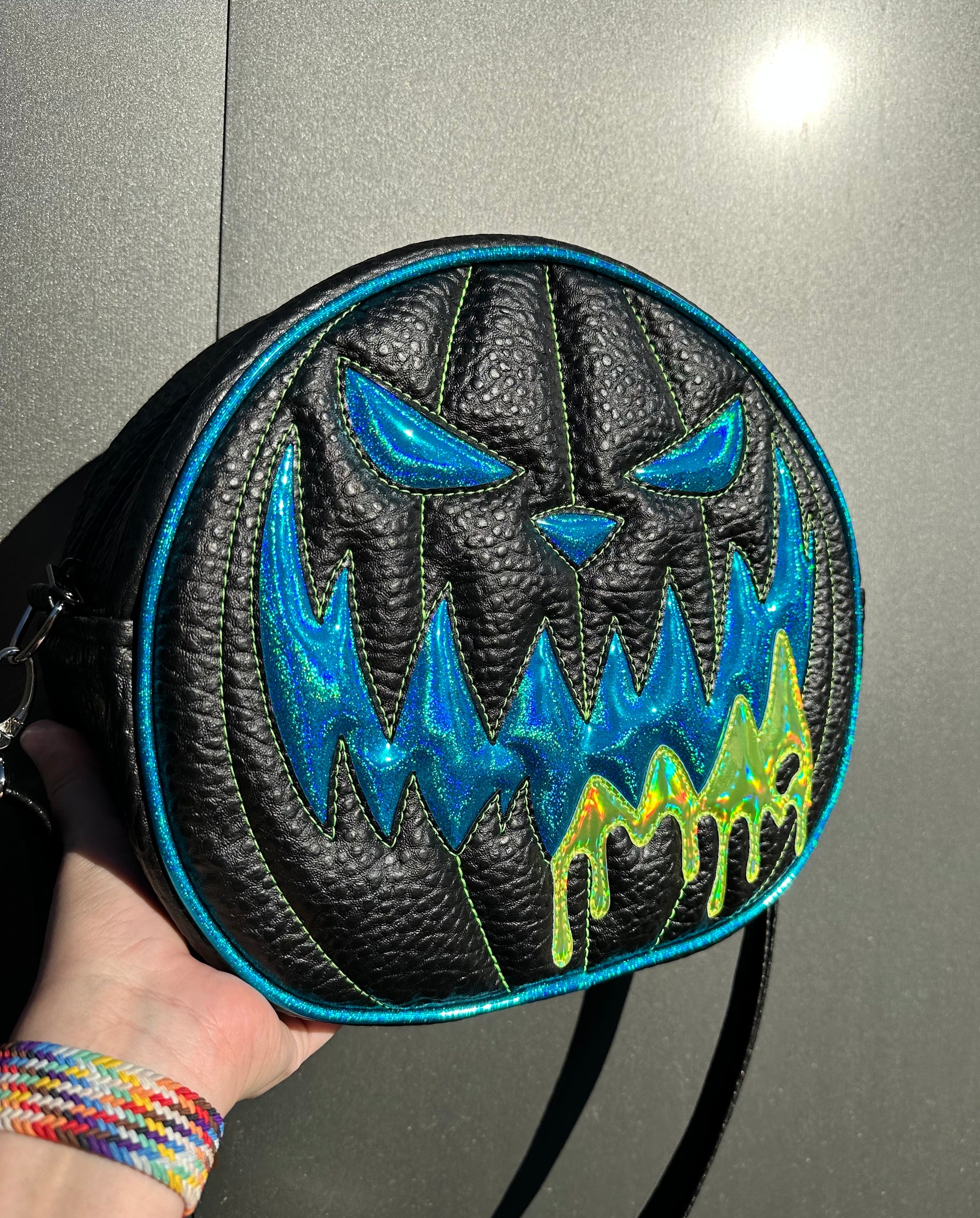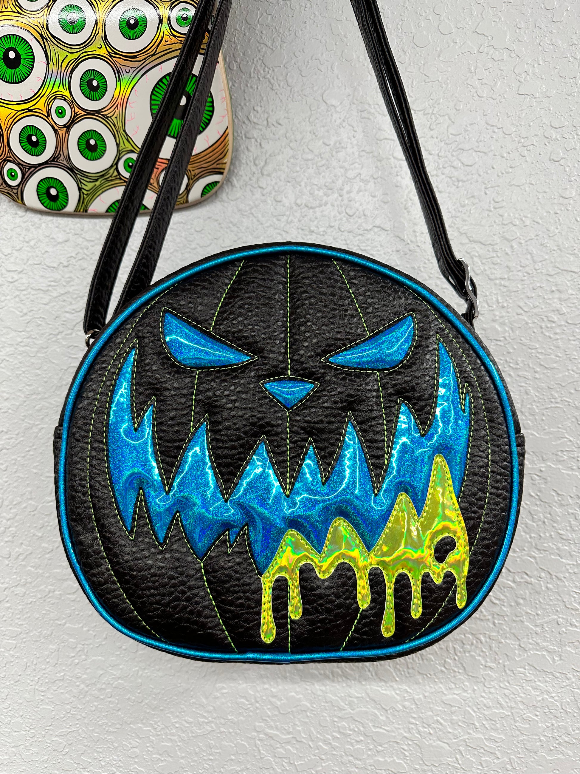 This bloody mean face cruiser bag is finished in black Boca vinyl with accents in turquoise glitter holo vinyl and lime holo ooze dripping from its creepy mouth. We paired this with lime thread for all the stitching. This comes with our adjustable shoulder/crossbody strap. It has one outside slip pocket and two inside slip pockets. The bag is lined in a black, padded nylon fabric.