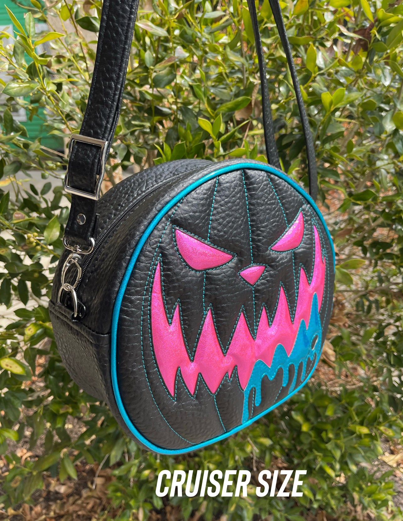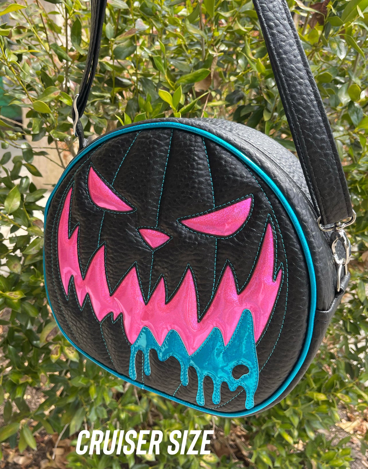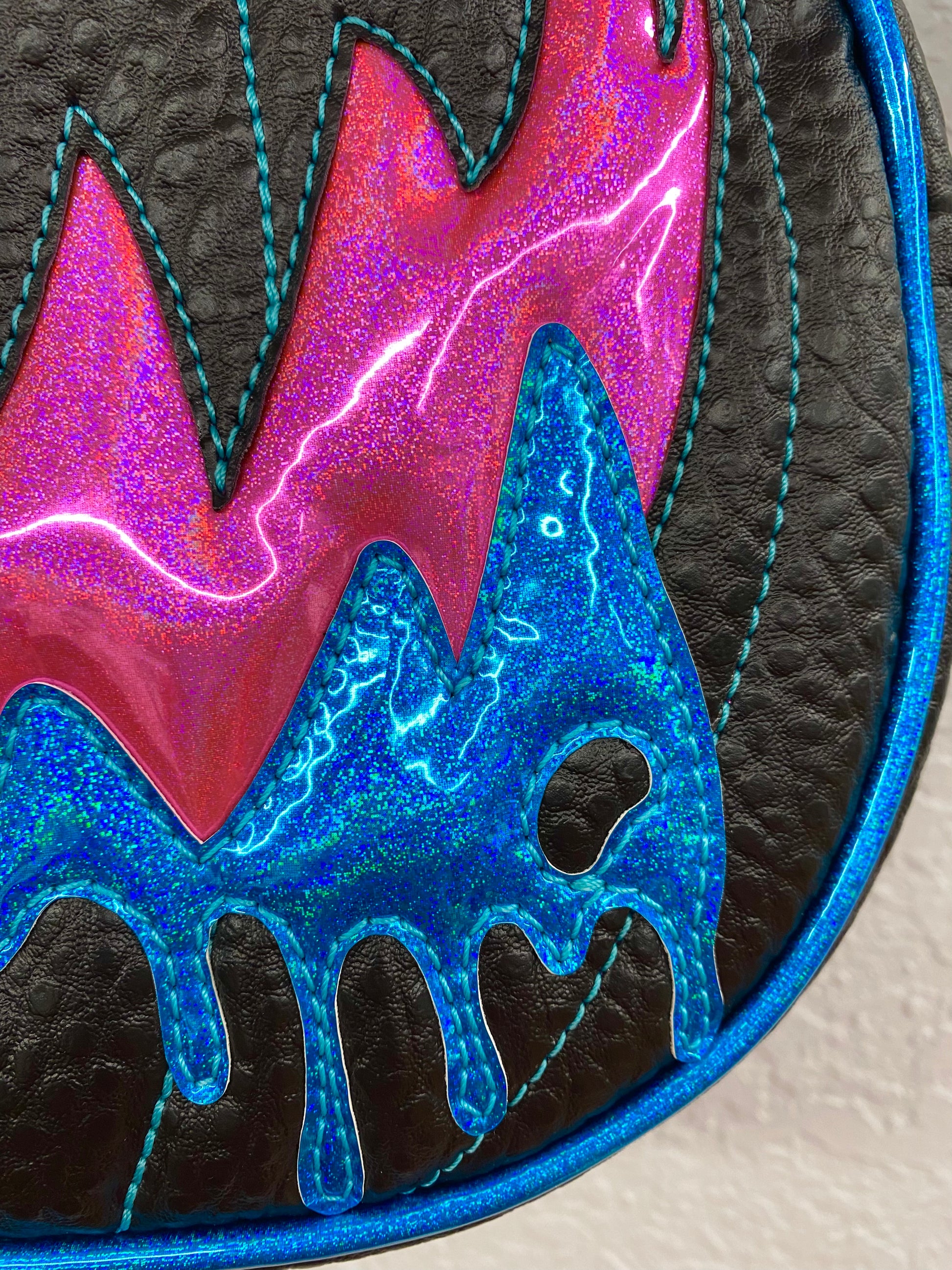 This bloody mean face cruiser bag is finished in black Boca vinyl with accents in neon pink holo glitter vinyl and turquoise glitter holo ooze dripping from its creepy mouth. We paired this with turquoise thread for all the stitching. This comes with our adjustable shoulder/crossbody strap. It has one outside slip pocket and two inside slip pockets. The bag is lined in a black, padded nylon fabric.