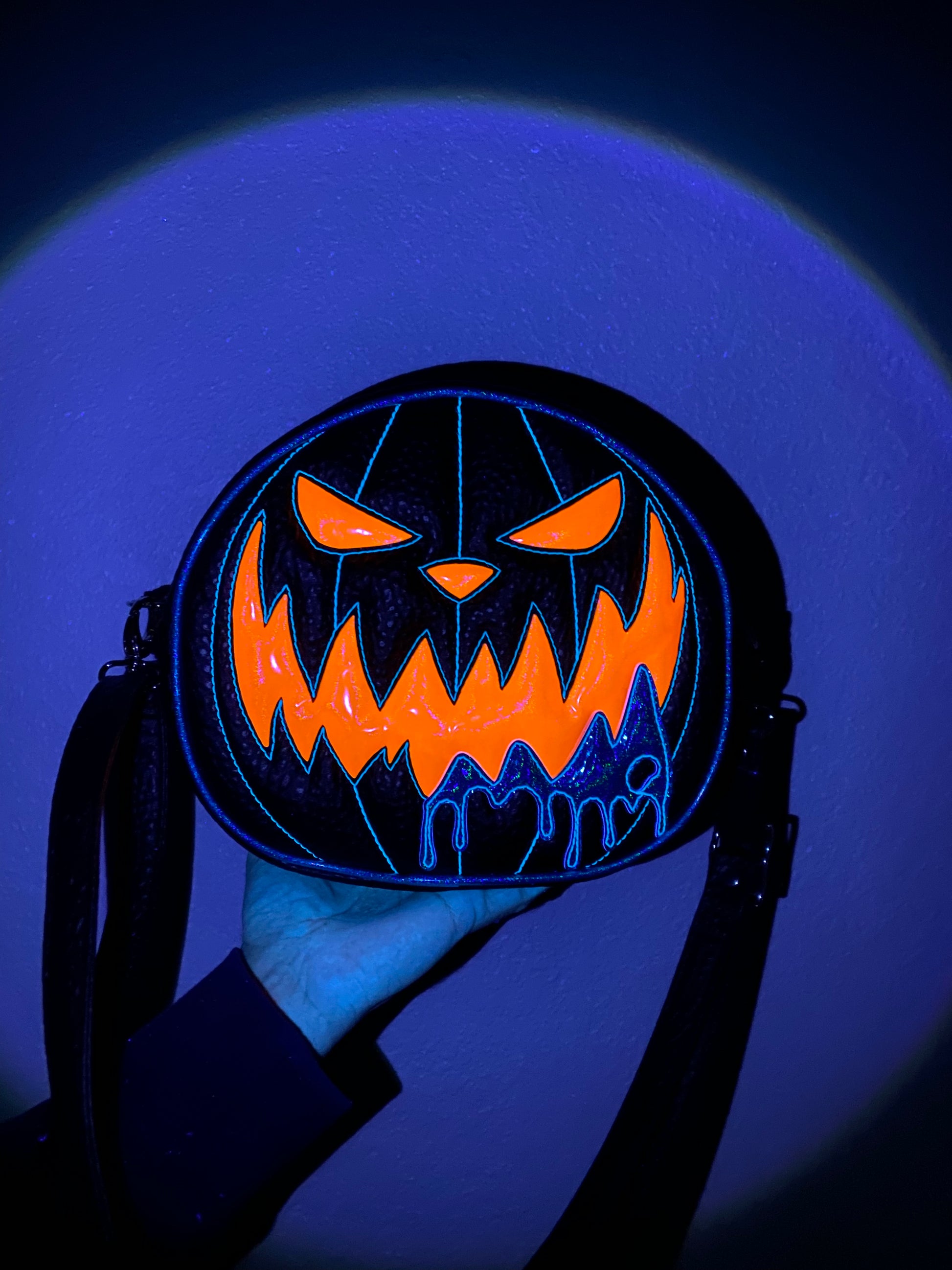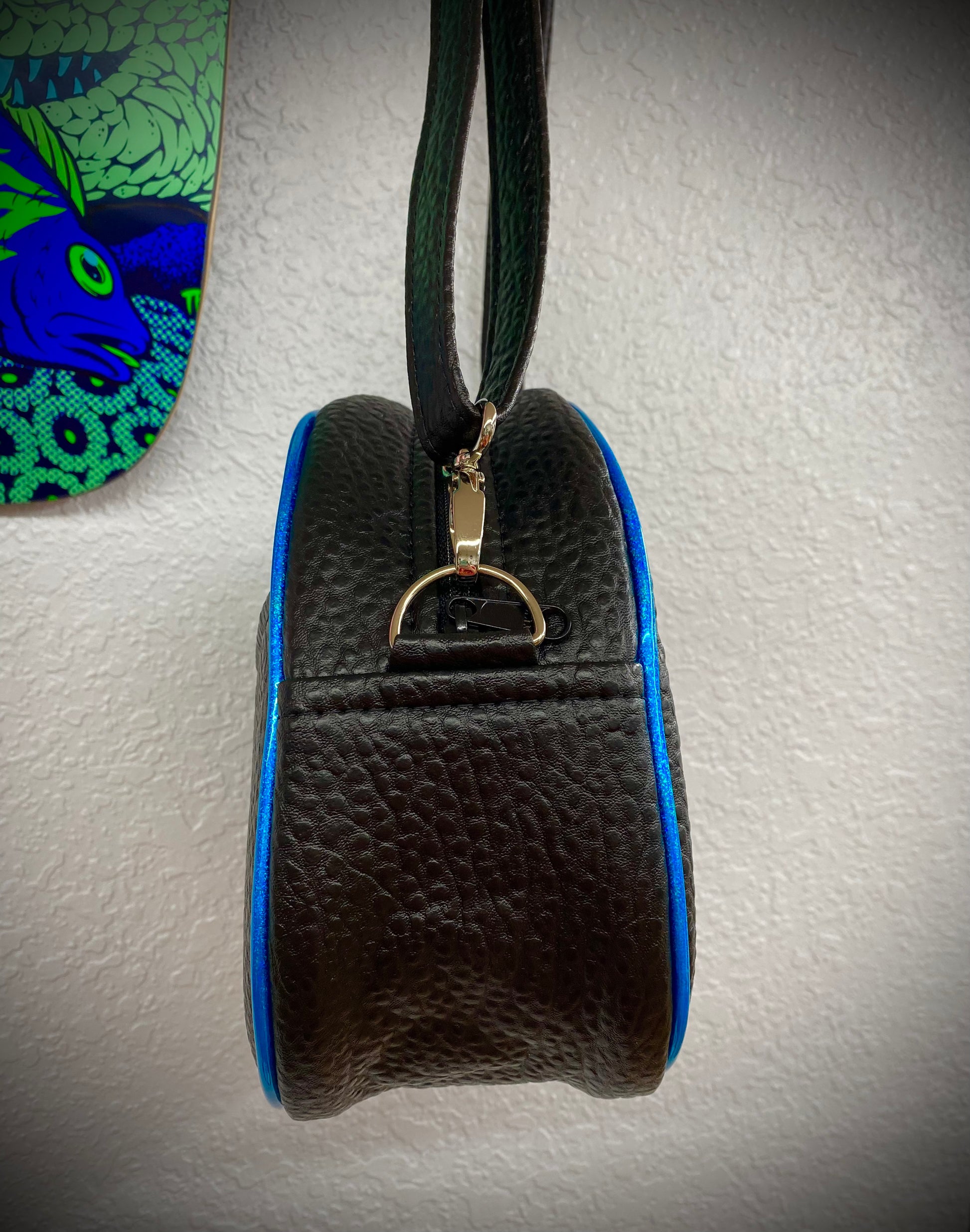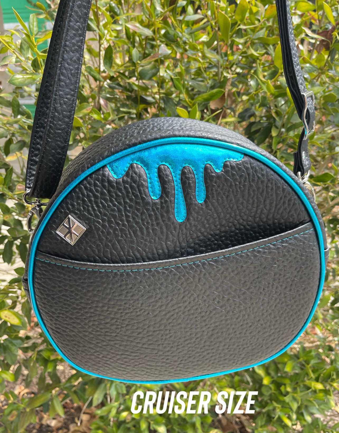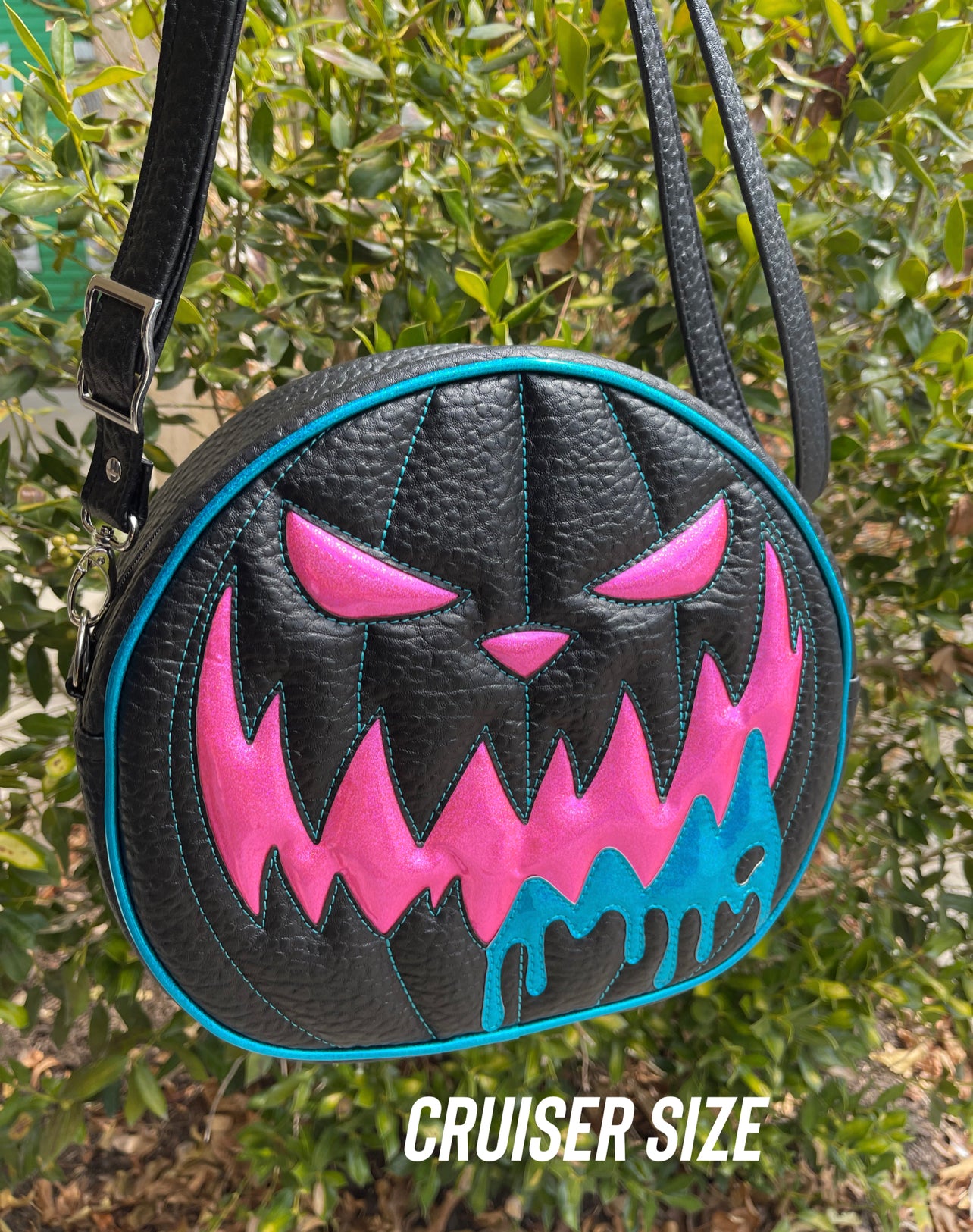 This bloody mean face cruiser bag is finished in black Boca vinyl with accents in neon pink holo glitter vinyl and turquoise glitter holo ooze dripping from its creepy mouth. We paired this with turquoise thread for all the stitching. This comes with our adjustable shoulder/crossbody strap. It has one outside slip pocket and two inside slip pockets. The bag is lined in a black, padded nylon fabric.