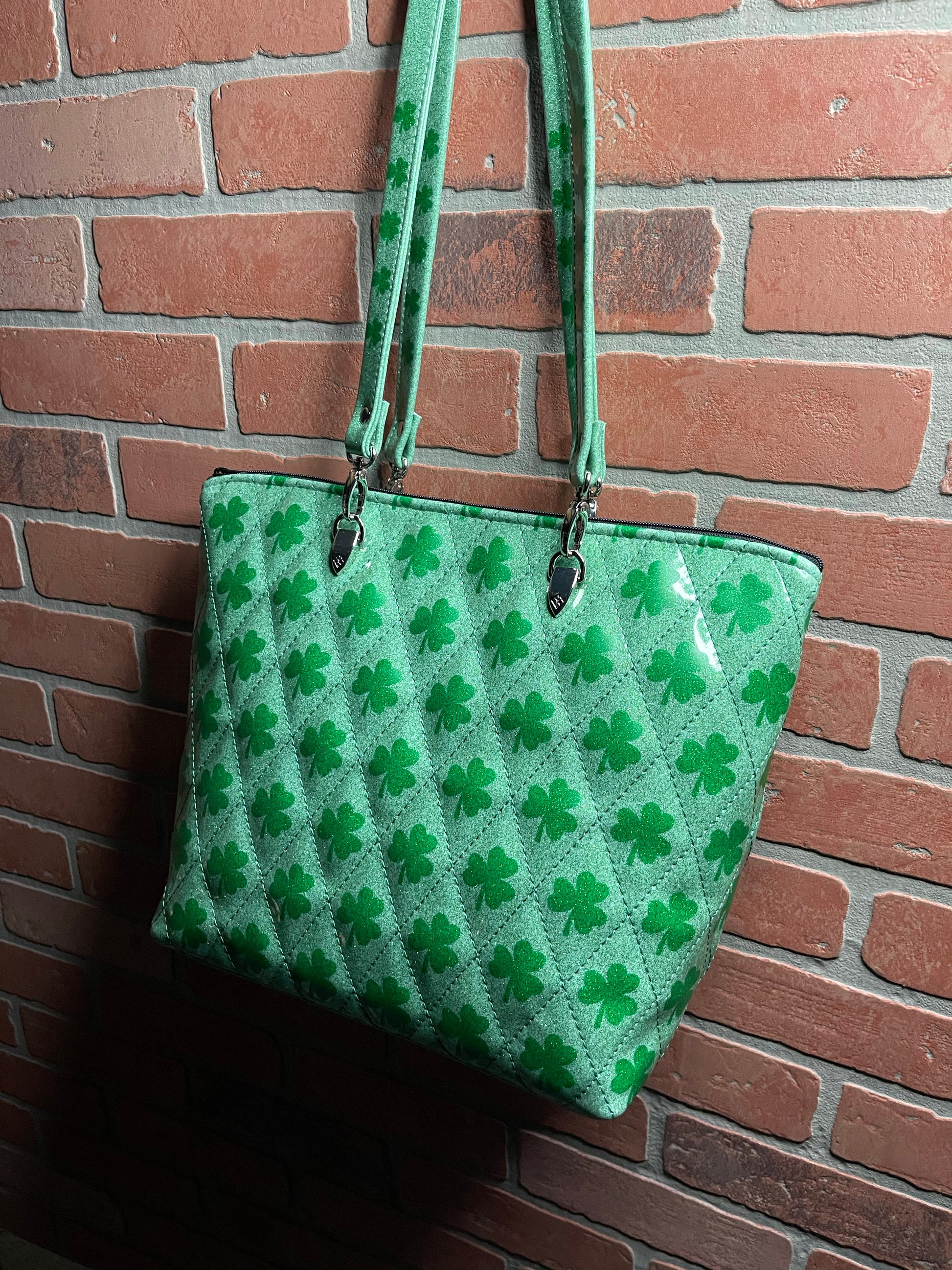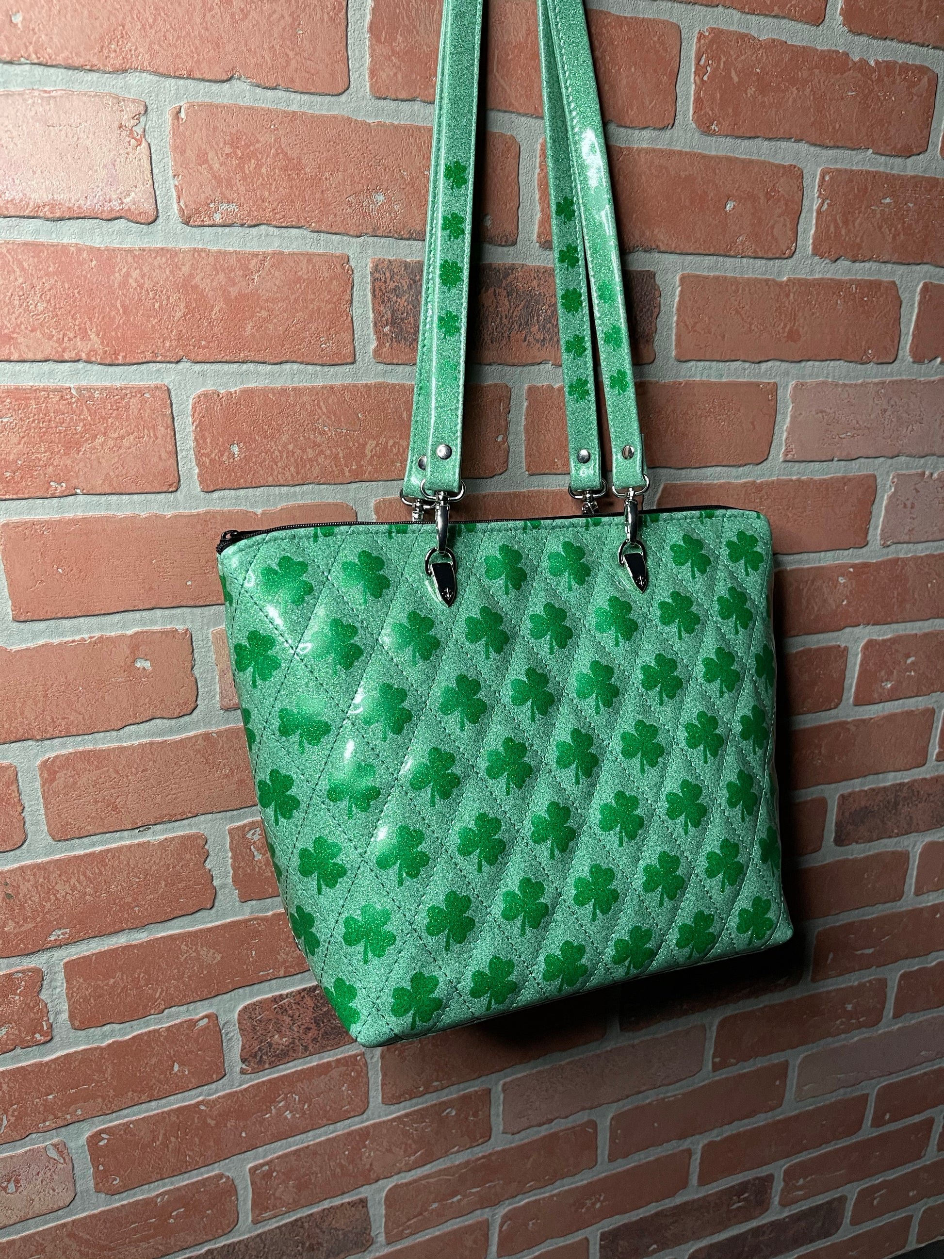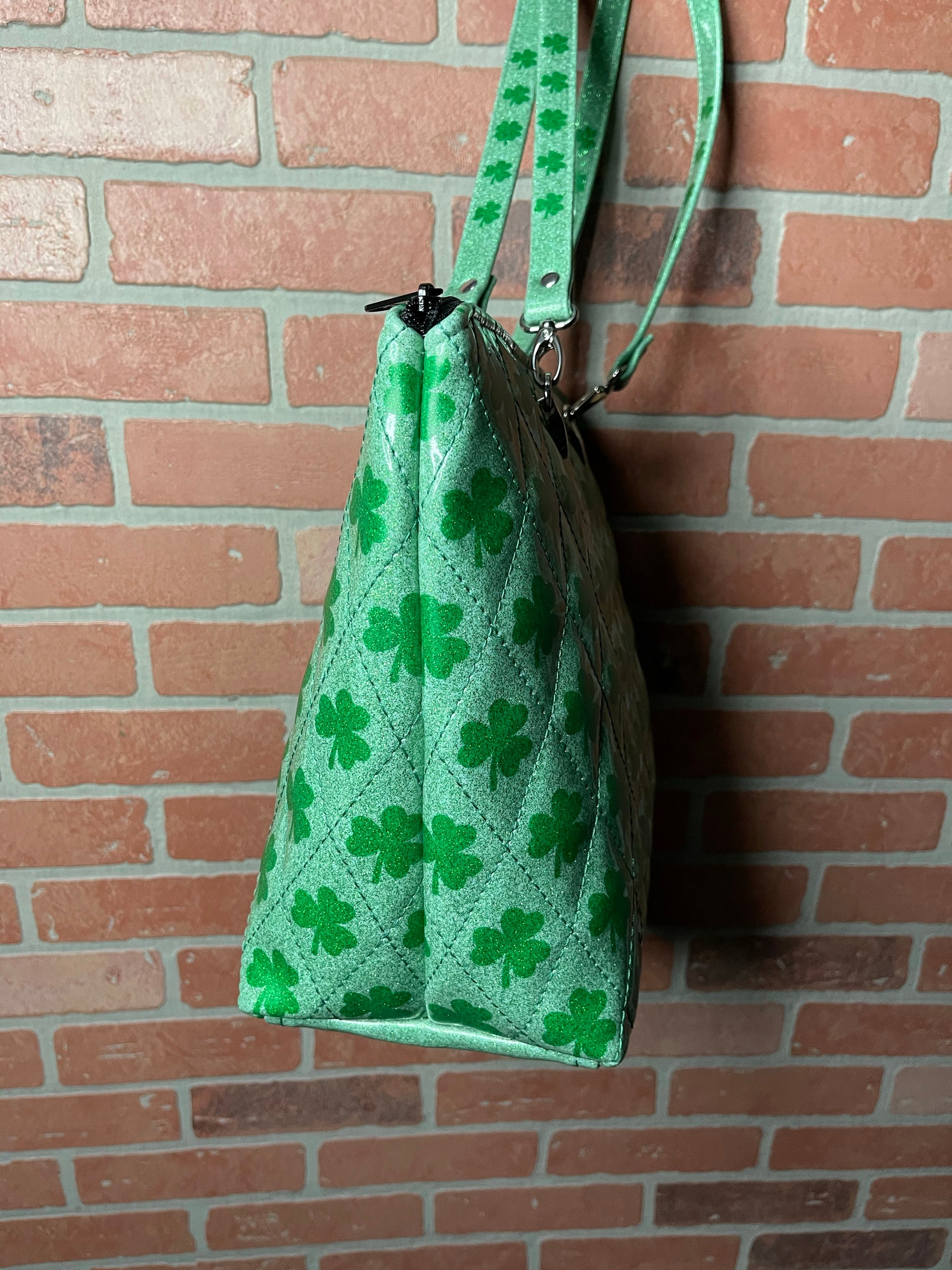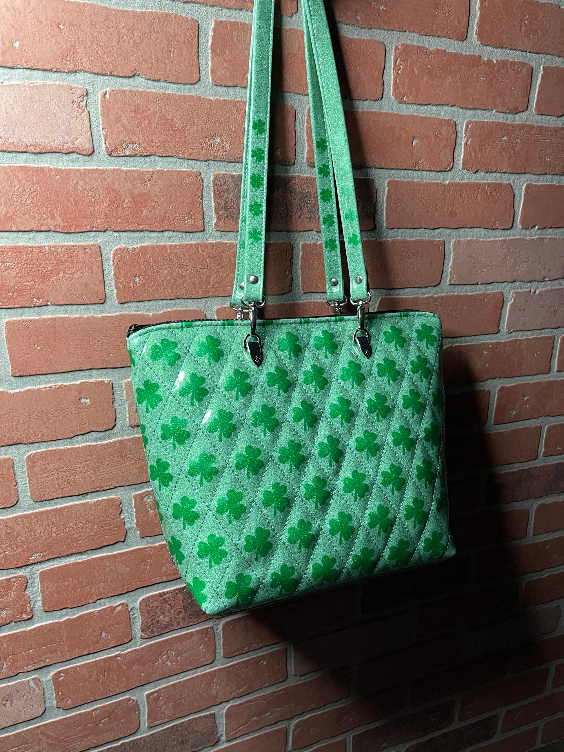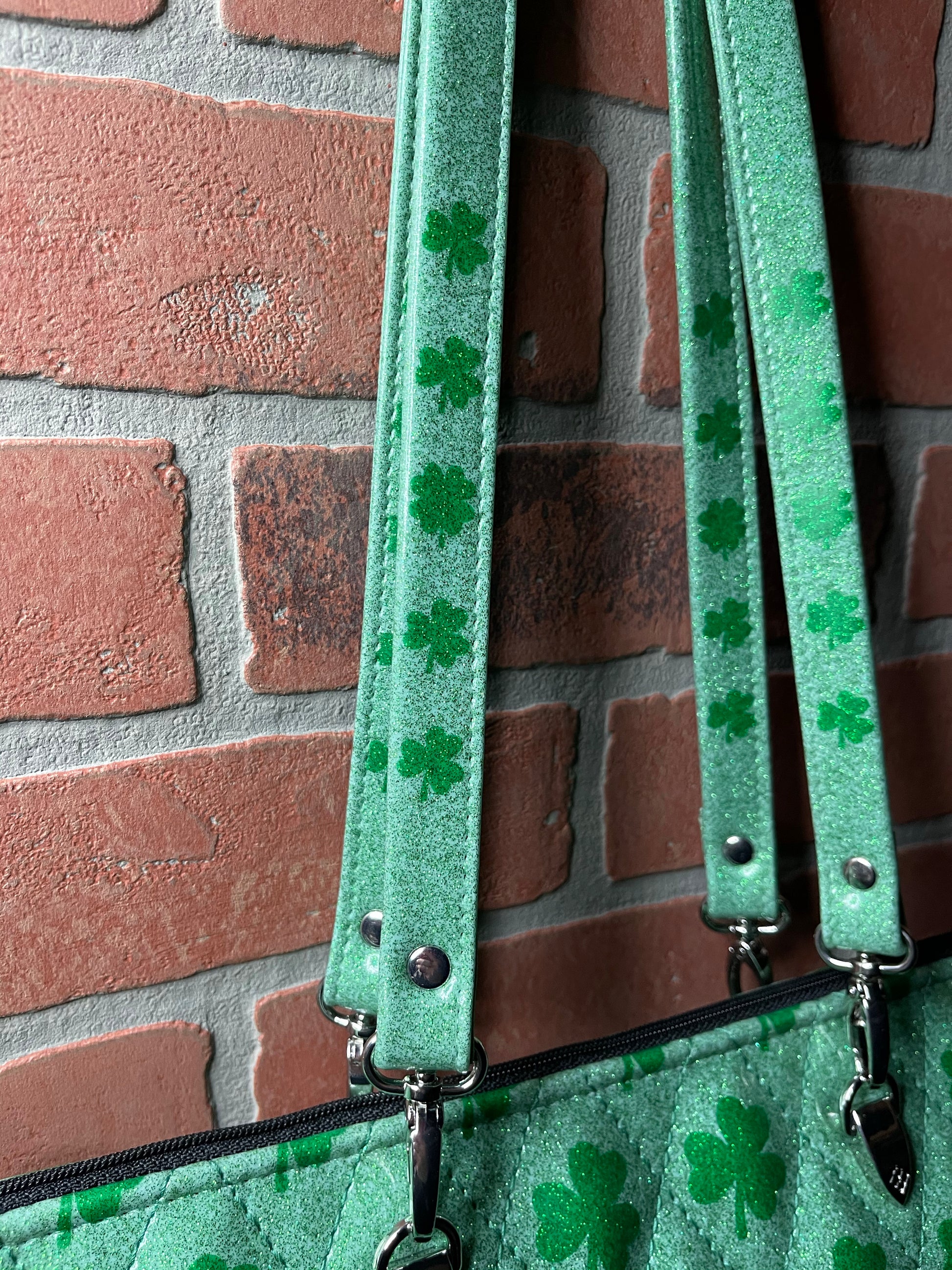 This tote bag features a repeating shamrock pattern, and green diamond stitching! Both sides of this tote bag are the same, and they feature our custom, logo hardware. The matching mint glitter vinyl straps, which also have a few shamrocks on them, give the tote bag a 12"-13" drop. Lined in a durable, padded black cloth. No pockets.
