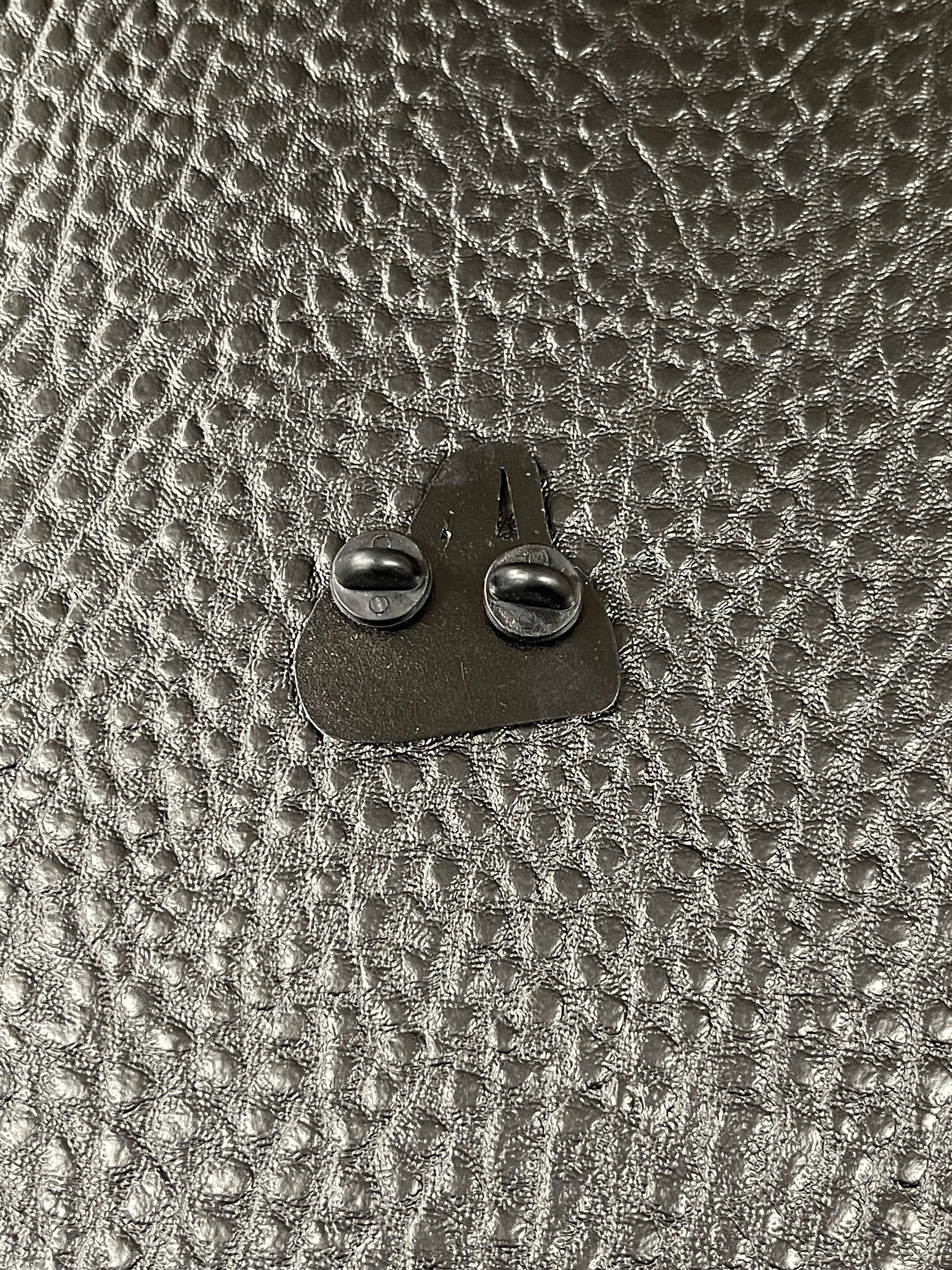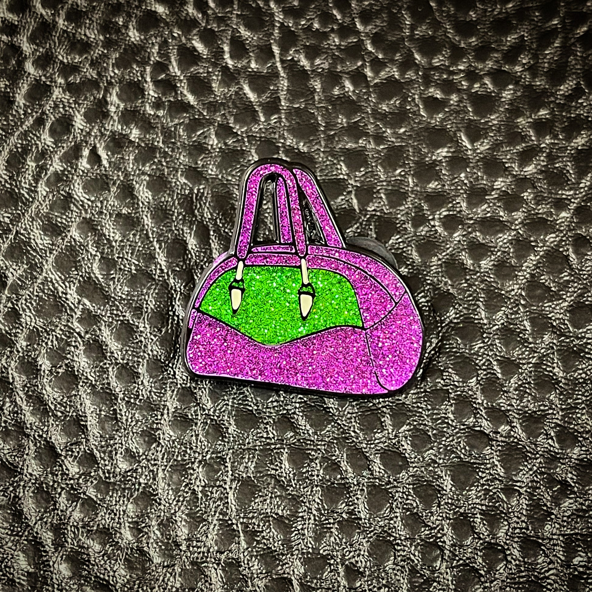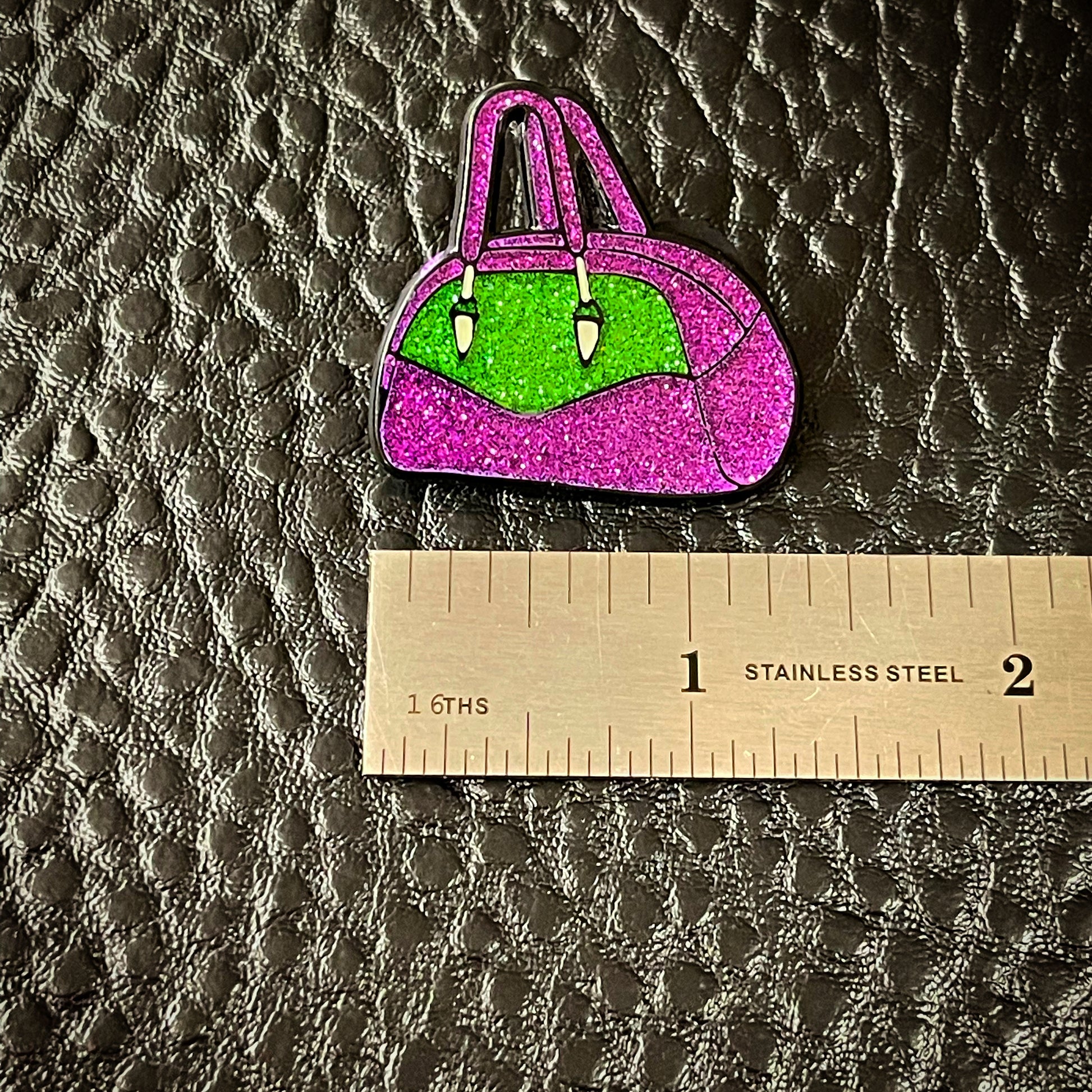 We had these little lapel pins custom made using the shape of our Minx bags! The pins have a black metal base, with two pins on the backside so they wont spin, and the face is finished in purple and lime glitter. These are about 1-3/8" at the widest, and about 1-1/2" at the tallest.