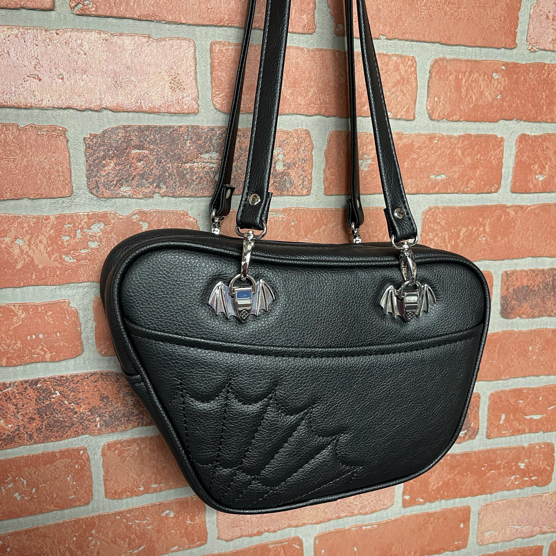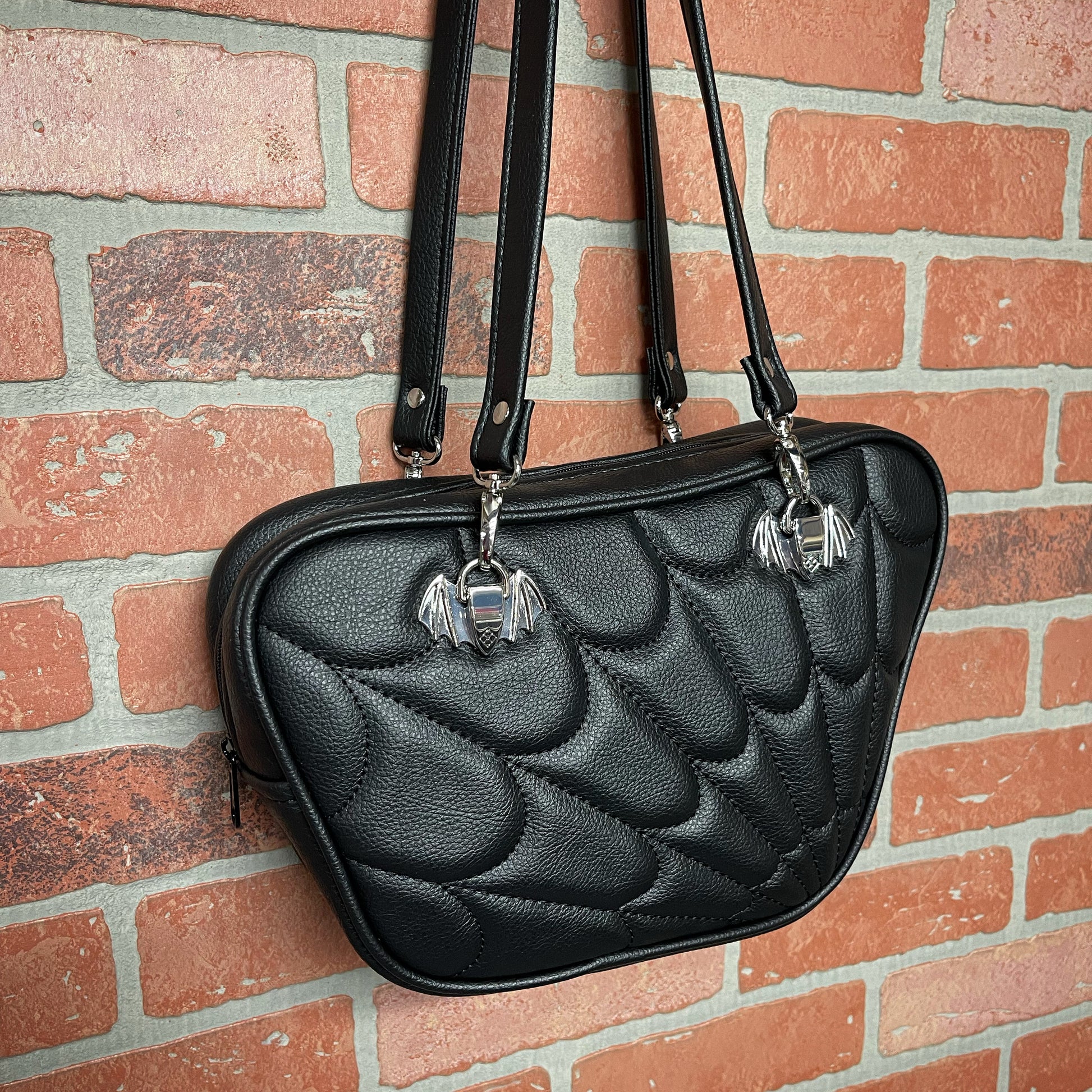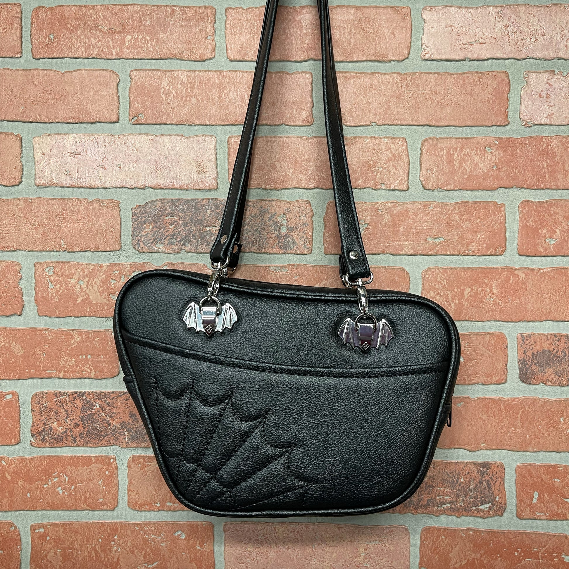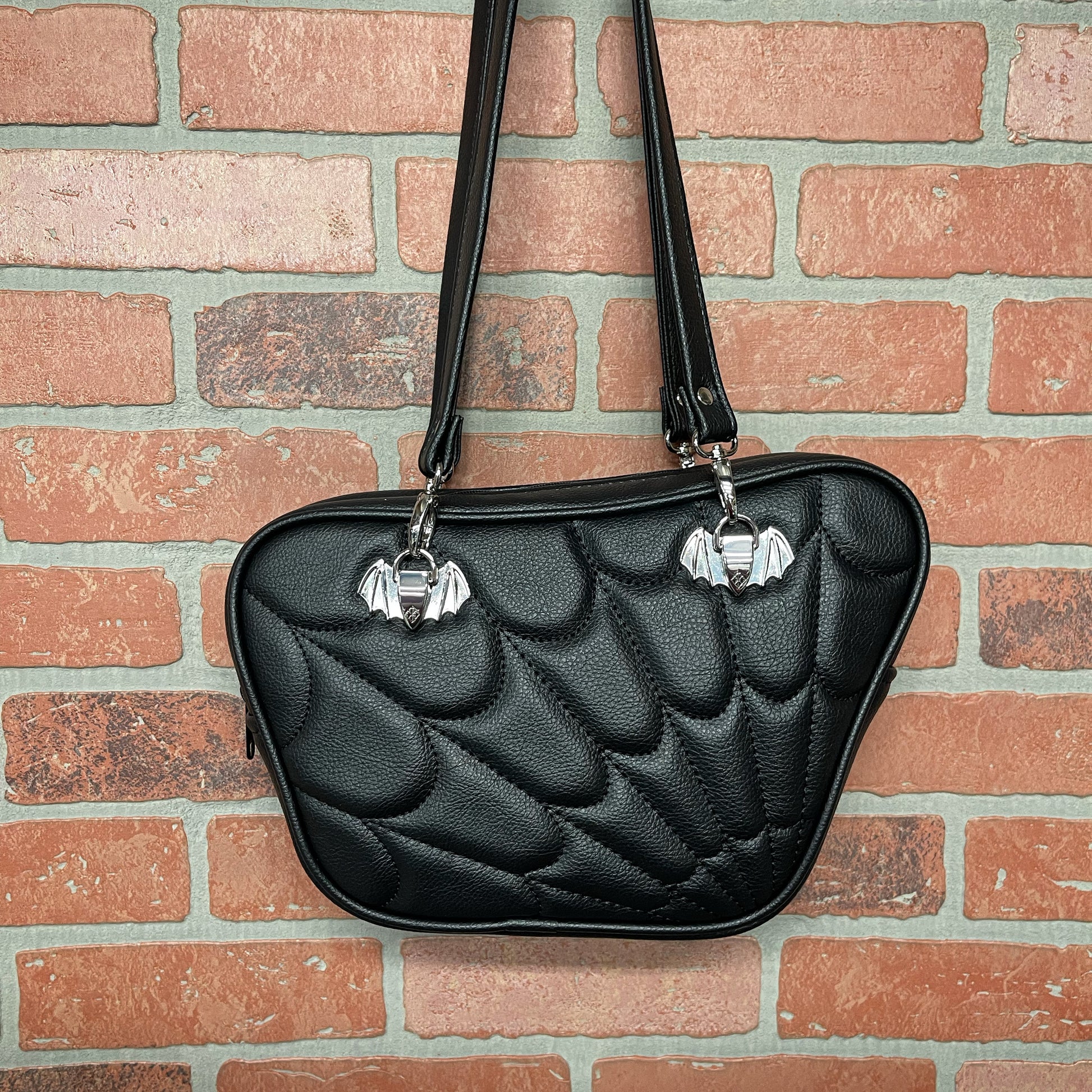 This is one of our Atomic handbags, finished in black symphony vinyl with spider webs stitched in black thread. Our Atomic bags feature our own custom hardware to mount the straps to the sides, and this one features our new bat wing hardware! Comes with two matching black symphony vinyl straps that give the bag about a 13" drop.