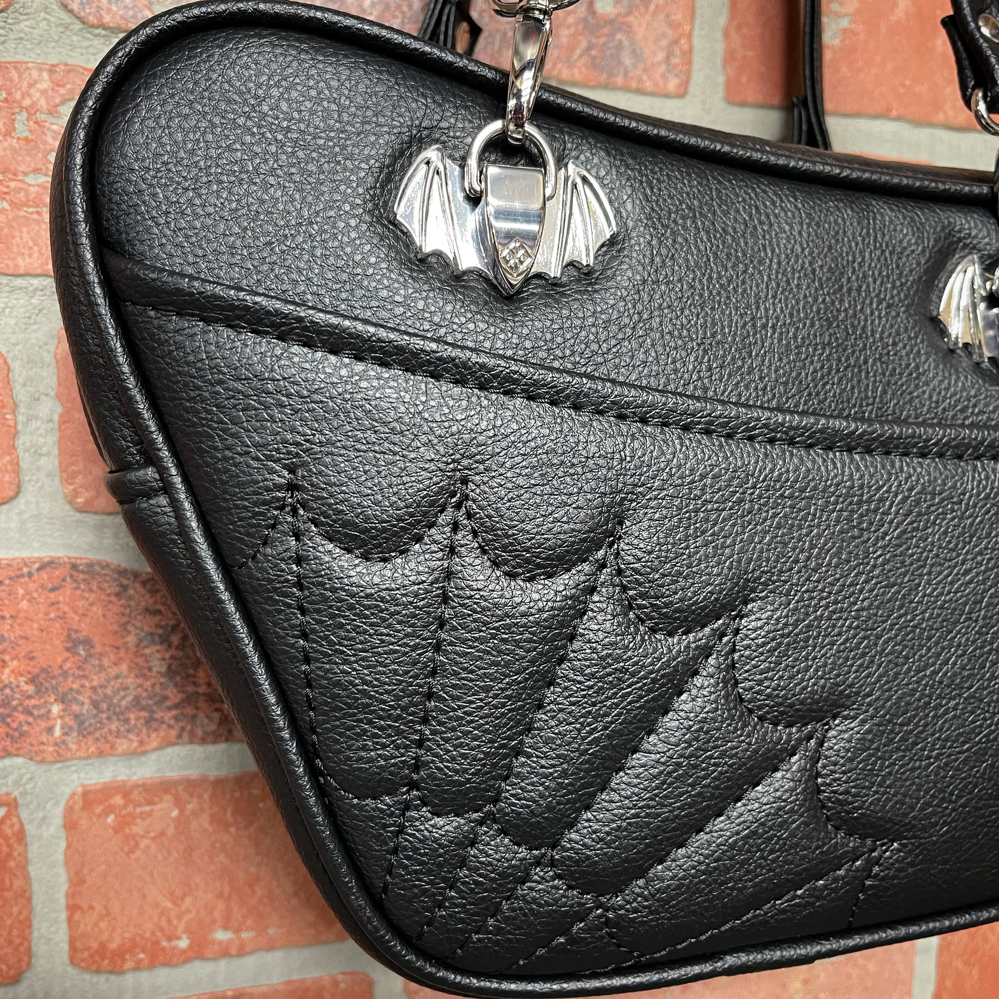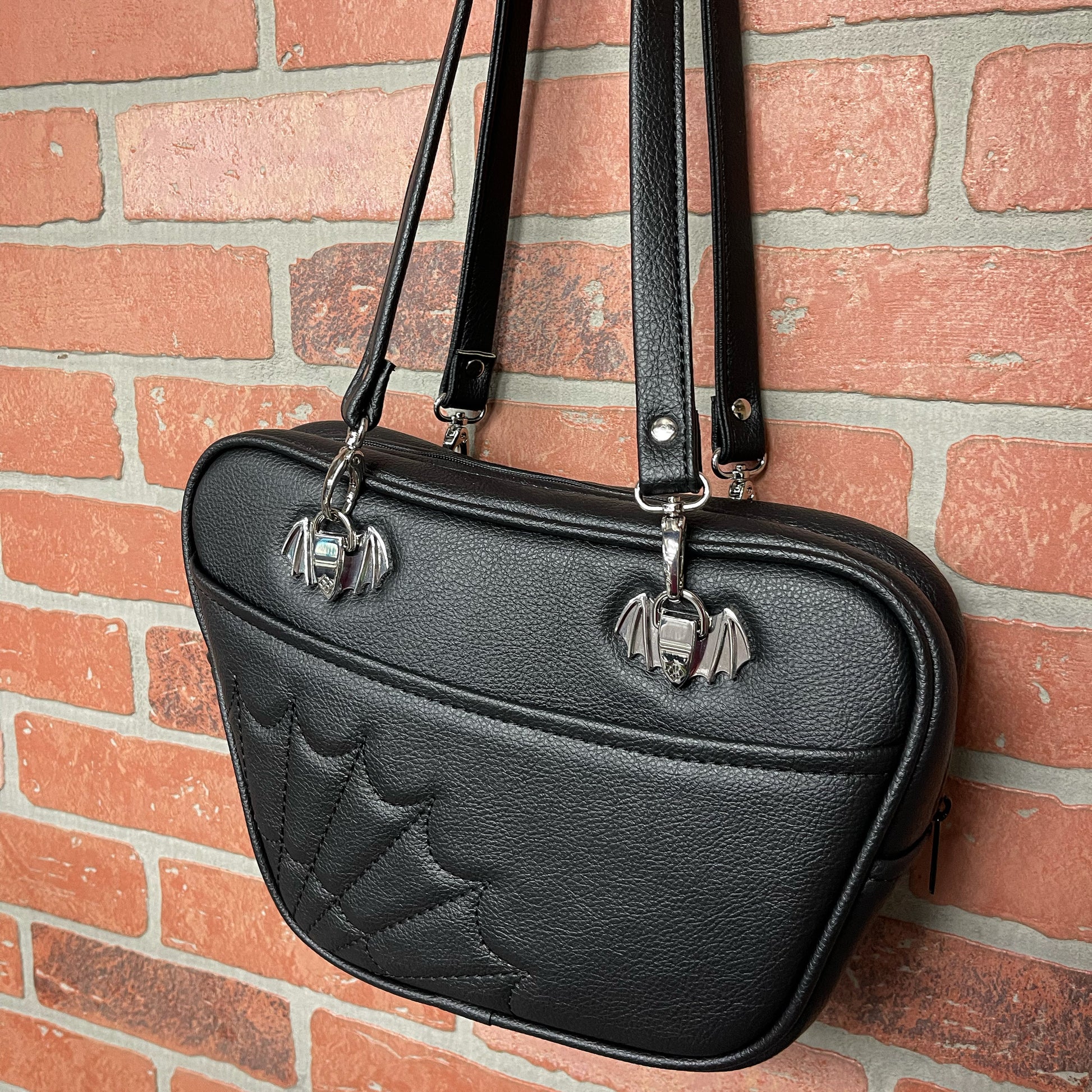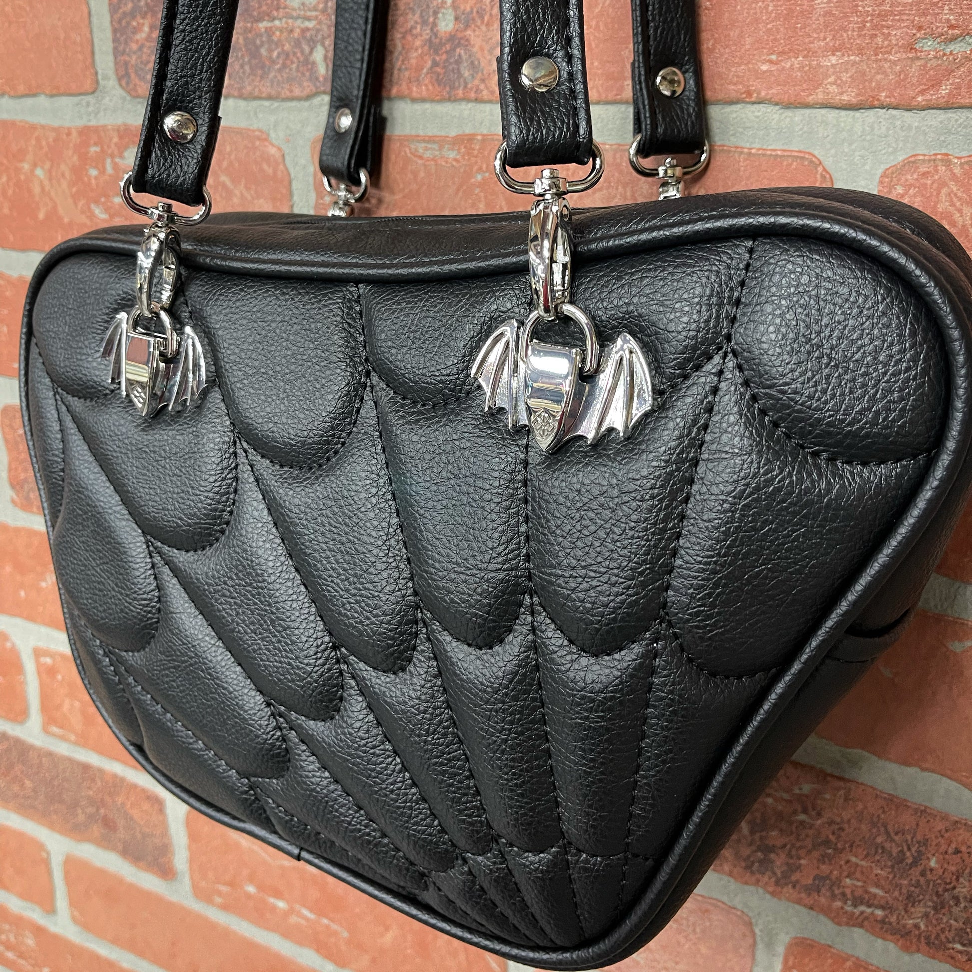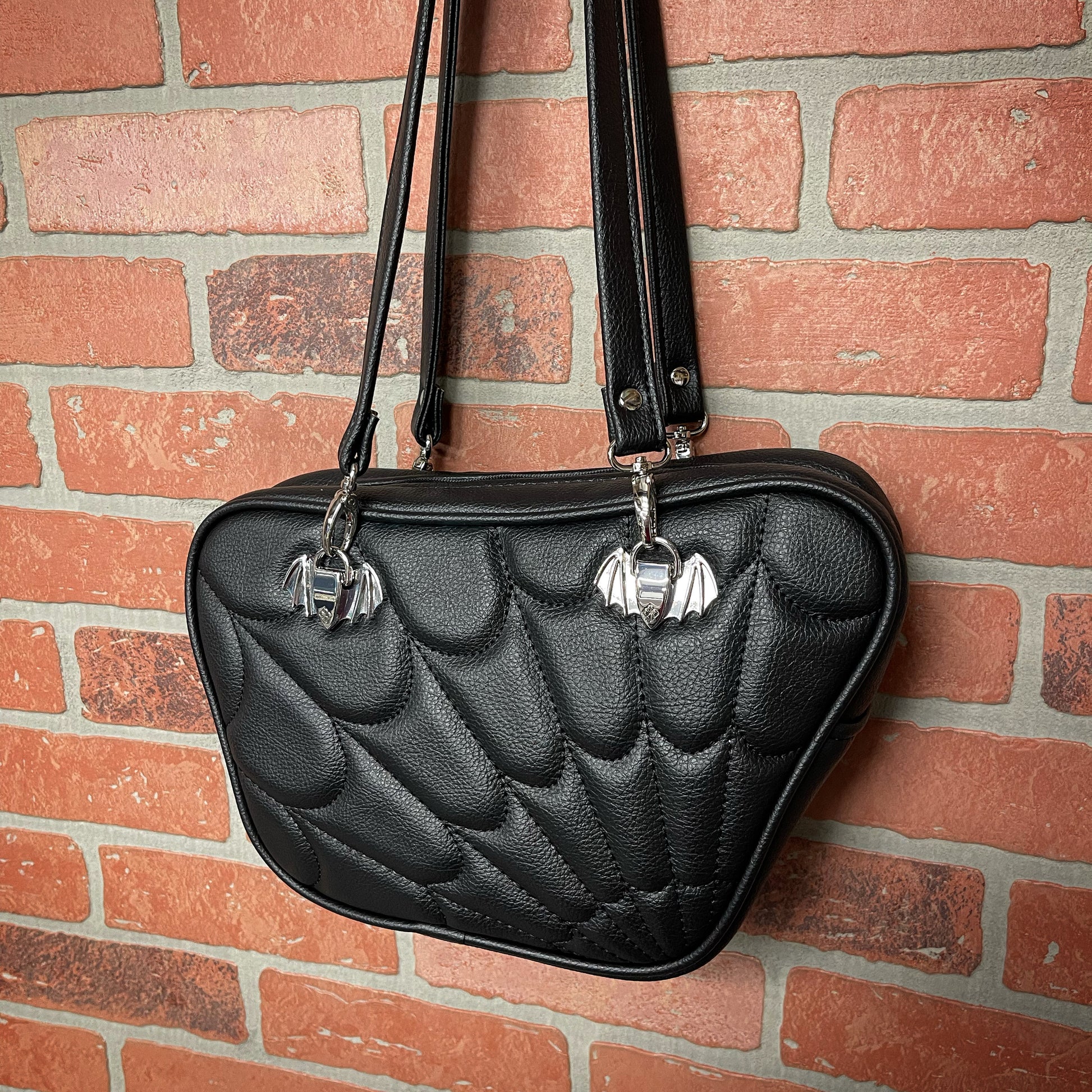 This is one of our Atomic handbags, finished in black symphony vinyl with spider webs stitched in black thread. Our Atomic bags feature our own custom hardware to mount the straps to the sides, and this one features our new bat wing hardware! Comes with two matching black symphony vinyl straps that give the bag about a 13" drop.
