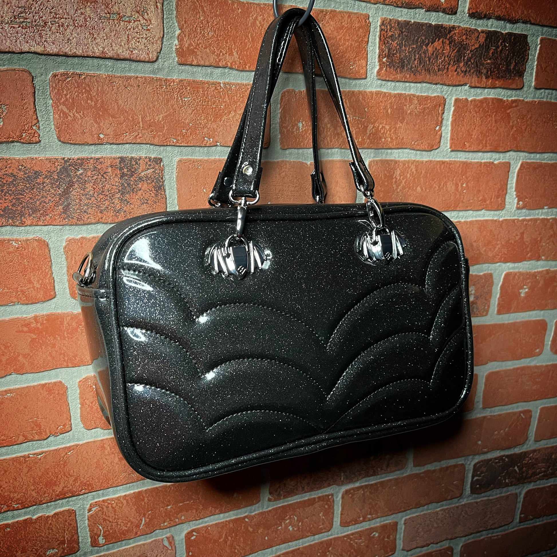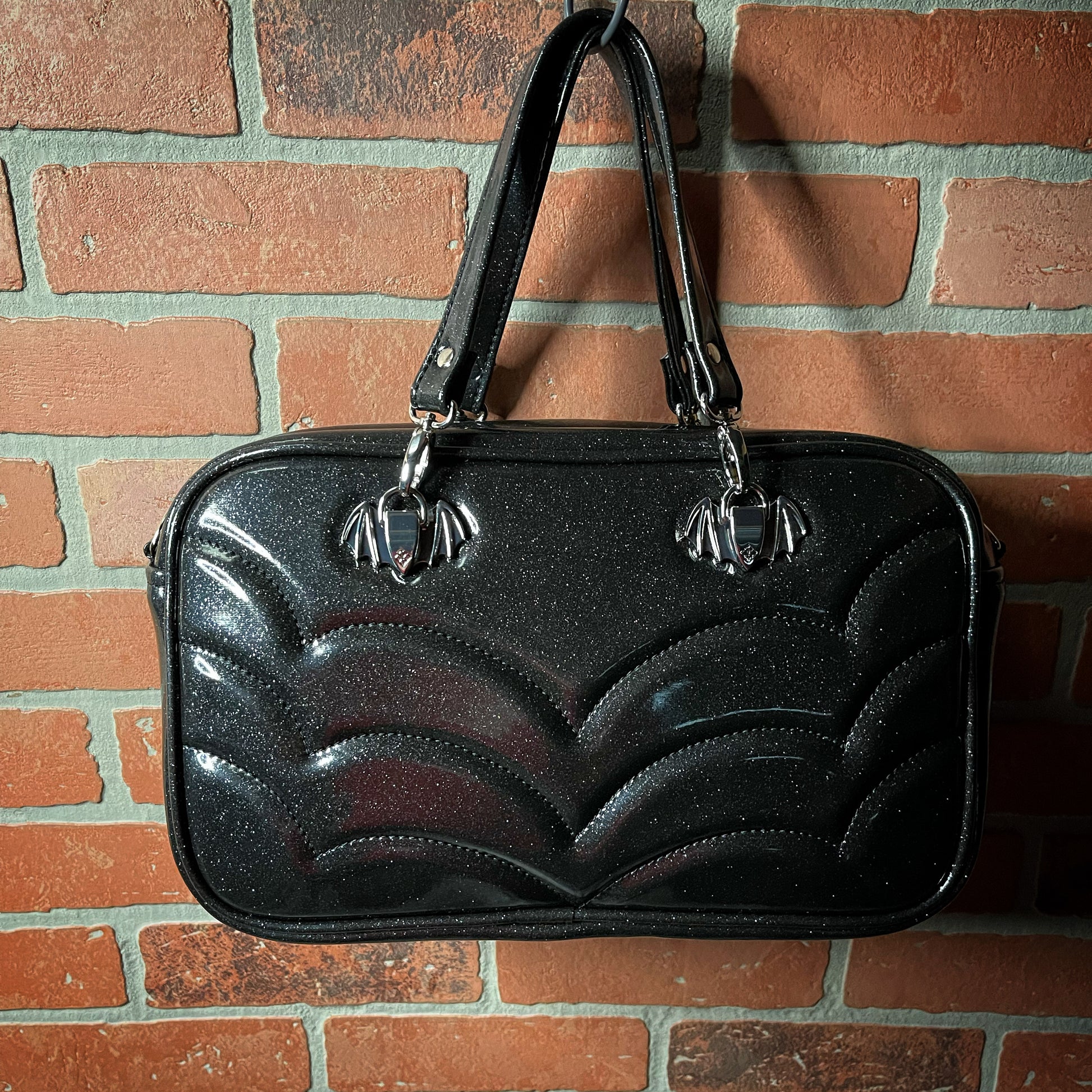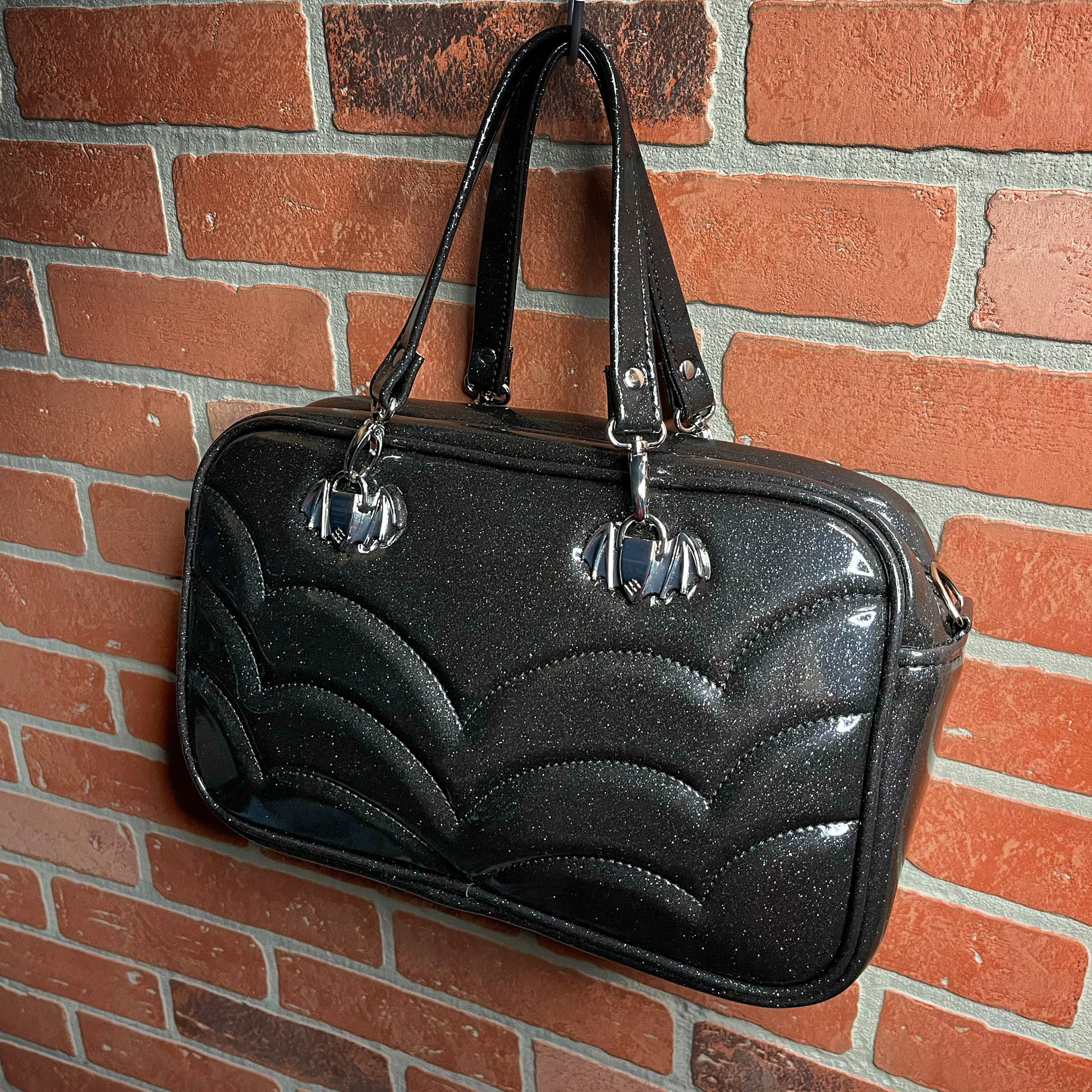 This Boxer bag is finished in black glitter vinyl, and features a stitch pattern that mimics the shape of our bat wing hardware! It is lined in our black foam backed fabric and has 2 interior slip pockets, and one exterior slip pocket. Comes with two hand carry handles and one adjustable shoulder strap.