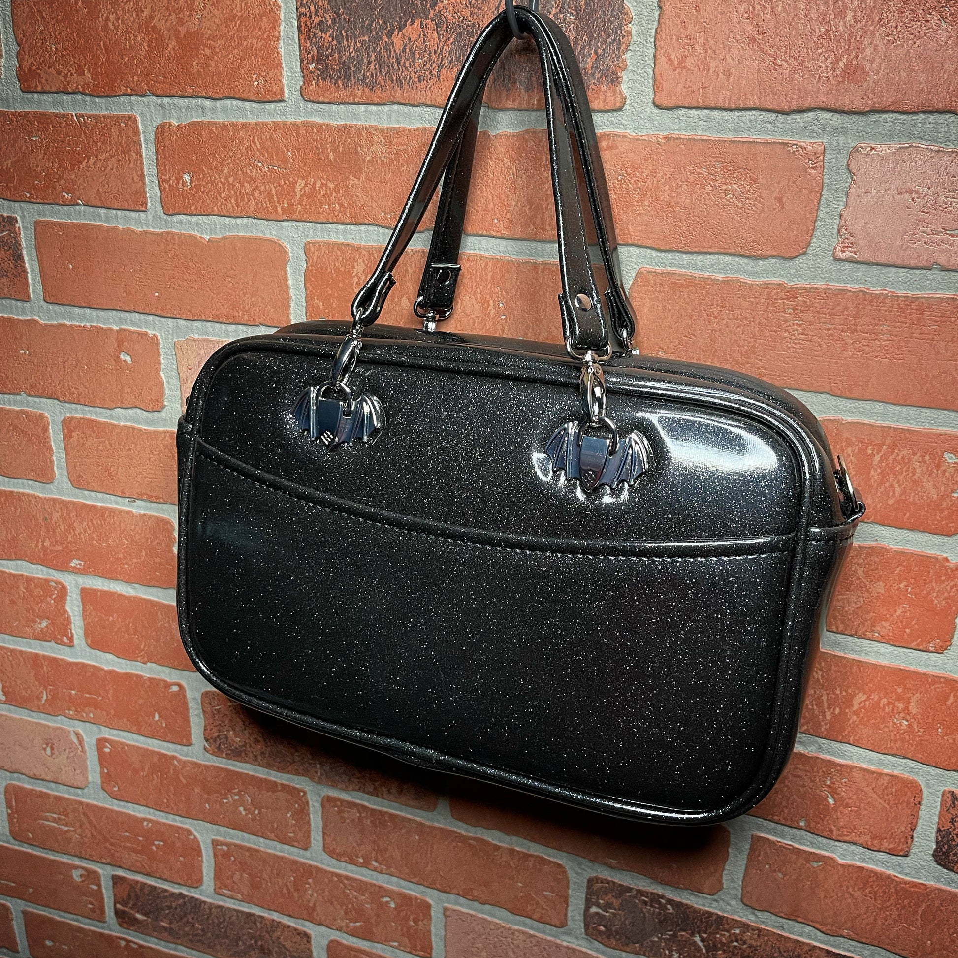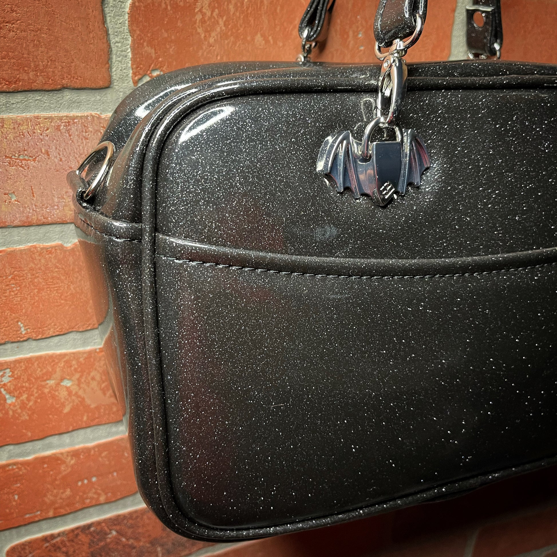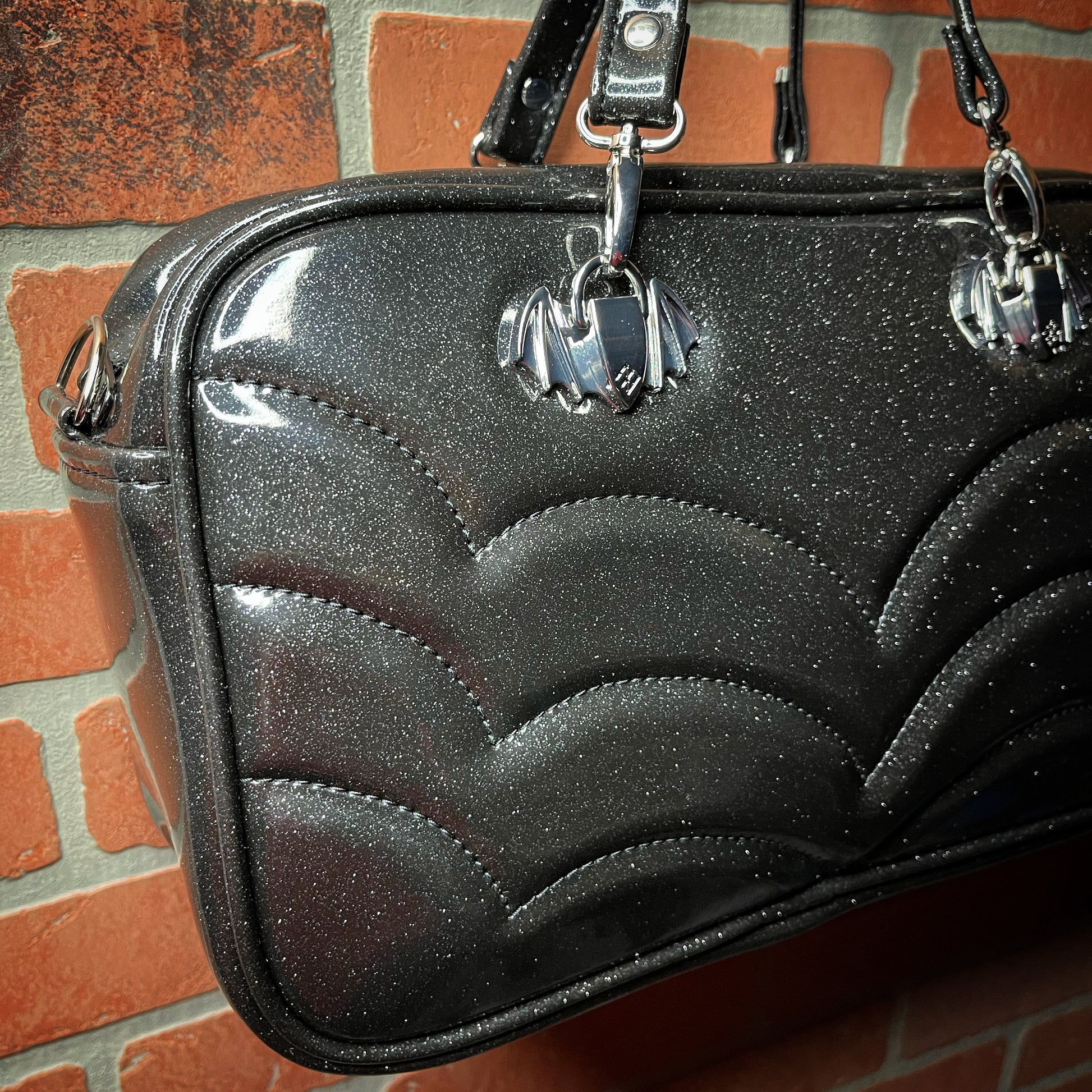 This Boxer bag is finished in black glitter vinyl, and features a stitch pattern that mimics the shape of our bat wing hardware! It is lined in our black foam backed fabric and has 2 interior slip pockets, and one exterior slip pocket. Comes with two hand carry handles and one adjustable shoulder strap.