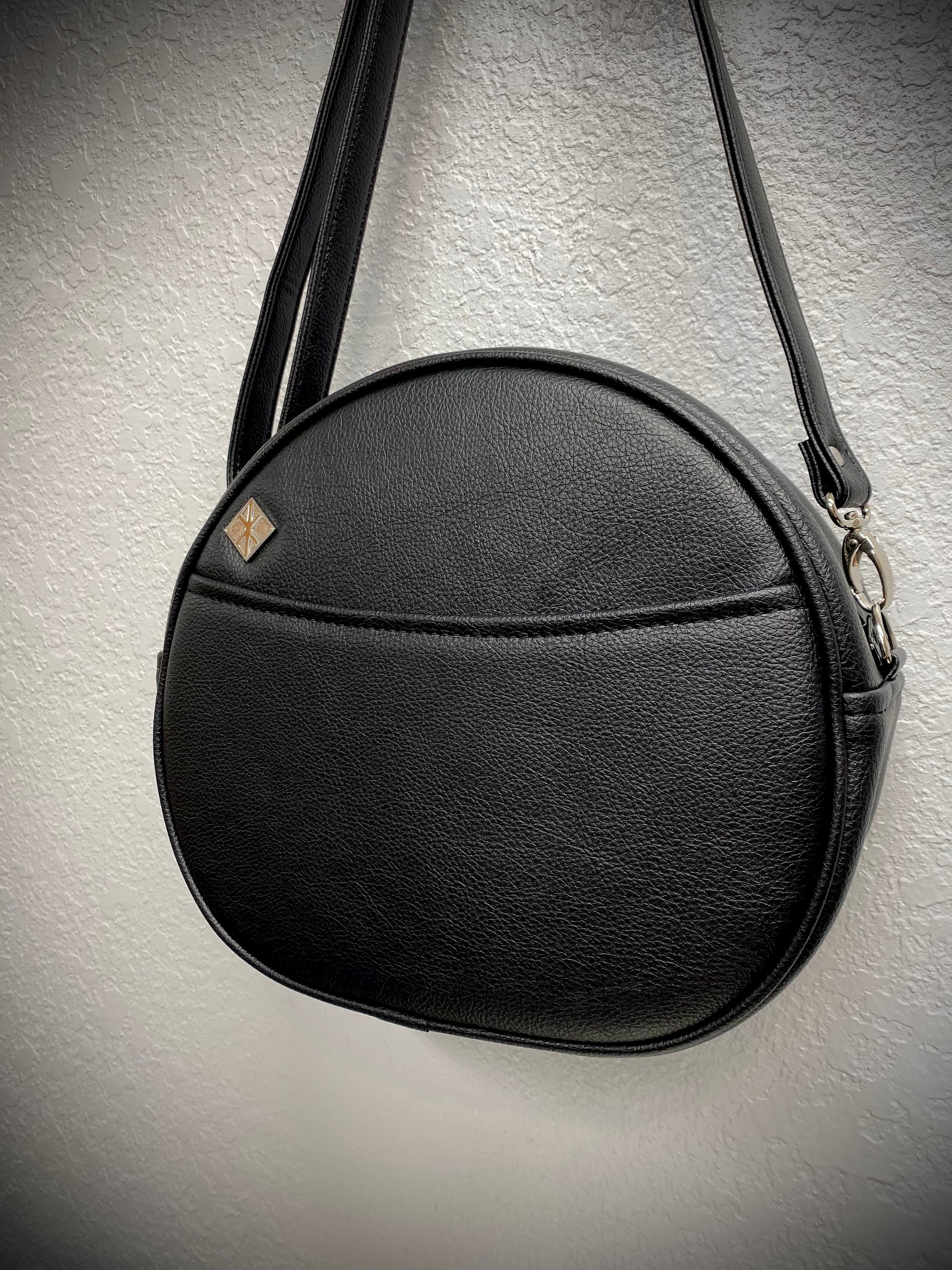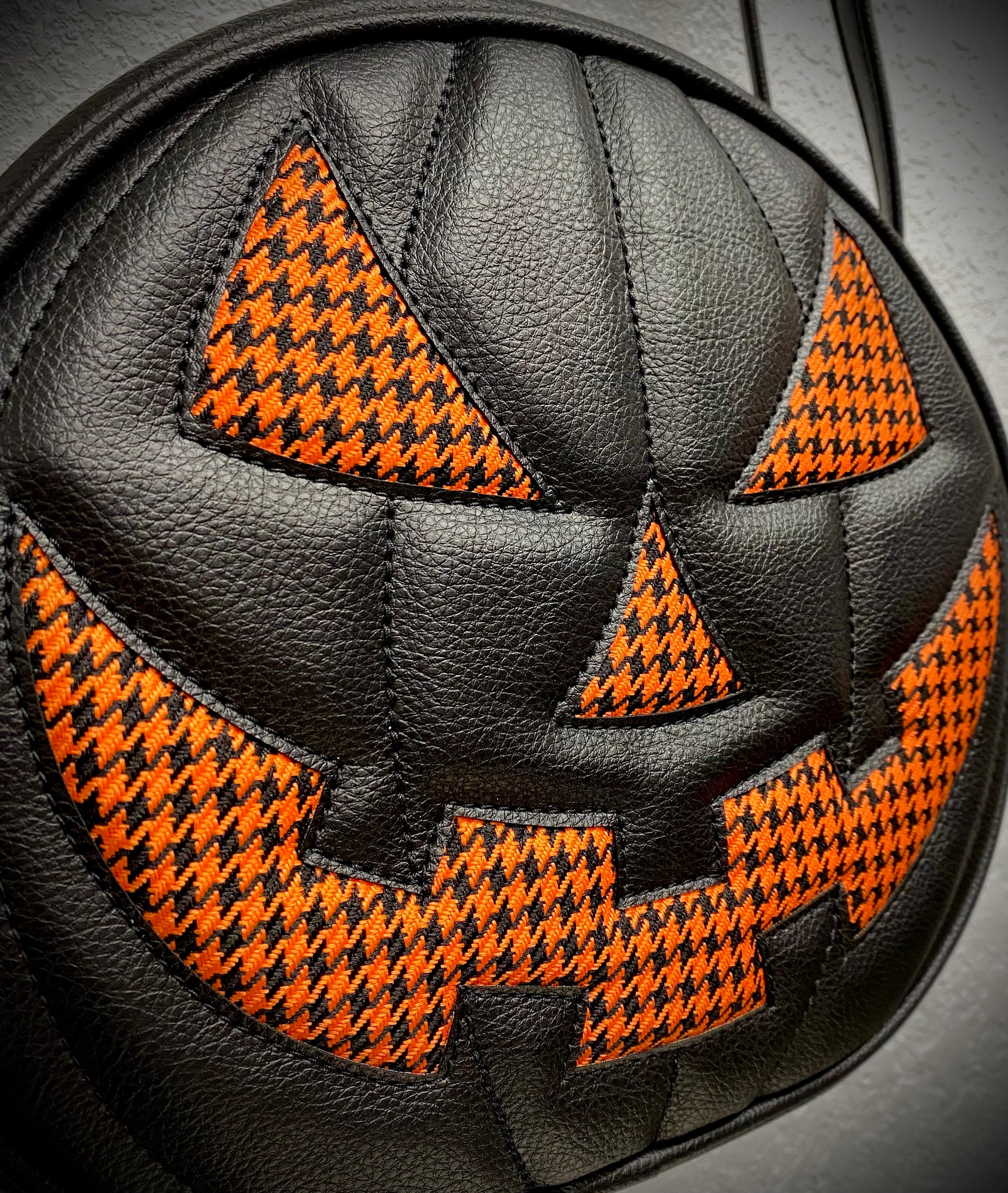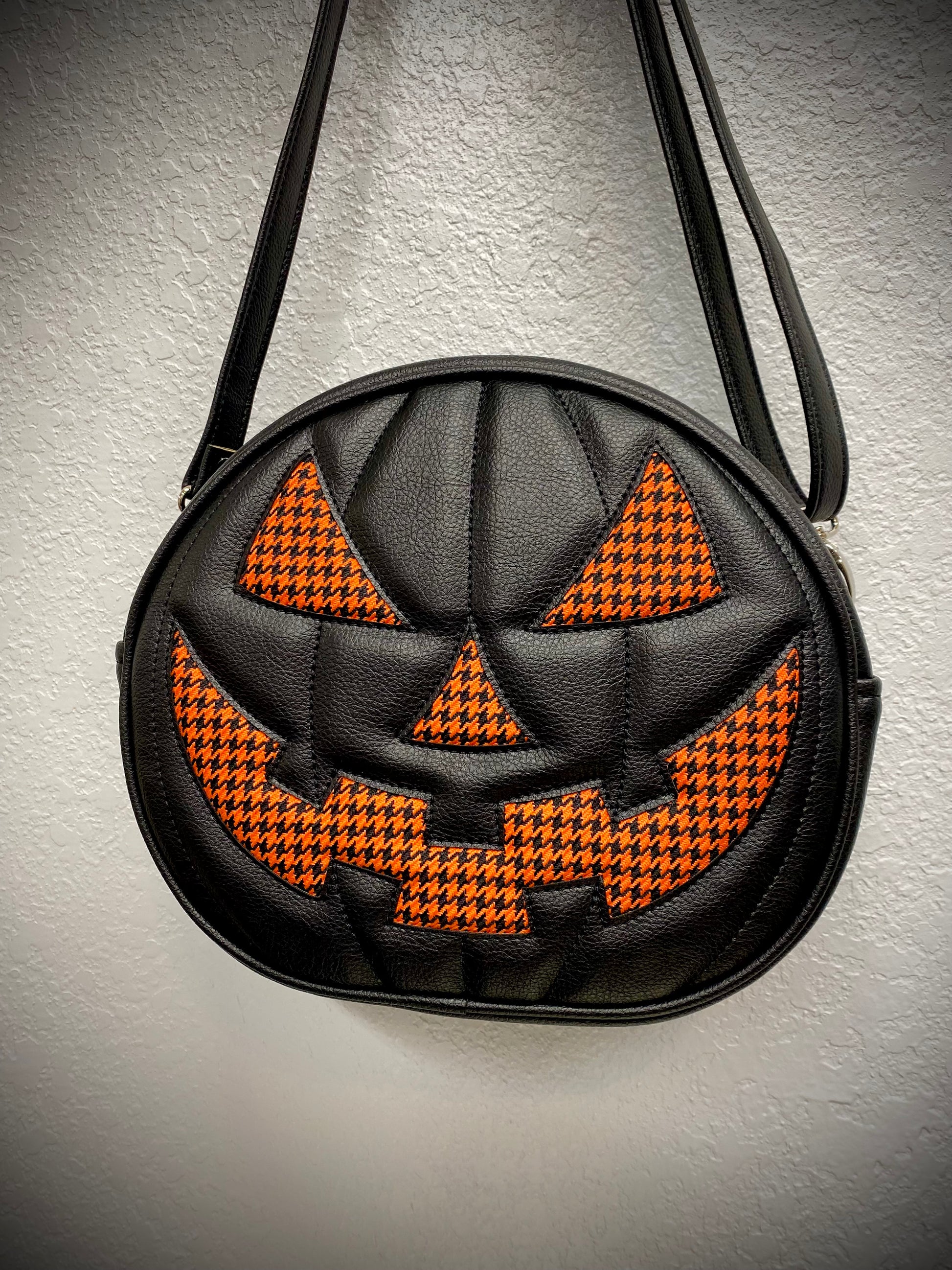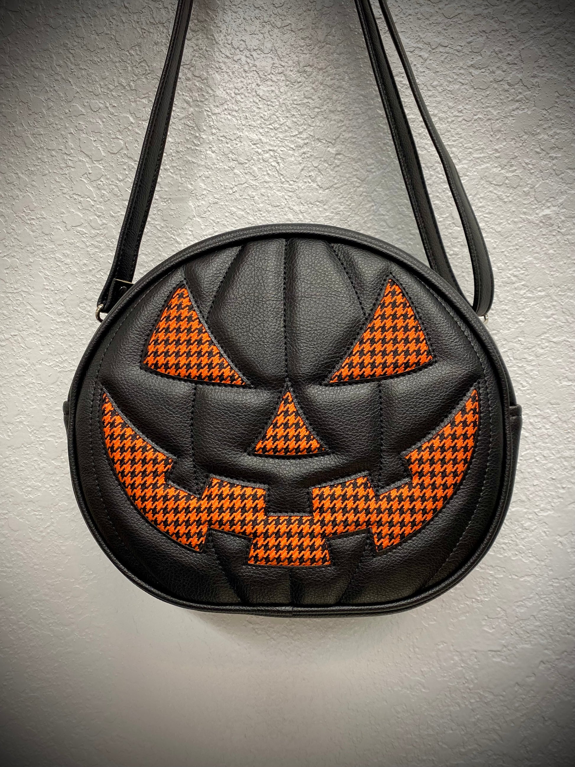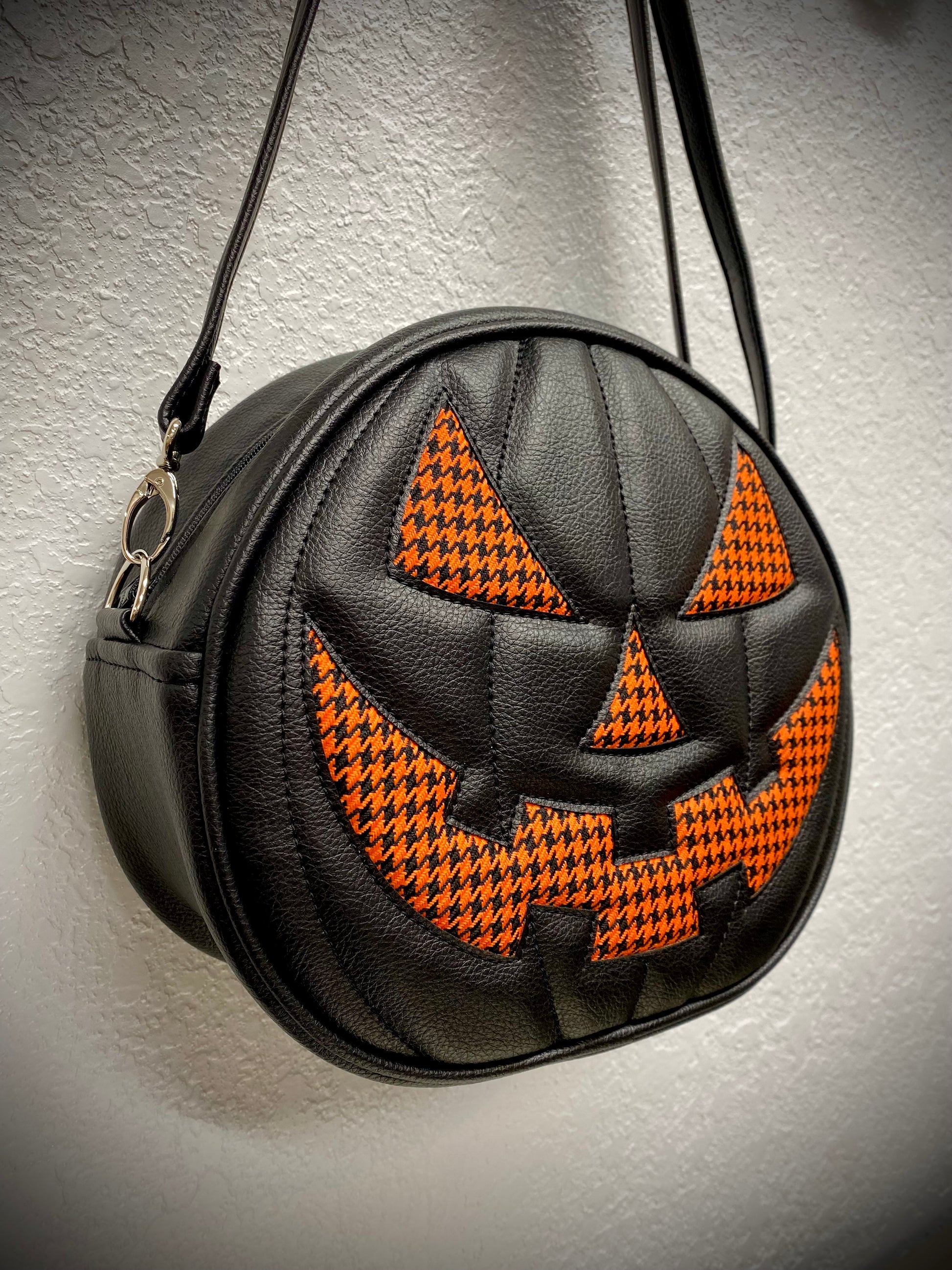 This is one of our Cruiser Pumpkin bags. It features our classic jack-o-lantern face in orange houndstooth automotive fabric. We paired this with our black Symphony vinyl. Includes a matching adjustable vinyl crossbody strap. It has one outside slip pocket and two inside slip pockets. The bag is lined in a black padded nylon fabric.