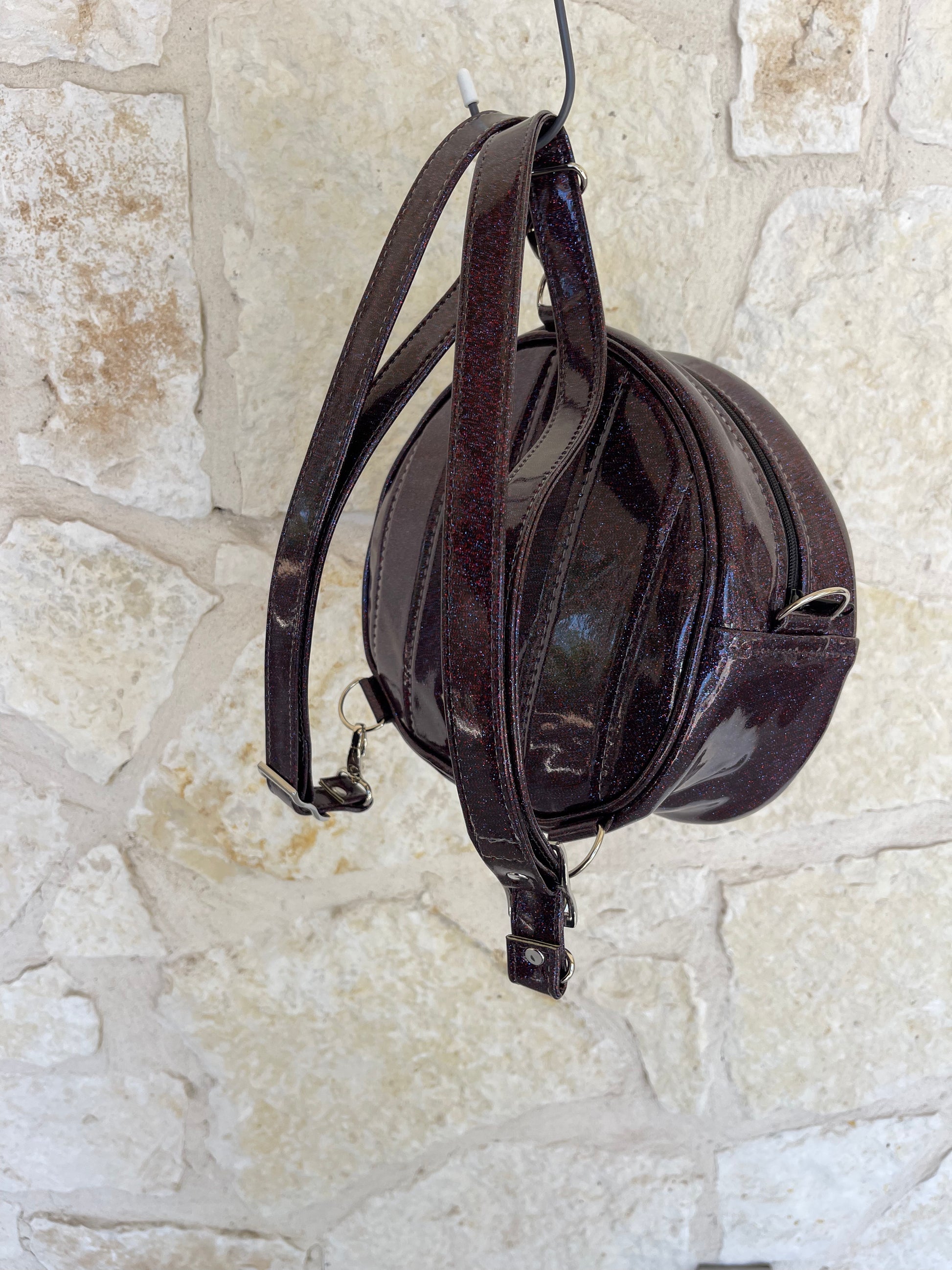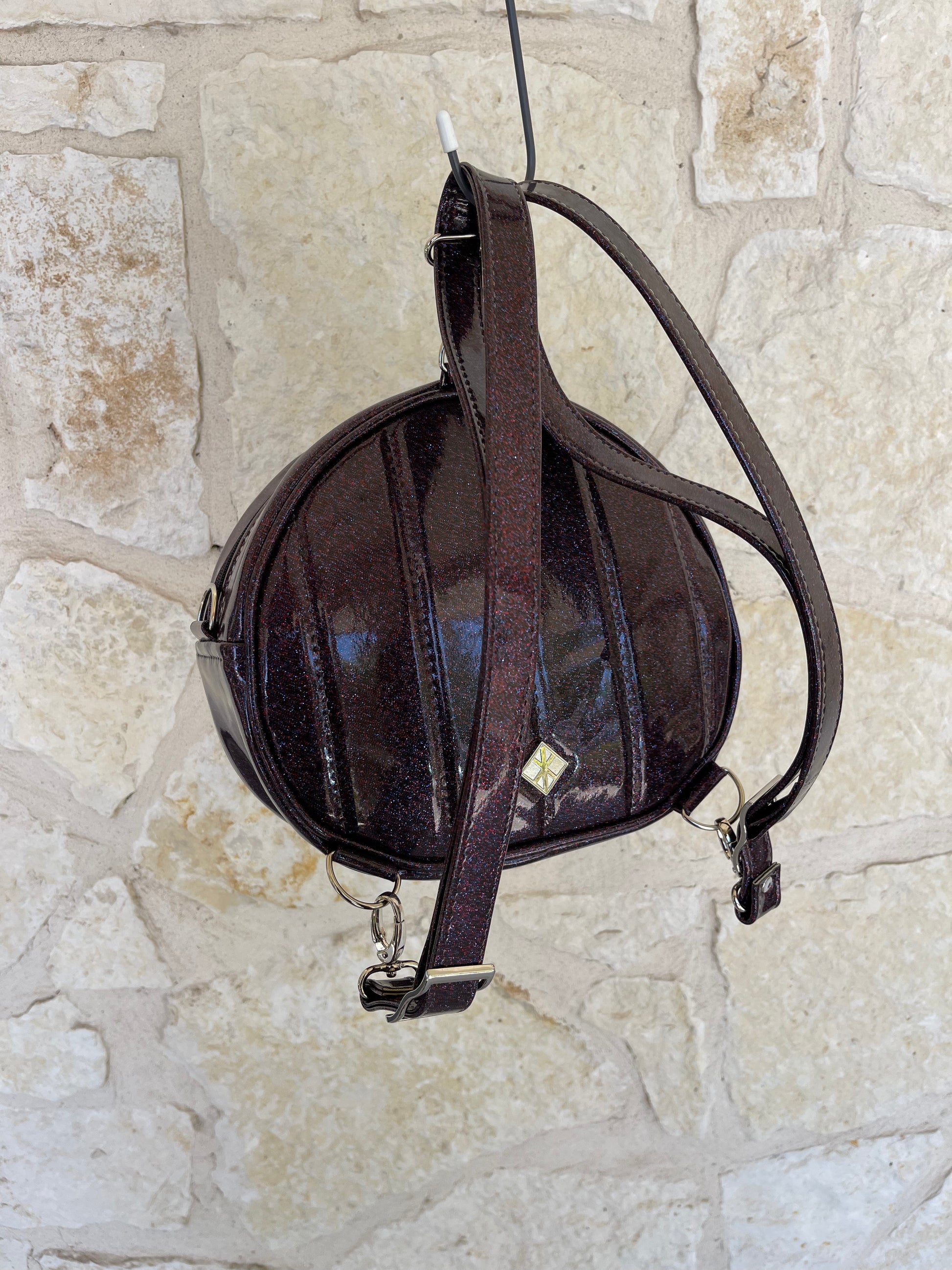 This Cruiser handbag/backpack is finished in purple ion glitter vinyl and shattered silver holo vinyl. This comes with our adjustable shoulder/crossbody strap, and two more adjustable straps for using it as a backpack. It has two inside slip pockets. The bag is lined in a black, padded nylon fabric.