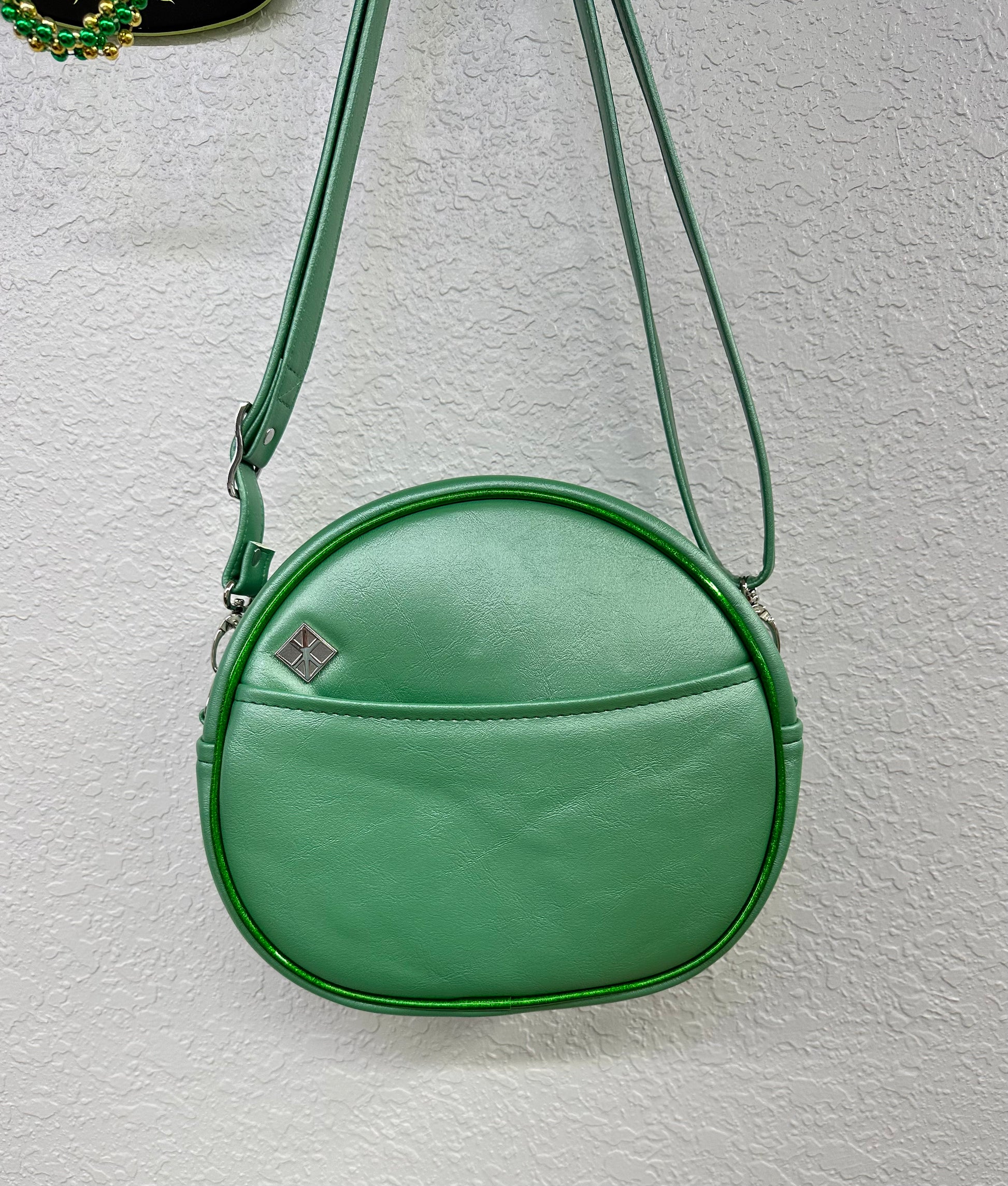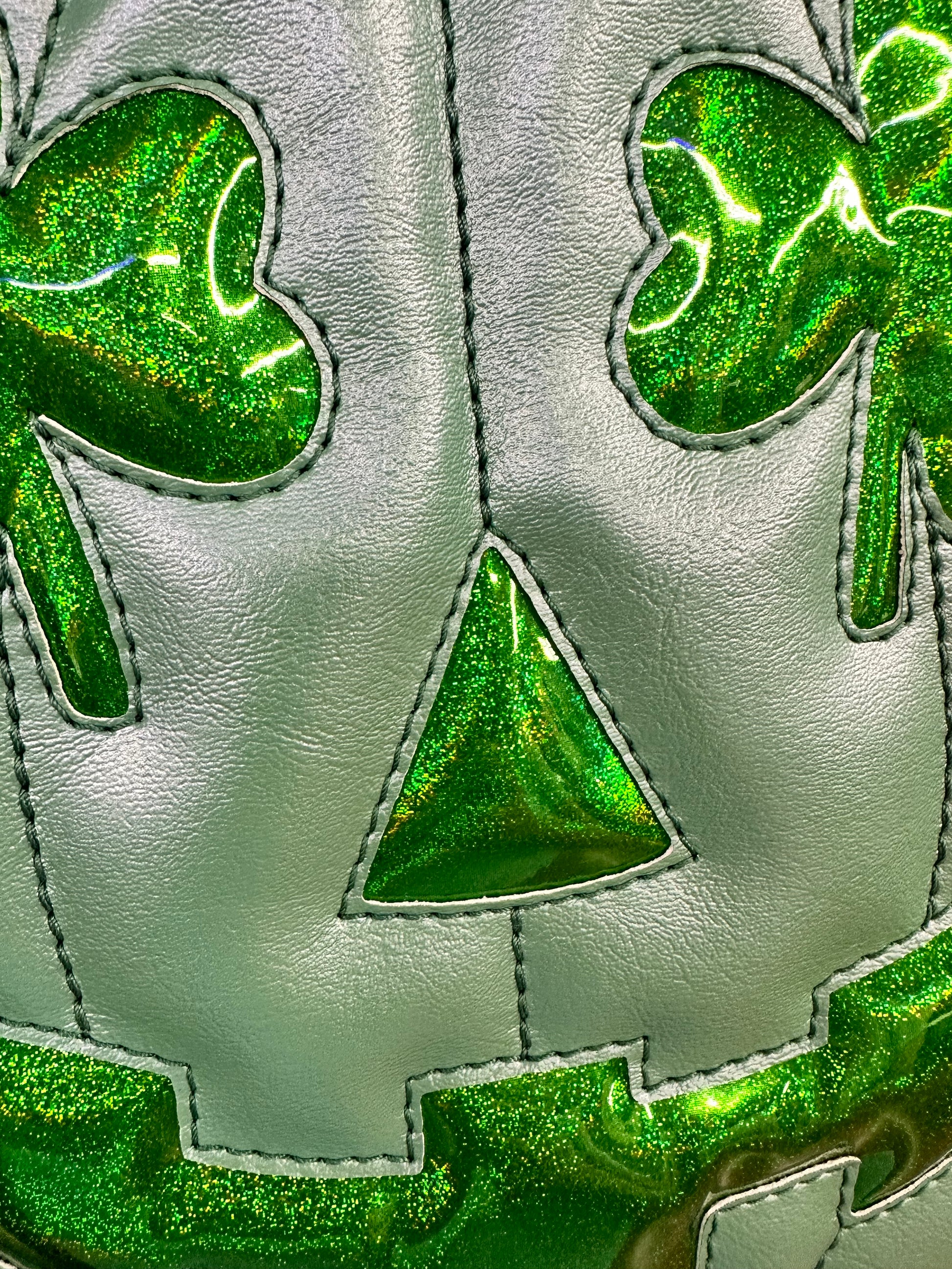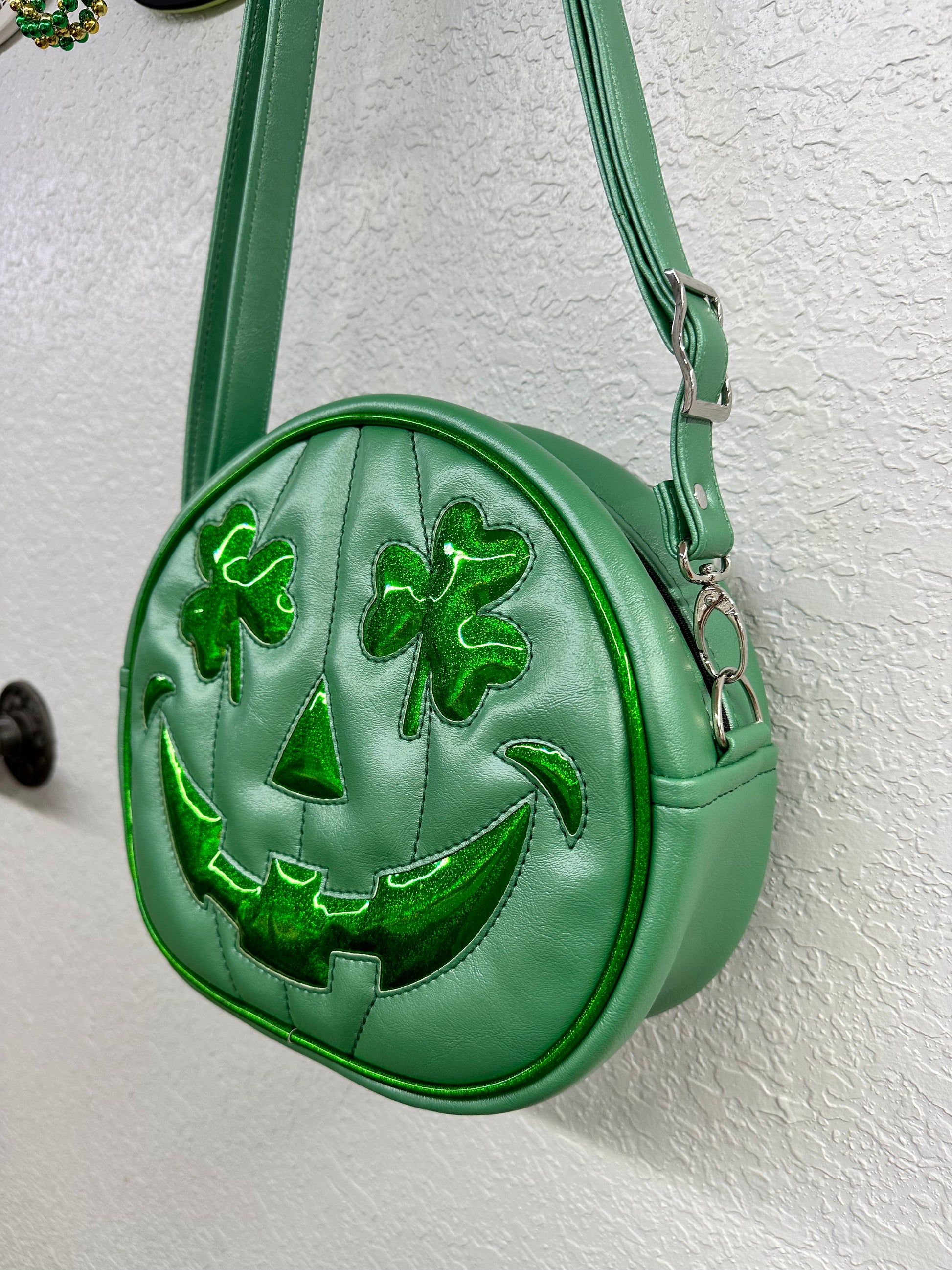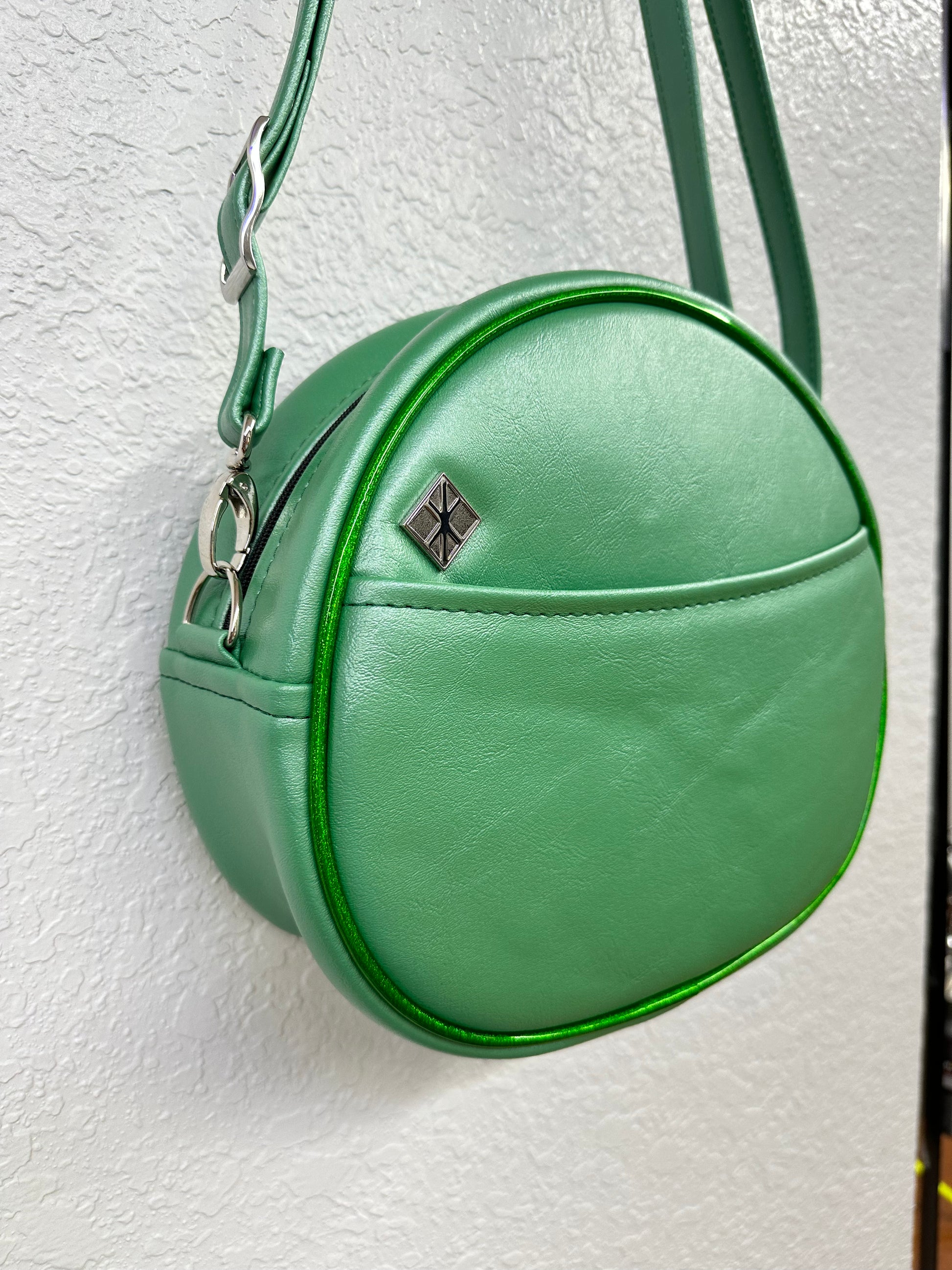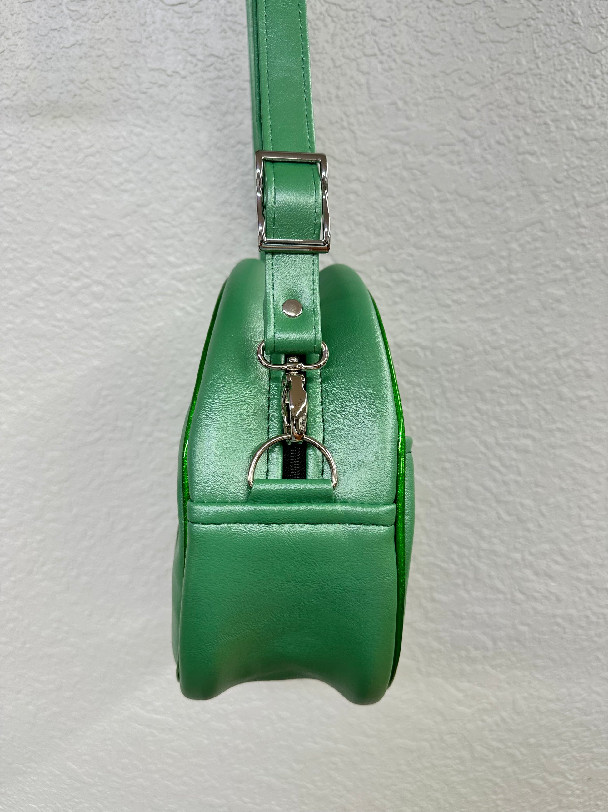 This Mid Cruiser bag is finished in mint green pearl vinyl and green holo glitter vinyl paired with green stitching on the face and shamrock eyes! Measures about 11" x 10" x 4.5". Includes a matching adjustable mint green pearl strap. One exterior slip pocket, and two interior slip pockets. Lined in a padded black cloth.