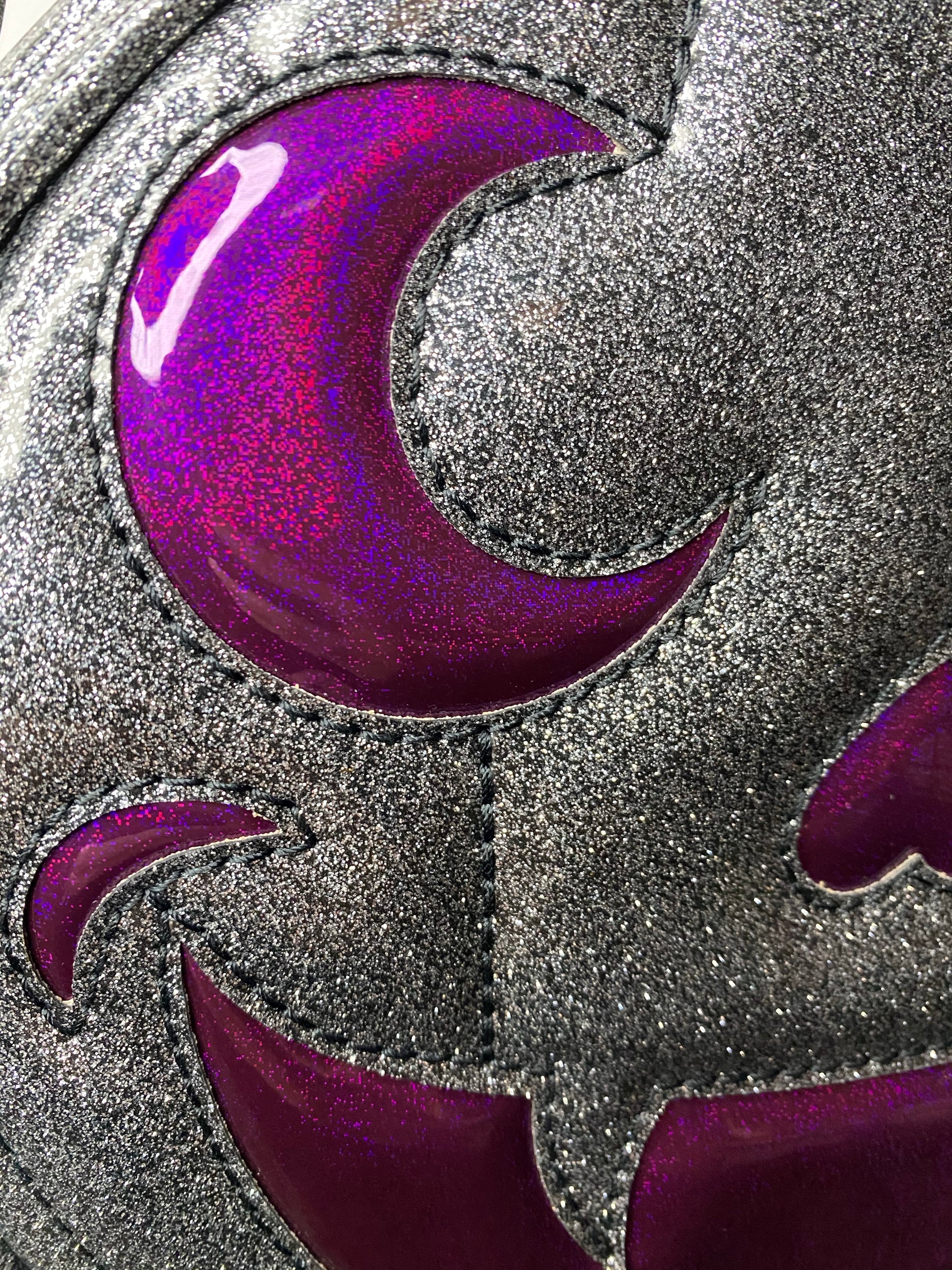 This Cruiser handbag is finished in silver glitter vinyl and plum holo glitter vinyl. It features a matching, plum thread. This comes with our adjustable shoulder/crossbody strap. It has one outside slip pocket and two inside slip pockets. The bag is lined in a black, padded nylon fabric.