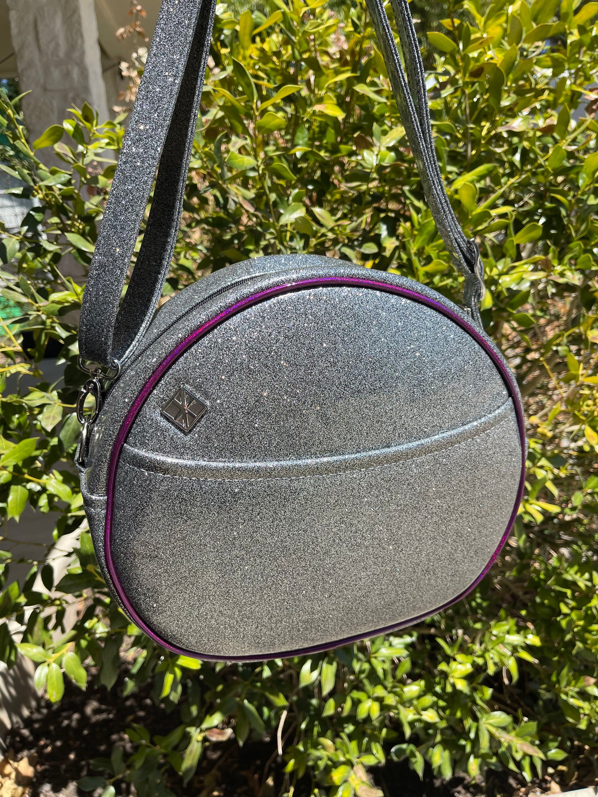 This Cruiser handbag is finished in silver glitter vinyl and plum holo glitter vinyl. It features a matching, plum thread. This comes with our adjustable shoulder/crossbody strap. It has one outside slip pocket and two inside slip pockets. The bag is lined in a black, padded nylon fabric.